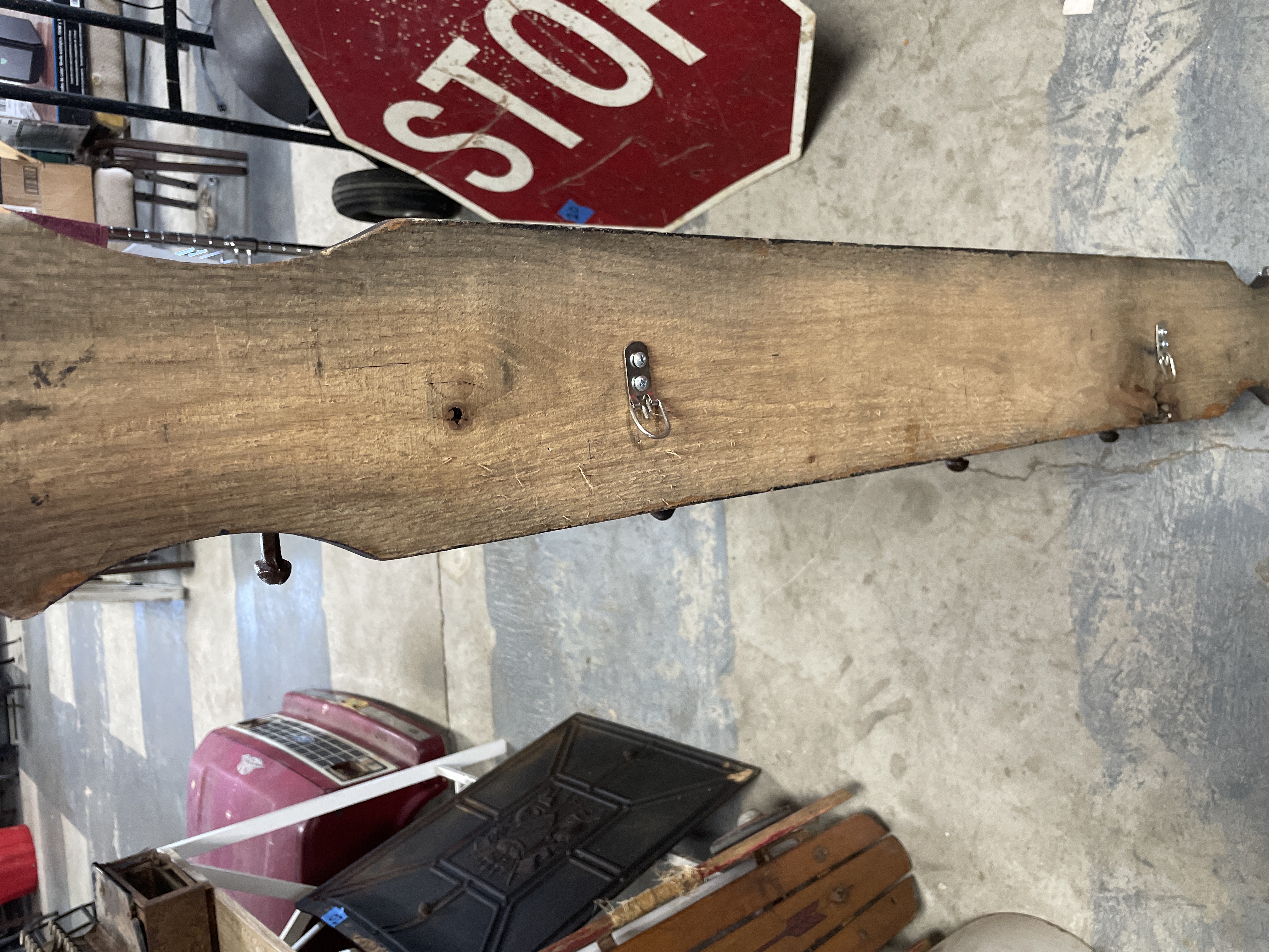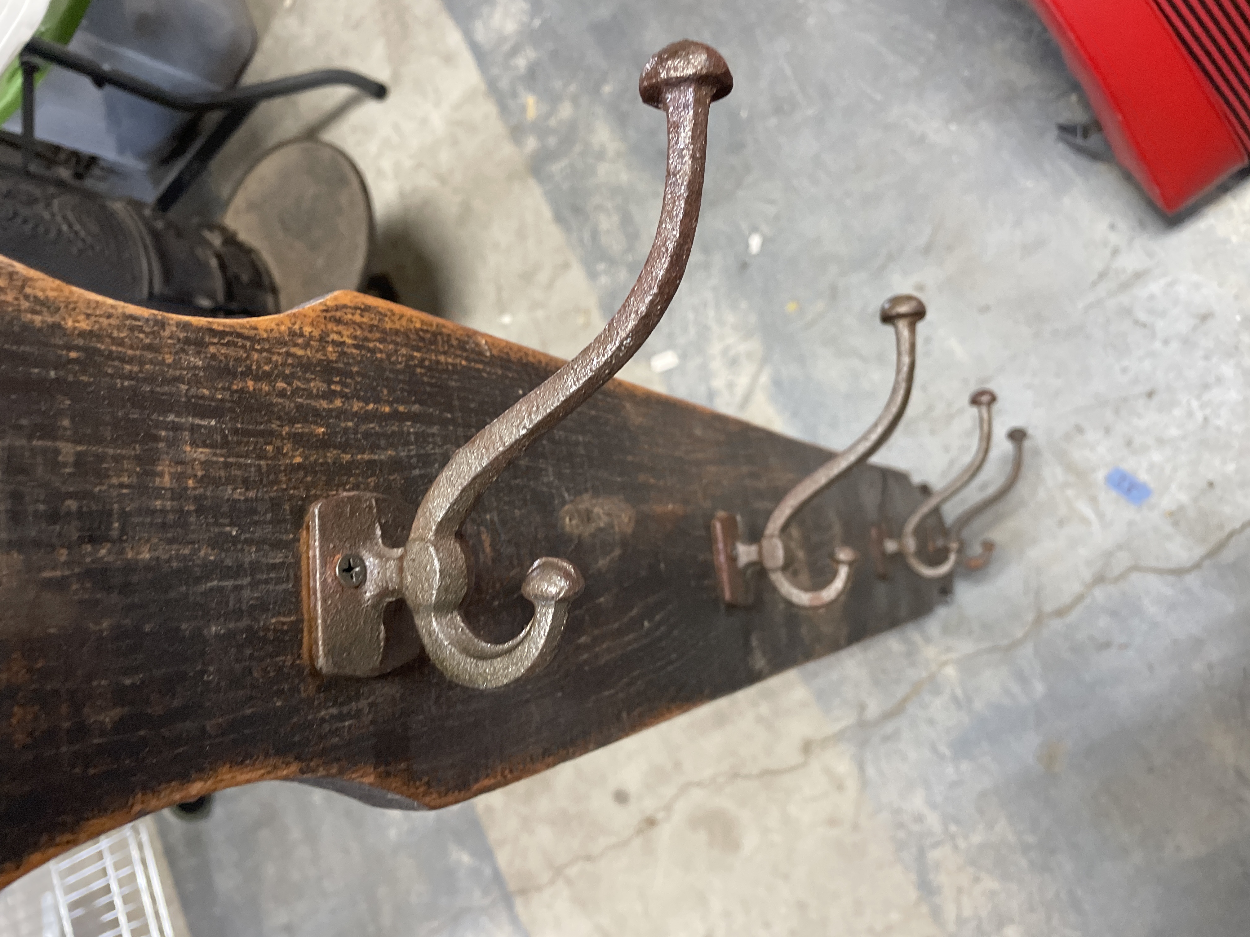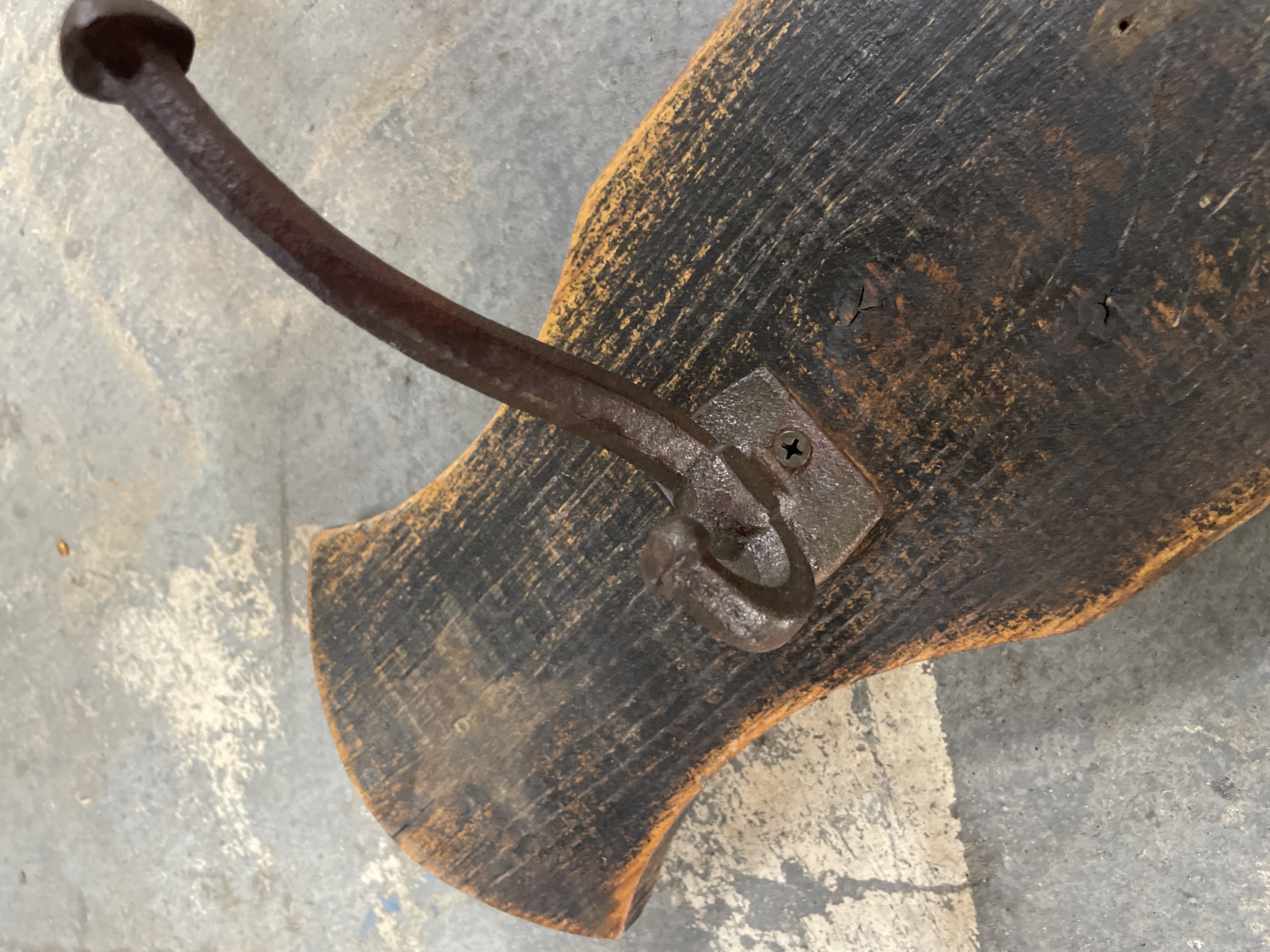A wall-mounted coat rack assembly composed of a long, narrow wooden backboard and four attached metal hooks. The wood backboard features shaped ends and a distressed finish, characterized by dark black and brown staining over exposed lighter wood grain. Four individual S-hook style coat hooks, constructed of cast iron or similar dark metal, are mounted to the board using visible screws. The reverse side of the board shows unfinished wood and modern eye screws installed for mounting.