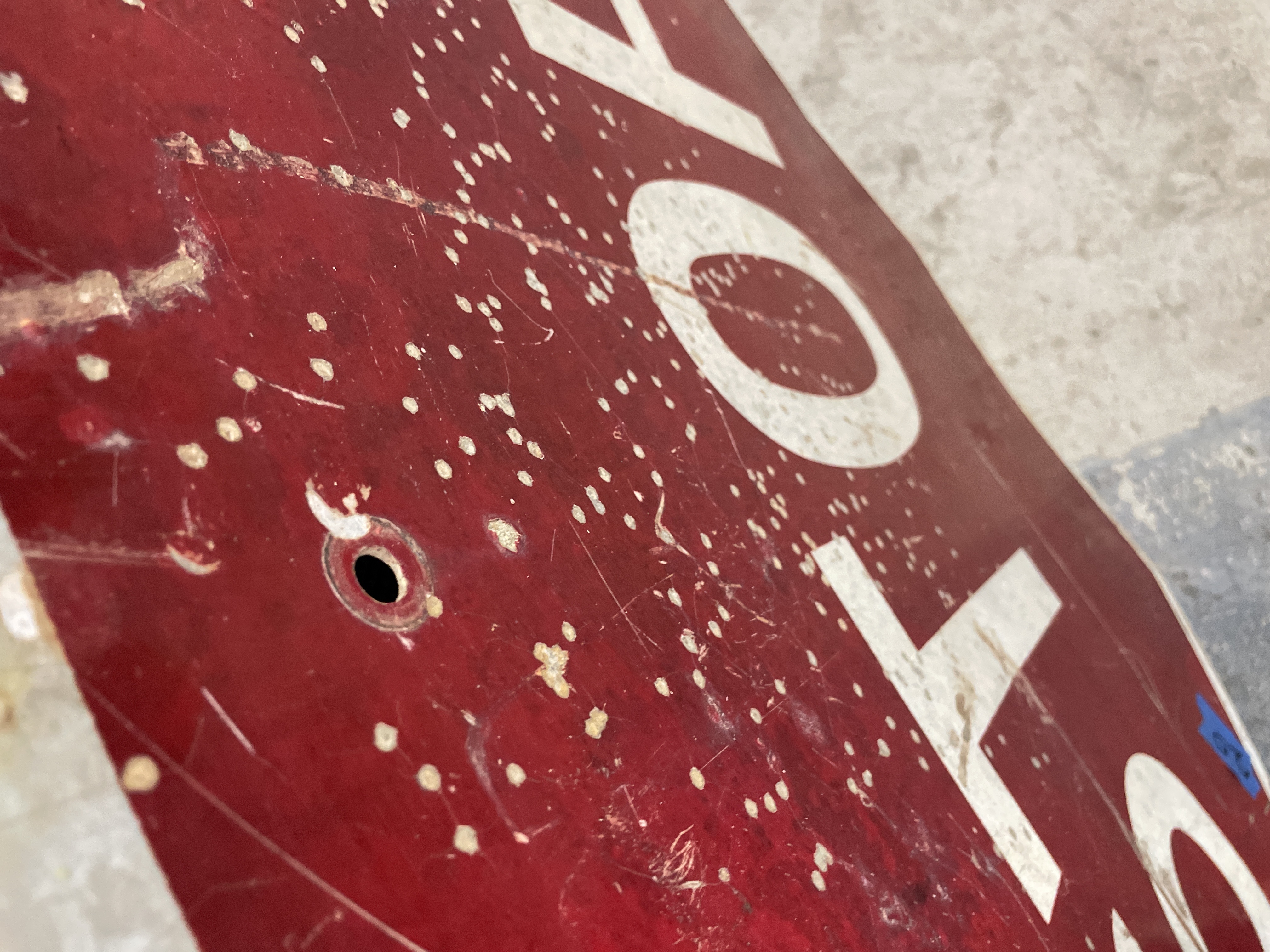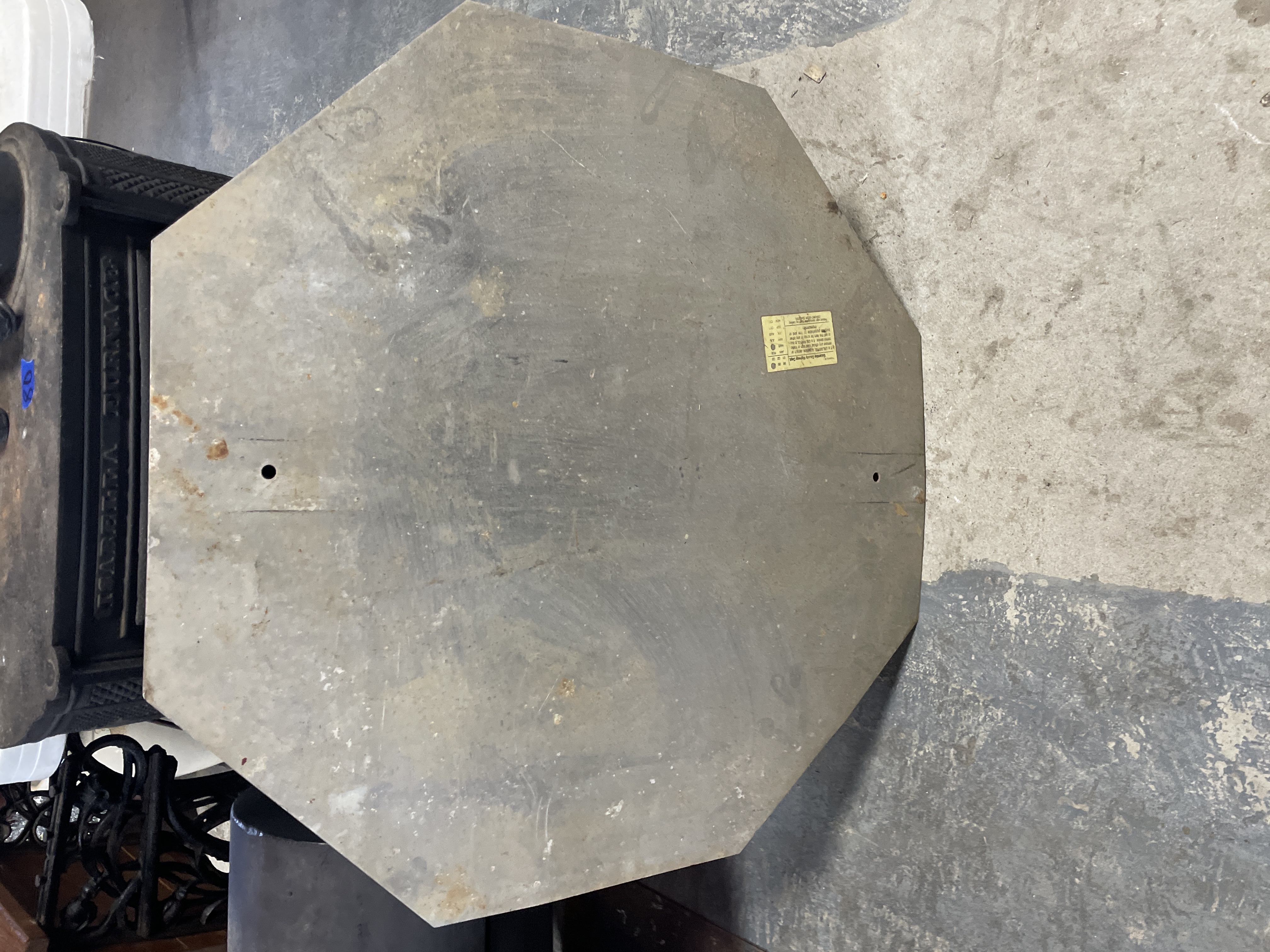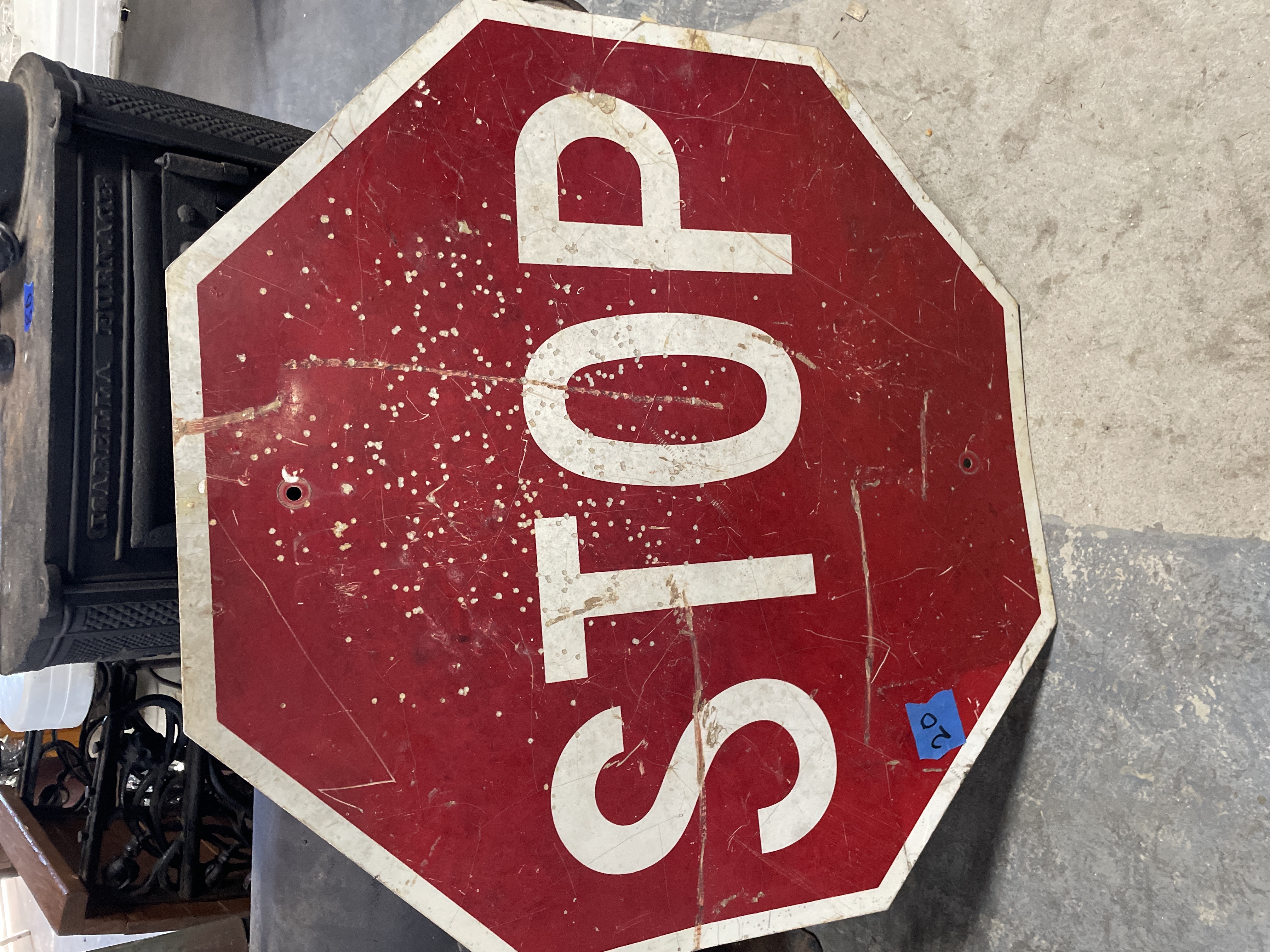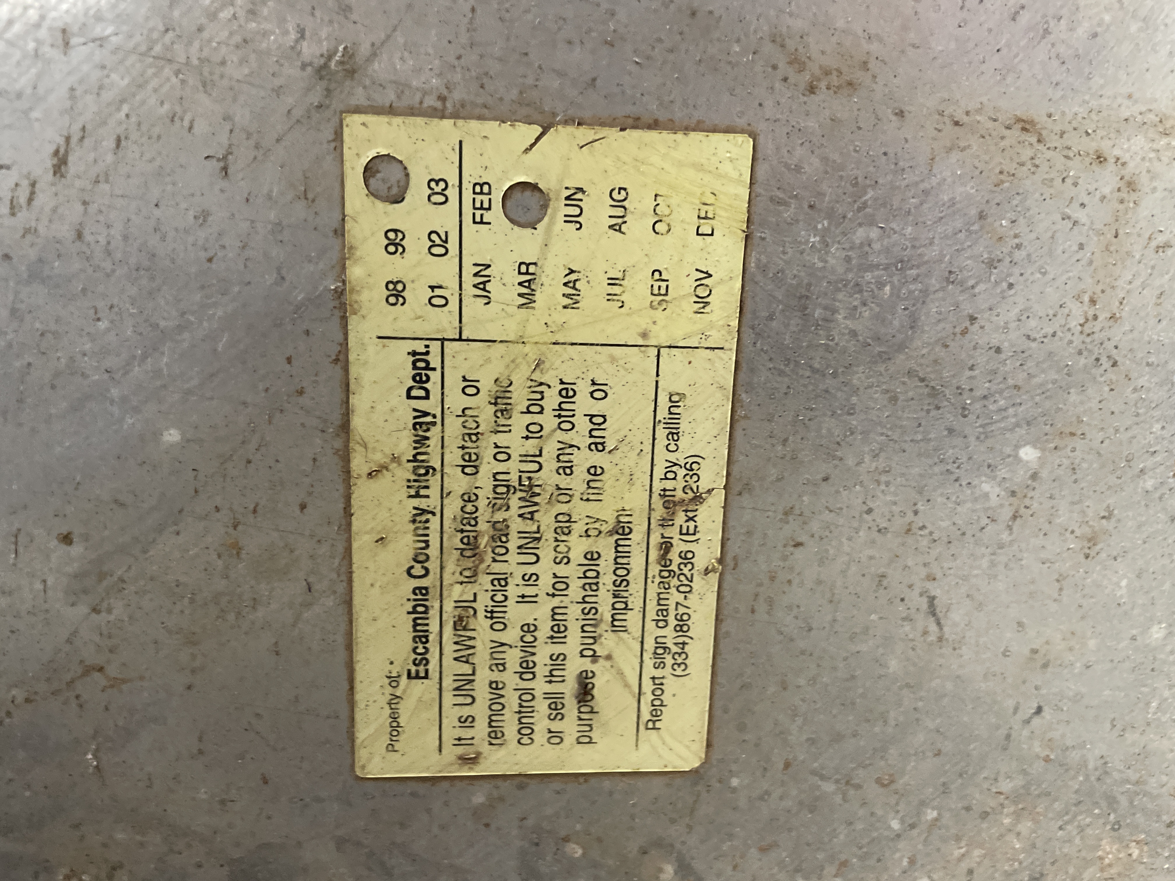 A large, authentic retired octagonal traffic control sign of the standard R1-1 "STOP" design. The sign is constructed from galvanized or plain metal, featuring a reflective red face with large white block lettering spelling "STOP." The reverse side includes a small yellow identification tag affixed to the metal surface. This tag identifies the item as "Property of Escambia County Highway Dept." and lists years 98, 99, 01, 02, 03, indicating a period of use or manufacture spanning the late 1990s and early 2000s. The sign includes two primary mounting holes and two smaller pilot holes toward the bottom edge, consistent with standard highway department mounting practices.