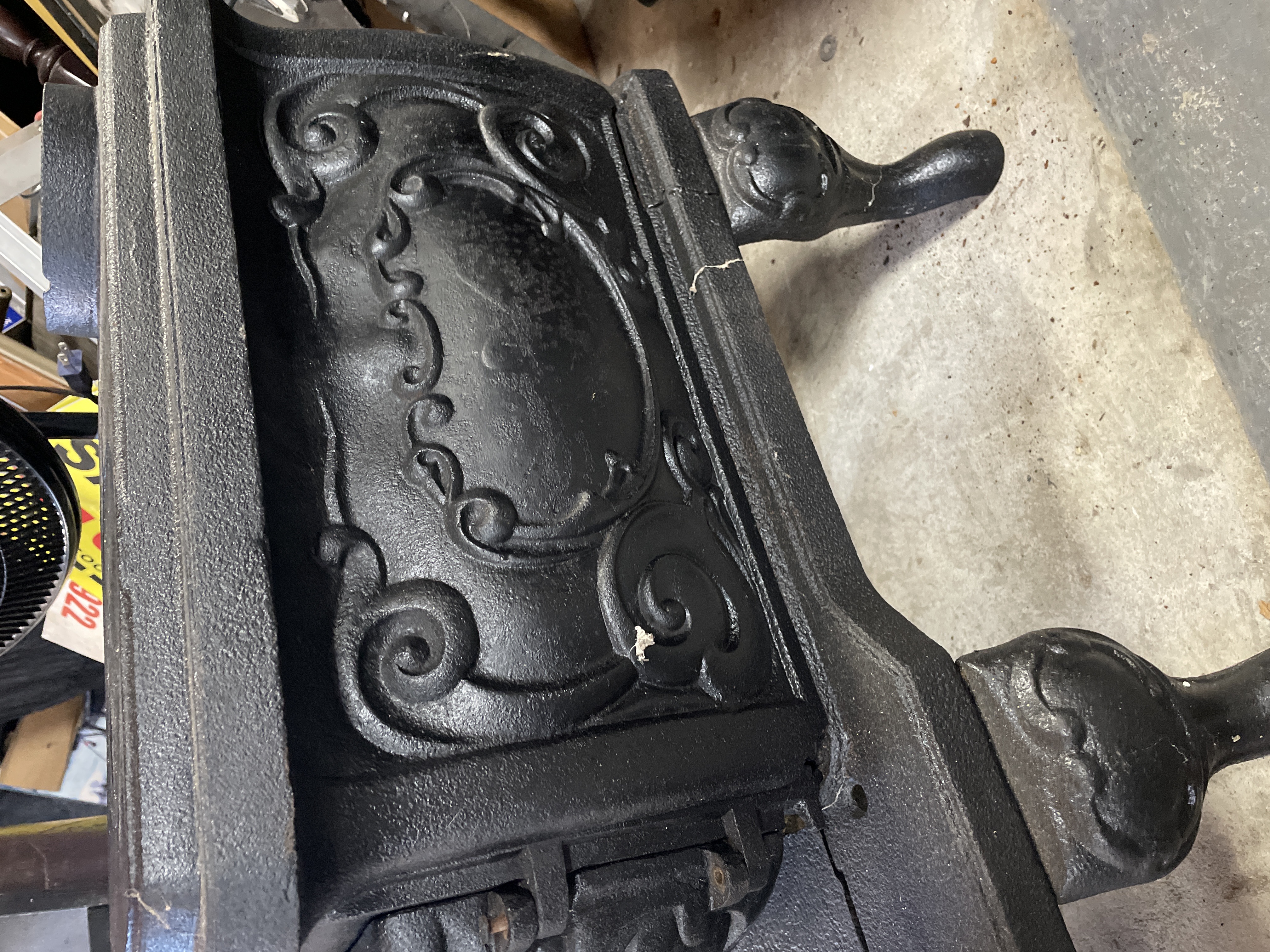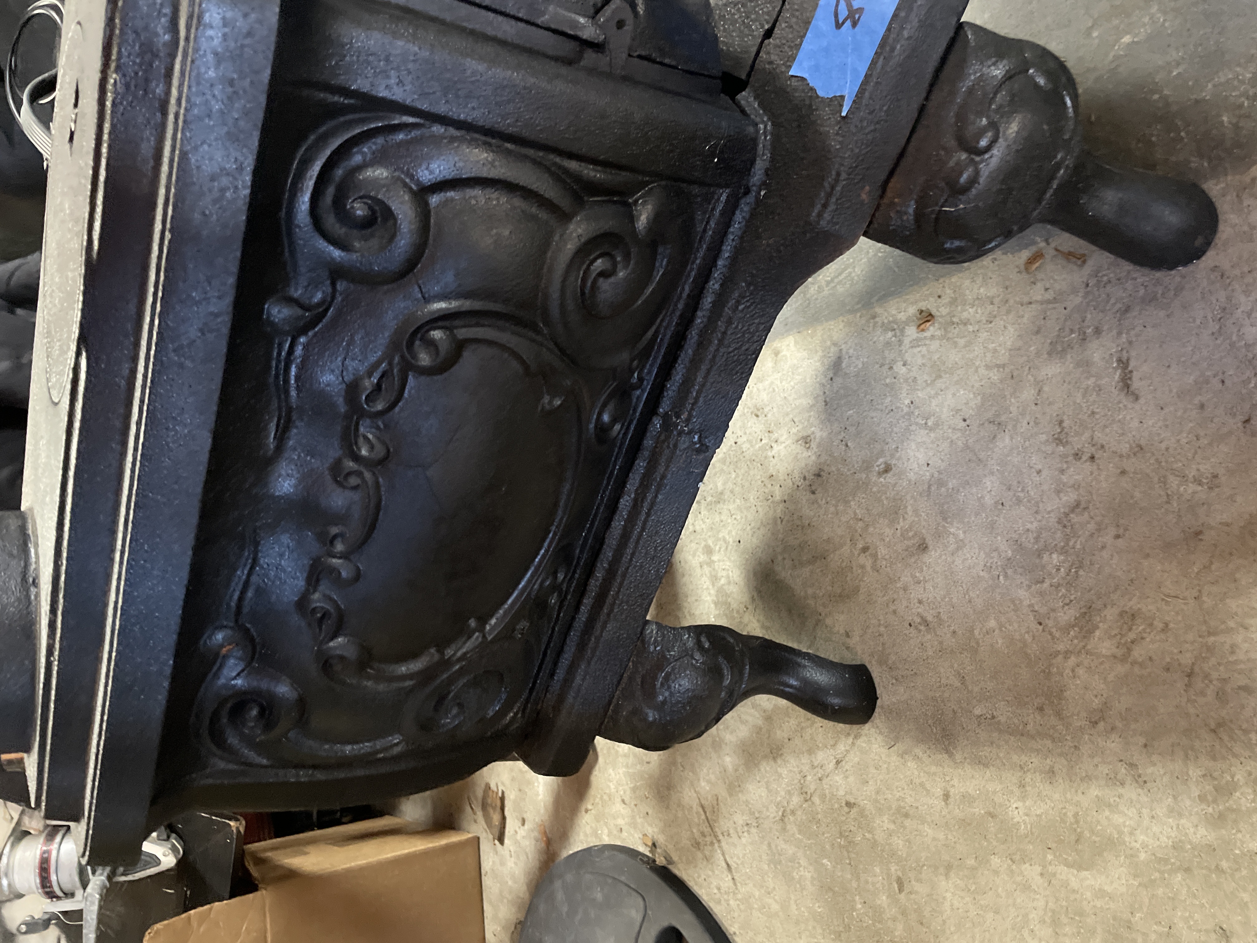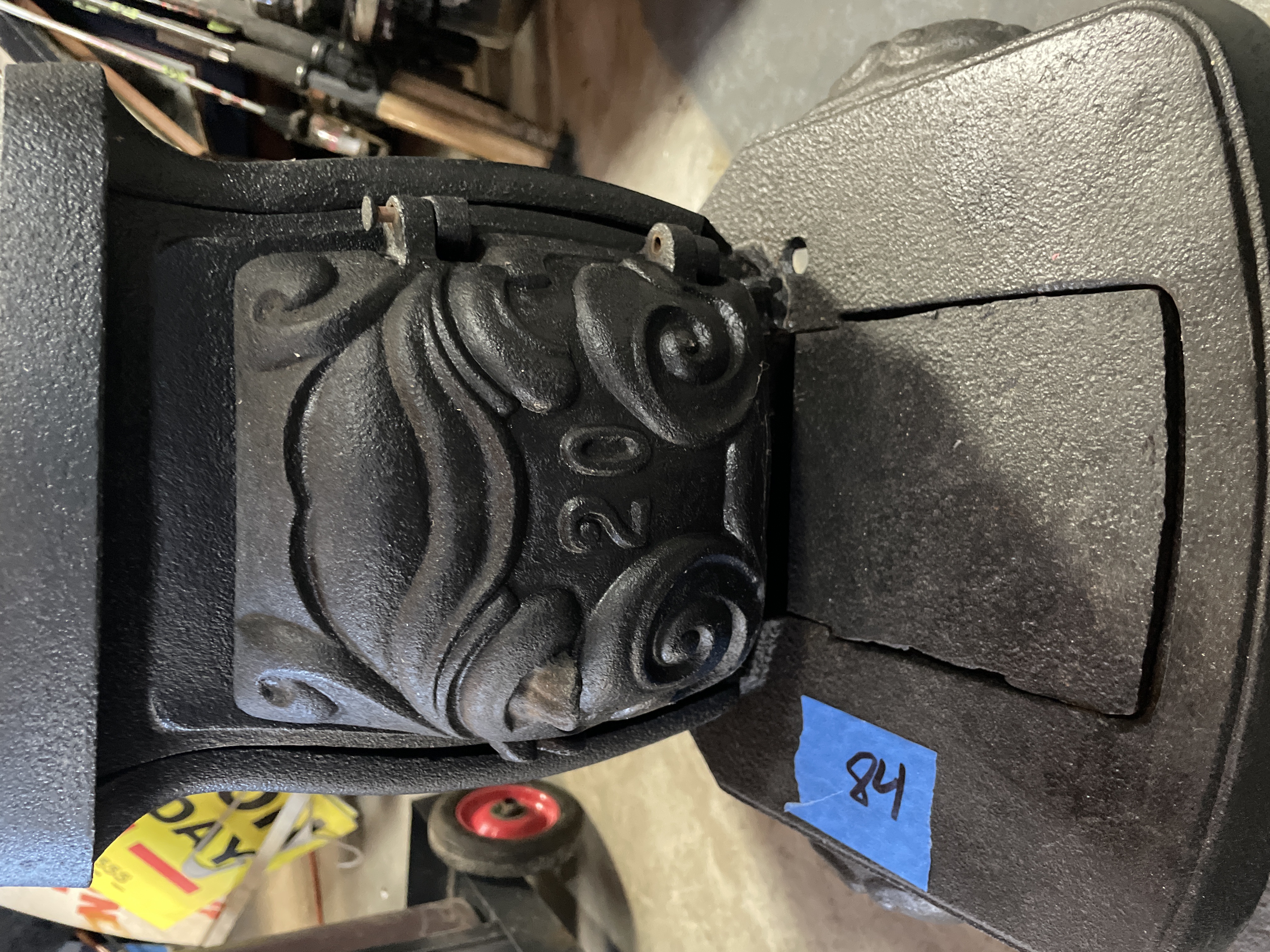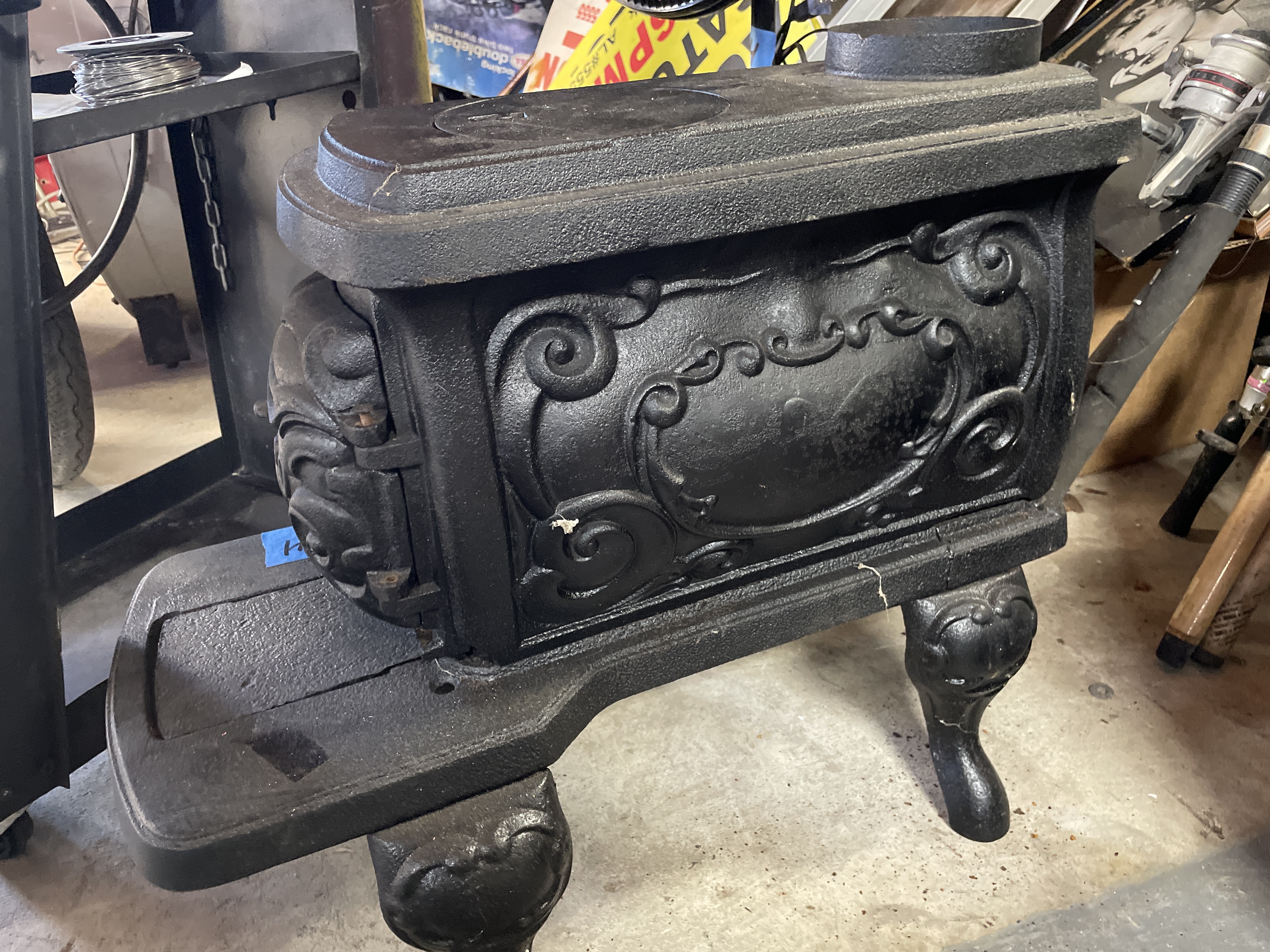 A single antique parlor stove constructed of heavy cast iron, finished in matte black. The rectangular body is supported by four ornate cabriole-style legs resting on an extended foot platform. The sides are decorated with high-relief rococo scrolling surrounding a central oval panel. The front features a hinged door opening to the firebox. The door is marked with the cast number 20. The top surface includes a circular removable cooking plate cover and a rear flue opening. This type of stove was historically used for wood burning.
