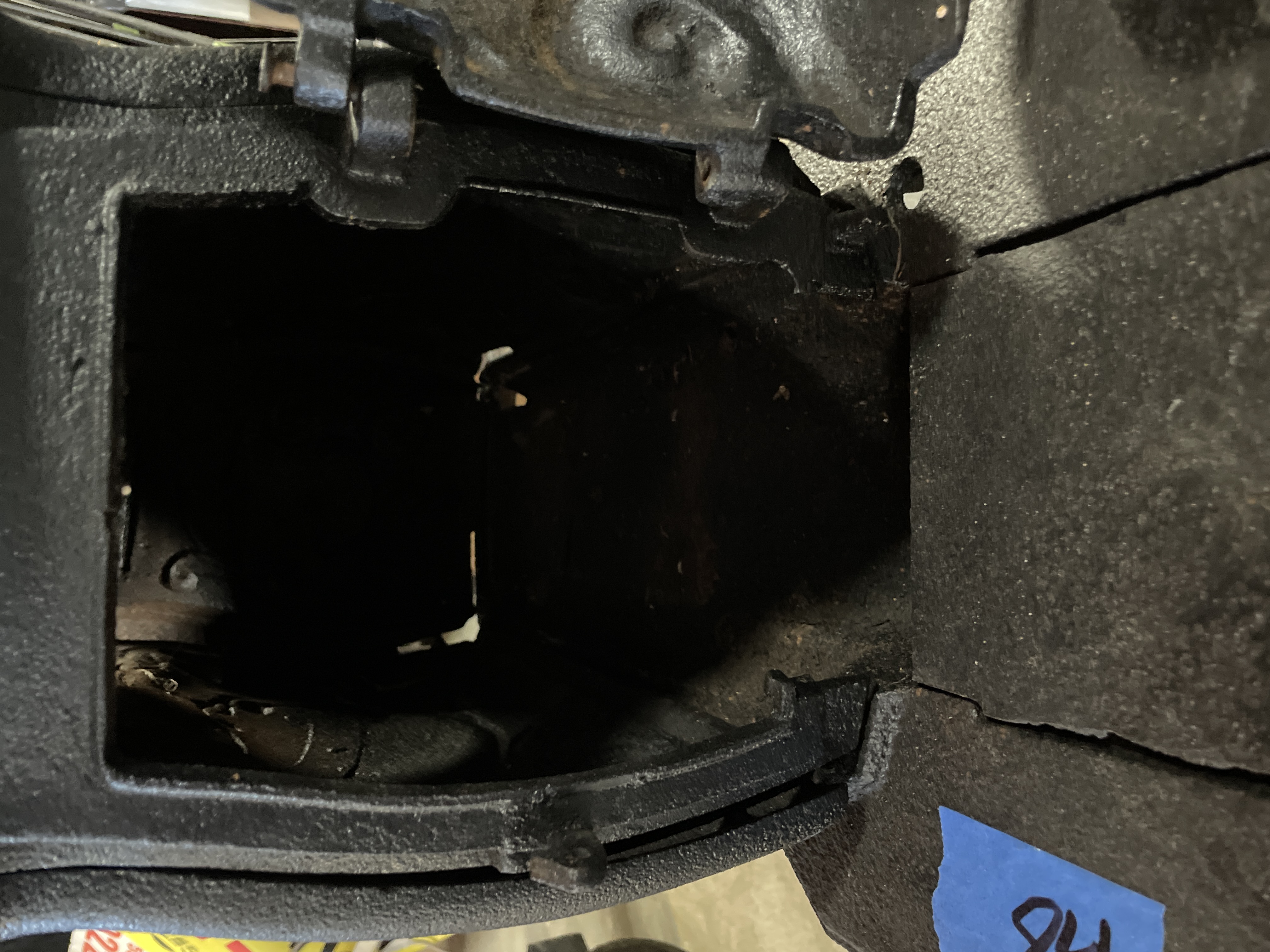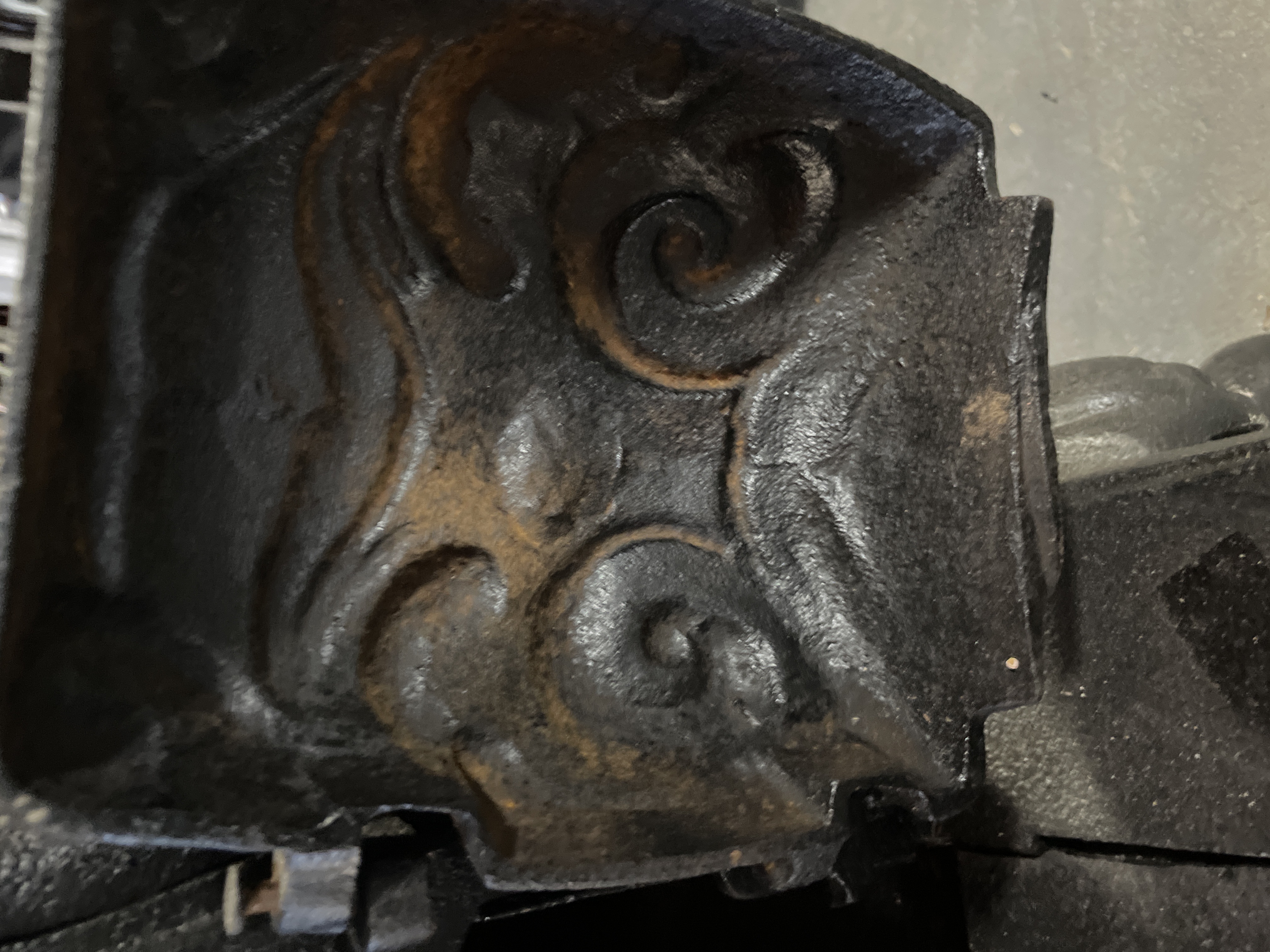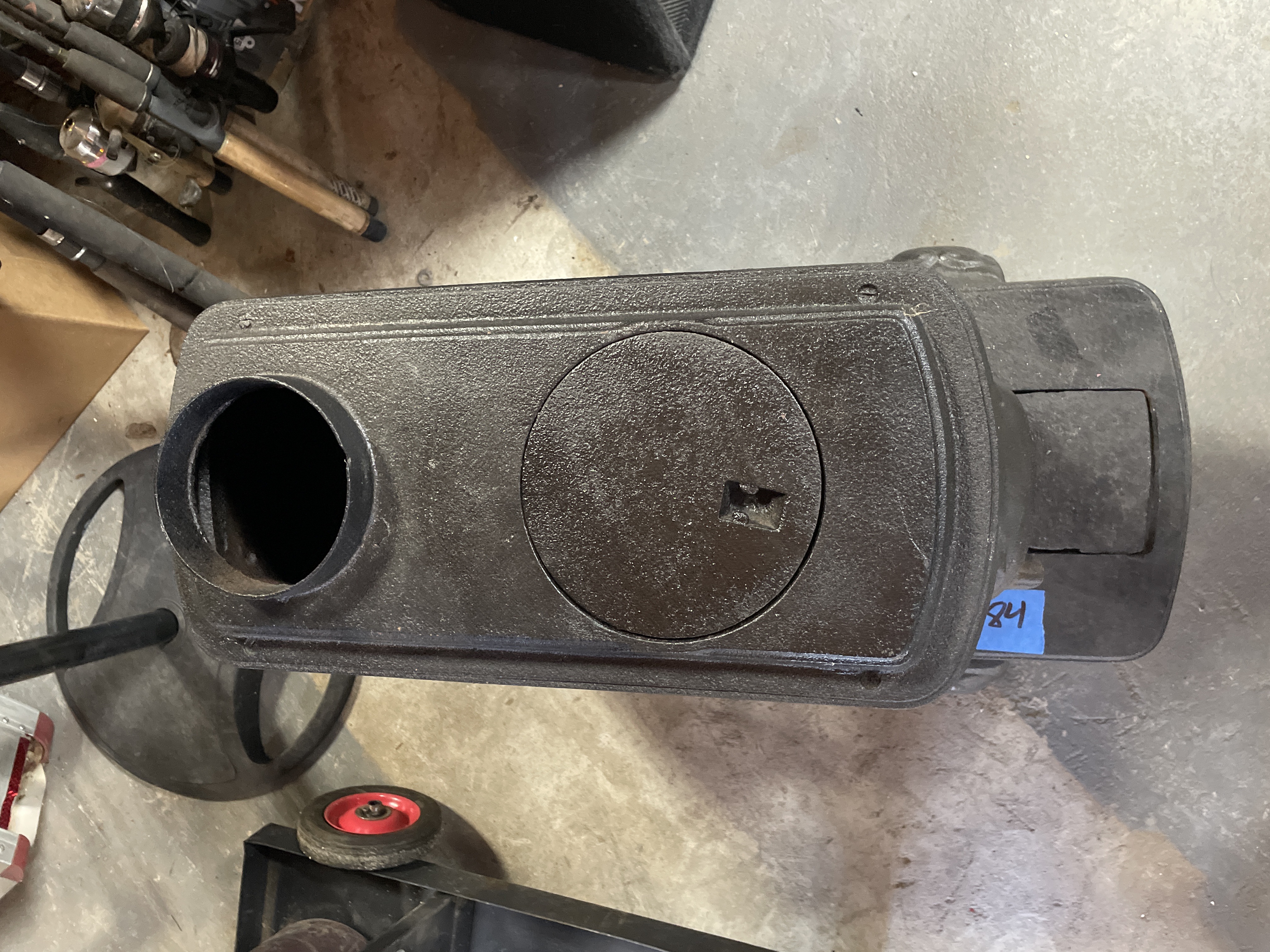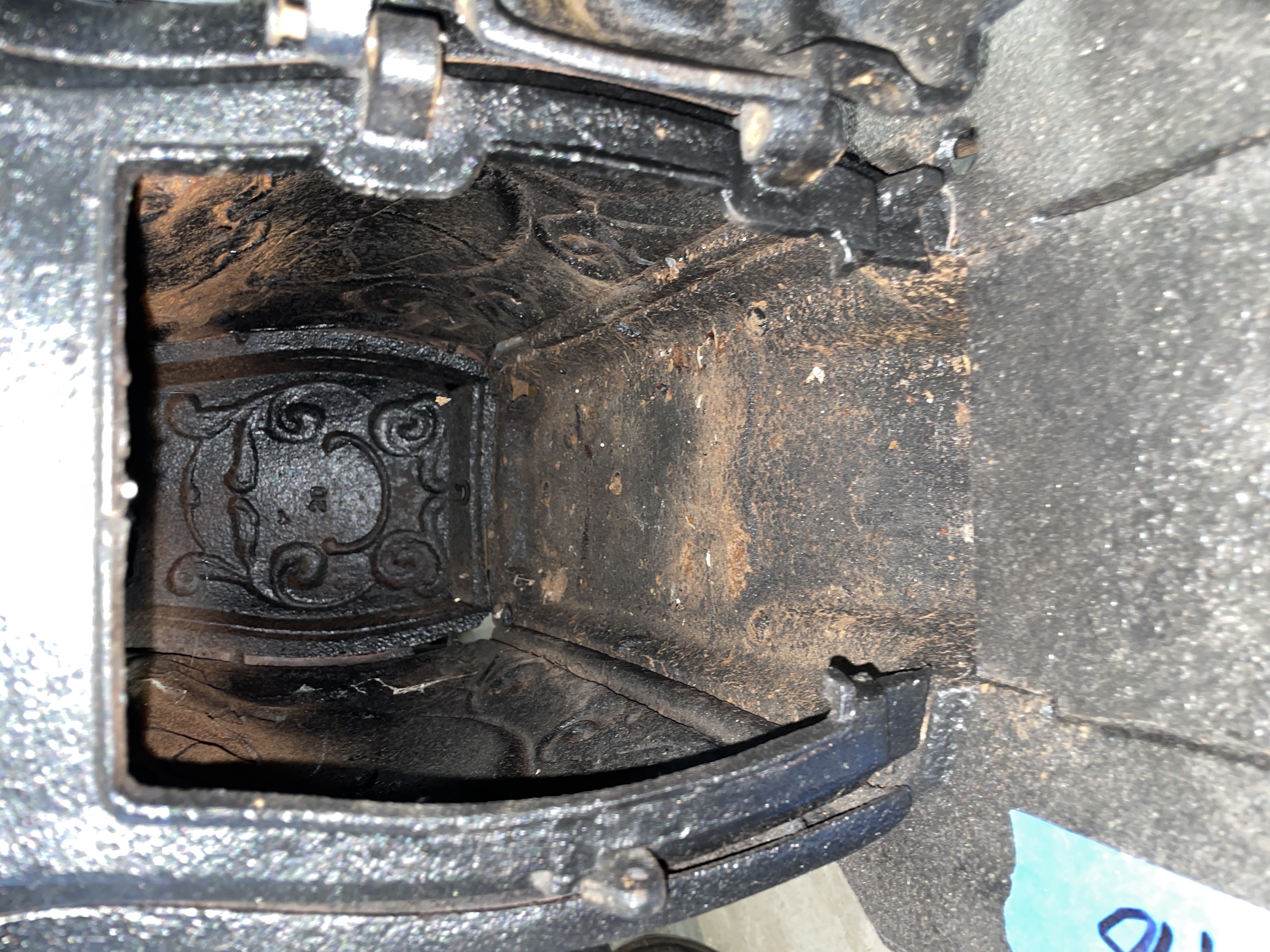 A single antique parlor stove constructed of heavy cast iron, finished in matte black. The rectangular body is supported by four ornate cabriole-style legs resting on an extended foot platform. The sides are decorated with high-relief rococo scrolling surrounding a central oval panel. The front features a hinged door opening to the firebox. The door is marked with the cast number 20. The top surface includes a circular removable cooking plate cover and a rear flue opening. This type of stove was historically used for wood burning.