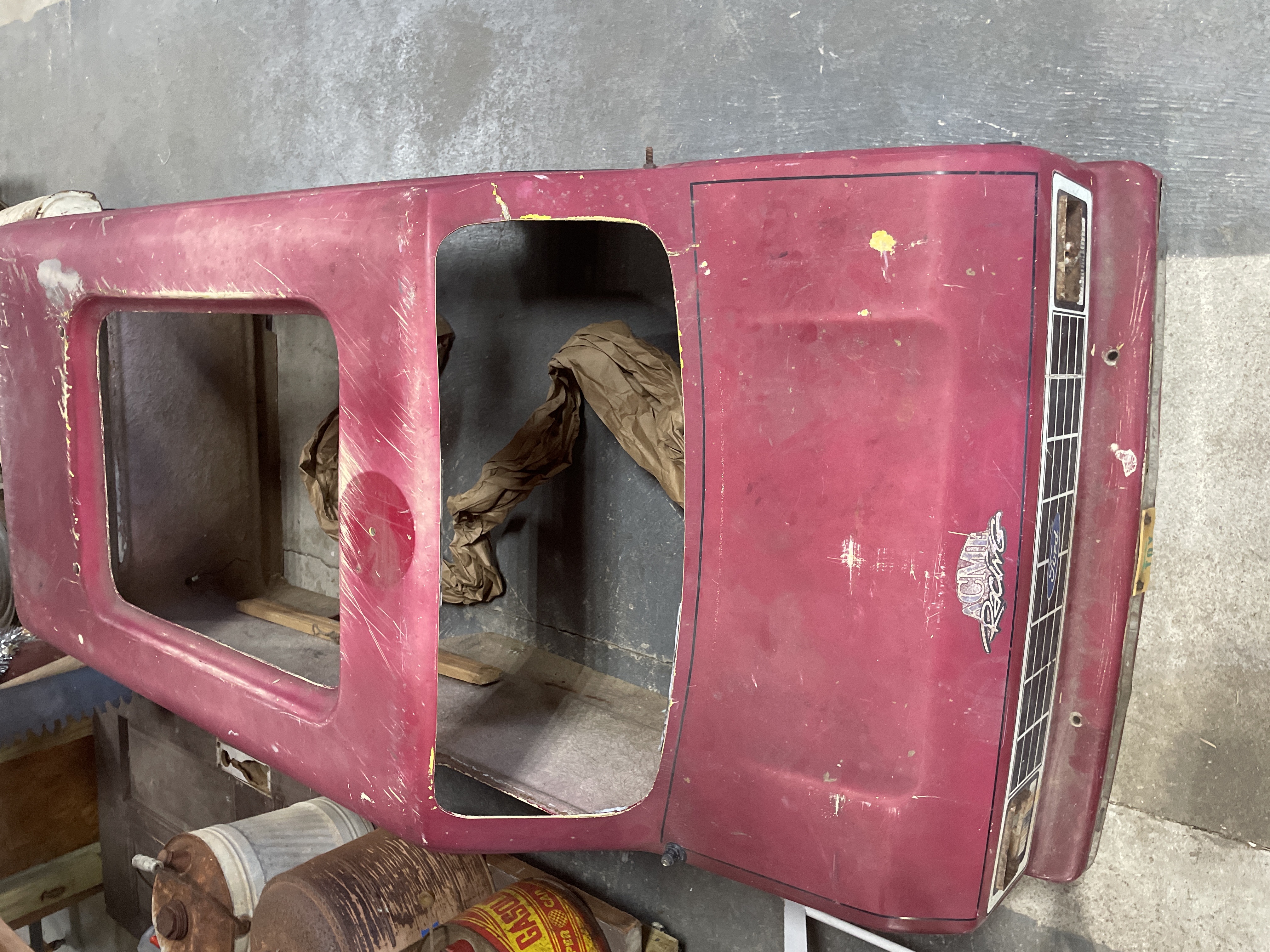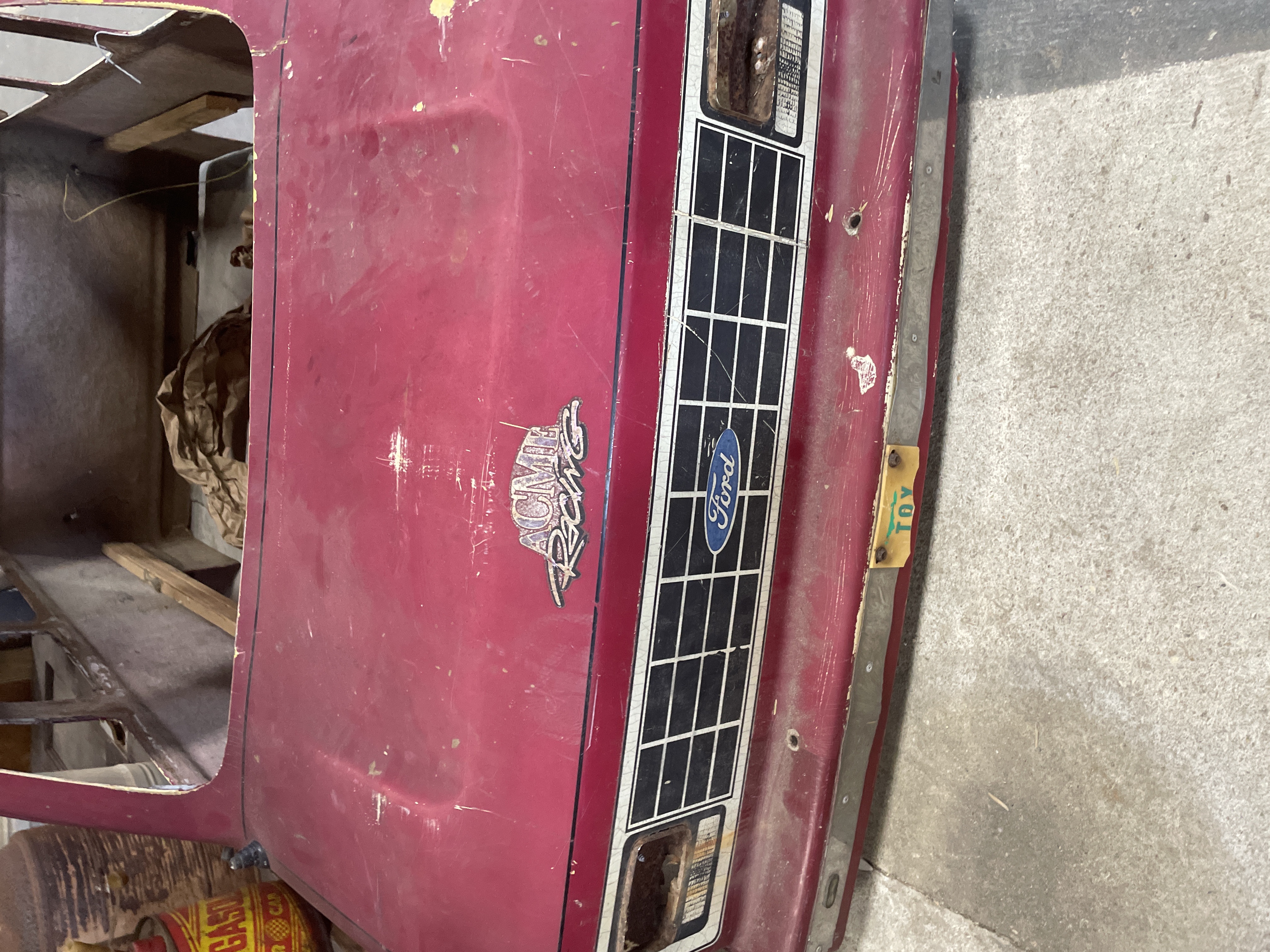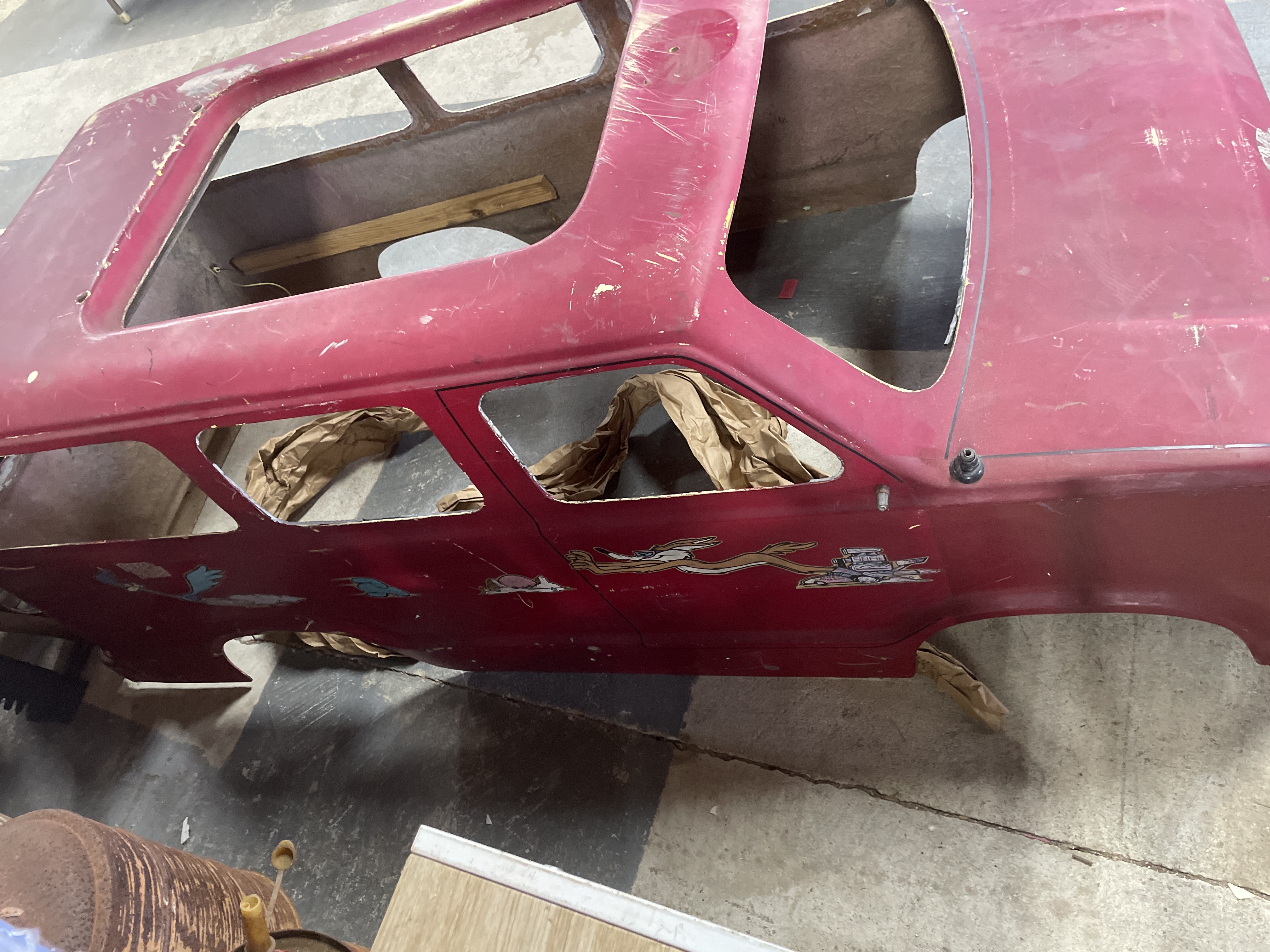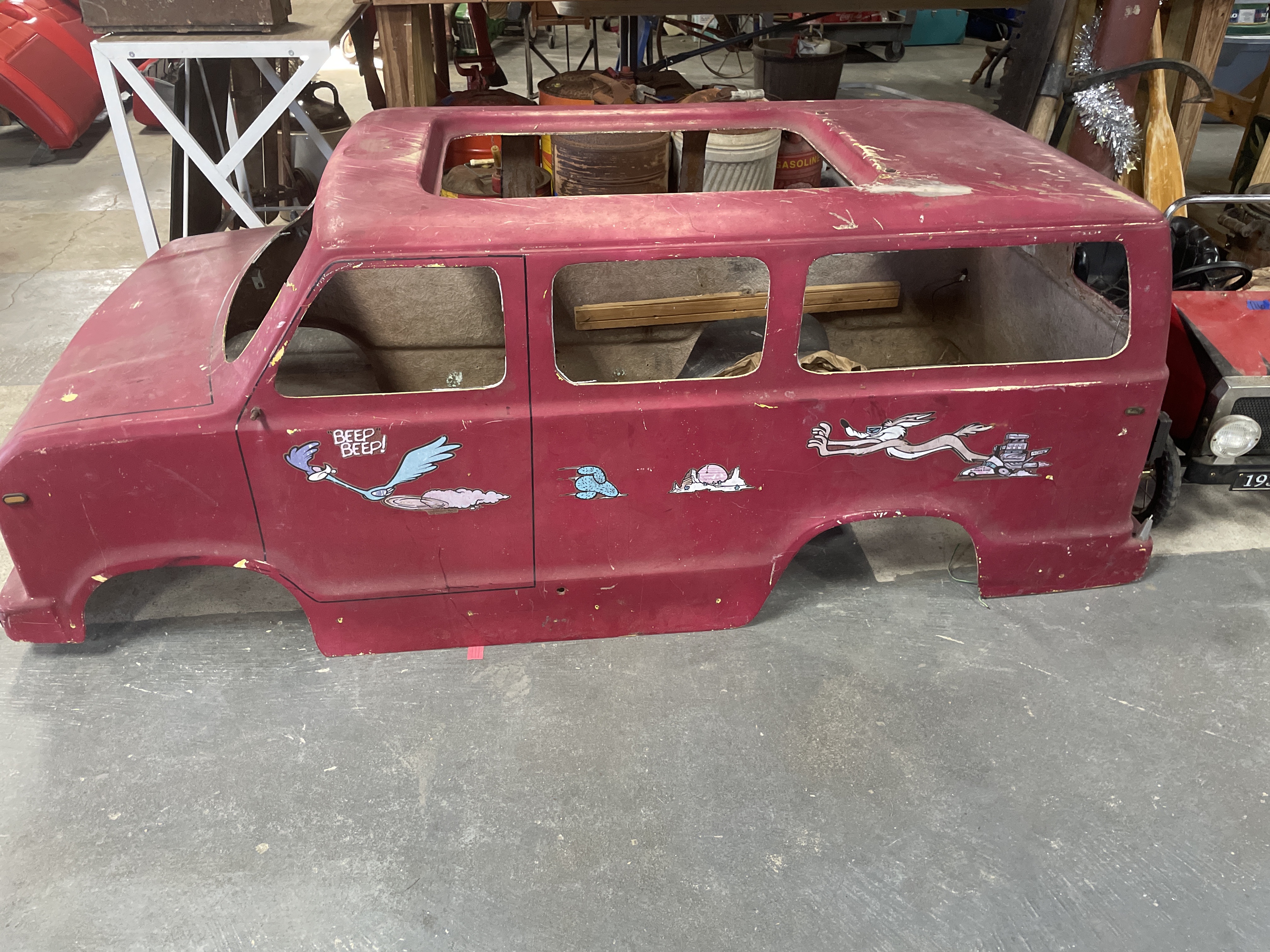 This is a single body shell for a large ride-on toy, identified through market consensus as a Firestone Promotional Go-Kart Van, likely dating from the late 1970s. The shell is constructed of molded plastic or fiberglass and is styled as a panel van resembling a Ford Econoline. The exterior features a highly worn, faded magenta finish. The front includes a plastic grille section with a blue oval Ford badge, an ACME Racing decal affixed to the hood, and a yellow miniature license plate reading TOY attached to the bumper. The driver’s side is decorated with character decals, including the Road Runner with visible text reading BEEP BEEP!. The item is incomplete, lacking a chassis, wheels, and all mechanical components. The interior is exposed, revealing rough wooden supports, and the plastic body features large openings cut for windows and a sunroof.