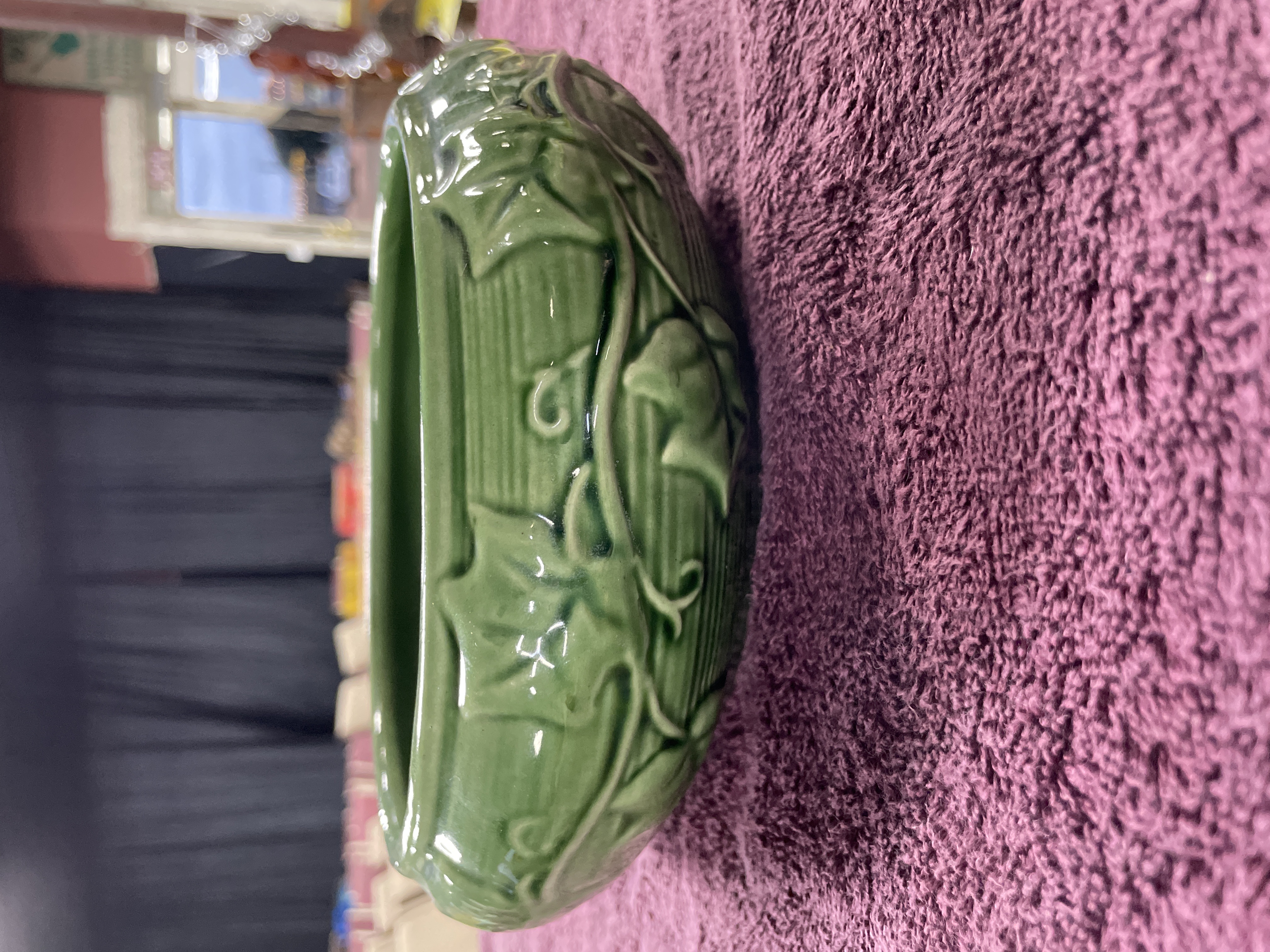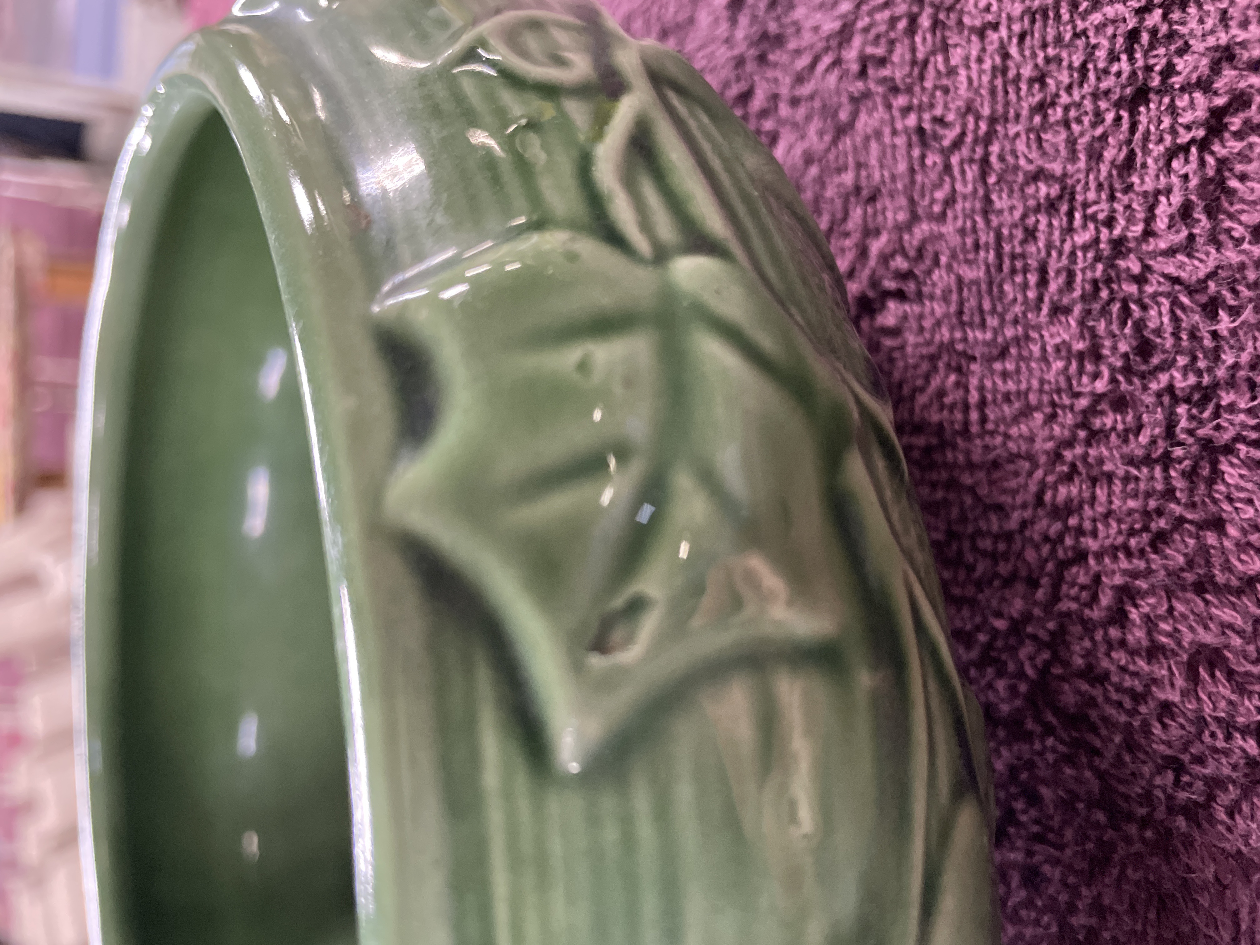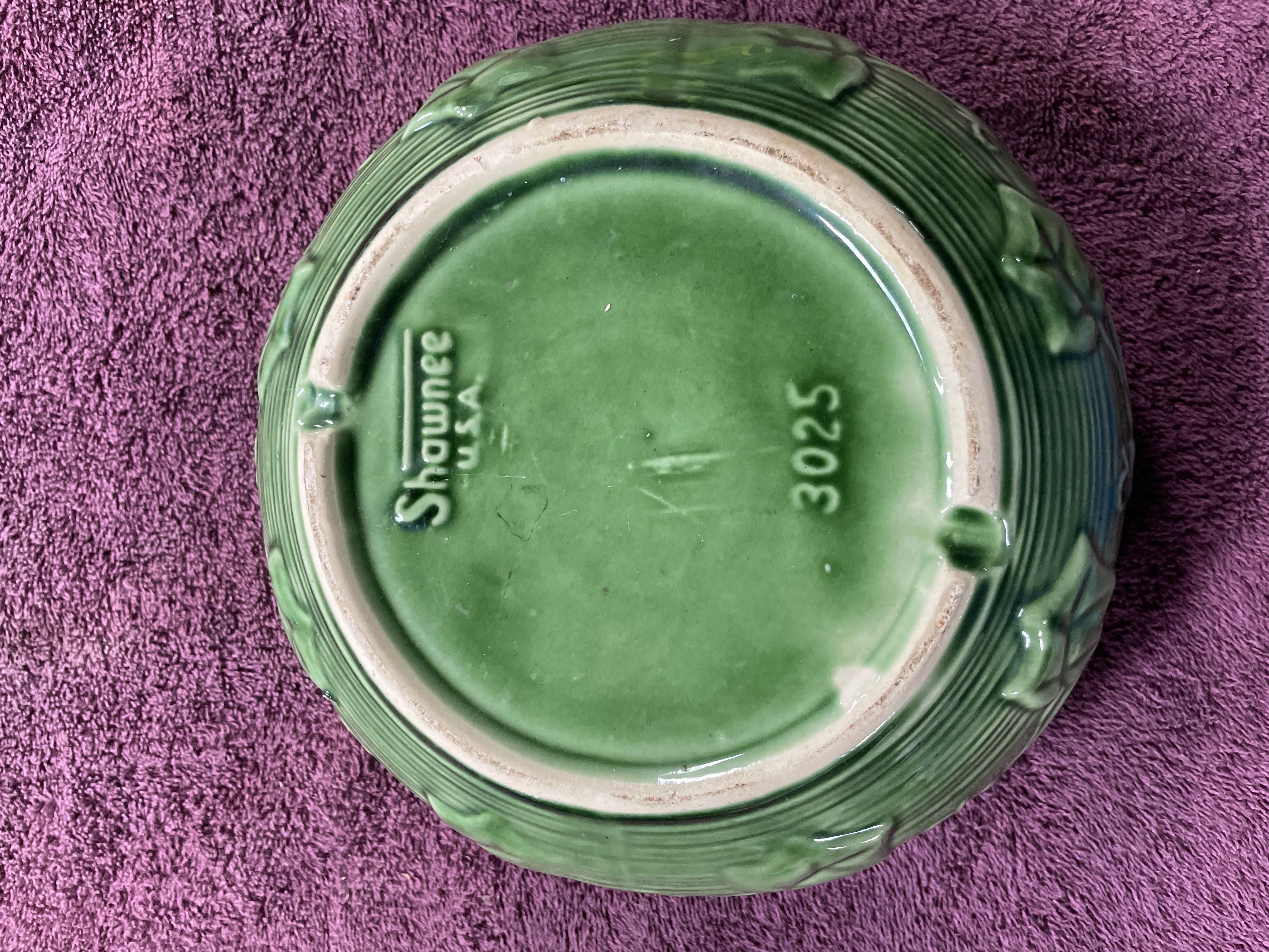 A single ceramic planter bowl manufactured by Shawnee USA Pottery, identified by the Ivy pattern and Mold 3025. The low, circular bowl form is finished in a glossy medium green glaze. The exterior body is decorated with a heavily molded relief design incorporating stylized ivy leaves alternating with horizontal ribbing. The base is clearly impressed with the manufacturer’s mark Shawnee USA above the mold number 3025.