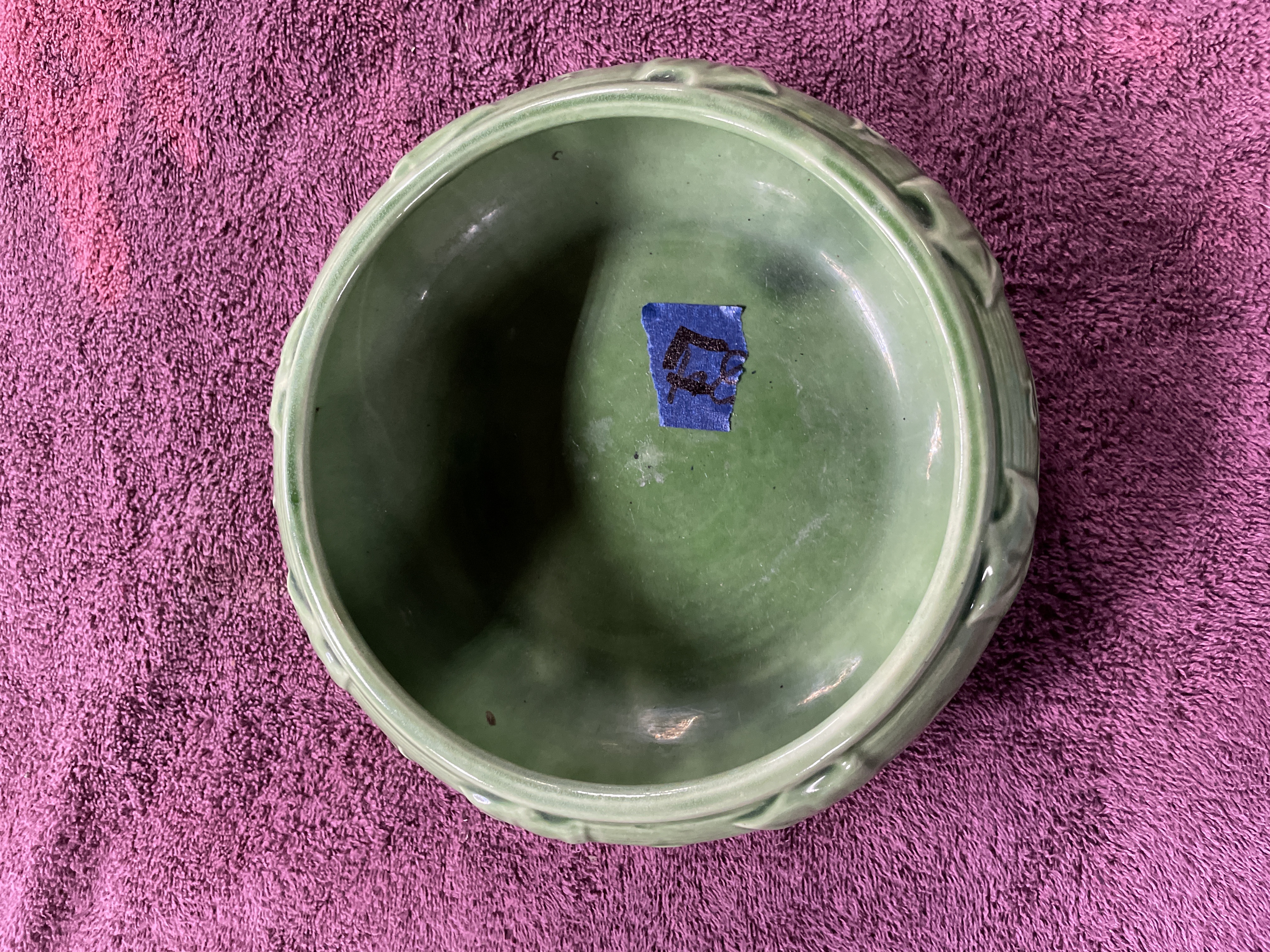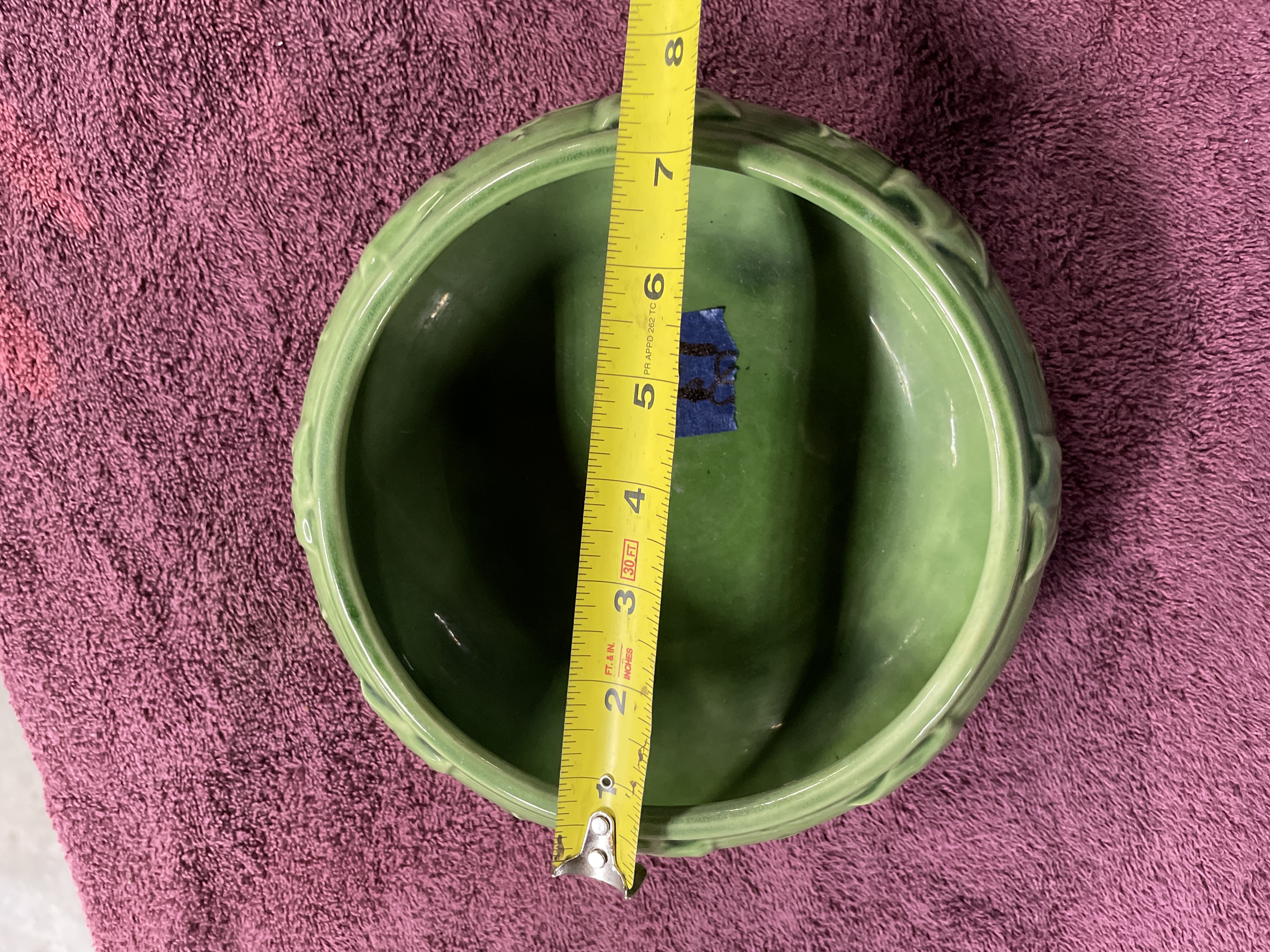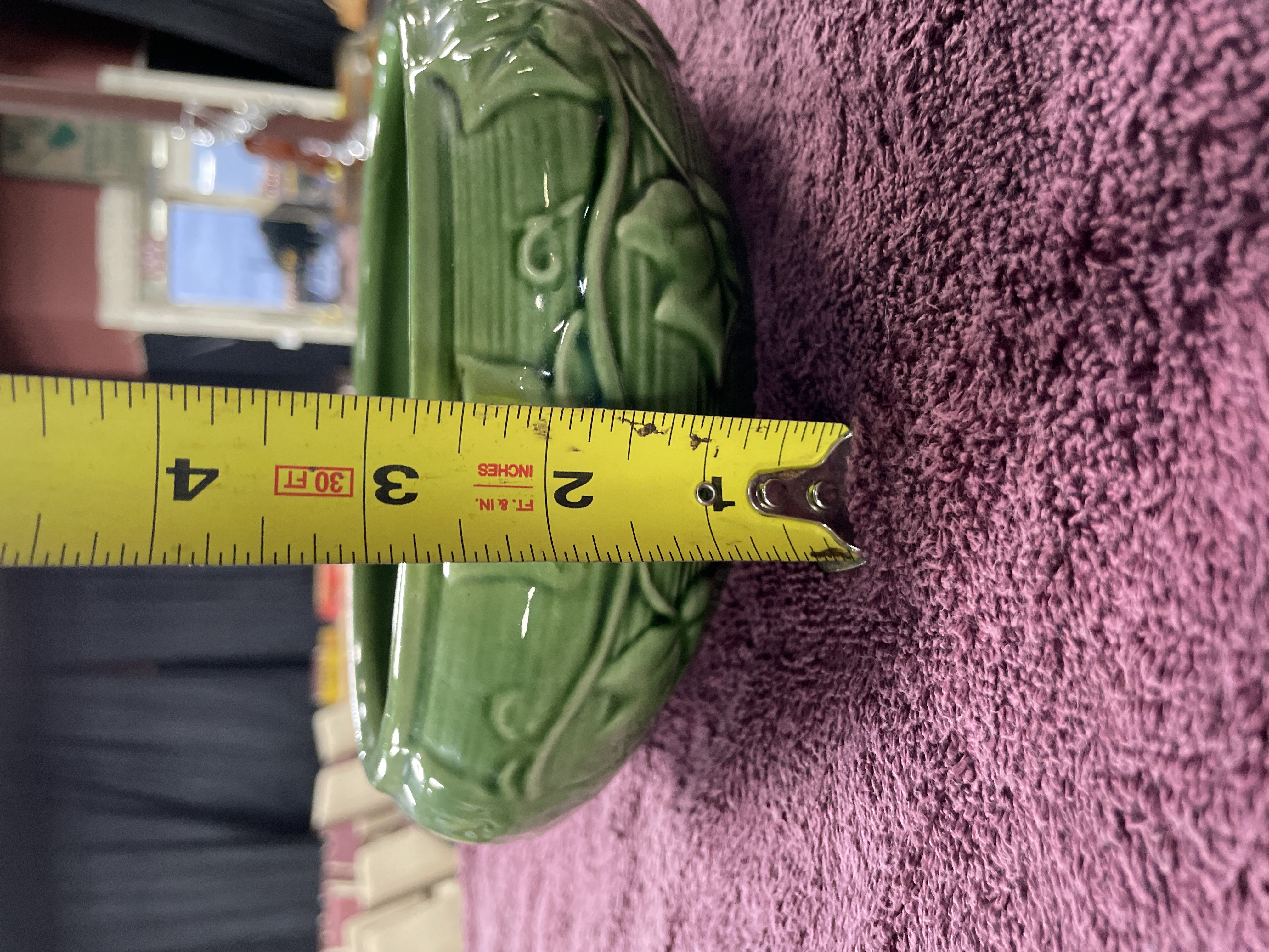 A single ceramic planter bowl manufactured by Shawnee USA Pottery, identified by the Ivy pattern and Mold 3025. The low, circular bowl form is finished in a glossy medium green glaze. The exterior body is decorated with a heavily molded relief design incorporating stylized ivy leaves alternating with horizontal ribbing. The base is clearly impressed with the manufacturer’s mark Shawnee USA above the mold number 3025.