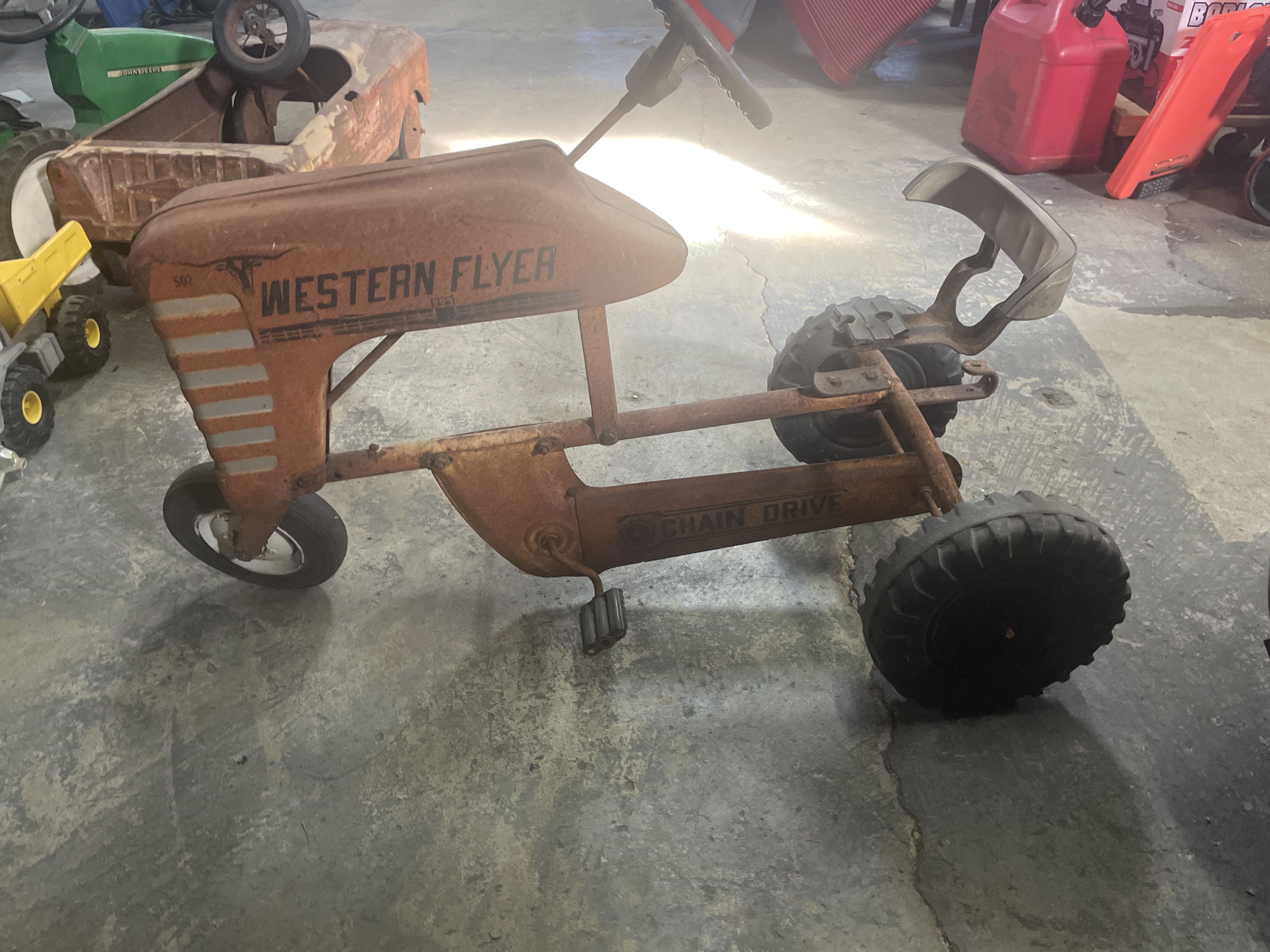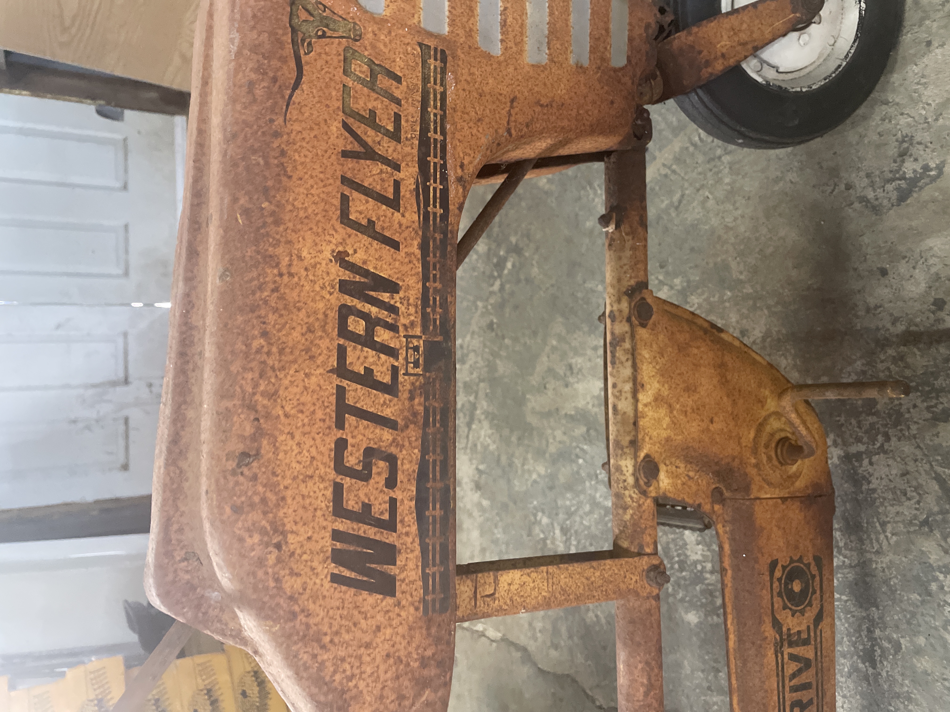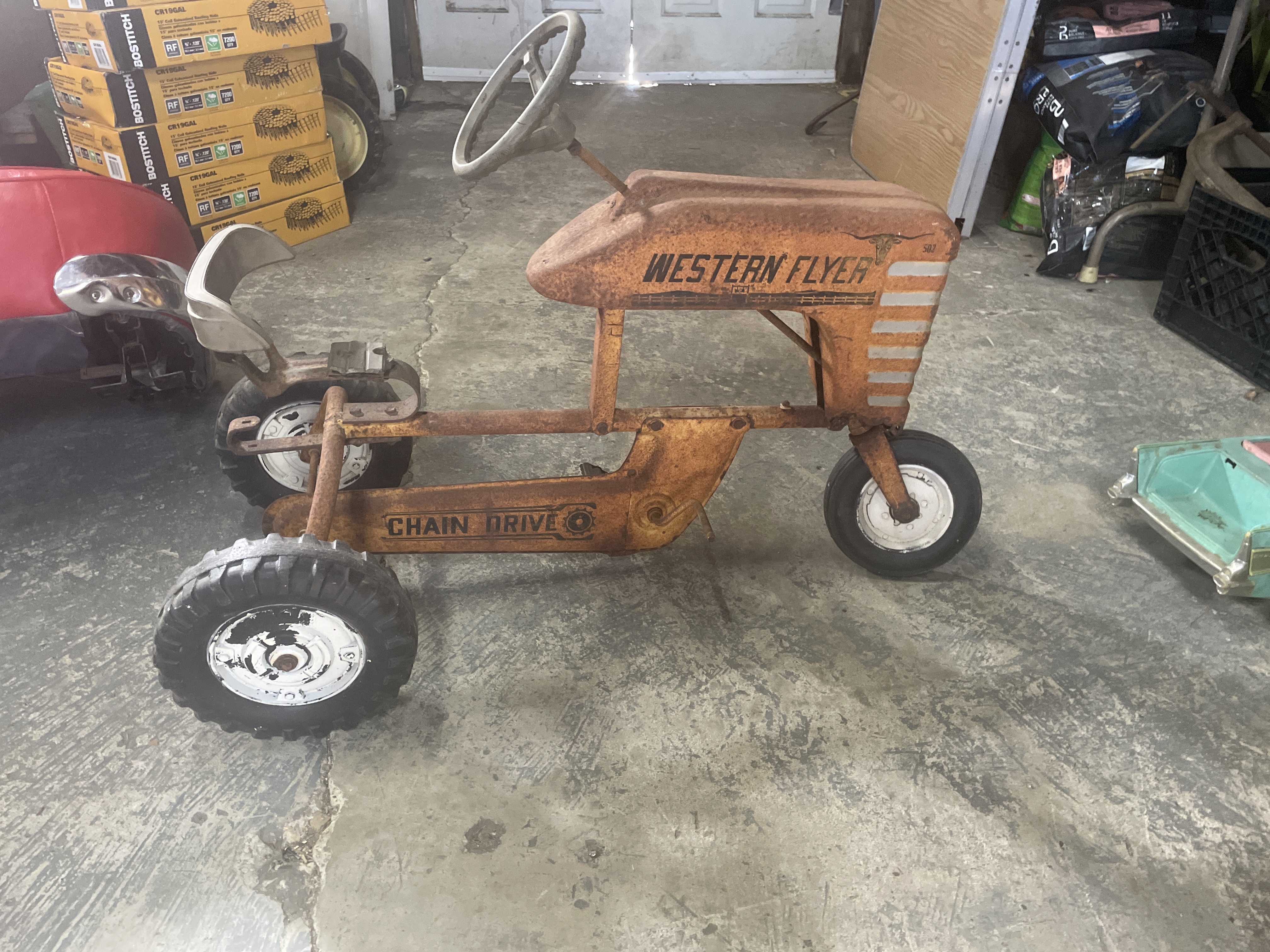 A vintage ride-on toy pedal tractor, identified through market consensus as a Western Flyer Chain Drive model, likely dating to the mid-20th century. The tractor is constructed primarily of sheet metal and steel with four rubber tires. The body retains several original decals, including “WESTERN FLYER” displayed prominently on the hood above a graphic depicting a fence line and steer head. The lower frame is marked “CHAIN DRIVE” adjacent to a stylized sprocket image, confirming the drive mechanism. The front grille section retains faint horizontal silver/gray stripes, suggesting the original paint color was likely orange or red beneath the heavy corrosion. The steering wheel and pedal mechanisms are present.