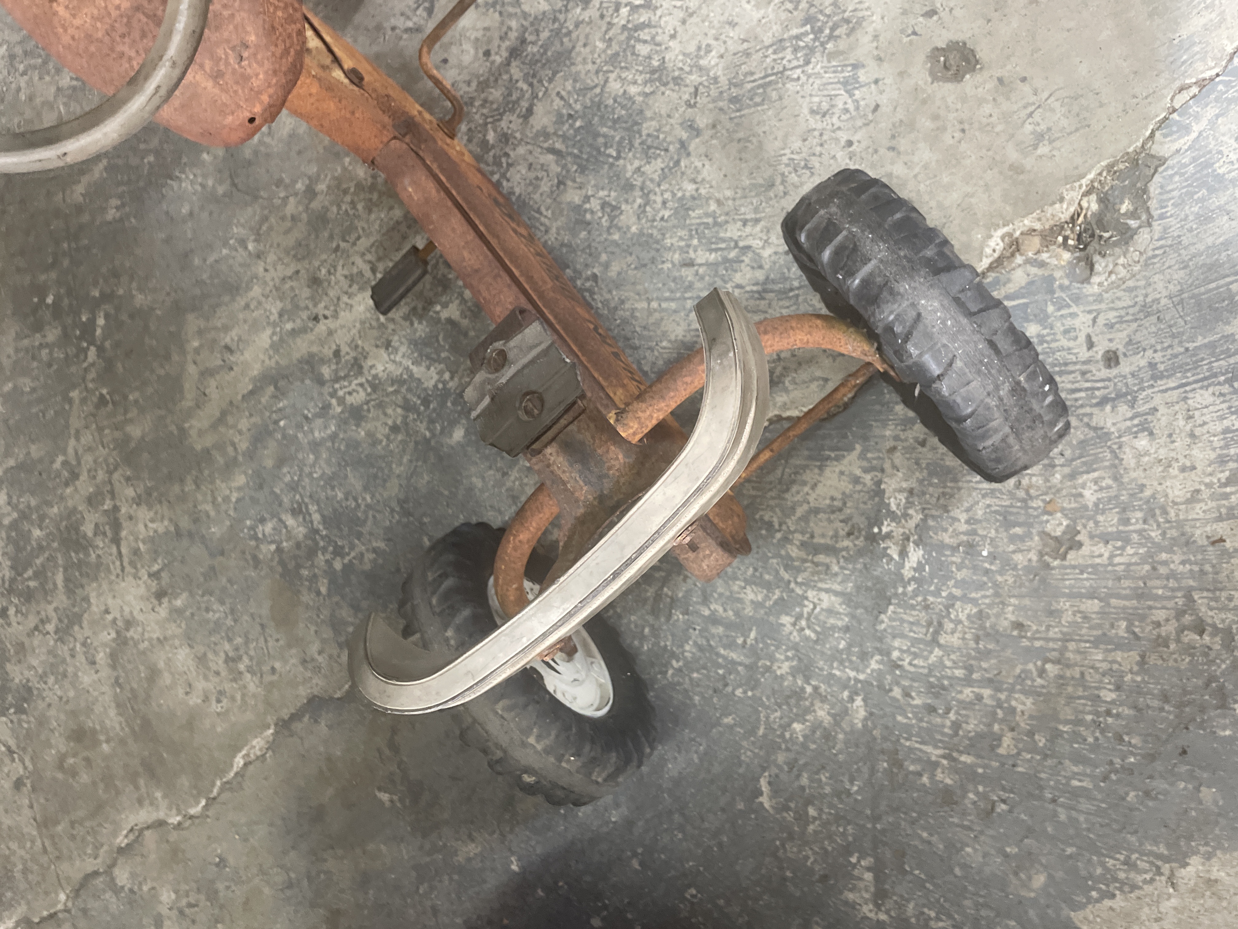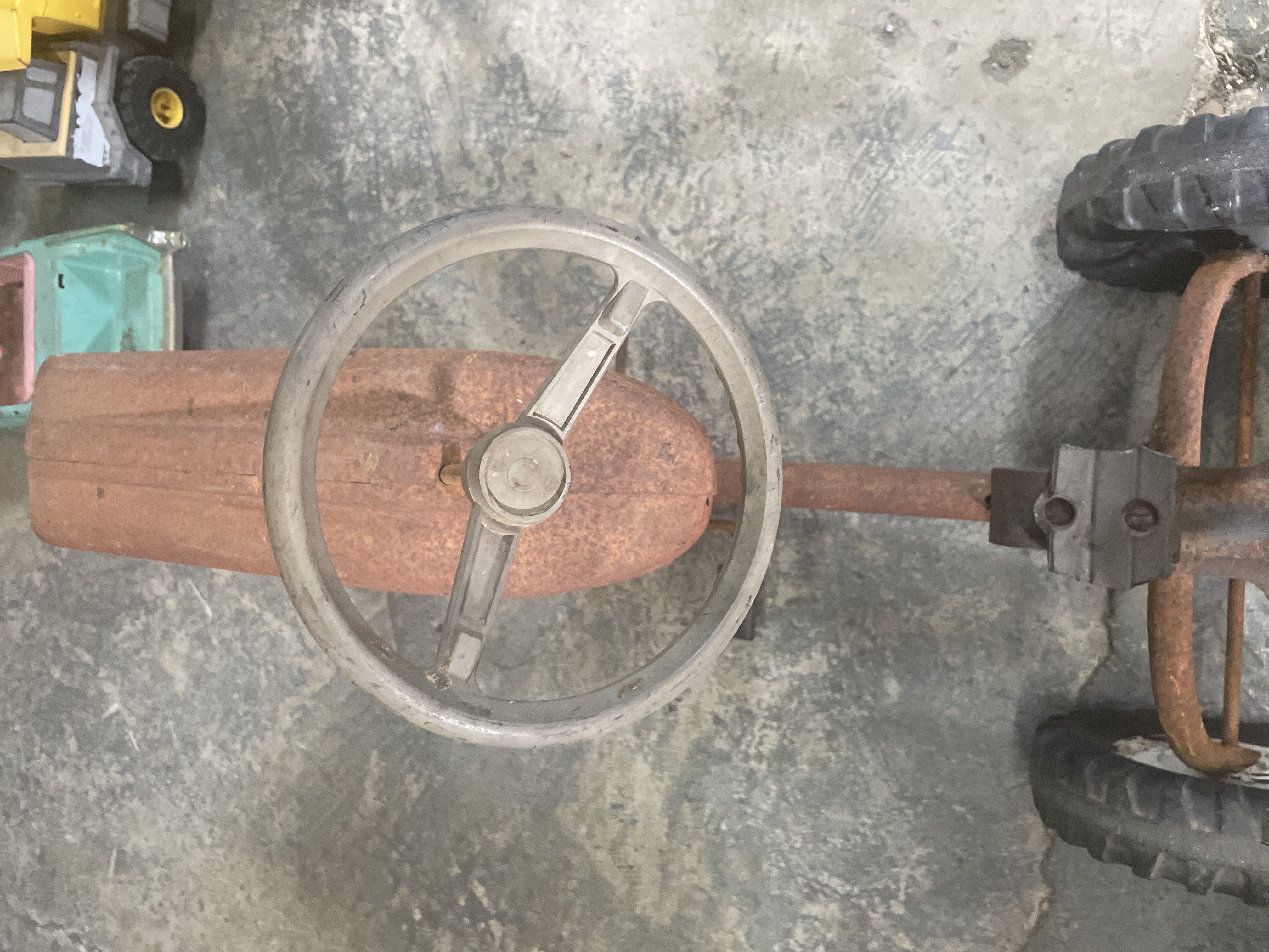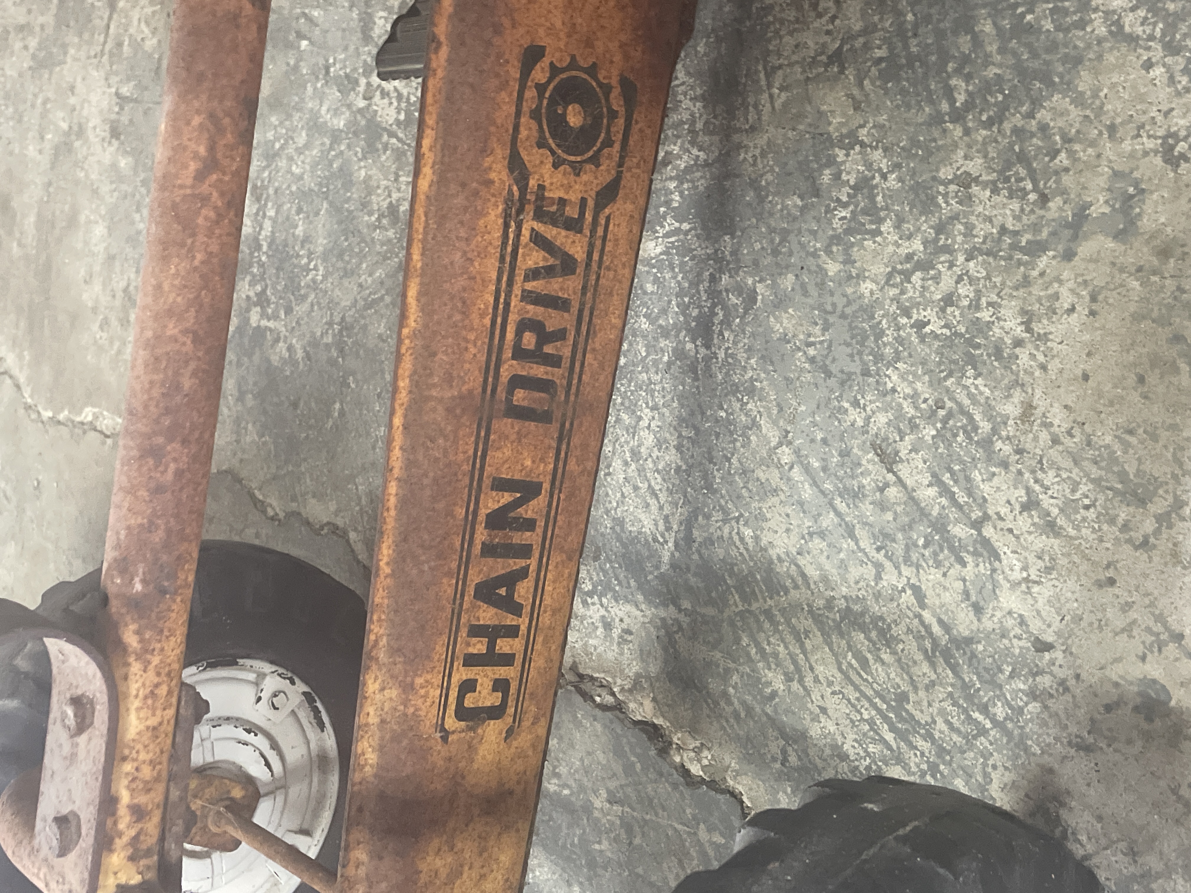 A vintage ride-on toy pedal tractor, identified through market consensus as a Western Flyer Chain Drive model, likely dating to the mid-20th century. The tractor is constructed primarily of sheet metal and steel with four rubber tires. The body retains several original decals, including “WESTERN FLYER” displayed prominently on the hood above a graphic depicting a fence line and steer head. The lower frame is marked “CHAIN DRIVE” adjacent to a stylized sprocket image, confirming the drive mechanism. The front grille section retains faint horizontal silver/gray stripes, suggesting the original paint color was likely orange or red beneath the heavy corrosion. The steering wheel and pedal mechanisms are present.