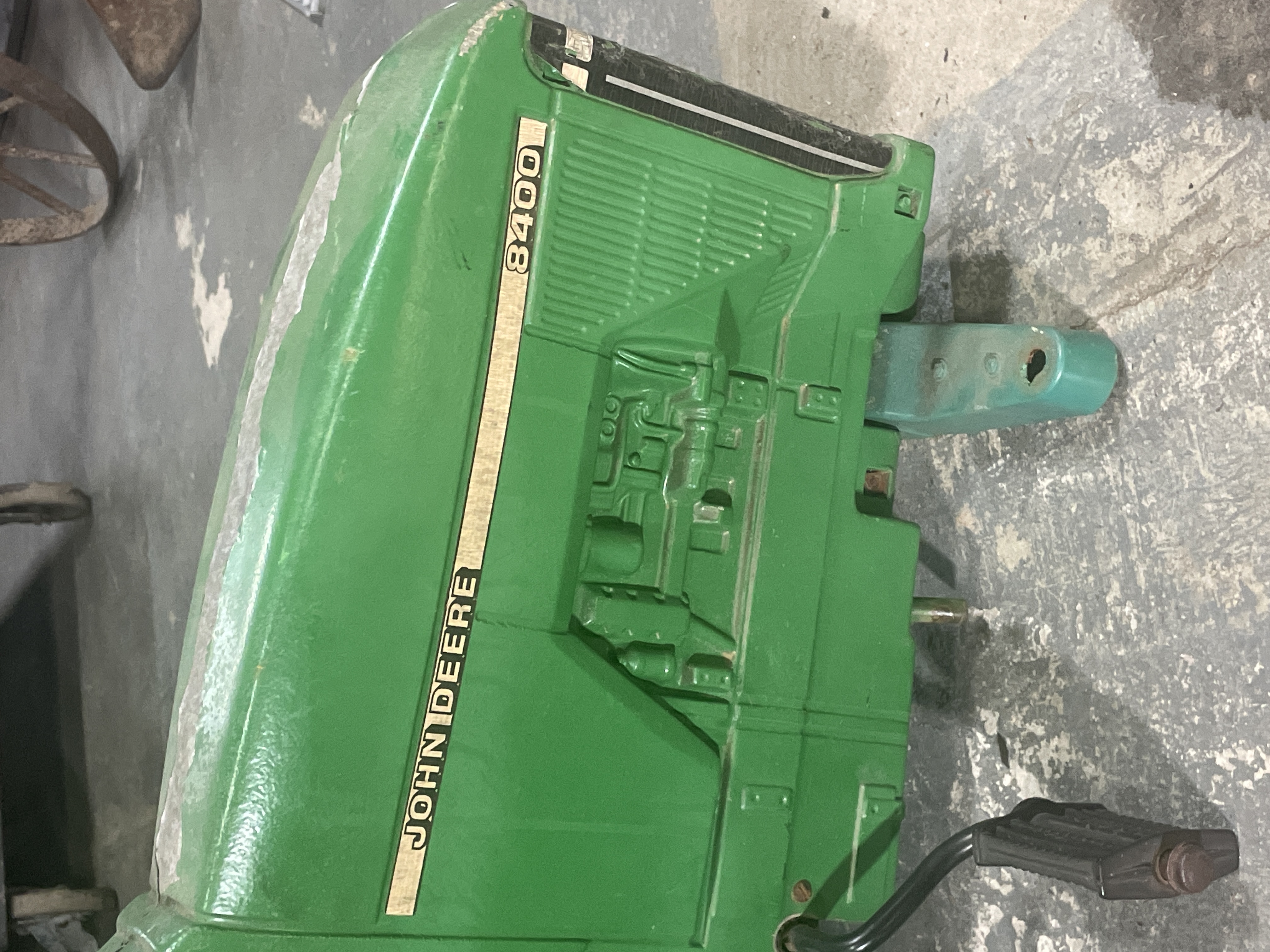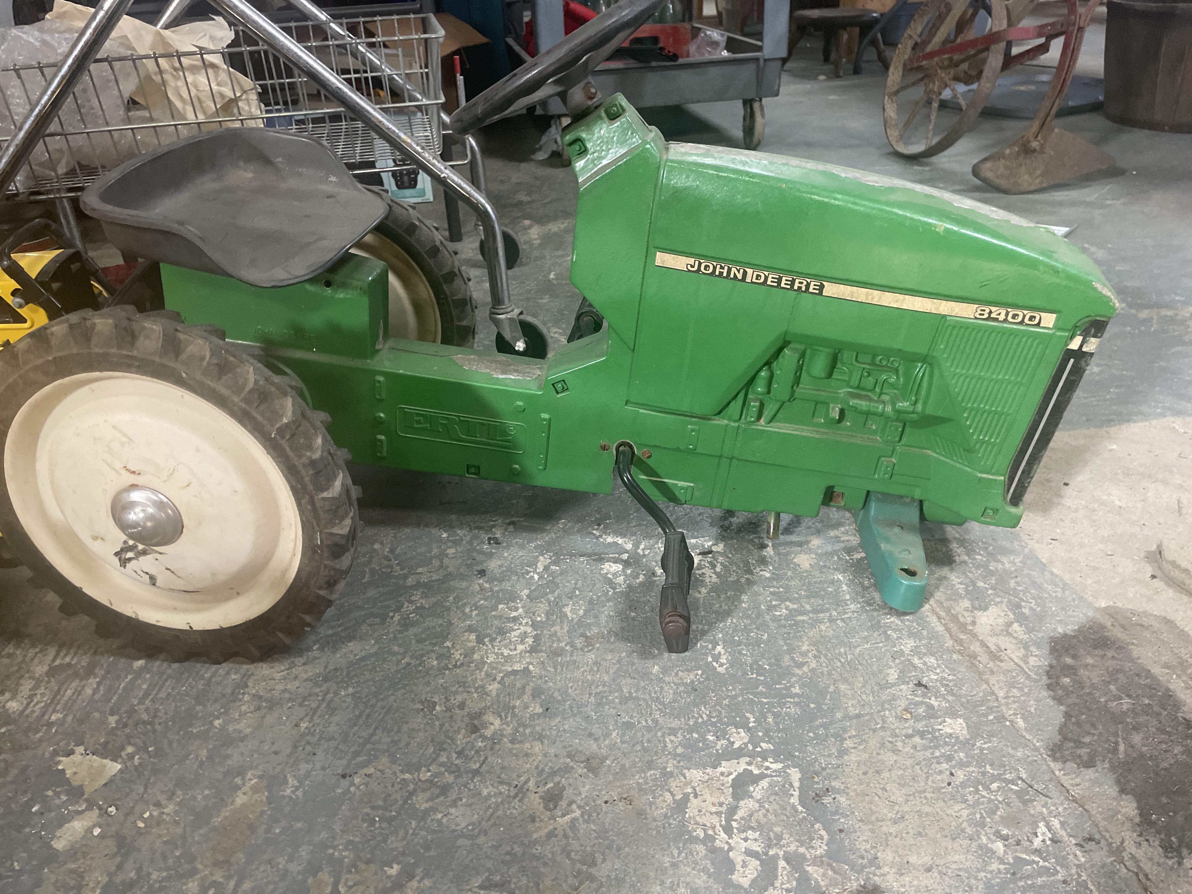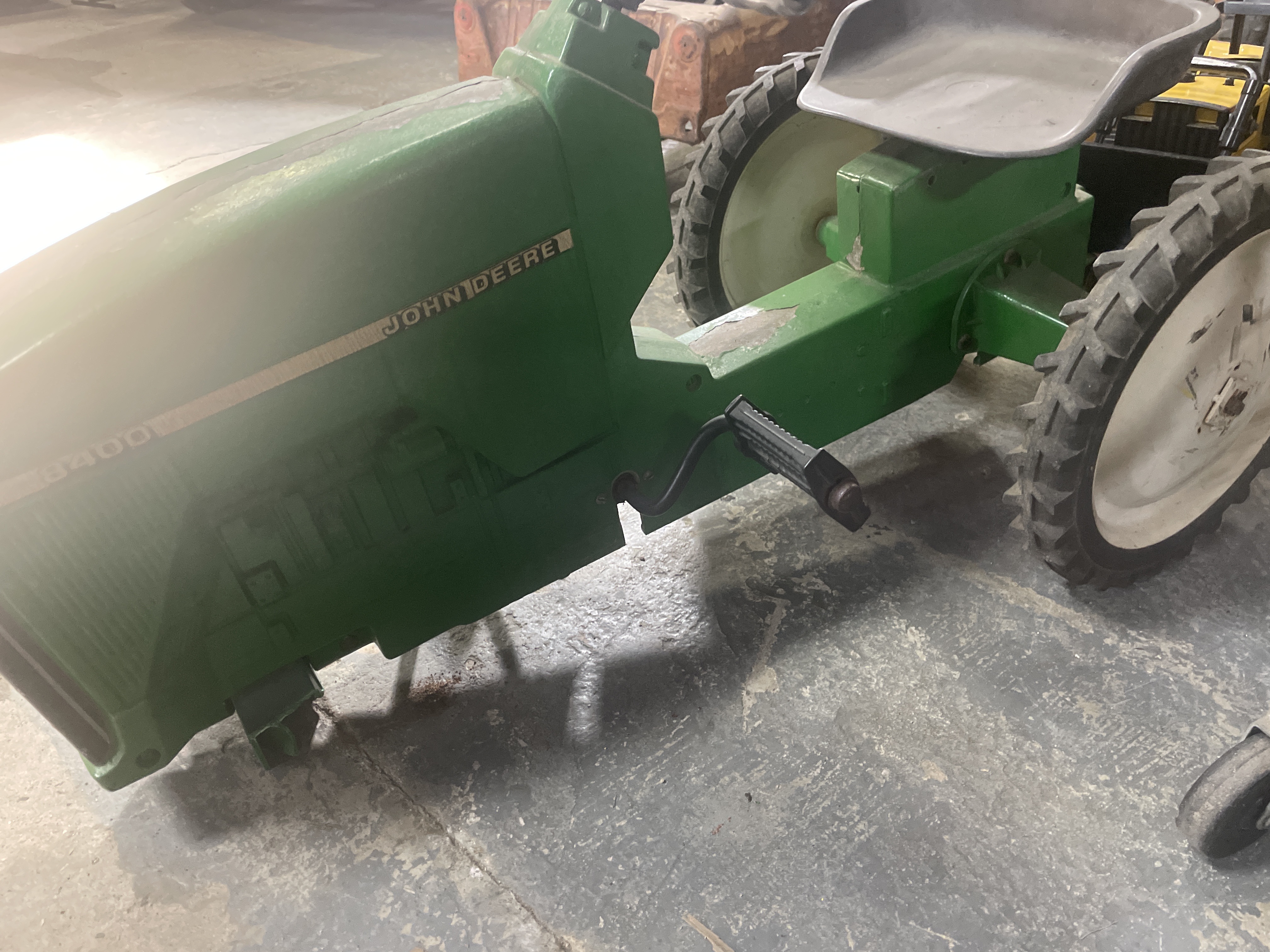 A child’s pedal tractor styled after the John Deere 8400 series farm tractor. The item is constructed primarily of molded plastic and metal components, finished in the traditional John Deere green color. The hood features visible decals reading JOHN DEERE and 8400. The tractor includes a black plastic seat, steering wheel, and rubber tires mounted on white wheels. The design features molded engine details on the side panels.