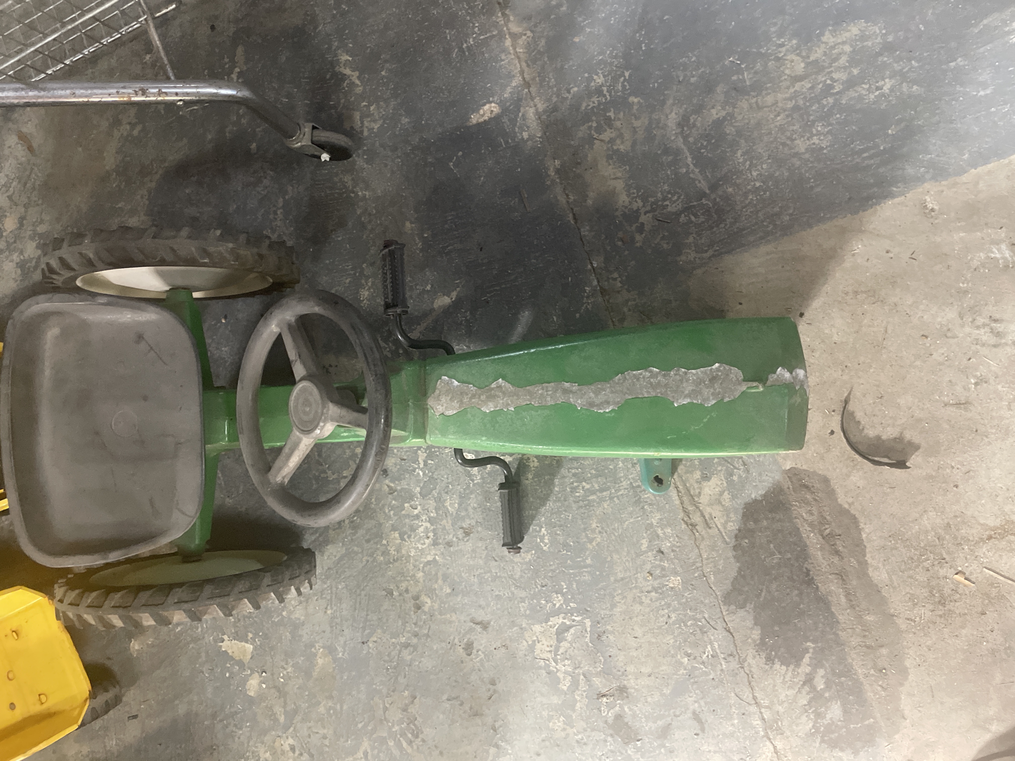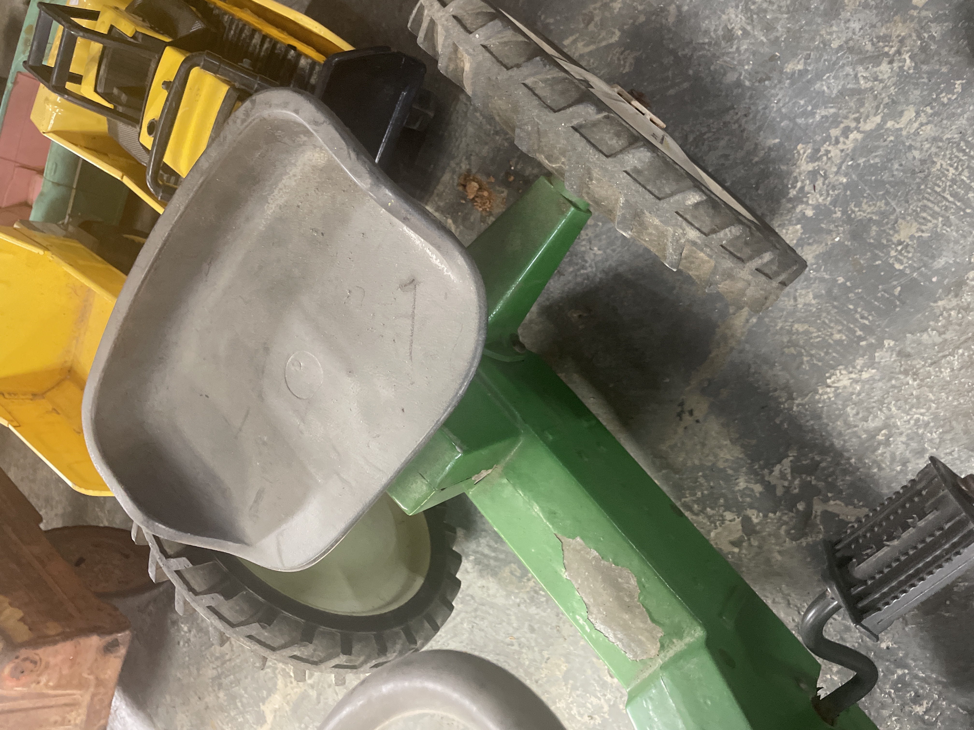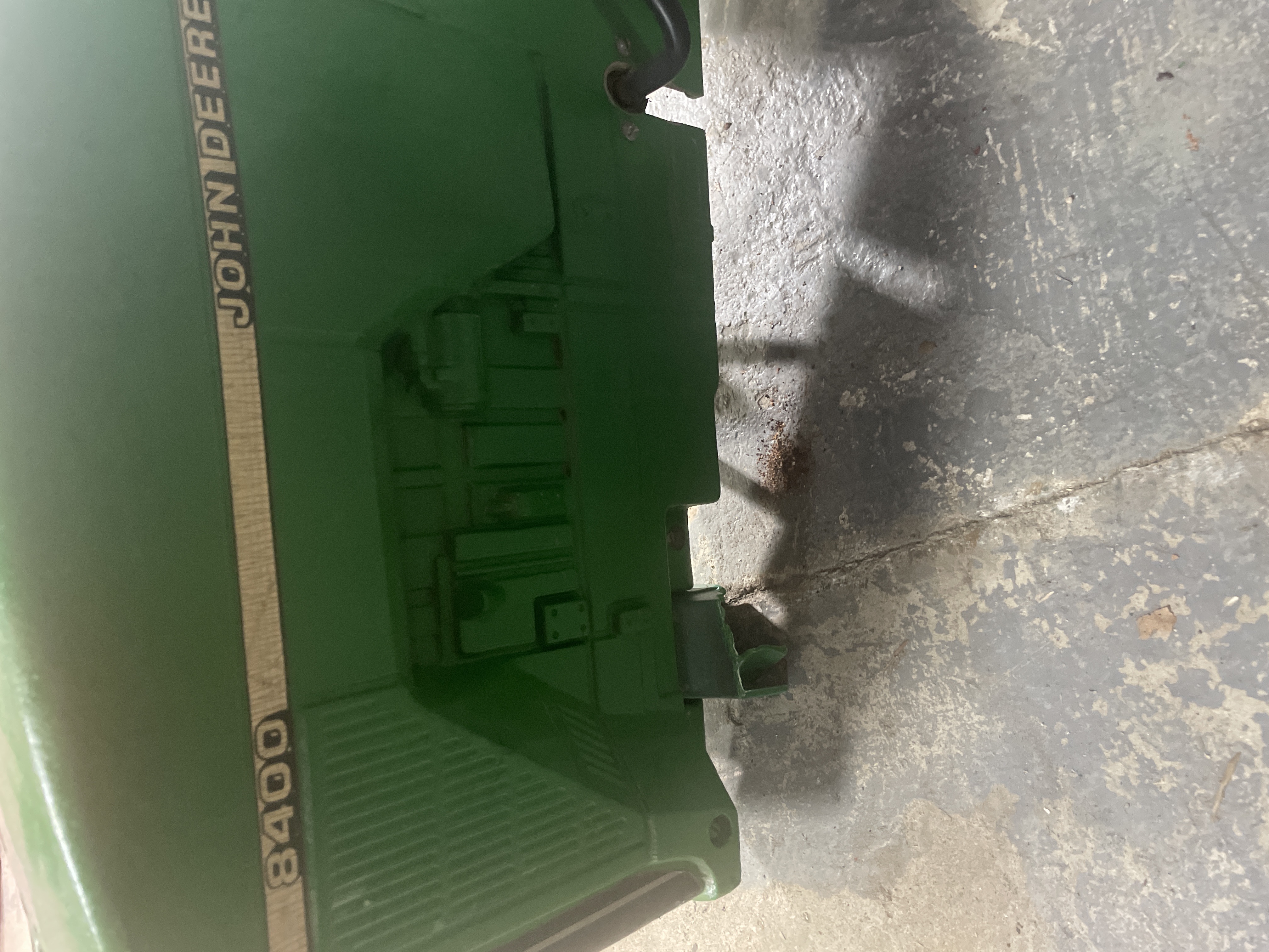 A child’s pedal tractor styled after the John Deere 8400 series farm tractor. The item is constructed primarily of molded plastic and metal components, finished in the traditional John Deere green color. The hood features visible decals reading JOHN DEERE and 8400. The tractor includes a black plastic seat, steering wheel, and rubber tires mounted on white wheels. The design features molded engine details on the side panels.