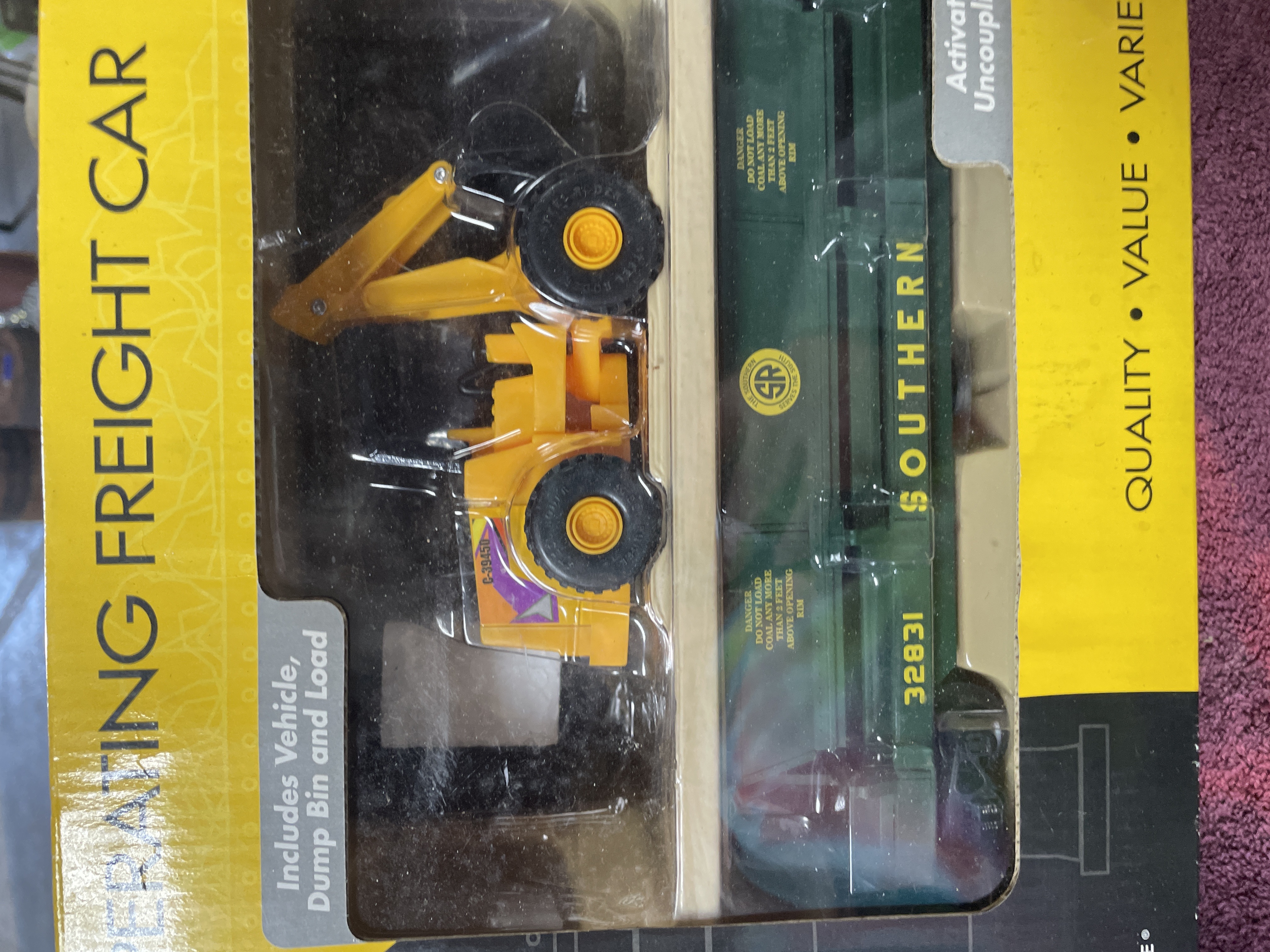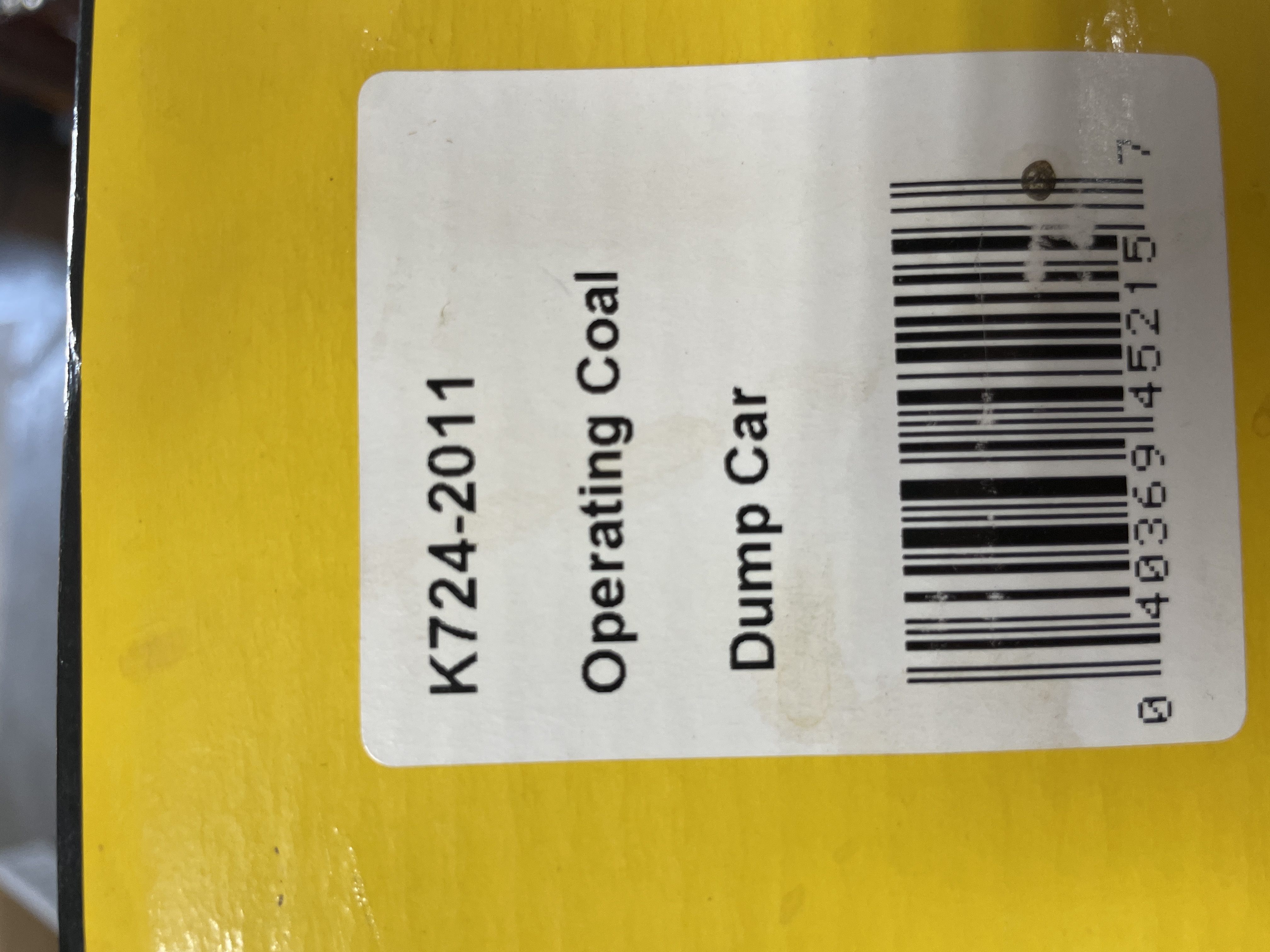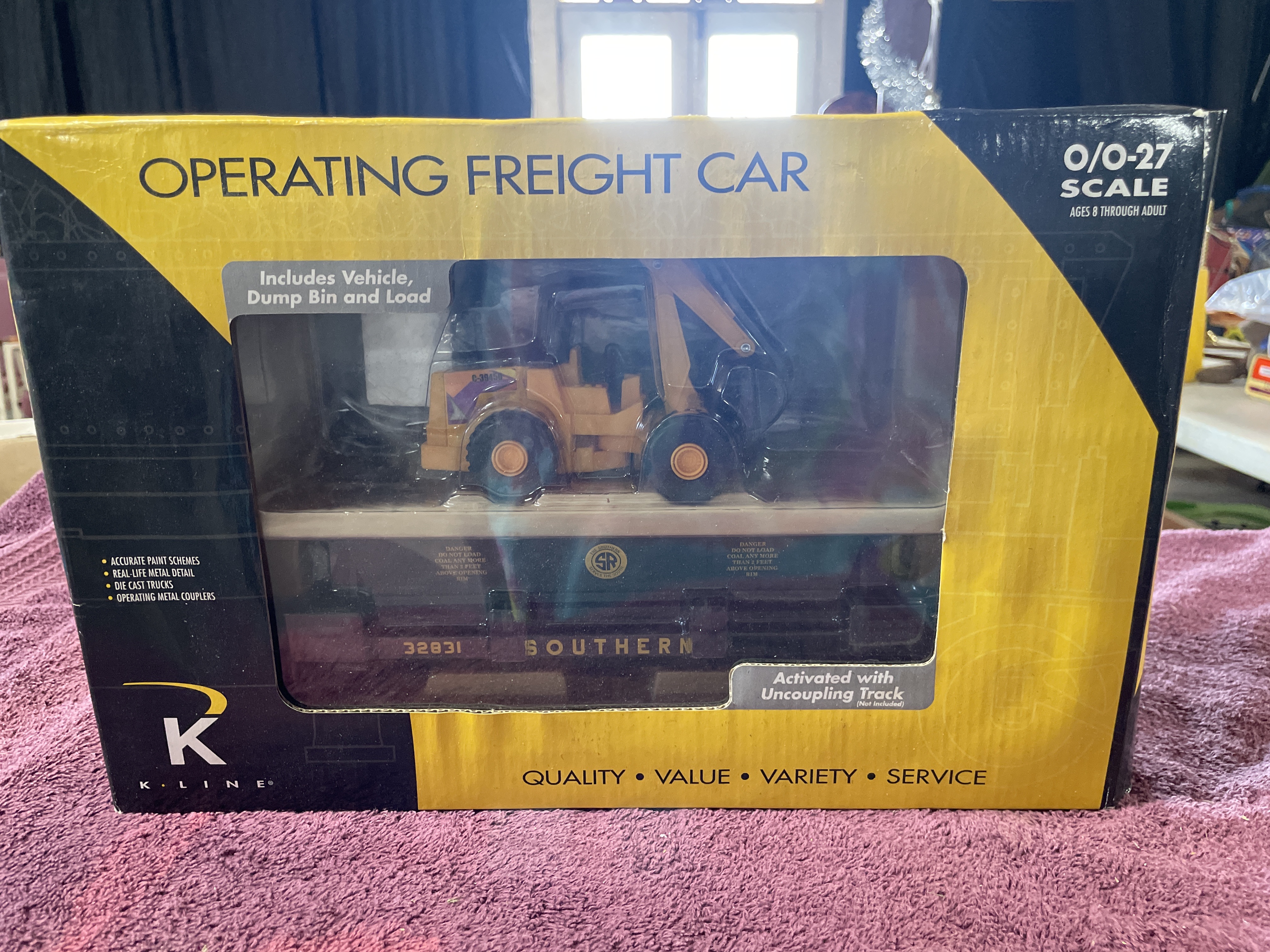A K-LINE O/O-27 scale Operating Coal Dump Car set, model number K724-2011, designed for model railroading. The set is packaged in its original yellow and black retail box and contains four distinct components: one dark green Southern Railway operating freight car (numbered 32831), one yellow and black construction vehicle (likely a front-end loader or scoop, consistent with Ertl-style trackside equipment), one dump bin, and a simulated coal load. The freight car features the Southern Railway ‘SR’ herald, die-cast trucks, and operating metal couplers. Safety warnings regarding load limits are printed in yellow text on the car body. The operating feature of the dump car is designed to be activated with an uncoupling track (not included). The packaging specifies the scale as O/O-27.