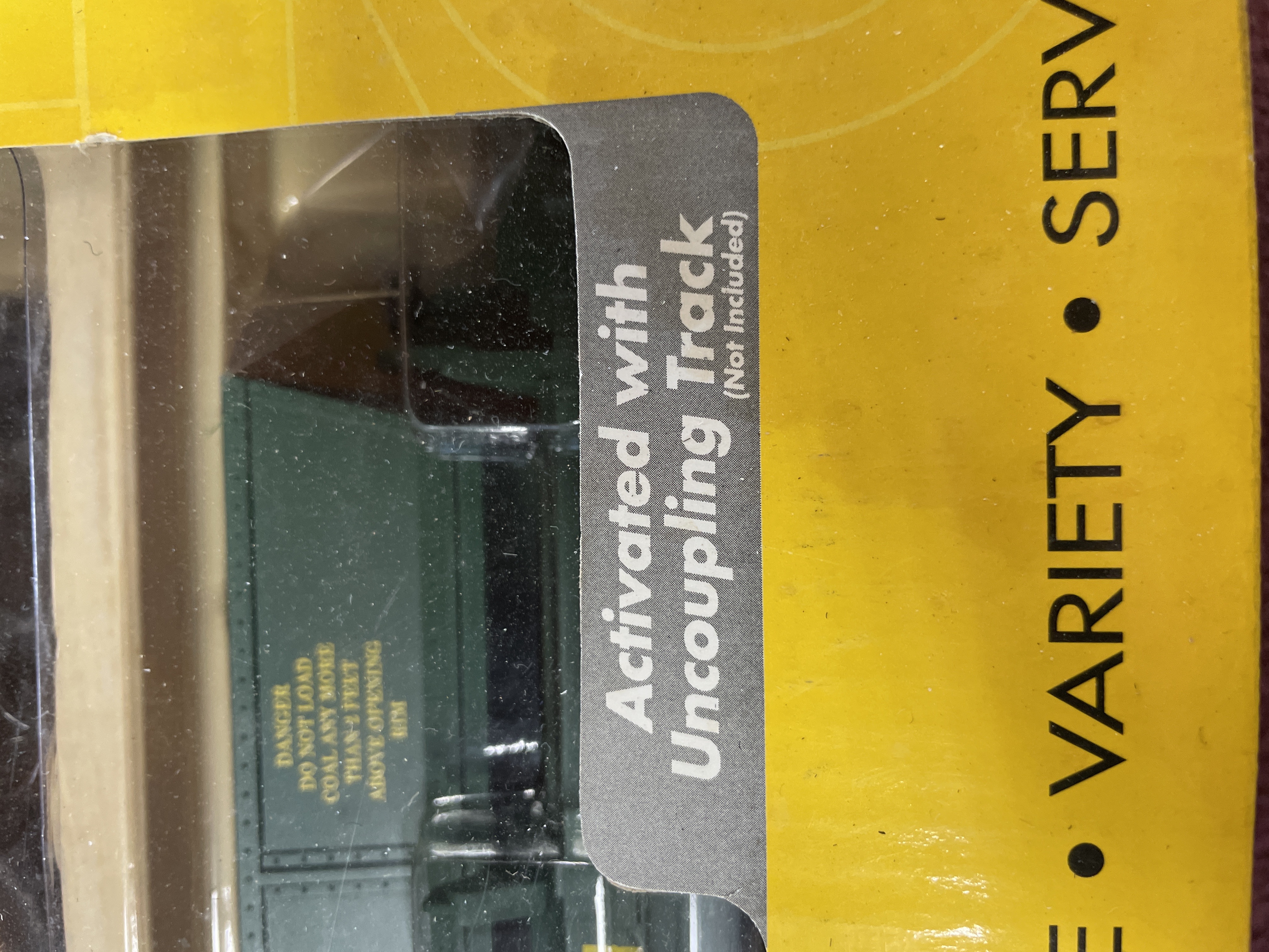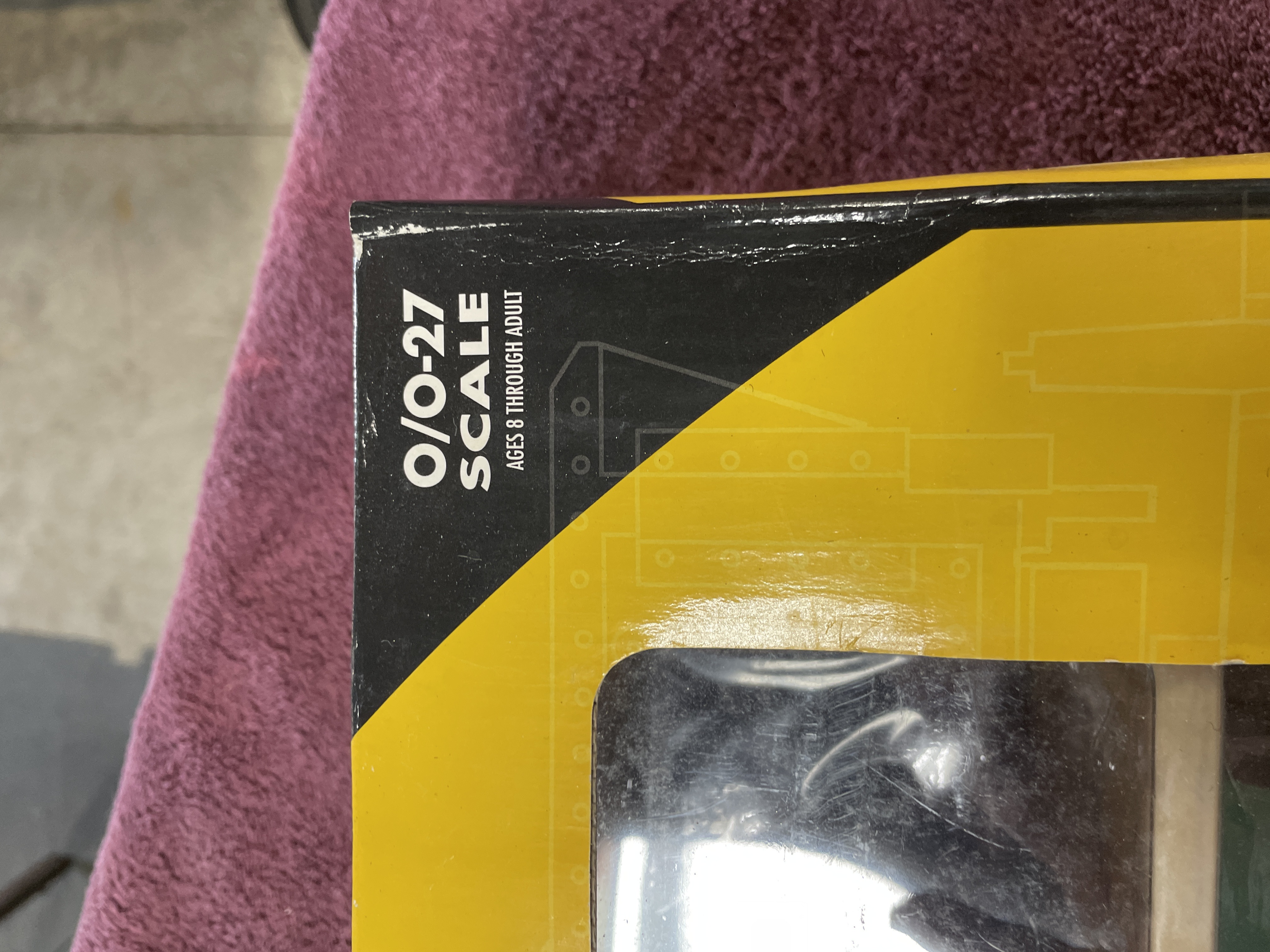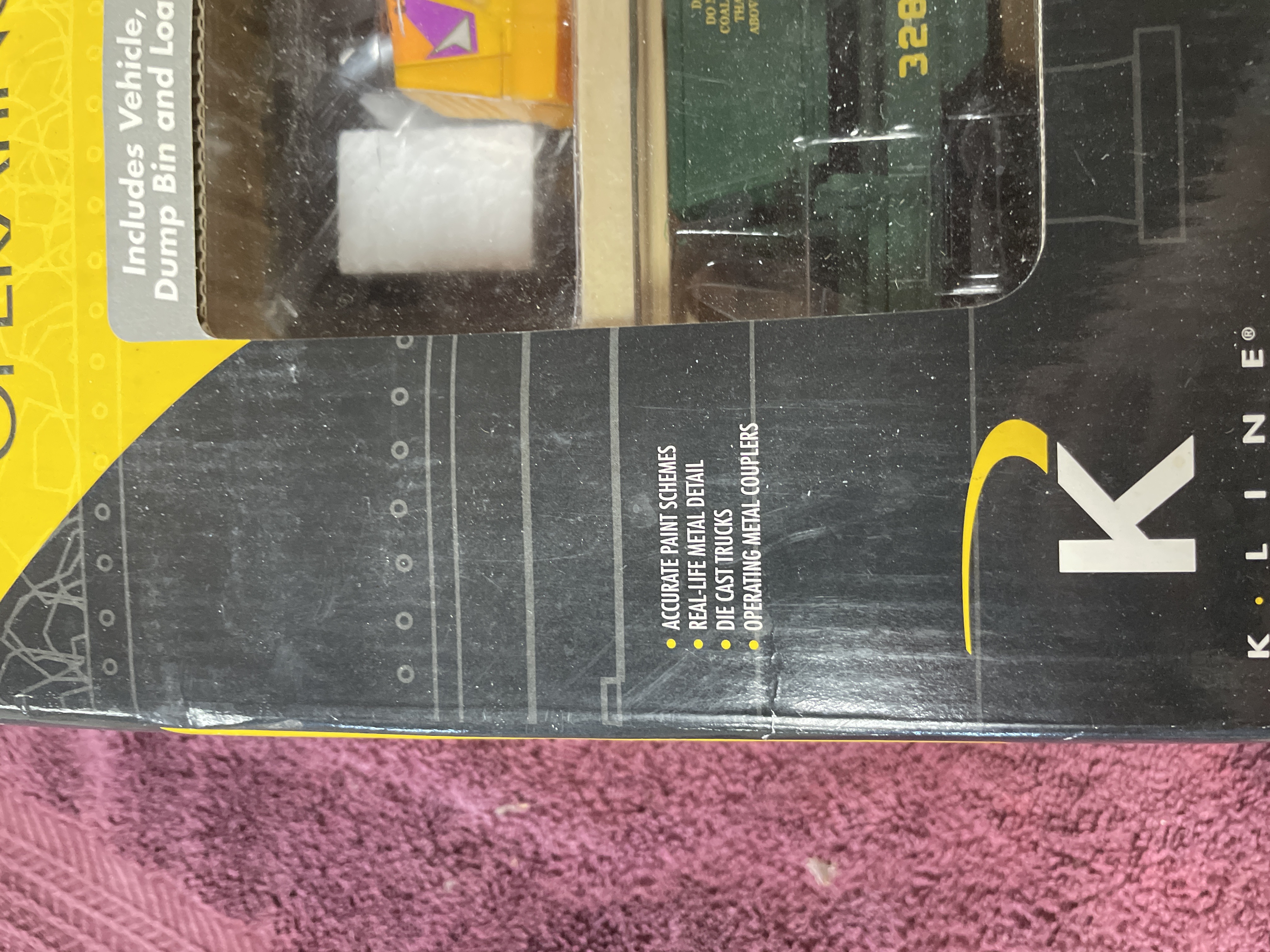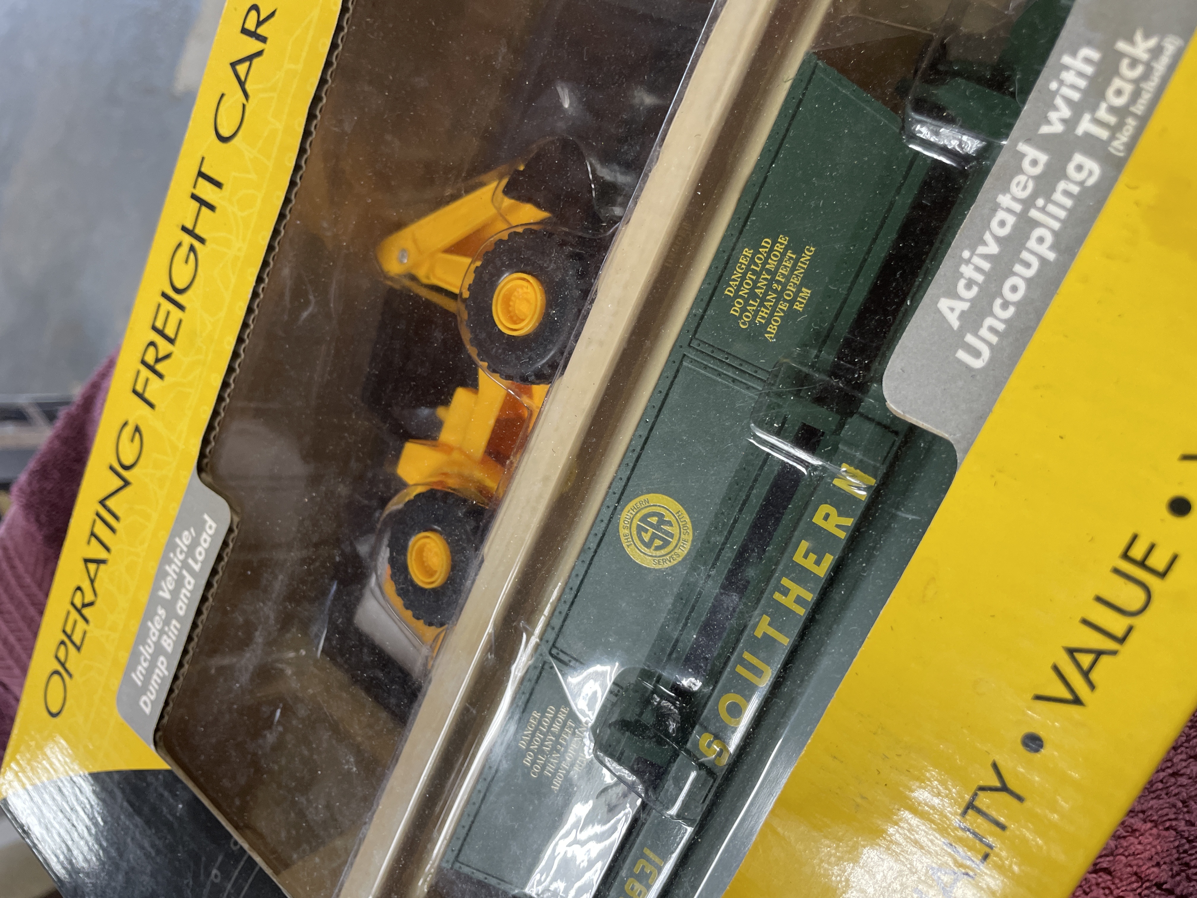 A K-LINE O/O-27 scale Operating Coal Dump Car set, model number K724-2011, designed for model railroading. The set is packaged in its original yellow and black retail box and contains four distinct components: one dark green Southern Railway operating freight car (numbered 32831), one yellow and black construction vehicle (likely a front-end loader or scoop, consistent with Ertl-style trackside equipment), one dump bin, and a simulated coal load. The freight car features the Southern Railway ‘SR’ herald, die-cast trucks, and operating metal couplers. Safety warnings regarding load limits are printed in yellow text on the car body. The operating feature of the dump car is designed to be activated with an uncoupling track (not included). The packaging specifies the scale as O/O-27.