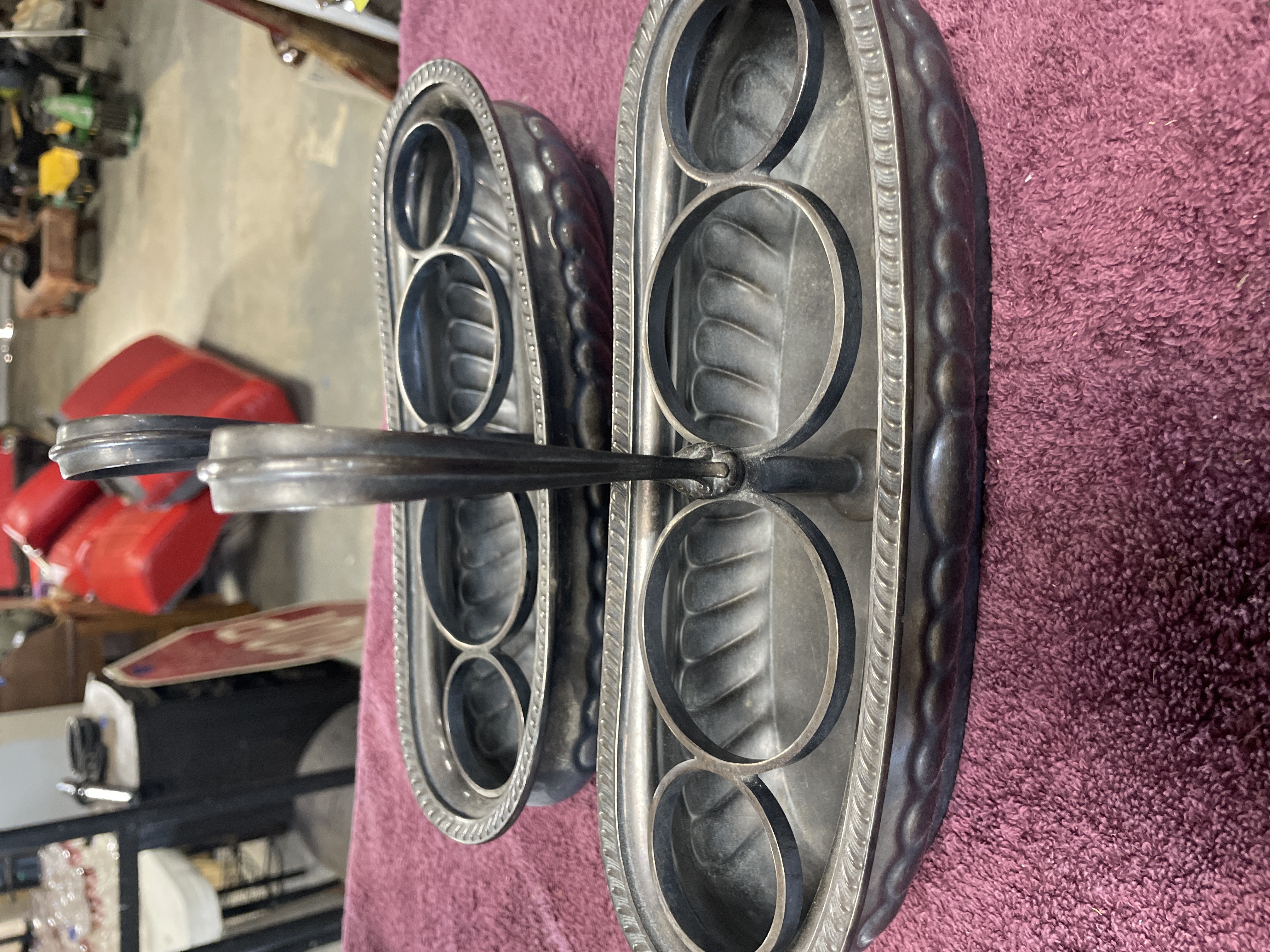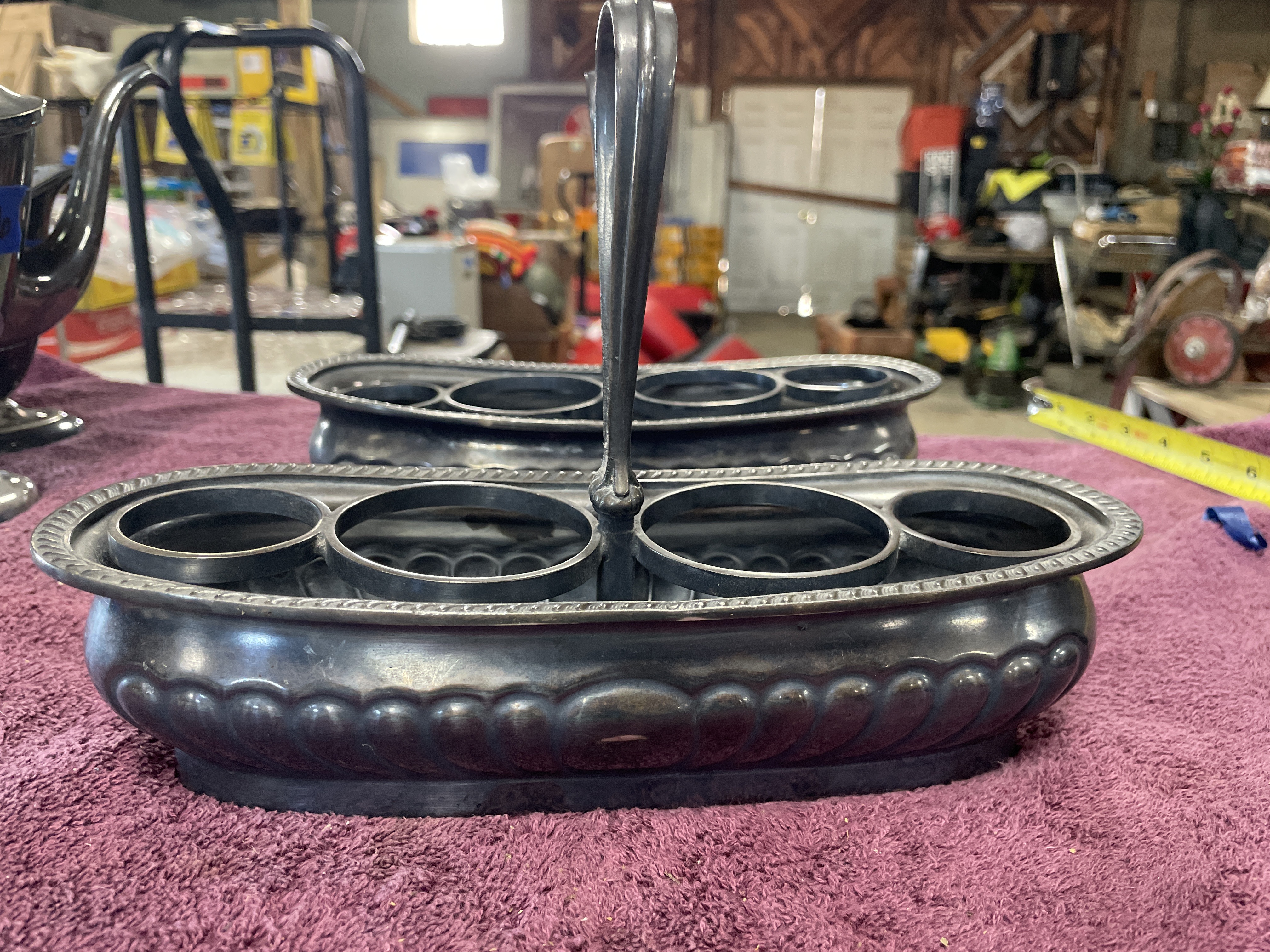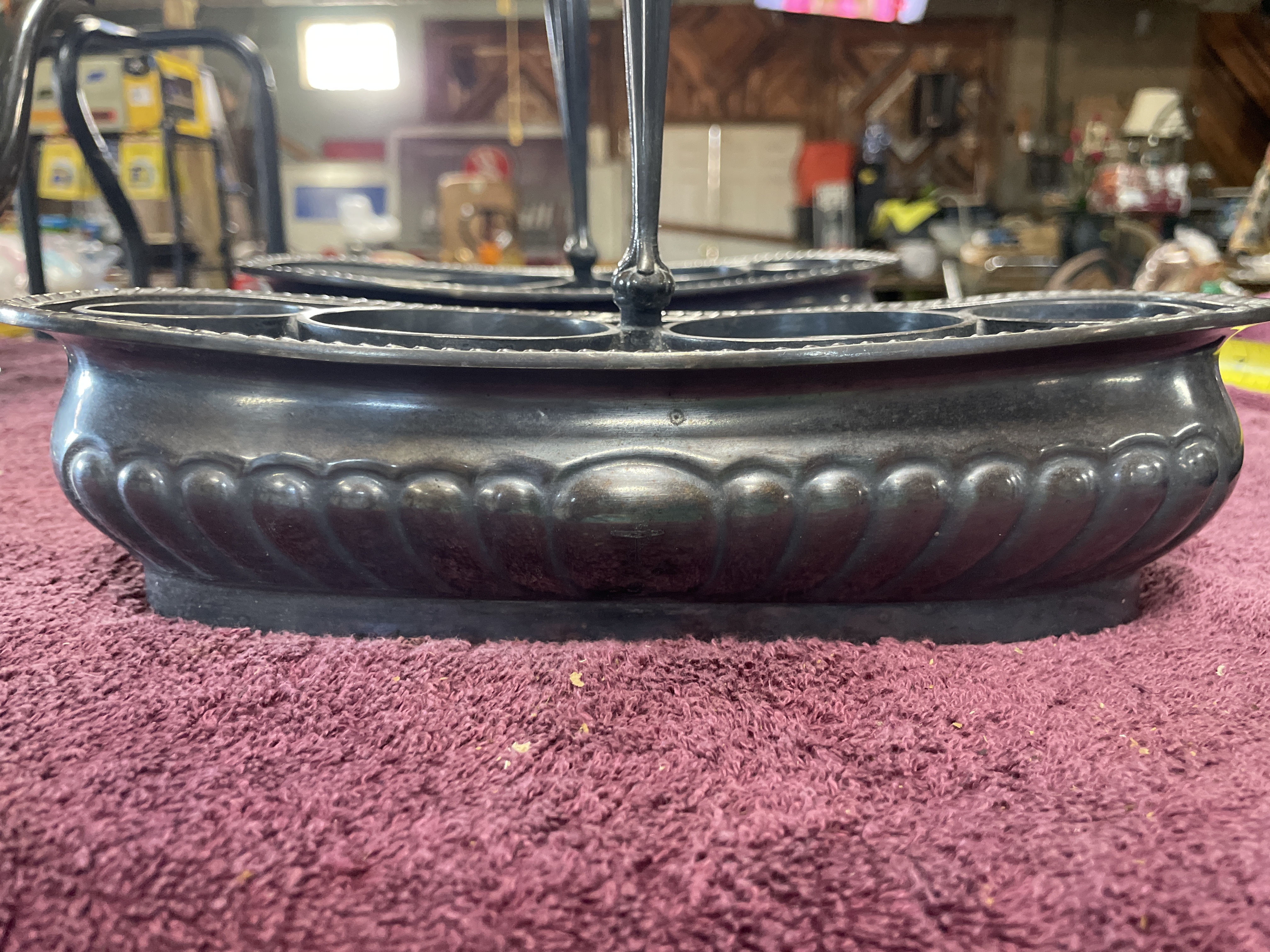 A pair of antique oval cruet carriers manufactured by Reed & Barton. Each carrier is constructed of silverplate over base metal, marked "SILVER SOLDERED, " indicating a heavy plating technique often associated with late 19th or early 20th century production. The oval form features a fluted or gadrooned body design and a beaded rope edge running along the rim. A central fixed carrying handle rises from the center of the carrier base. The interior of each carrier is fitted with six integrated circular rings designed to hold bottles or condiments. The base interior is decorated with a repeating feathered or leaf motif. The underside of each carrier is stamped with the maker’s mark and identification number: REED & BARTON / SILVER SOLDERED / 2910.