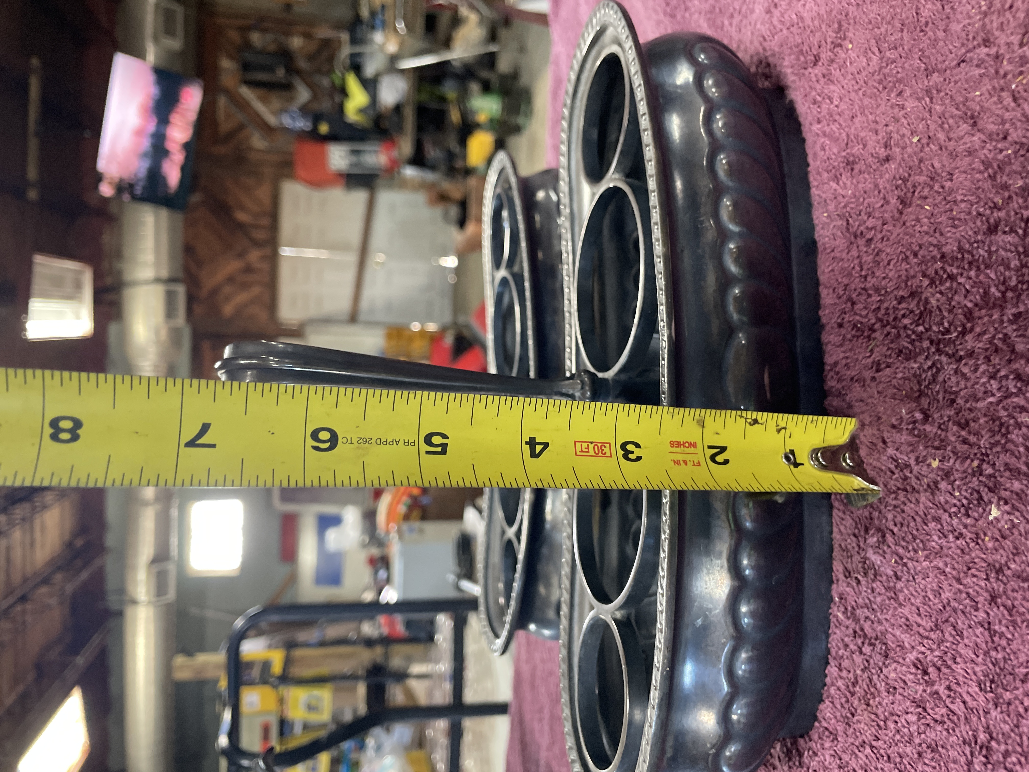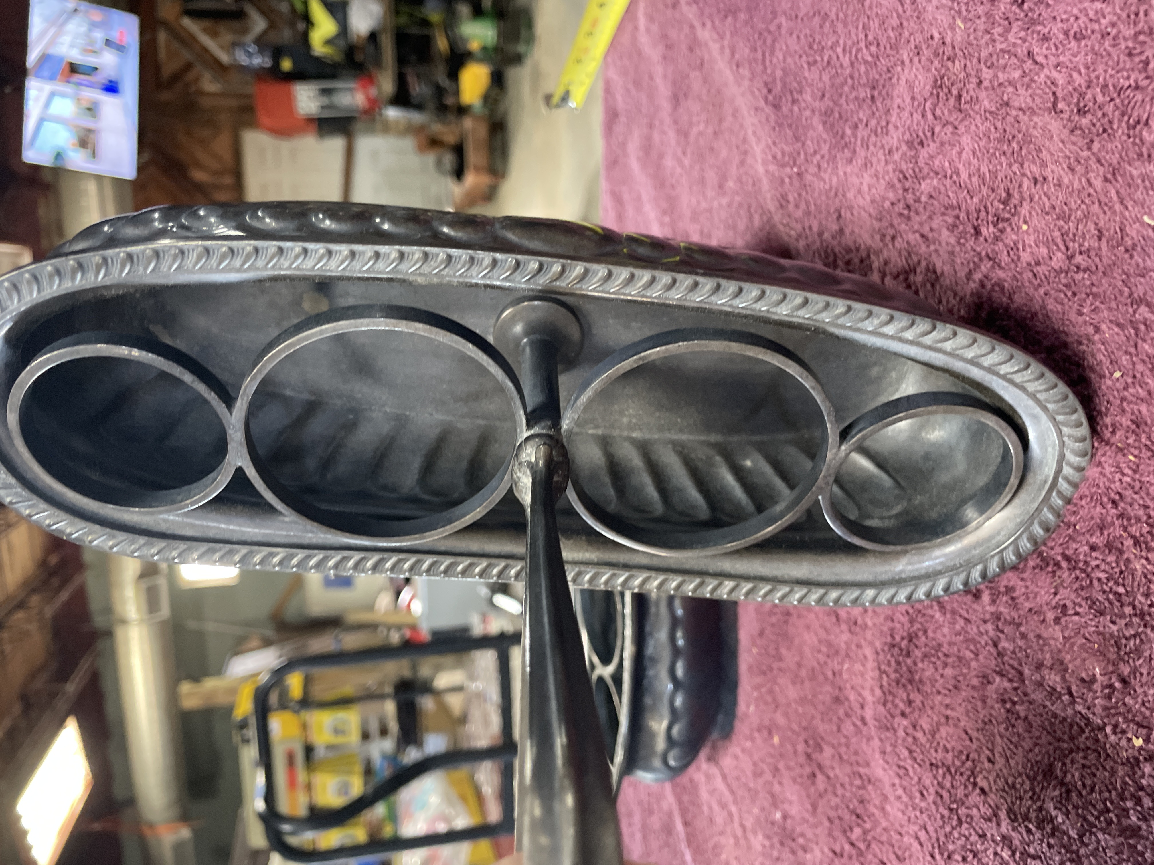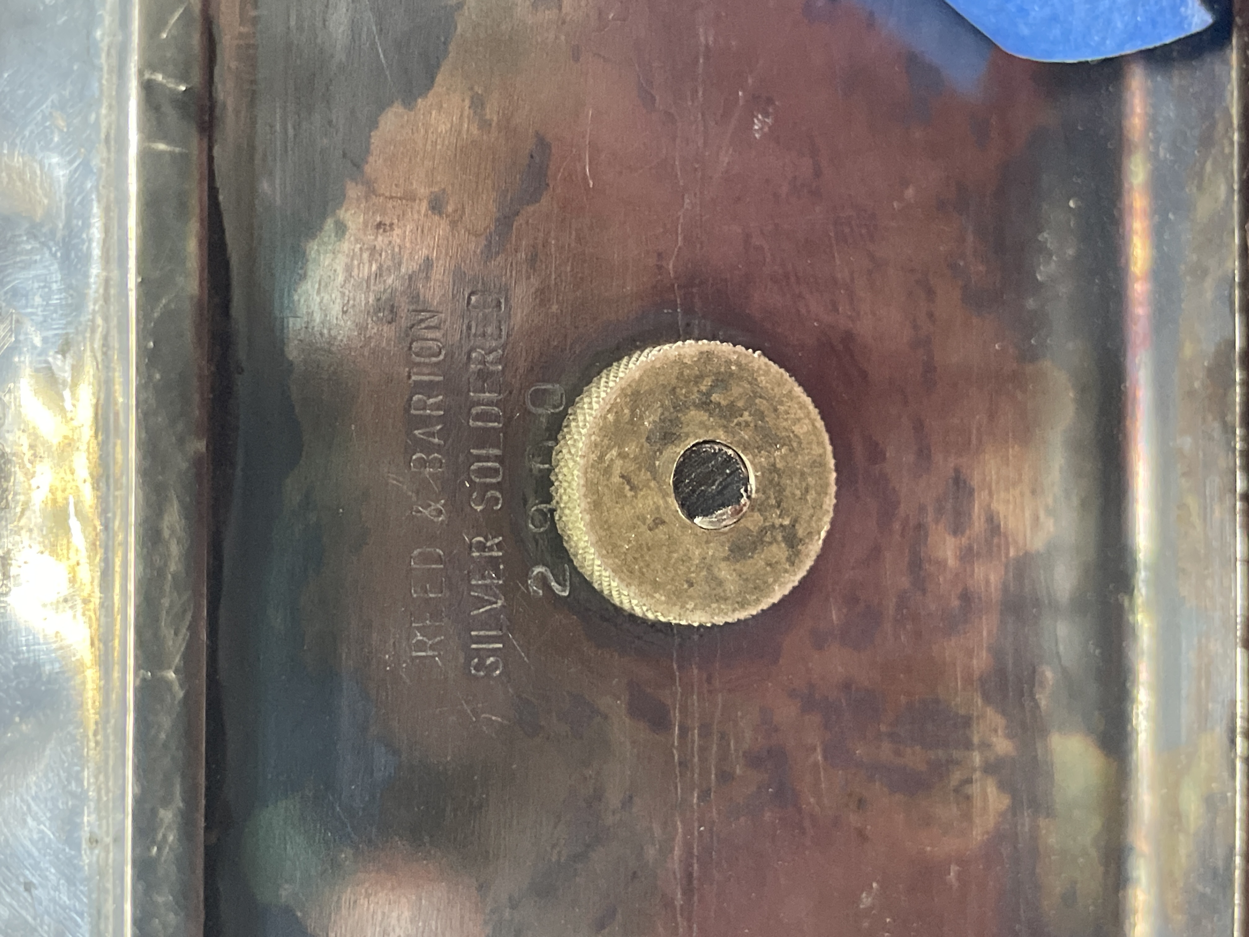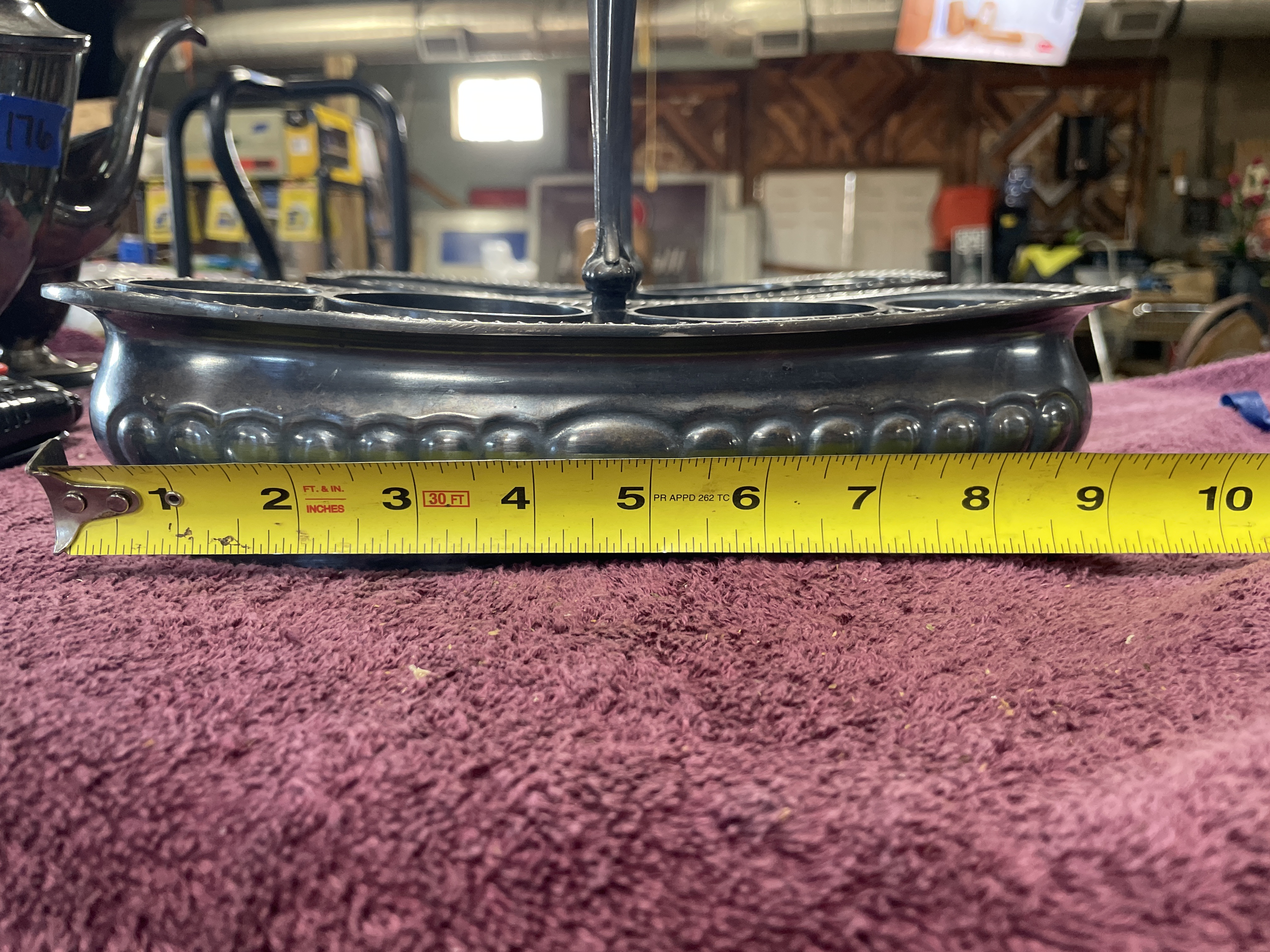 A pair of antique oval cruet carriers manufactured by Reed & Barton. Each carrier is constructed of silverplate over base metal, marked "SILVER SOLDERED, " indicating a heavy plating technique often associated with late 19th or early 20th century production. The oval form features a fluted or gadrooned body design and a beaded rope edge running along the rim. A central fixed carrying handle rises from the center of the carrier base. The interior of each carrier is fitted with six integrated circular rings designed to hold bottles or condiments. The base interior is decorated with a repeating feathered or leaf motif. The underside of each carrier is stamped with the maker’s mark and identification number: REED & BARTON / SILVER SOLDERED / 2910.