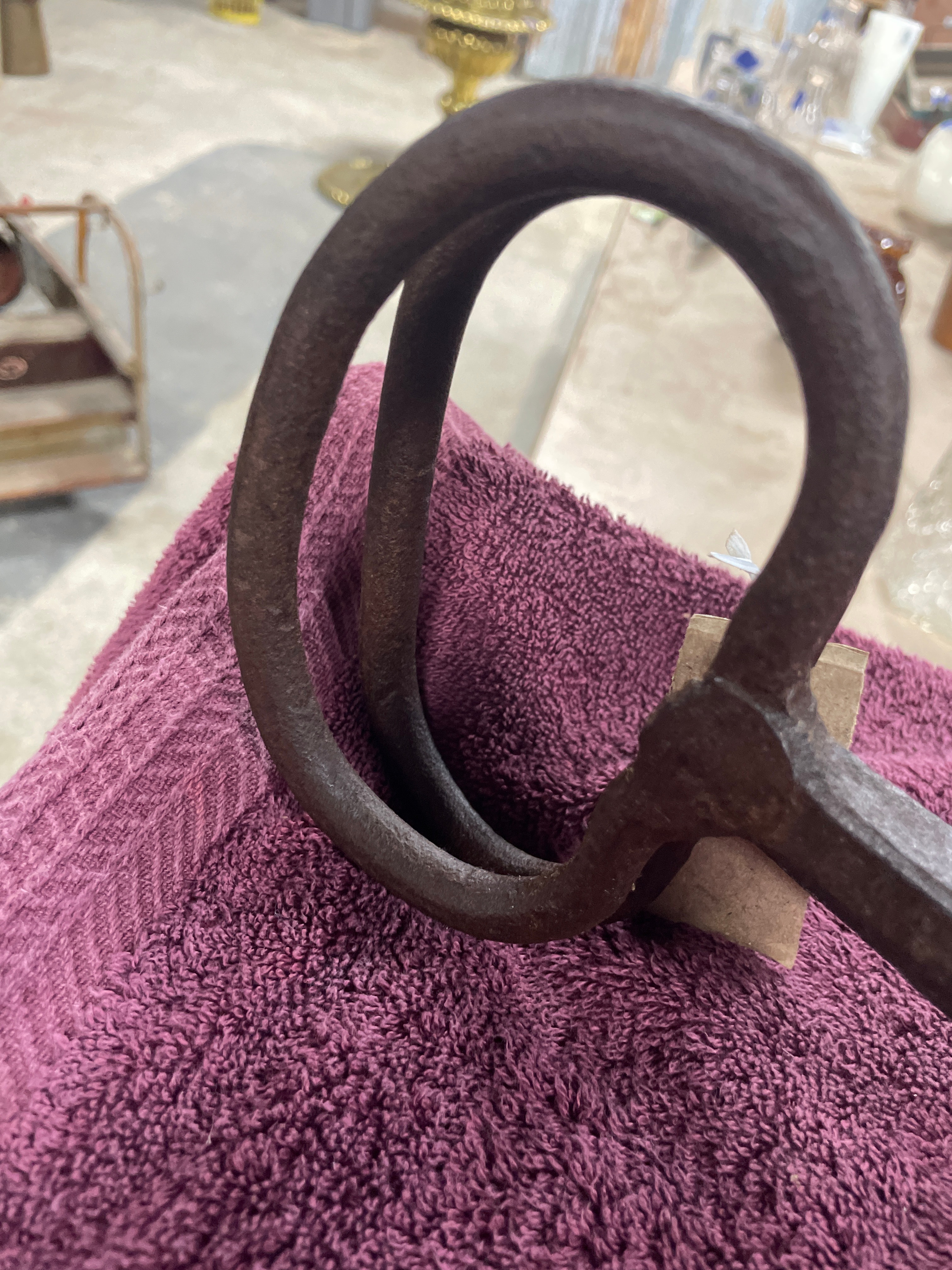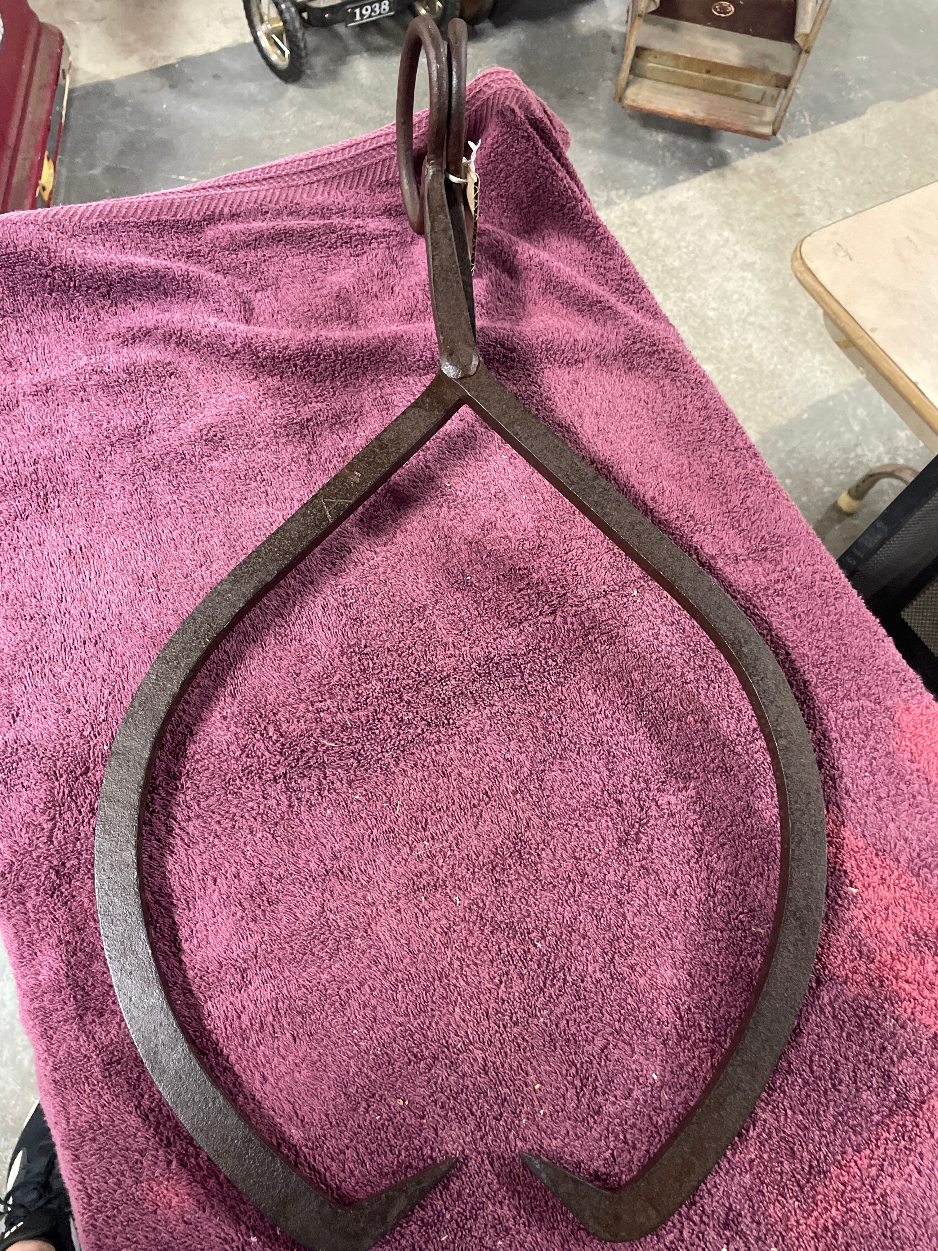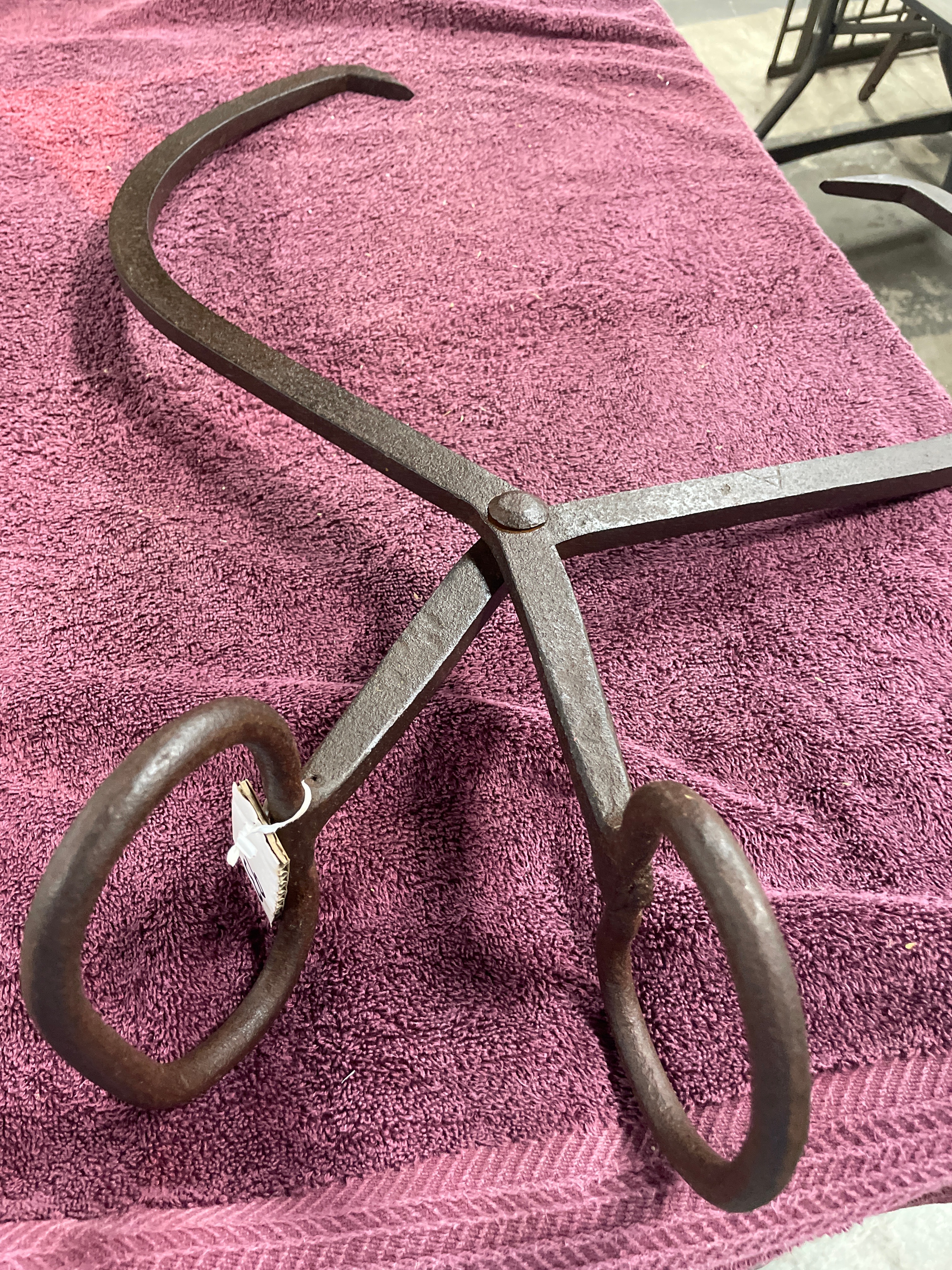 A large, rustic pair of hinged tongs, constructed from heavy, dark-toned cast iron. It features a prominent central rivet at the pivot point and two large, circular ring-form handles. The opposing jaws are substantial and curved, tapering to sharpened, inward-pointing tips, designed for gripping or lifting blocks of ice. A small, illegible white tag is attached to one handle ring.