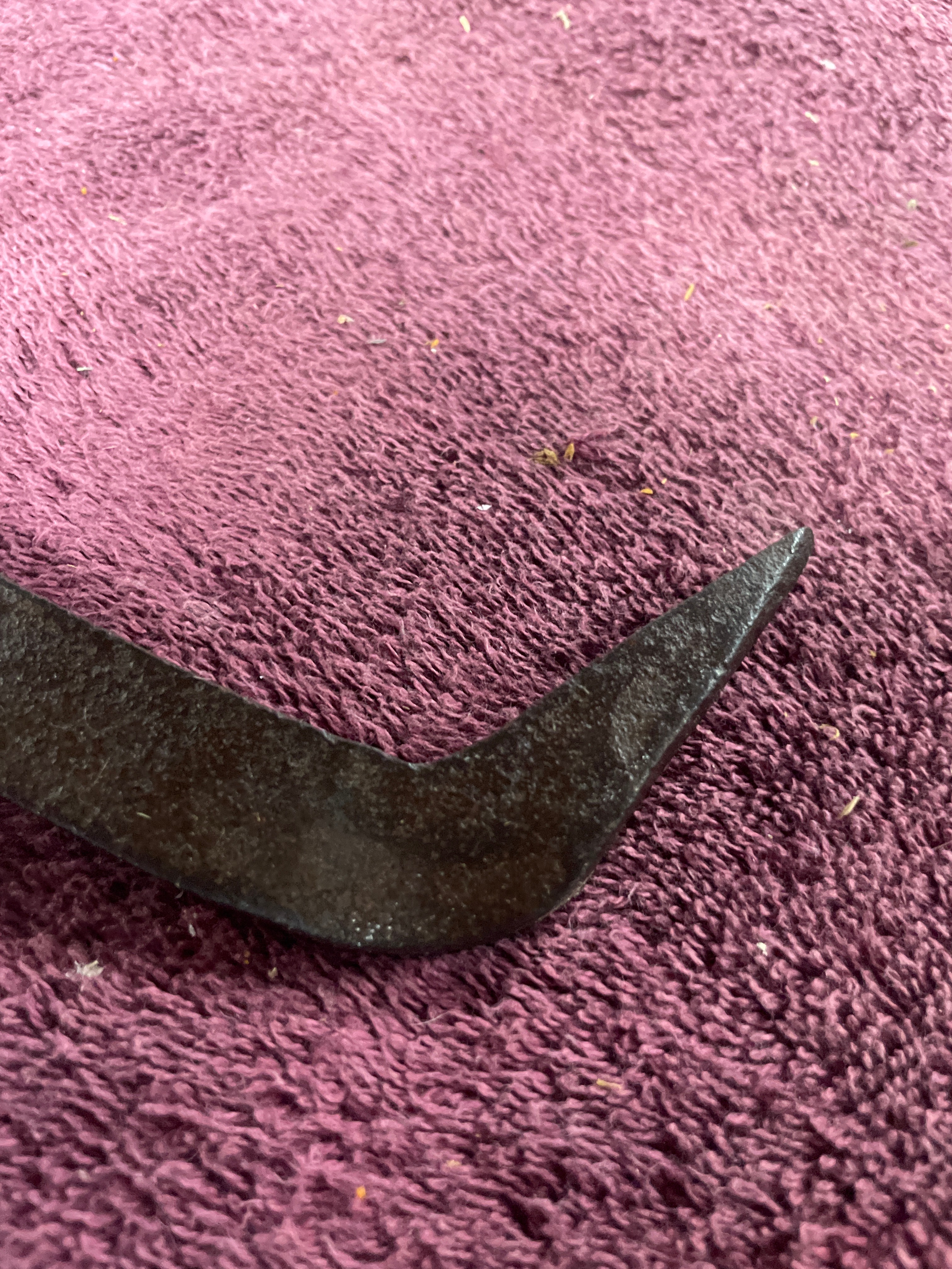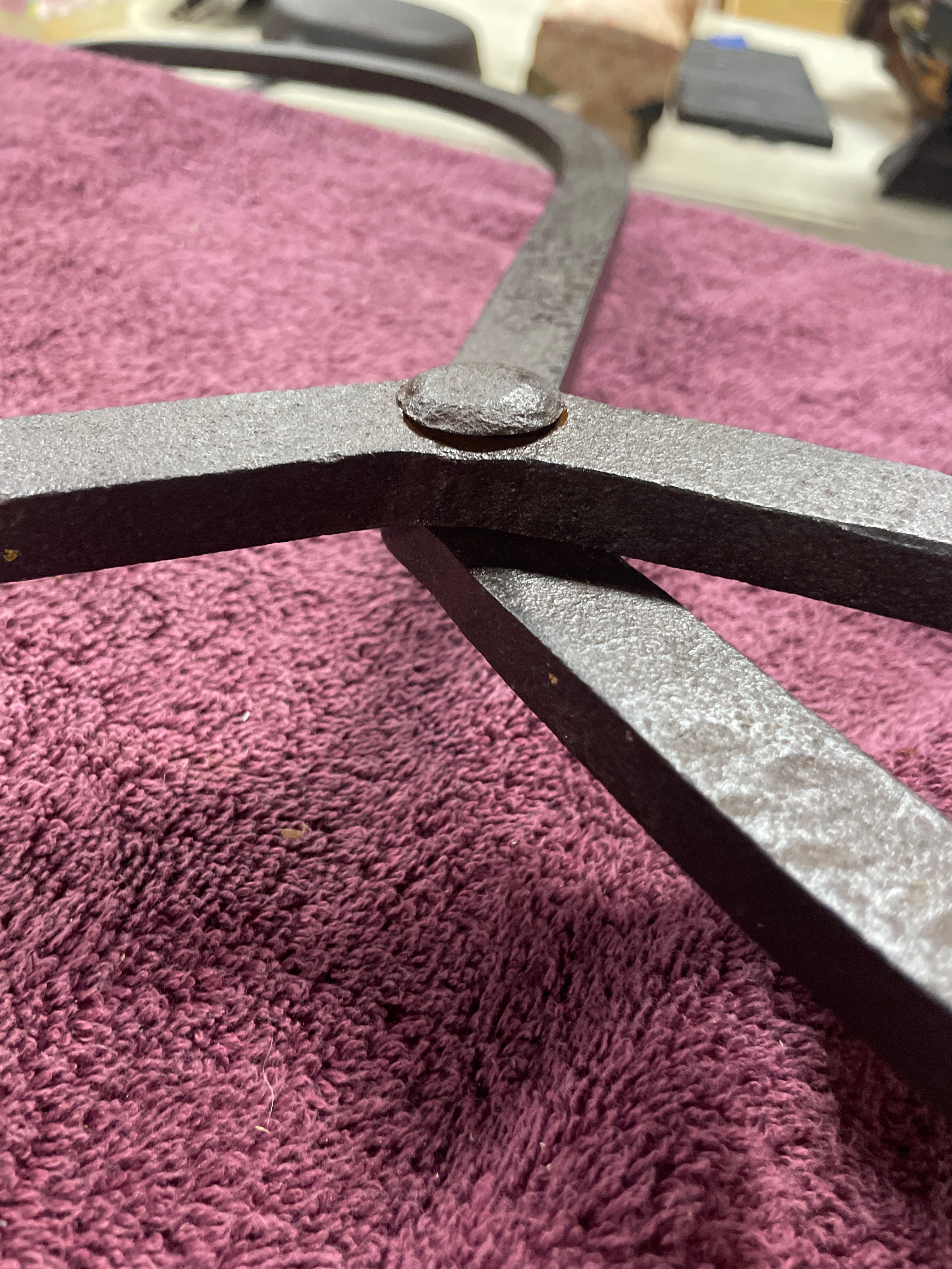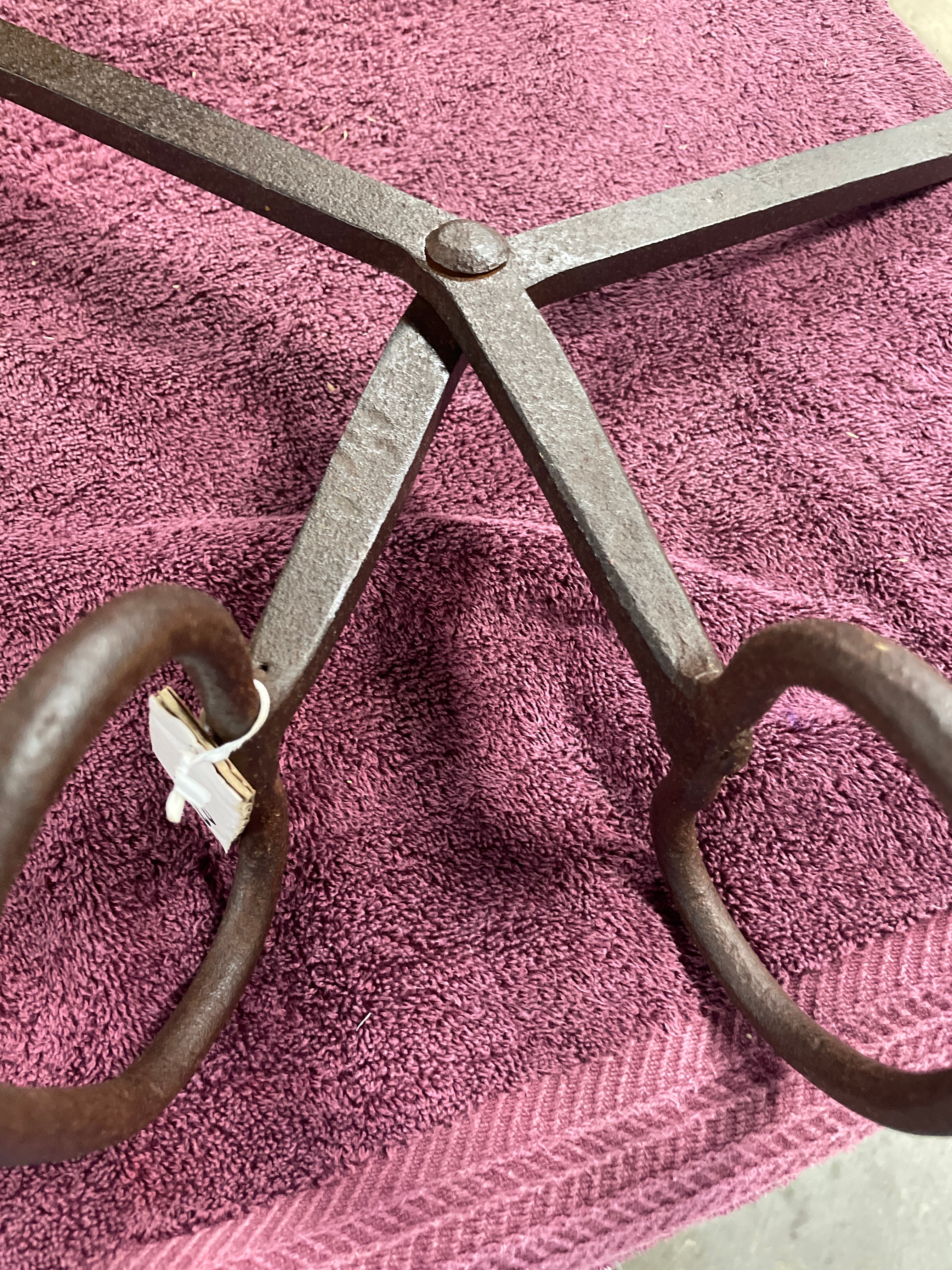 A large, rustic pair of hinged tongs, constructed from heavy, dark-toned cast iron. It features a prominent central rivet at the pivot point and two large, circular ring-form handles. The opposing jaws are substantial and curved, tapering to sharpened, inward-pointing tips, designed for gripping or lifting blocks of ice. A small, illegible white tag is attached to one handle ring.