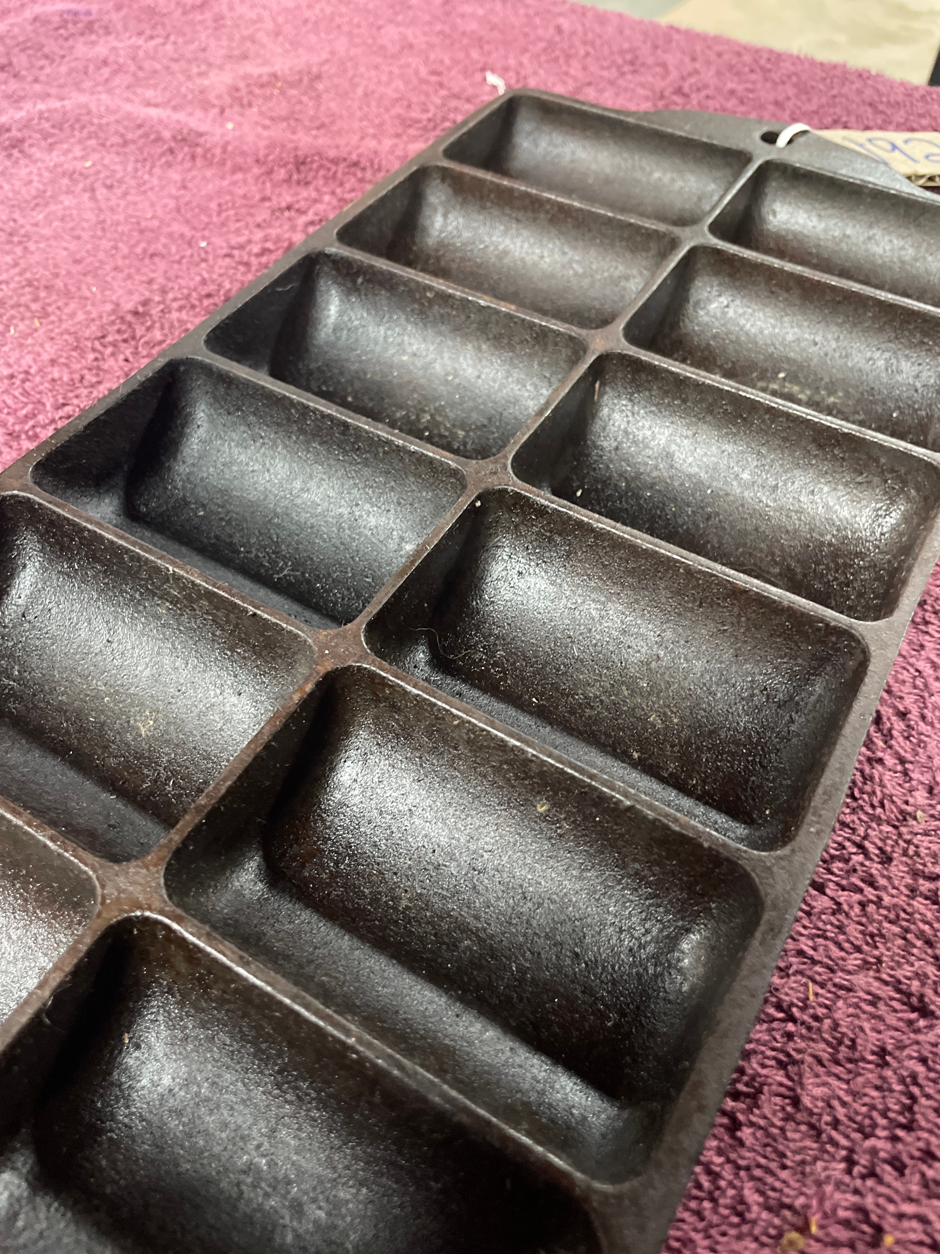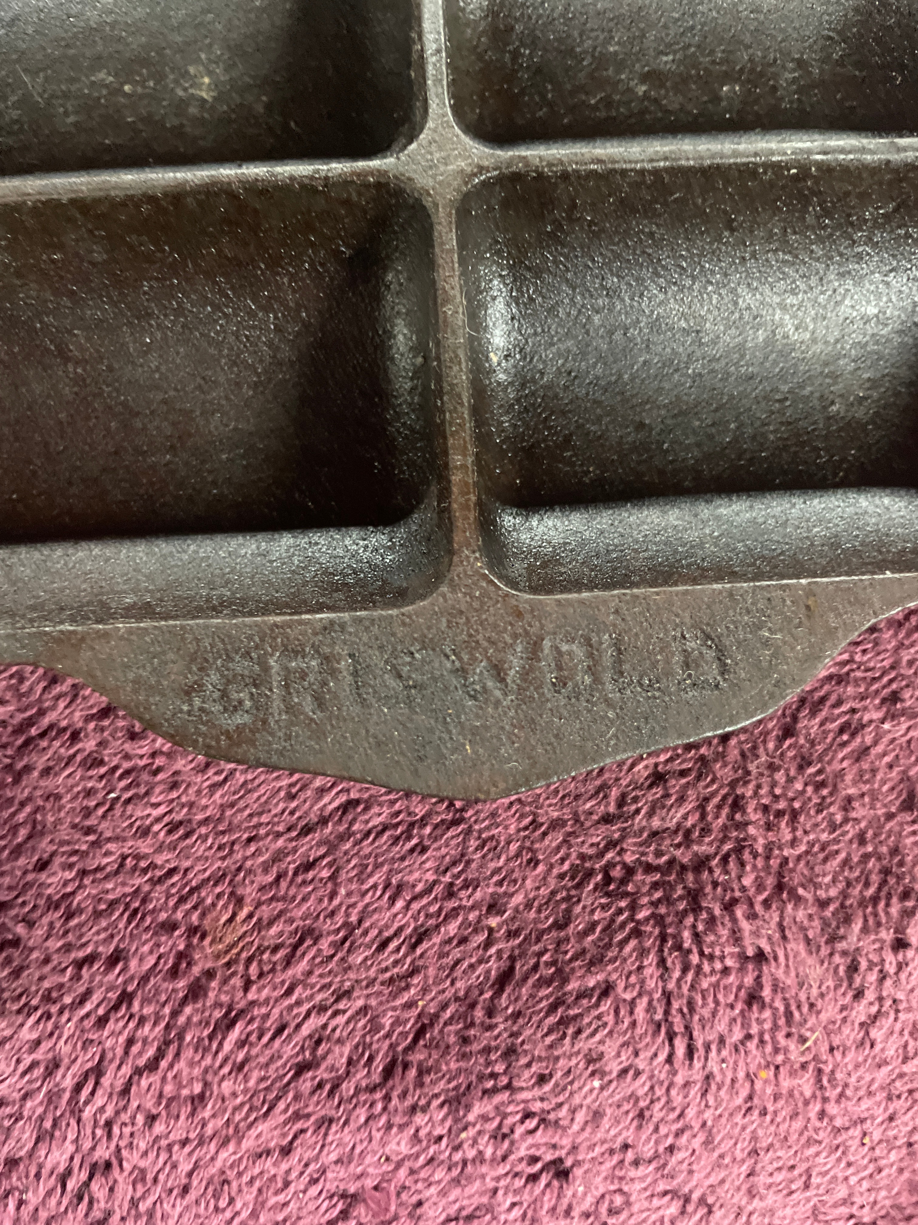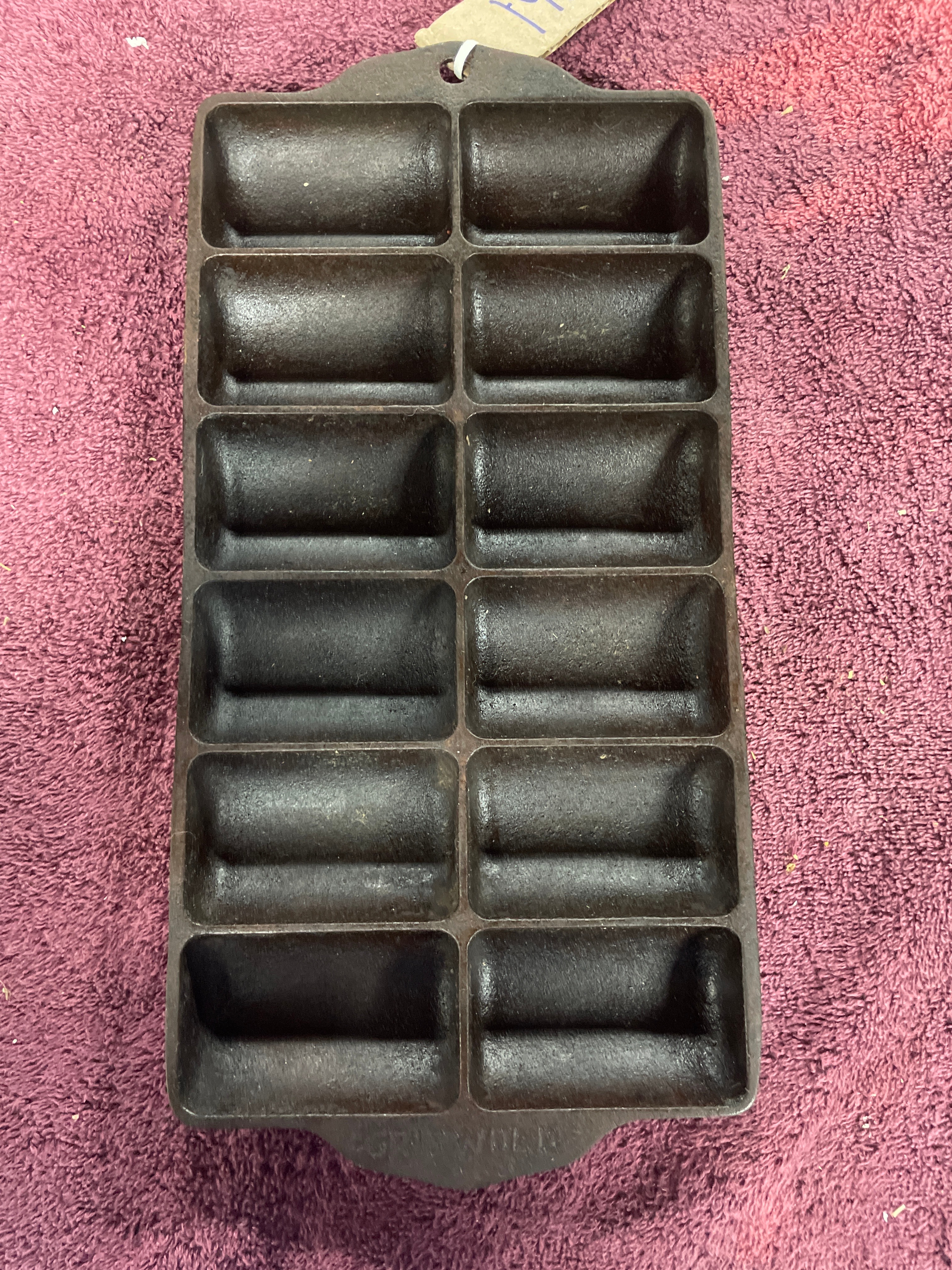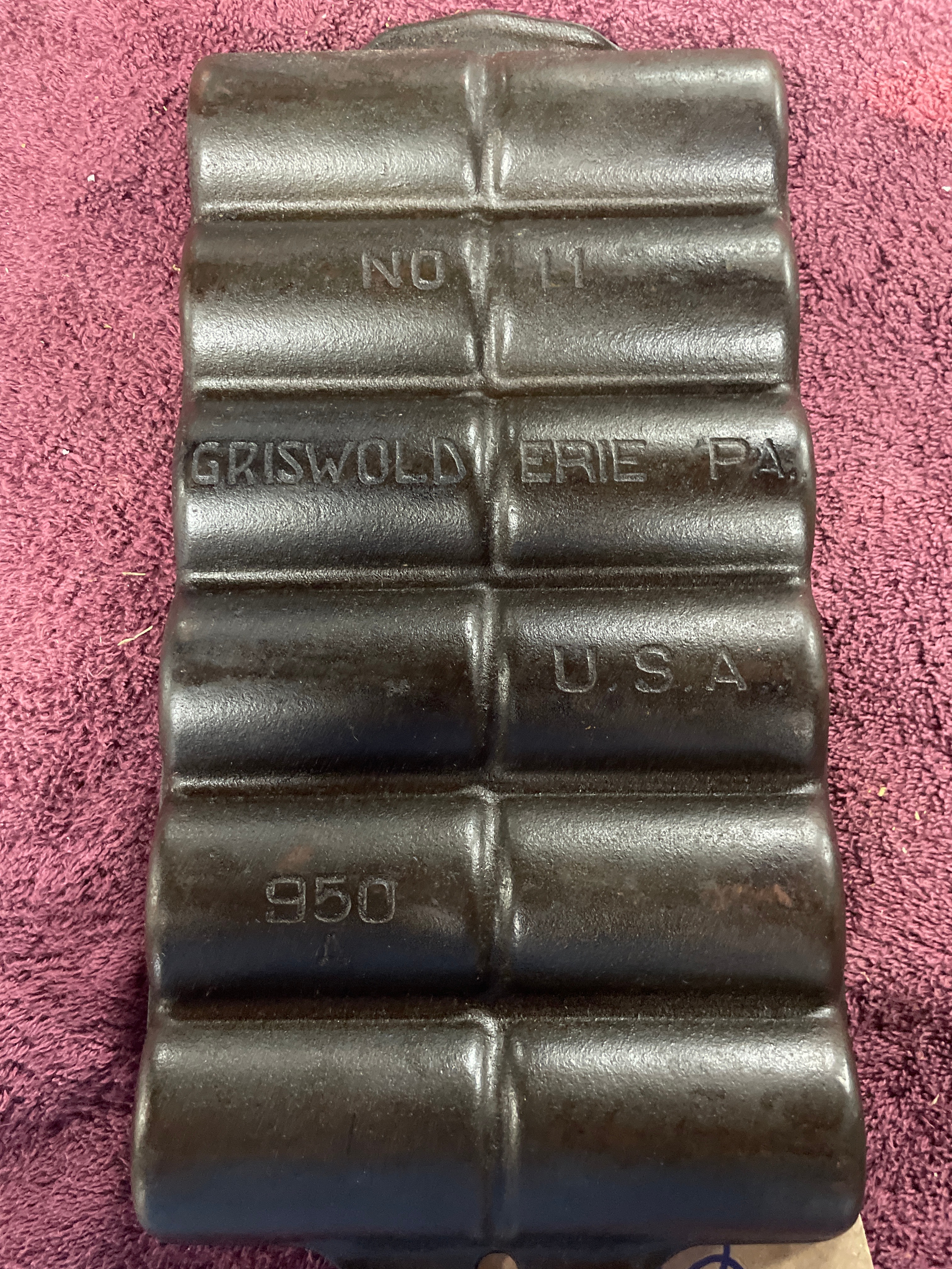 A Griswold Cast Iron French Roll Pan, No. 11, model 950. This vintage-style cast iron baking mold features a dark patinated surface and twelve individual rectangular compartments. The top surface is marked ‘GRISWOLD’, while the underside is prominently embossed ‘NO. 11’, ‘GRISWOLD MFG. CO. ERIE PA.’, ‘U.S.A.’, and ‘950’.