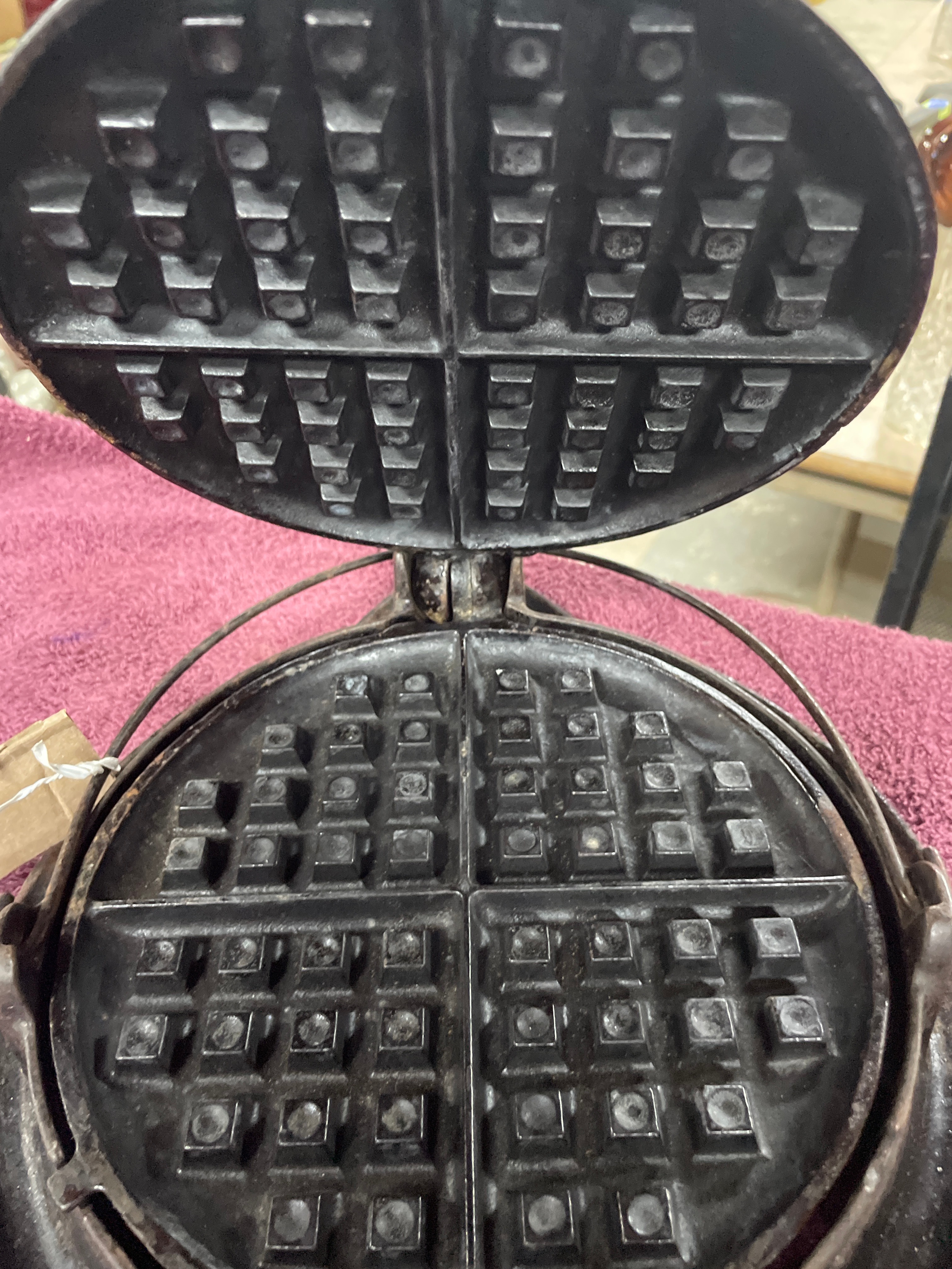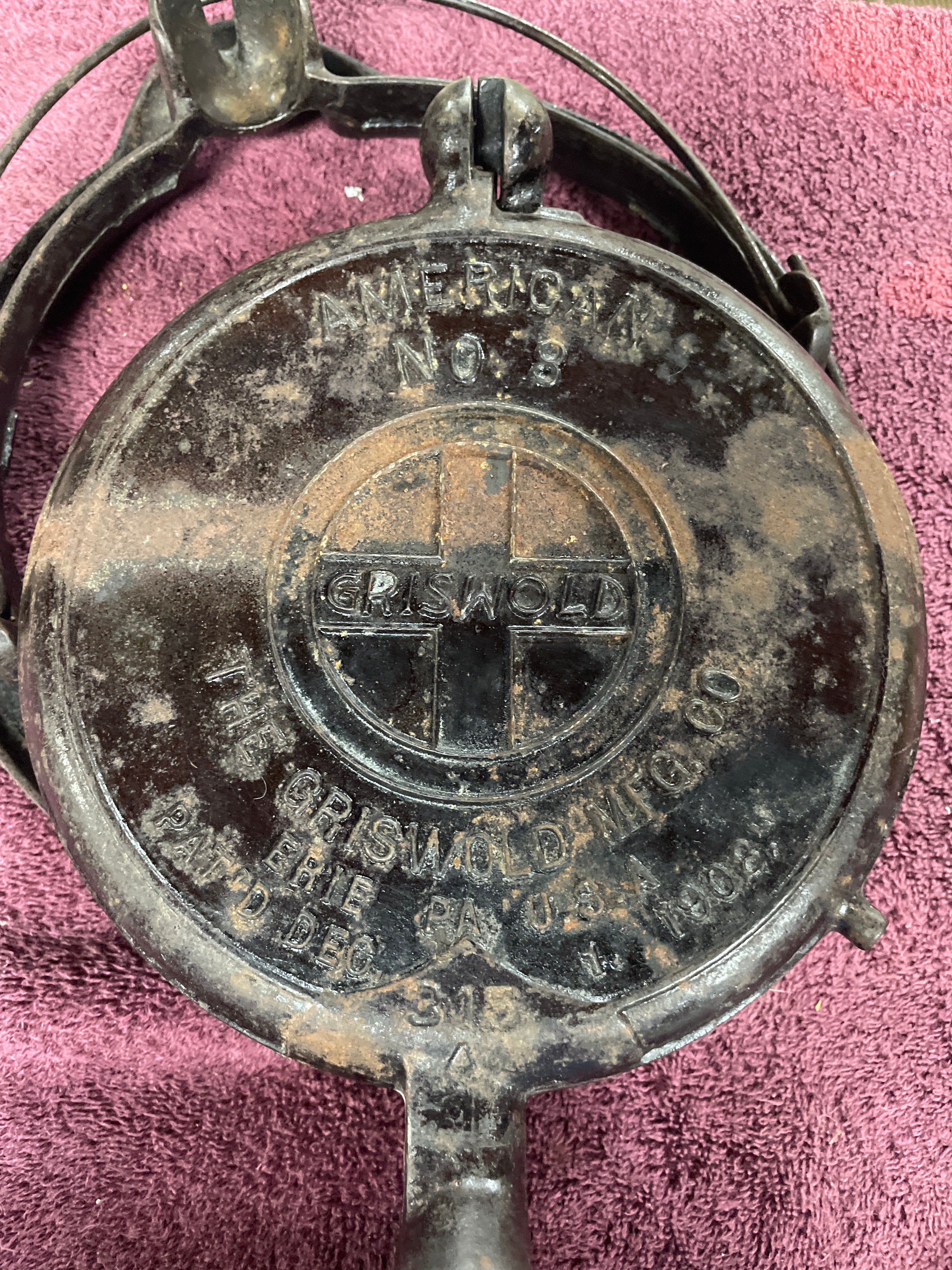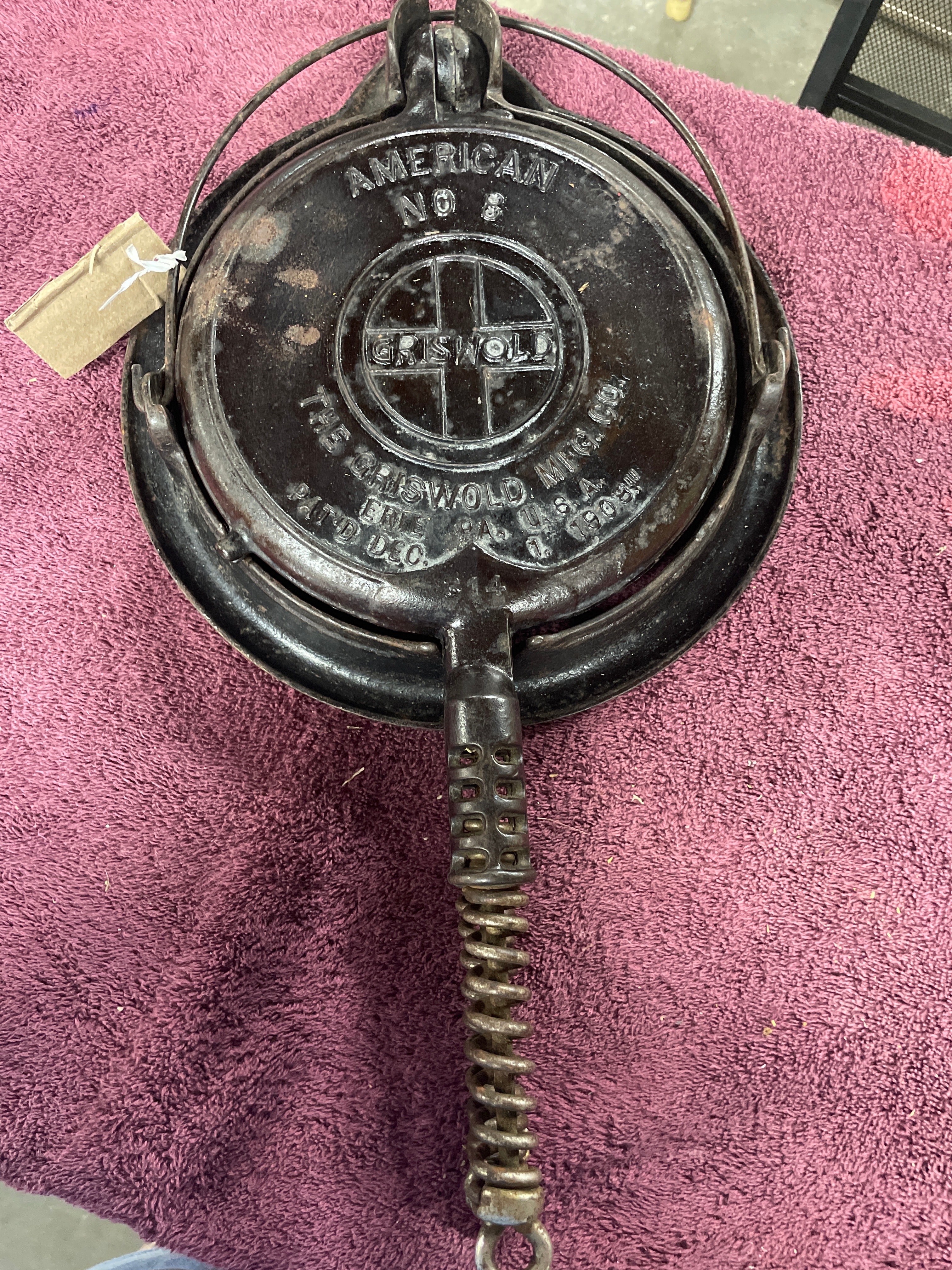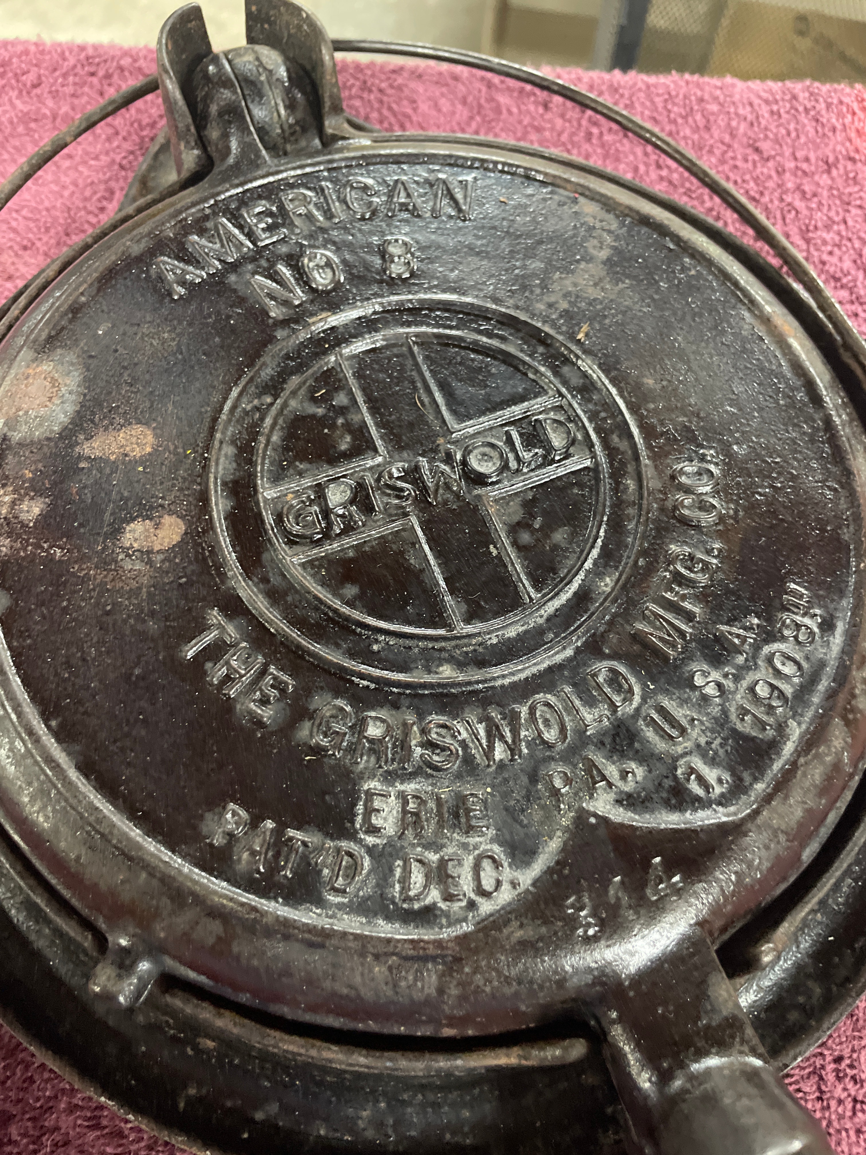 A Griswold American No. 8 cast iron waffle iron. This vintage two-part hinged design produces four square waffles. The exterior is clearly marked with “AMERICAN NO 8” and a prominent “GRISWOLD” logo within a crosshairs design, surrounded by “THE GRISWOLD MFG. CO. ERIE, PA. U.S.A.” A patent date, “PAT’D DEC. 1 1908,” is also visible. It features a long handle with a coiled spring grip and is accompanied by a separate round cast iron base with a wire bale handle for stovetop use.