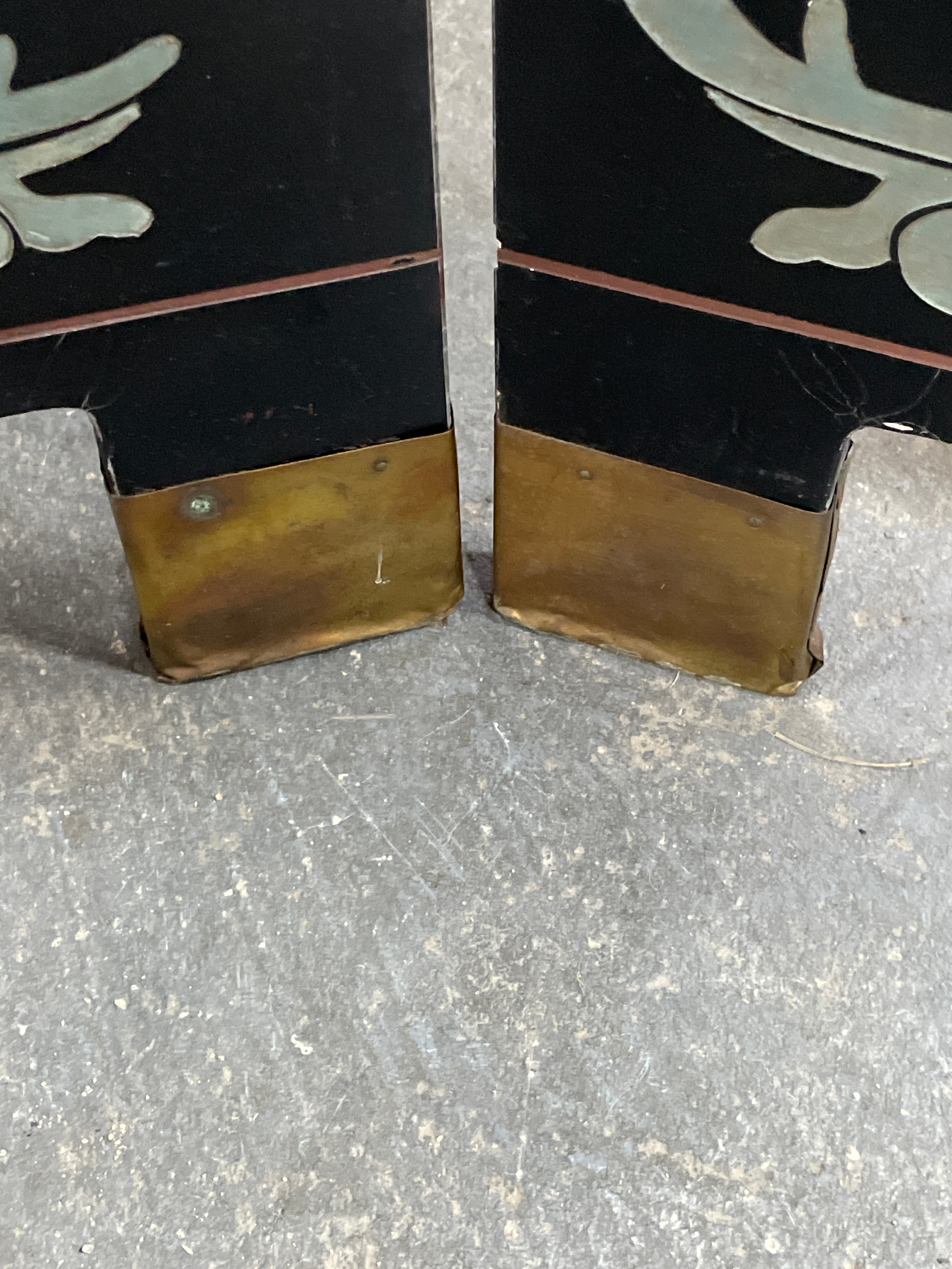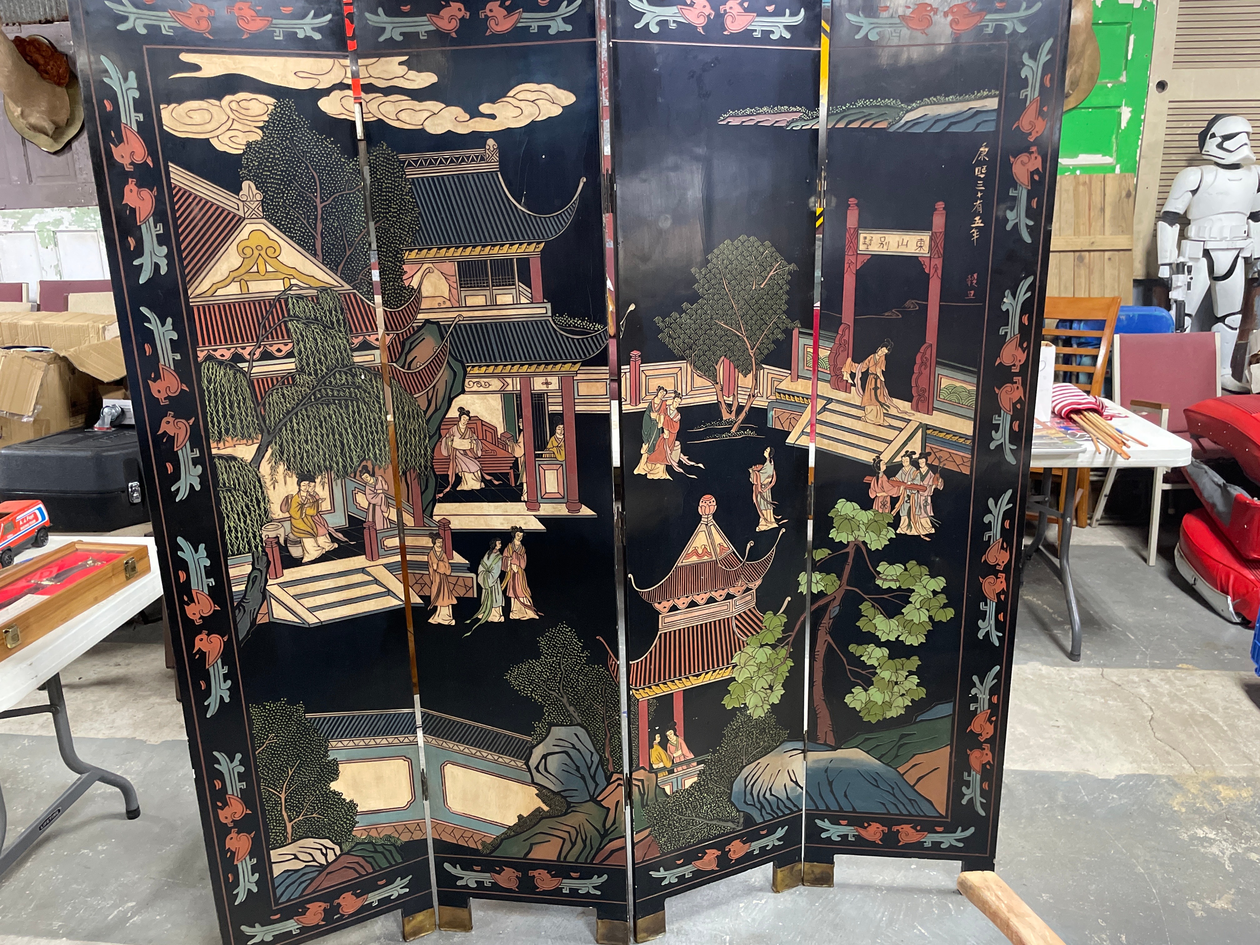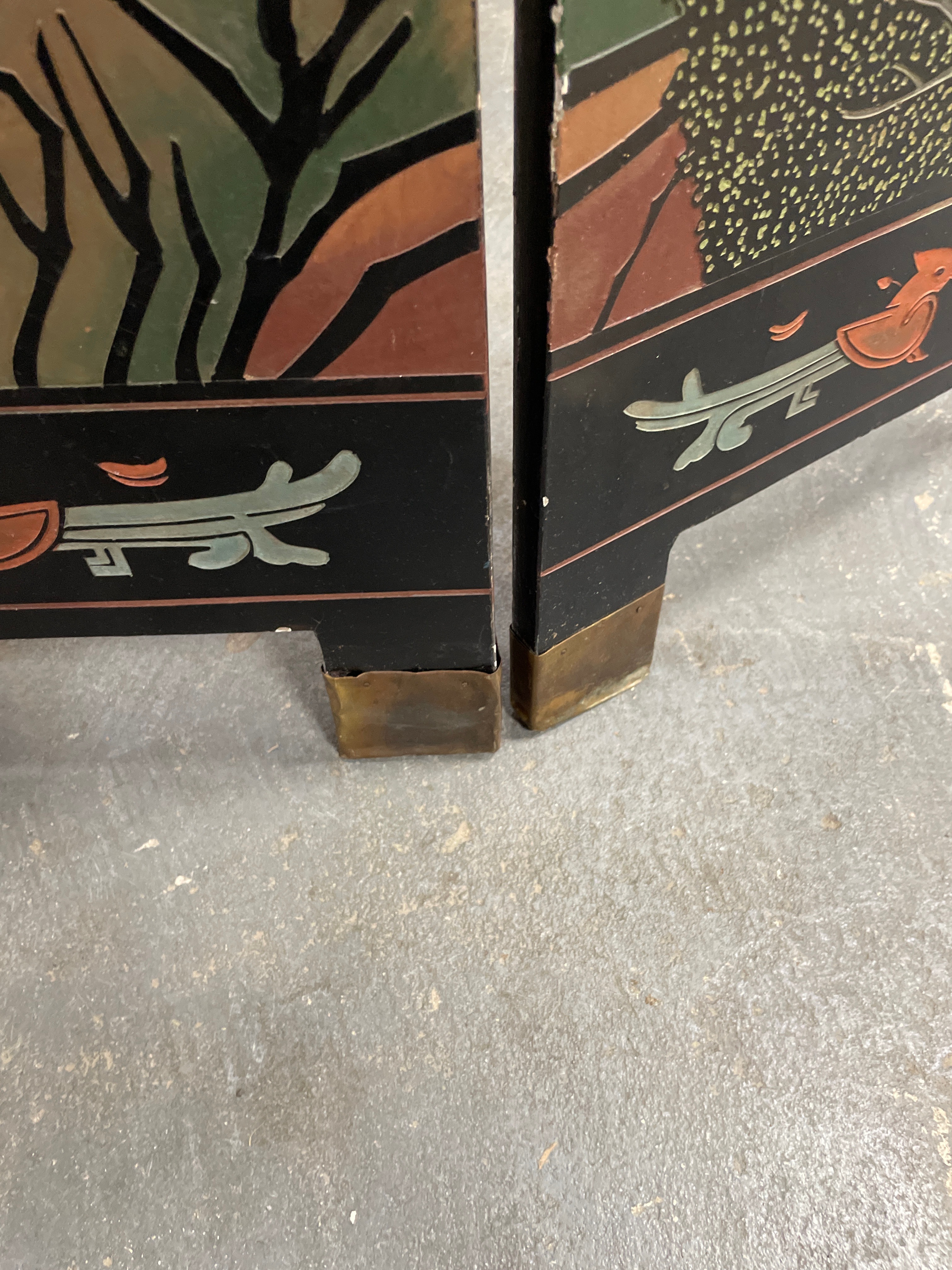 An Early 20th Century Chinese Coromandel Lacquer four-panel folding screen, crafted from wood with a black lacquer finish and decorated in a traditional East Asian style. The front features a continuous landscape scene depicting pagodas, bridges, trees, and numerous figures in polychrome carved or incised lacquer, often referred to as Coromandel style. Visible Chinese characters on the upper right panel read “九龍三千尺” (Nine Dragons, Three Thousand Feet) and “碧 山” (Green Mountain). The reverse side is also black lacquered and decorated with scattered motifs of flowering branches and birds. The panels are connected by dark metal hinges, and the feet are protected by brass-toned metal caps.