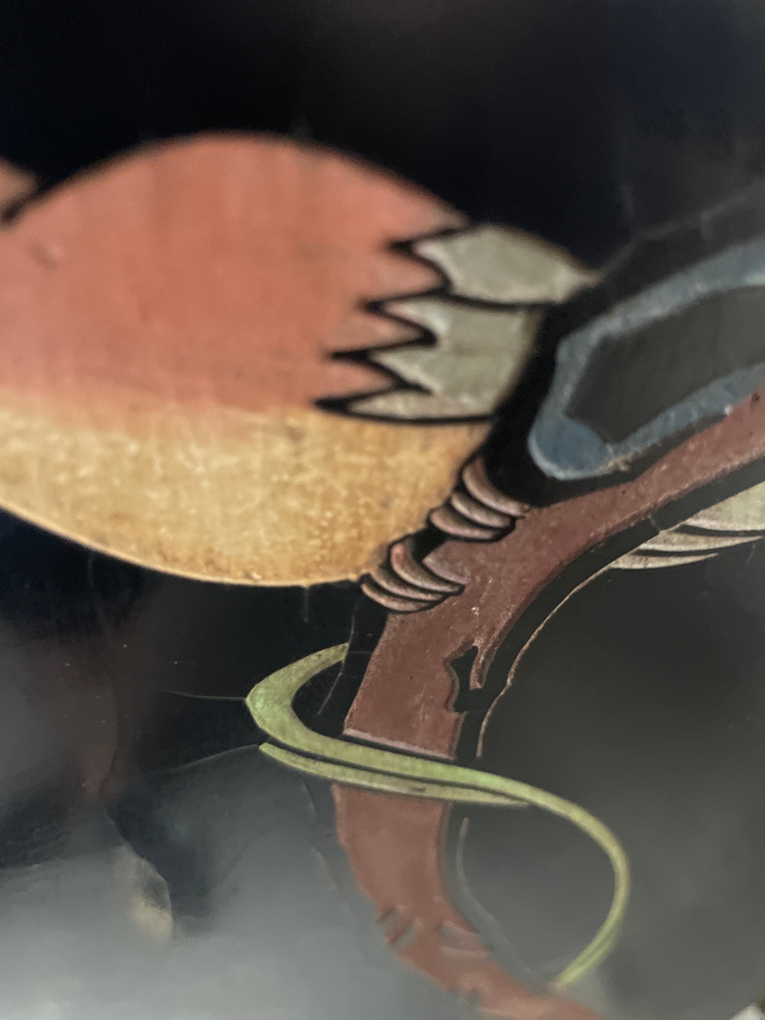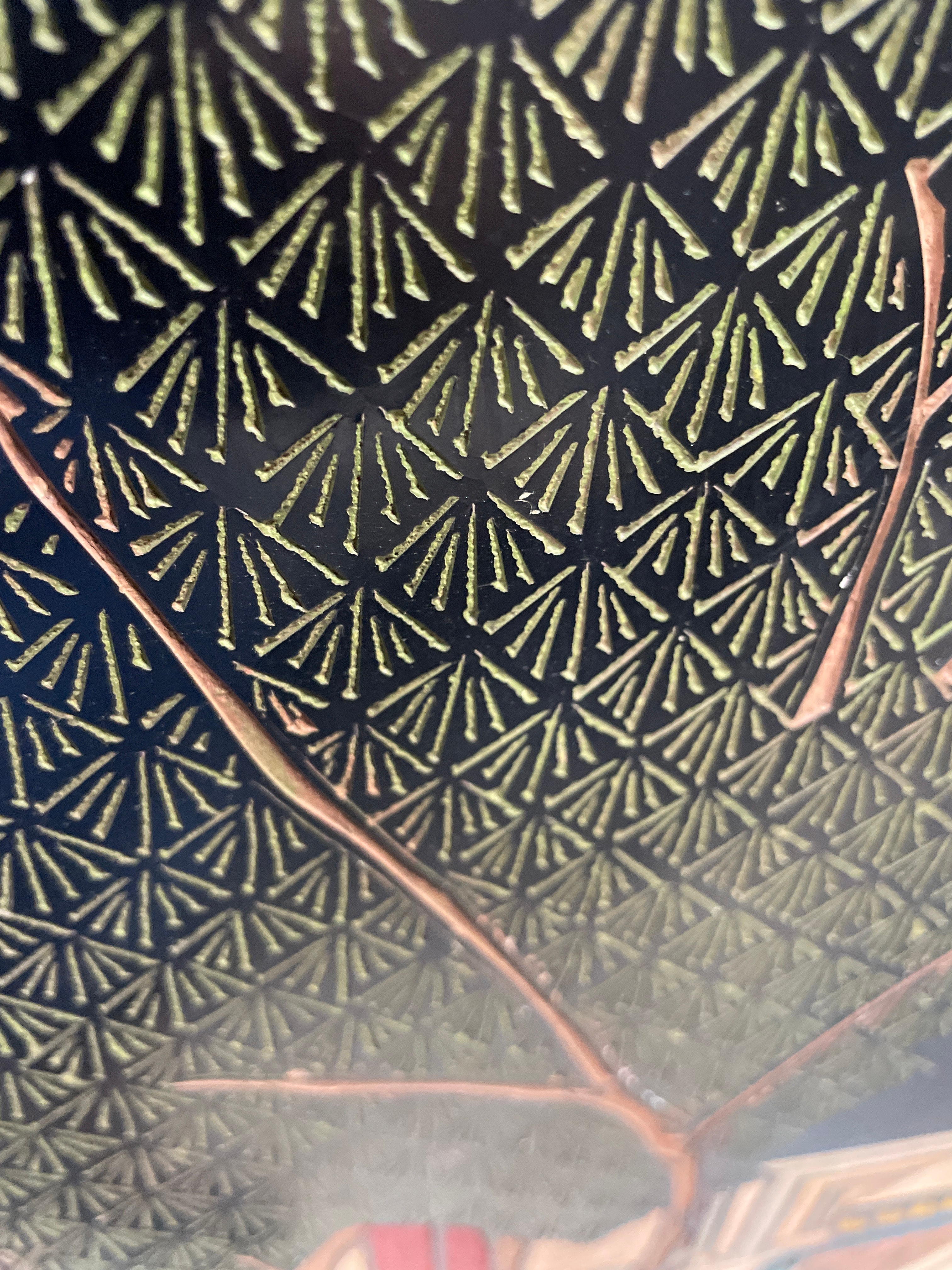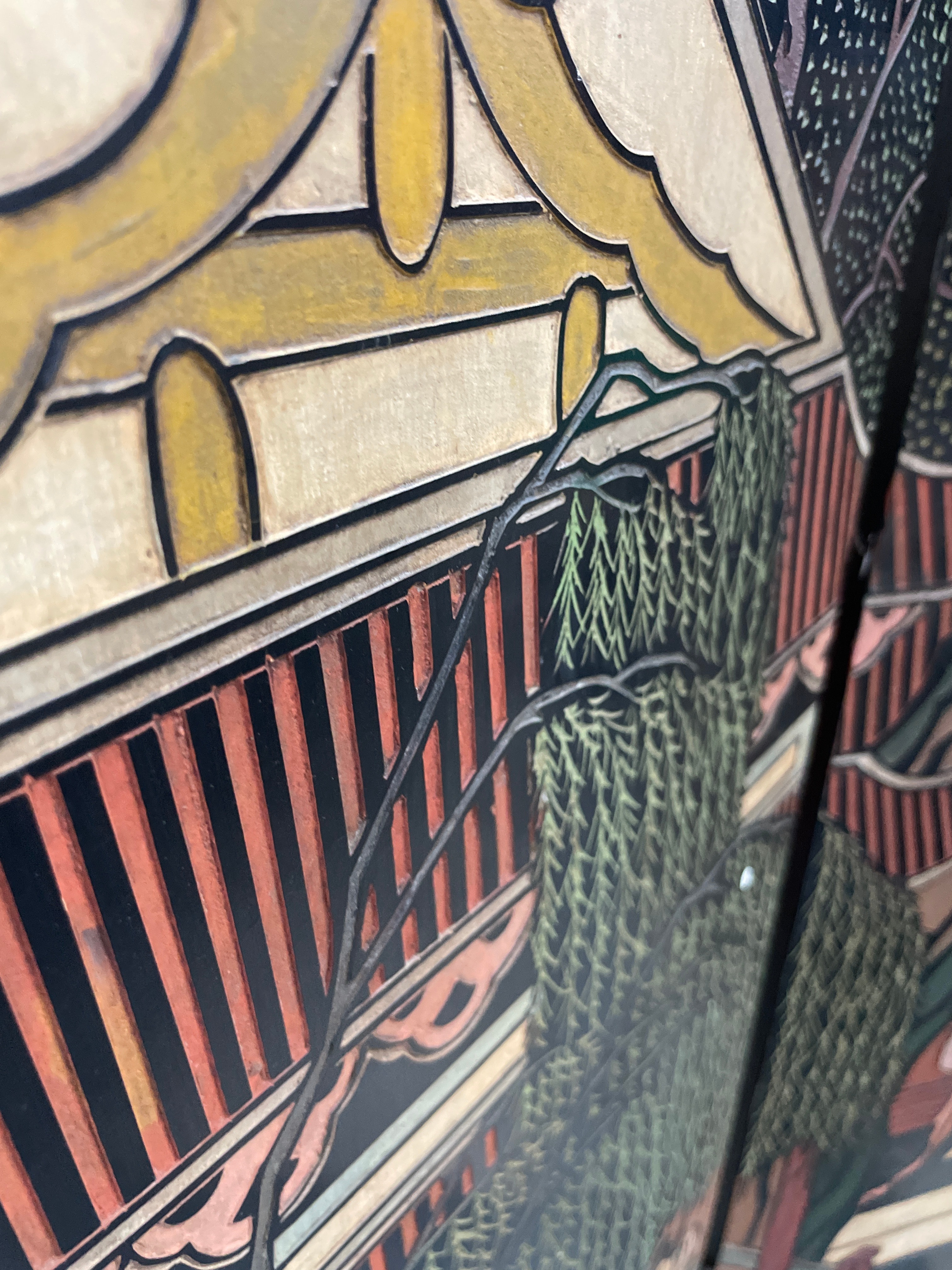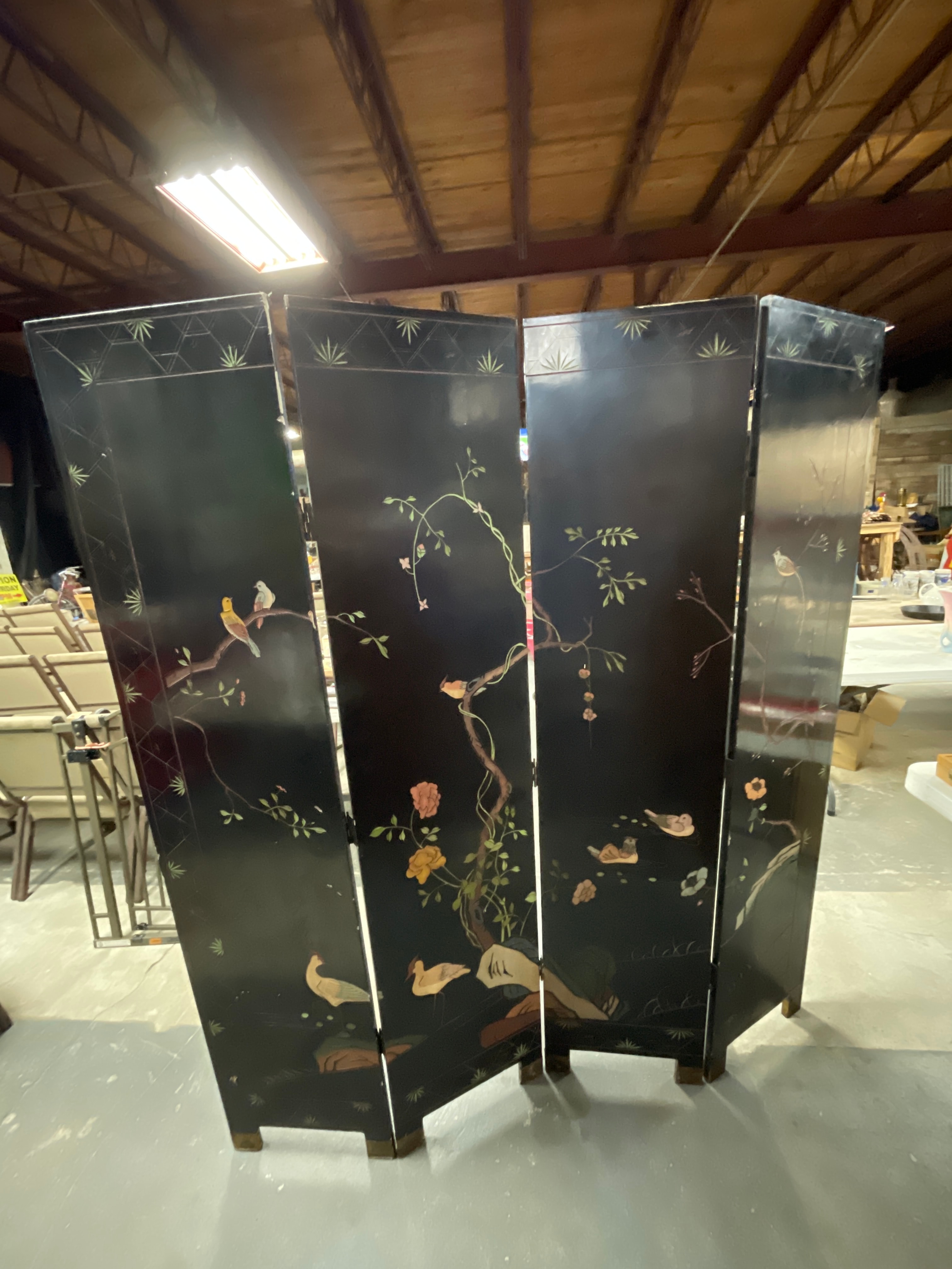 An Early 20th Century Chinese Coromandel Lacquer four-panel folding screen, crafted from wood with a black lacquer finish and decorated in a traditional East Asian style. The front features a continuous landscape scene depicting pagodas, bridges, trees, and numerous figures in polychrome carved or incised lacquer, often referred to as Coromandel style. Visible Chinese characters on the upper right panel read “九龍三千尺” (Nine Dragons, Three Thousand Feet) and “碧 山” (Green Mountain). The reverse side is also black lacquered and decorated with scattered motifs of flowering branches and birds. The panels are connected by dark metal hinges, and the feet are protected by brass-toned metal caps.