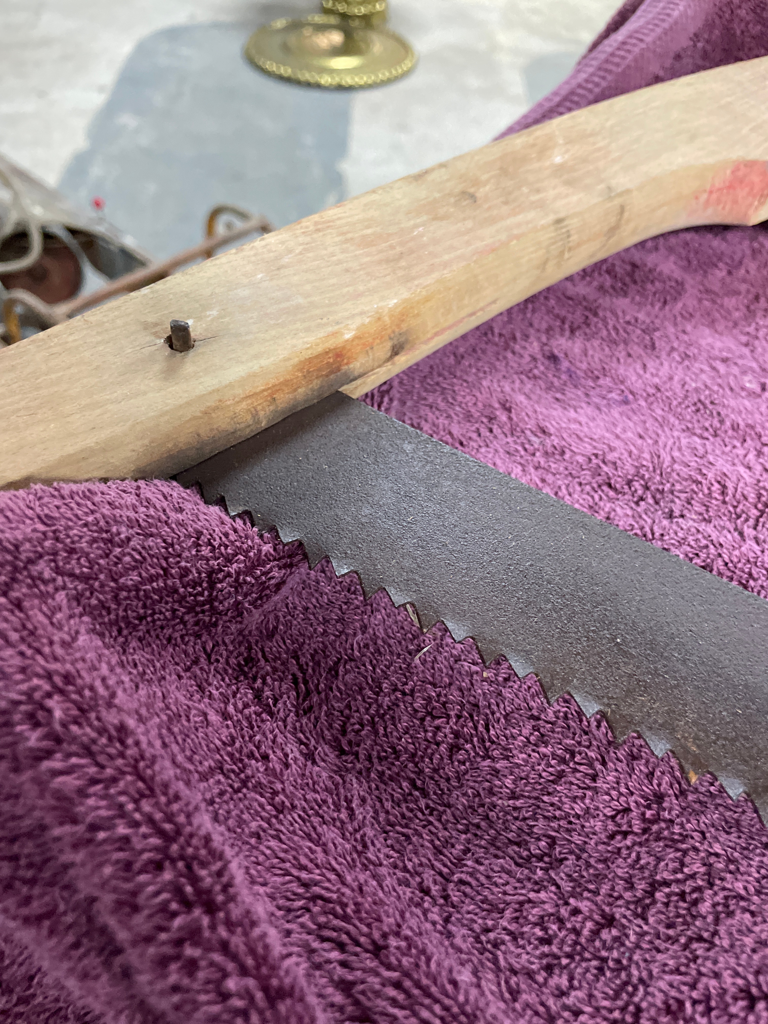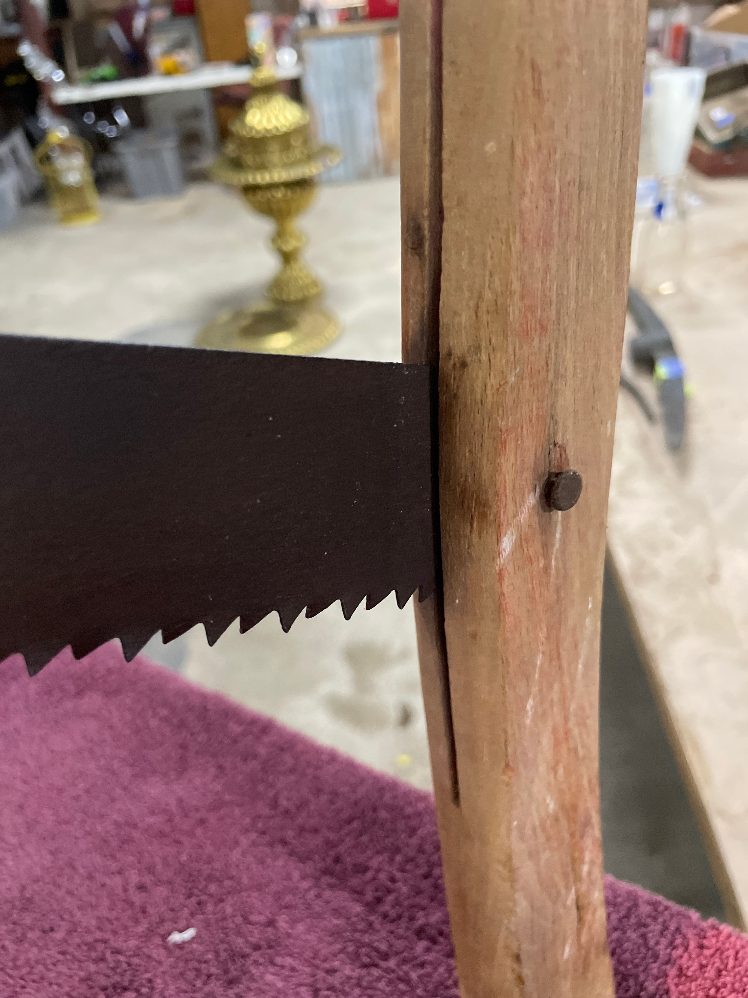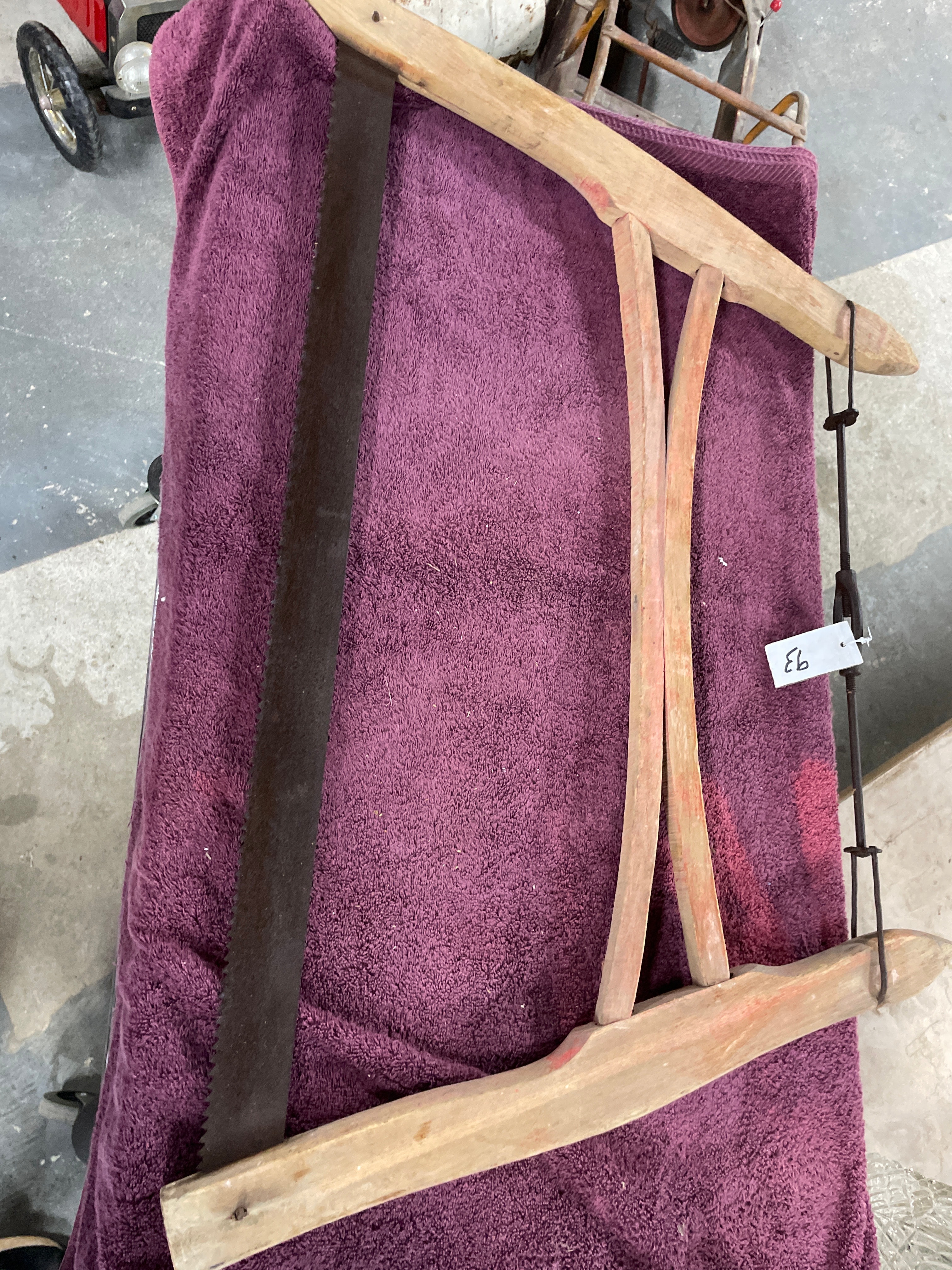 A Vintage Antique Cross Cut Wood Buck / Bow Saw, dating from approximately 1910-1930. This traditional bow saw features a light-colored wooden frame with two curved wooden stretchers. A dark metal blade is held in tension via a twisted metal rod and toggles. The blade exhibits coarse, widely spaced teeth. A white tag with the number ’63’ (६३) is attached to the tensioning rod.