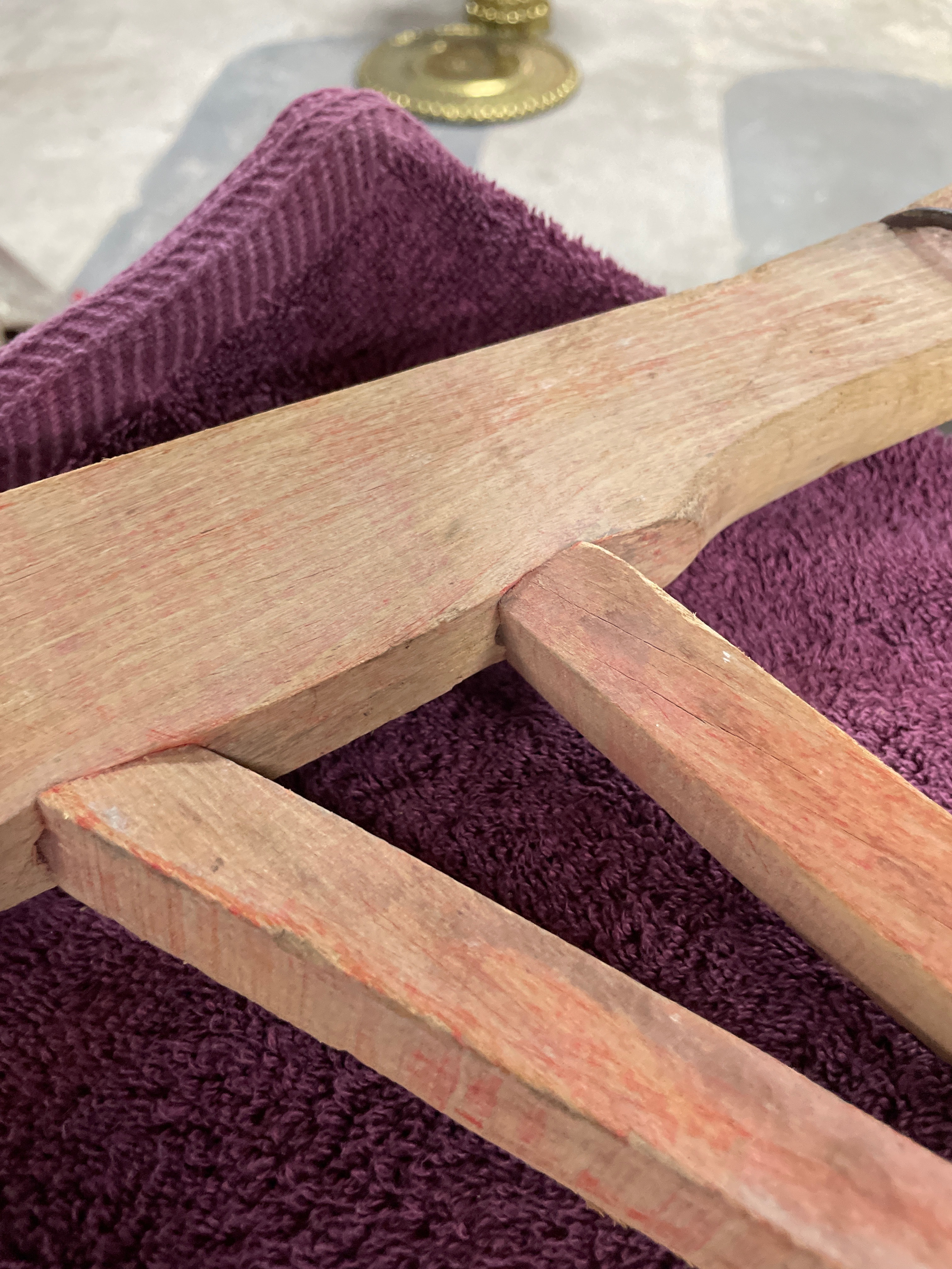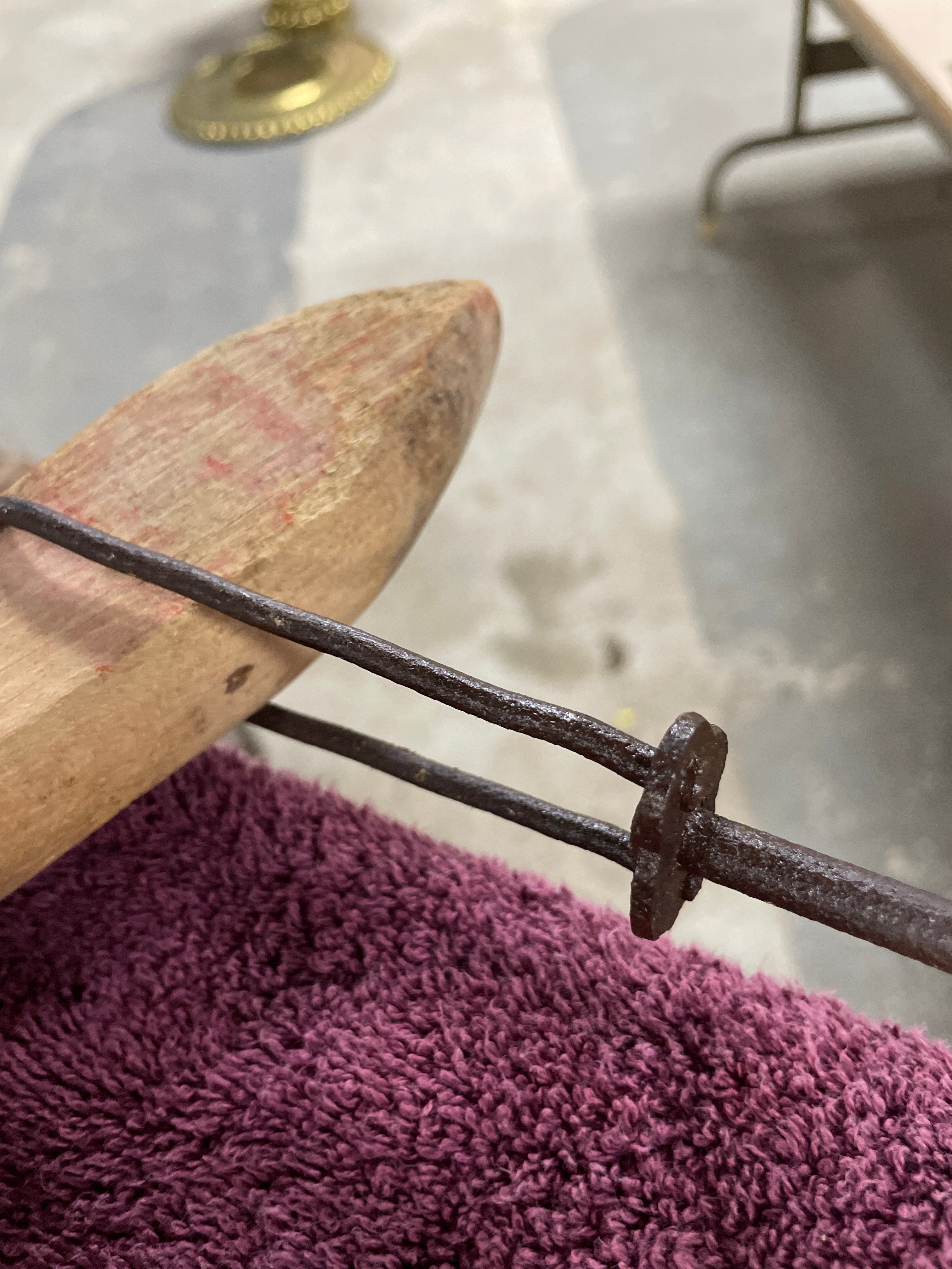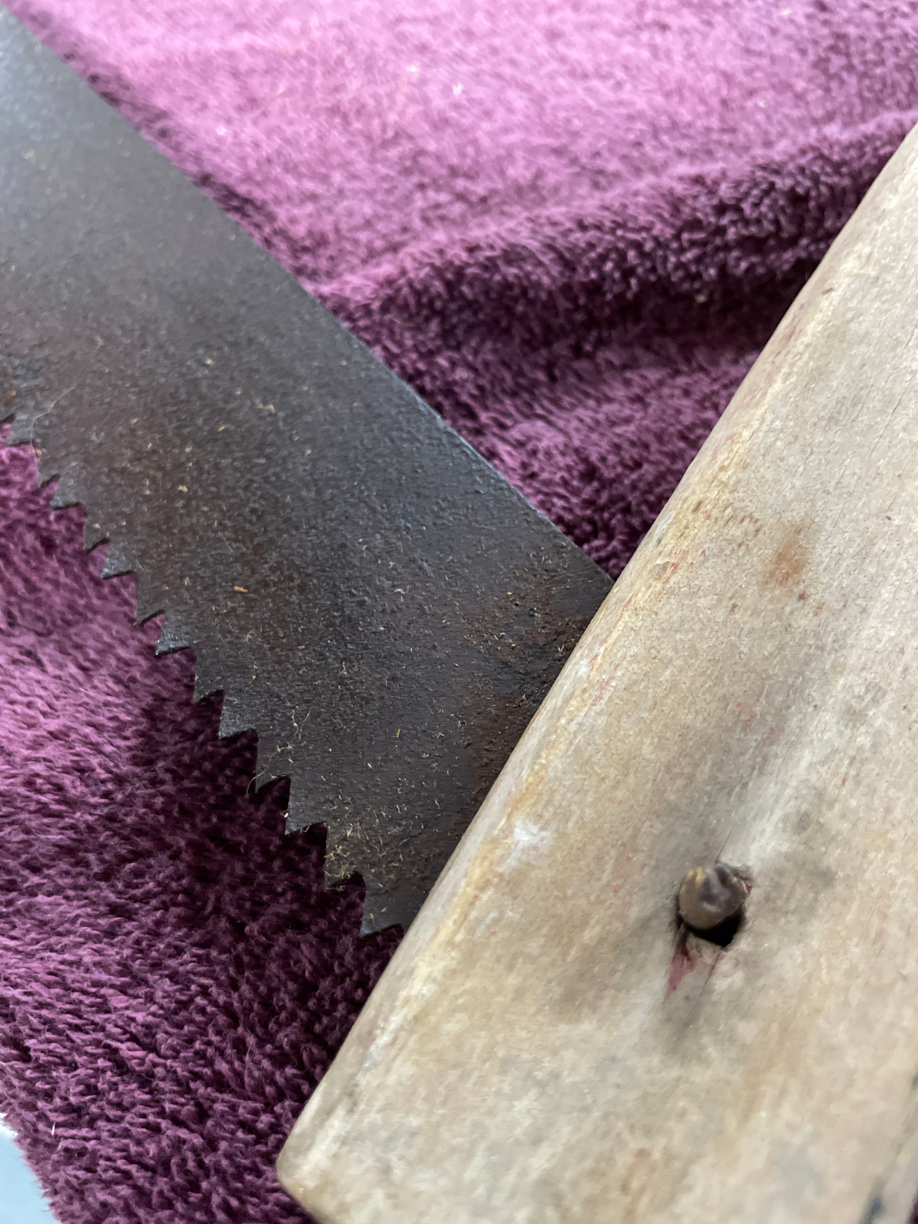 A Vintage Antique Cross Cut Wood Buck / Bow Saw, dating from approximately 1910-1930. This traditional bow saw features a light-colored wooden frame with two curved wooden stretchers. A dark metal blade is held in tension via a twisted metal rod and toggles. The blade exhibits coarse, widely spaced teeth. A white tag with the number ’63’ (६३) is attached to the tensioning rod.
