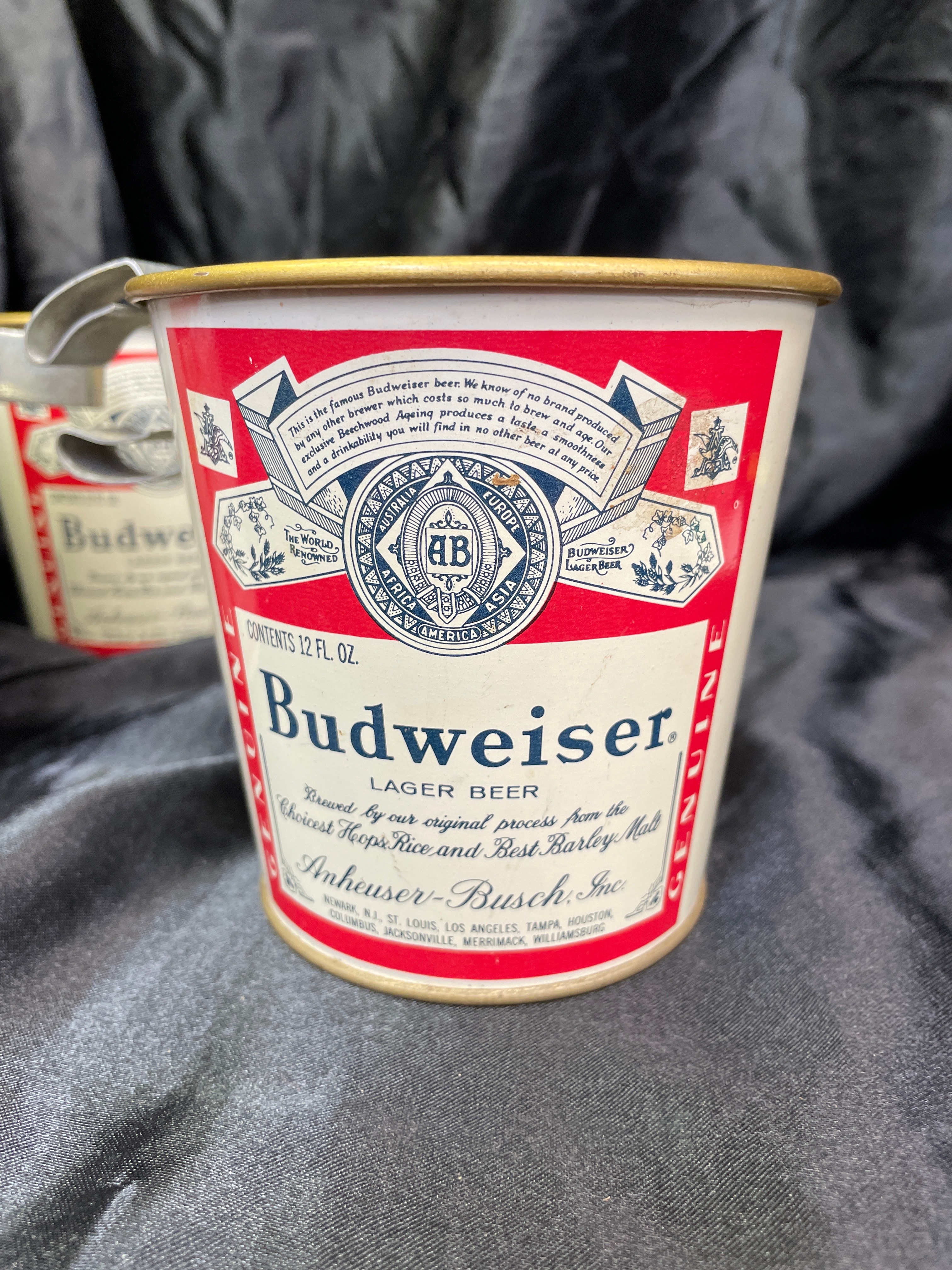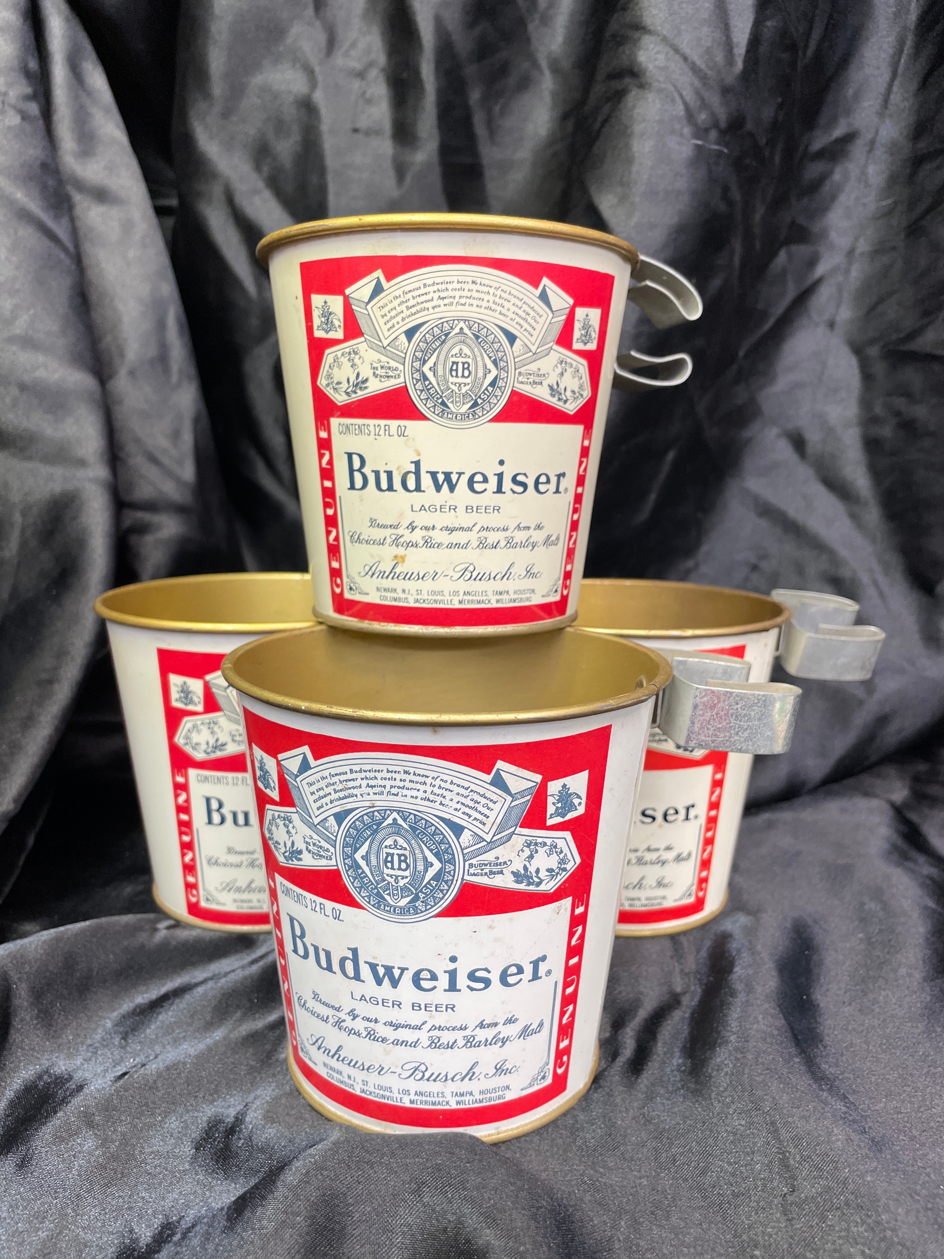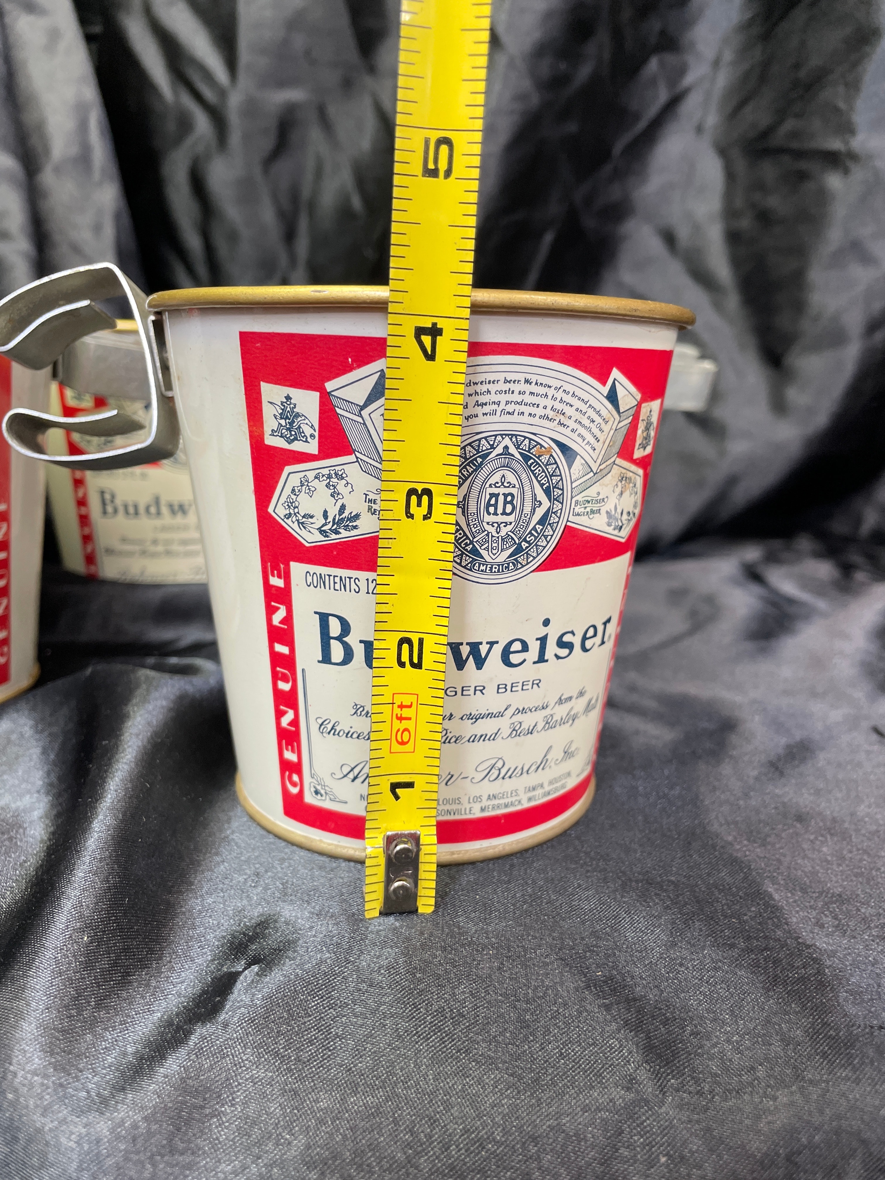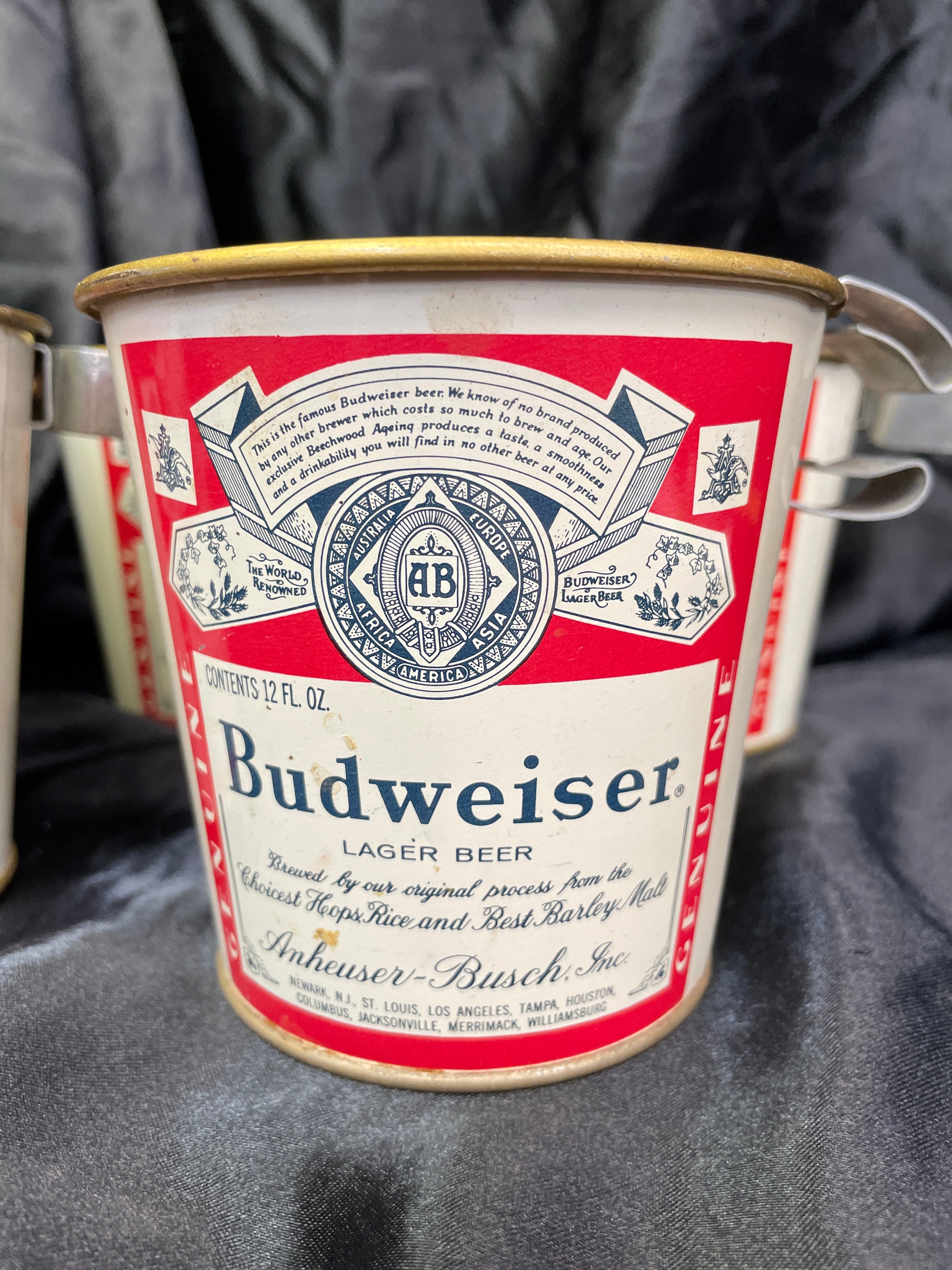 A set of four vintage advertising novelty pails, manufactured by Cheinco Housewares for Budweiser beer. Each pail is constructed from lithographed tin or metal, featuring the classic Budweiser label in red, white, and gold. The design includes “Budweiser LAGER BEER,” “CONTENTS 12 FL. OZ.,” Anheuser-Busch, Inc. brewery information, descriptive text about the beer, and world regions surrounding the ‘AB’ crest. The word “GENUINE” is printed vertically along one side. The reverse of one pail clearly displays a red “CHEINCO HOUSEWARES” logo. The interiors are finished in a gold tone, and each pail is fitted with a simple, curved metal handle.
