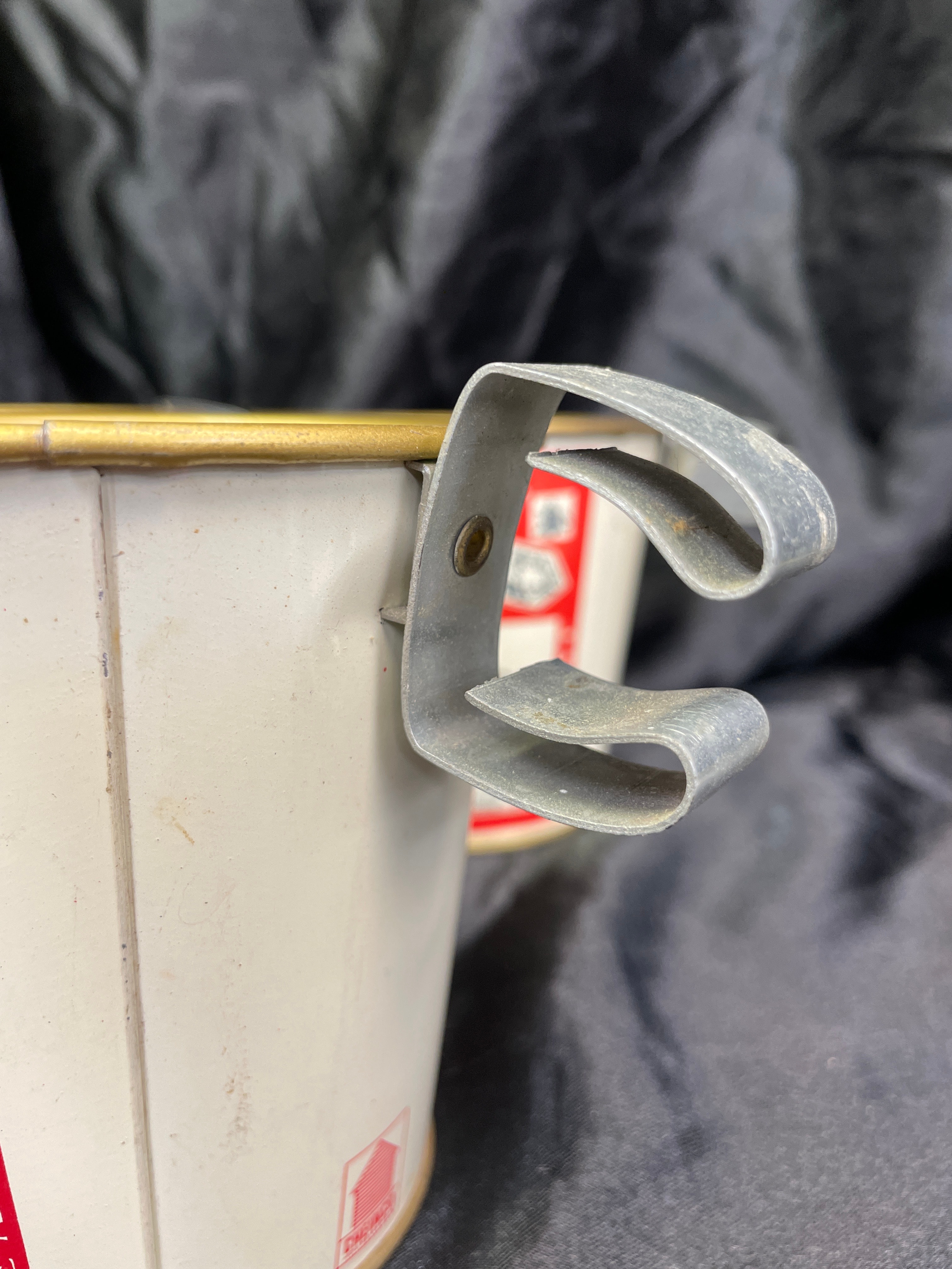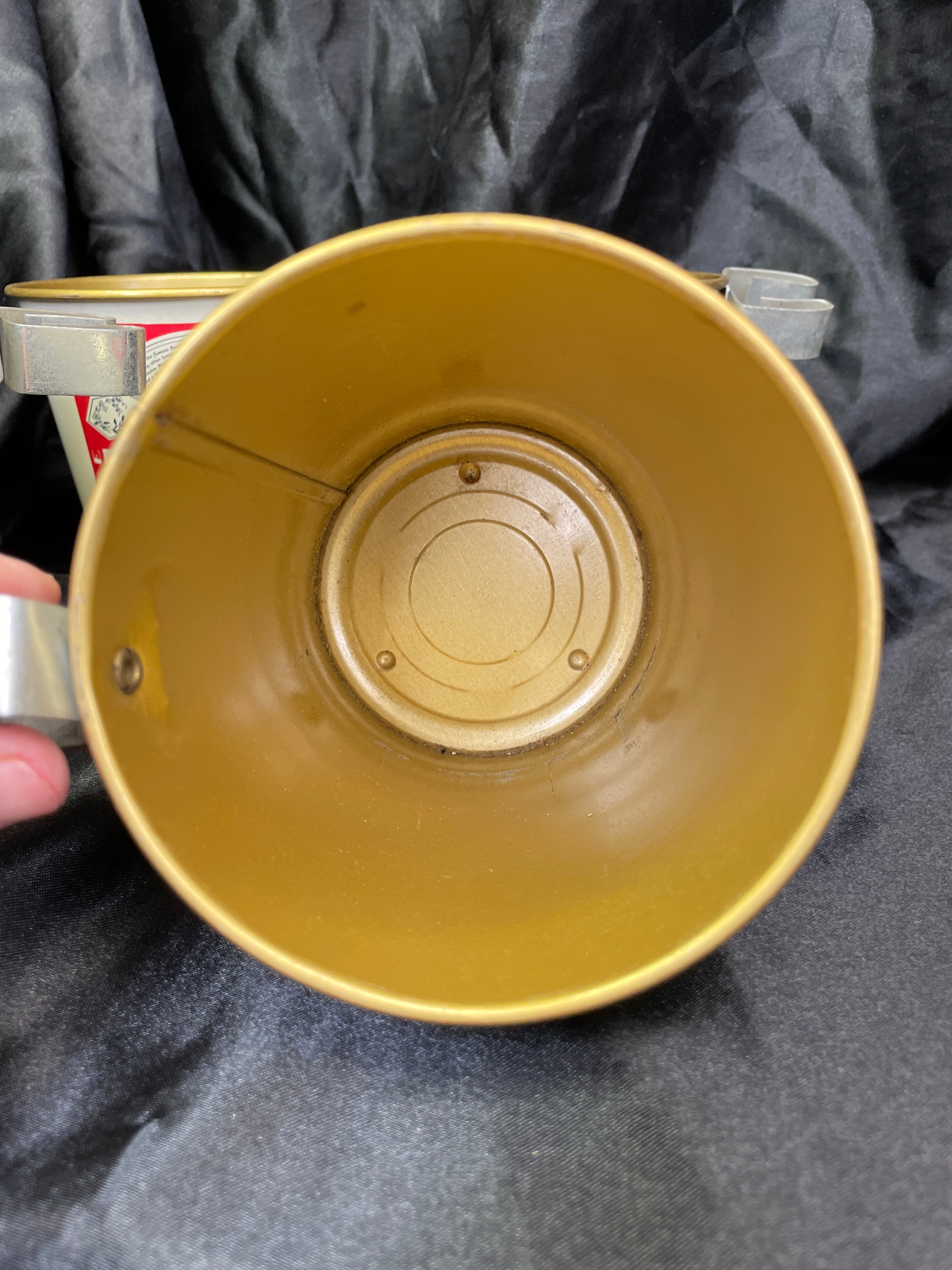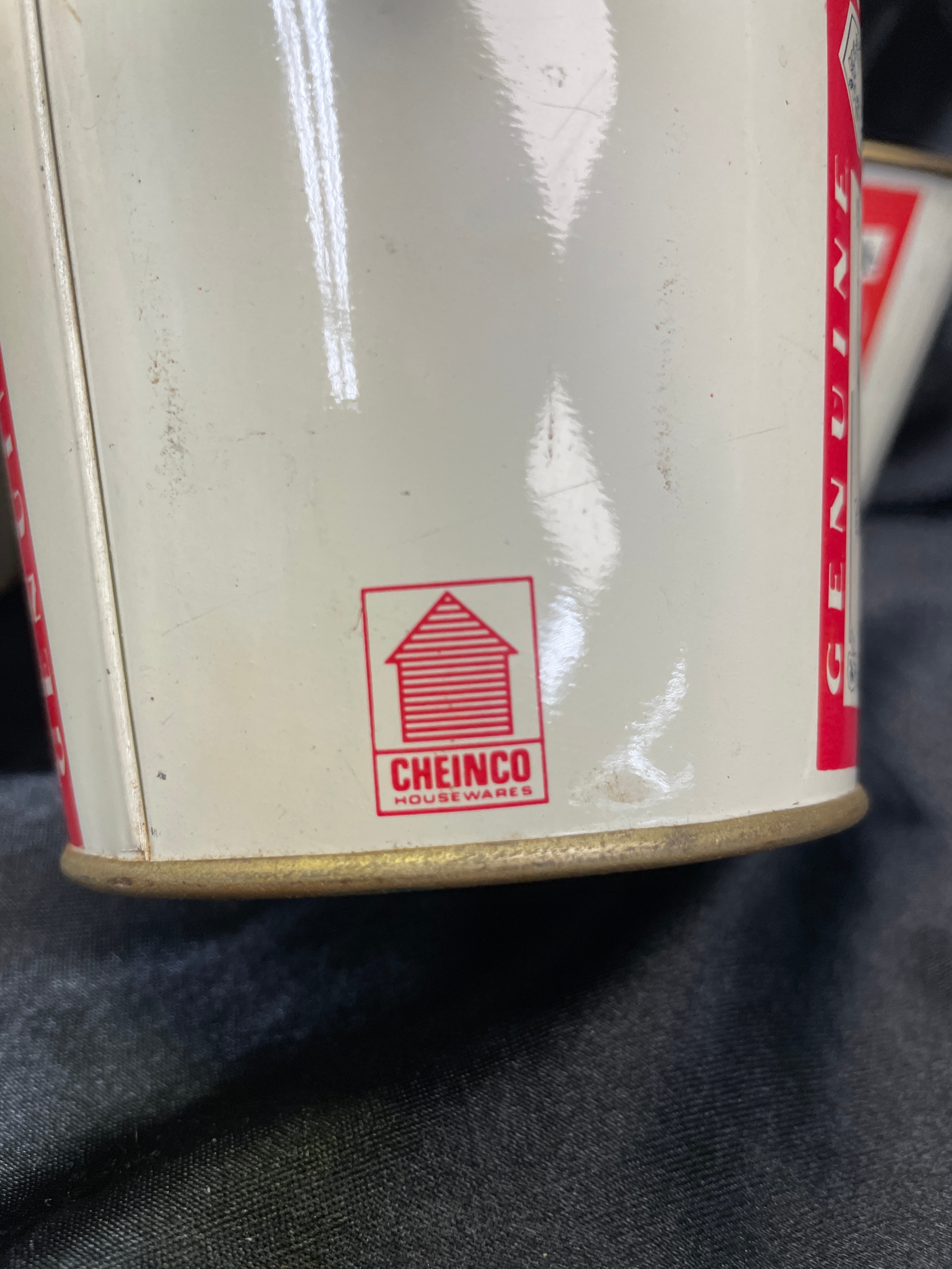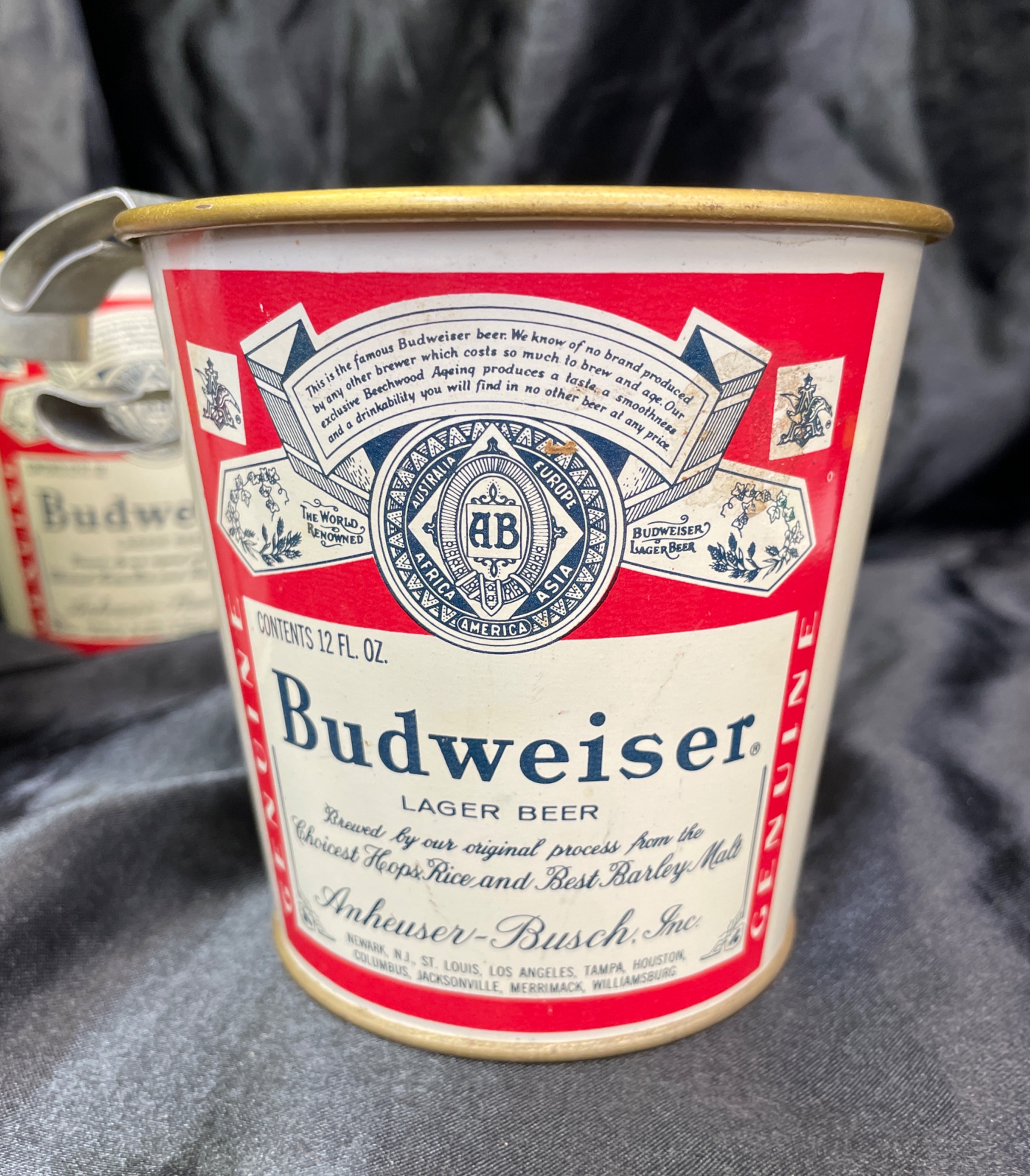A set of four vintage advertising novelty pails, manufactured by Cheinco Housewares for Budweiser beer. Each pail is constructed from lithographed tin or metal, featuring the classic Budweiser label in red, white, and gold. The design includes “Budweiser LAGER BEER,” “CONTENTS 12 FL. OZ.,” Anheuser-Busch, Inc. brewery information, descriptive text about the beer, and world regions surrounding the ‘AB’ crest. The word “GENUINE” is printed vertically along one side. The reverse of one pail clearly displays a red “CHEINCO HOUSEWARES” logo. The interiors are finished in a gold tone, and each pail is fitted with a simple, curved metal handle.