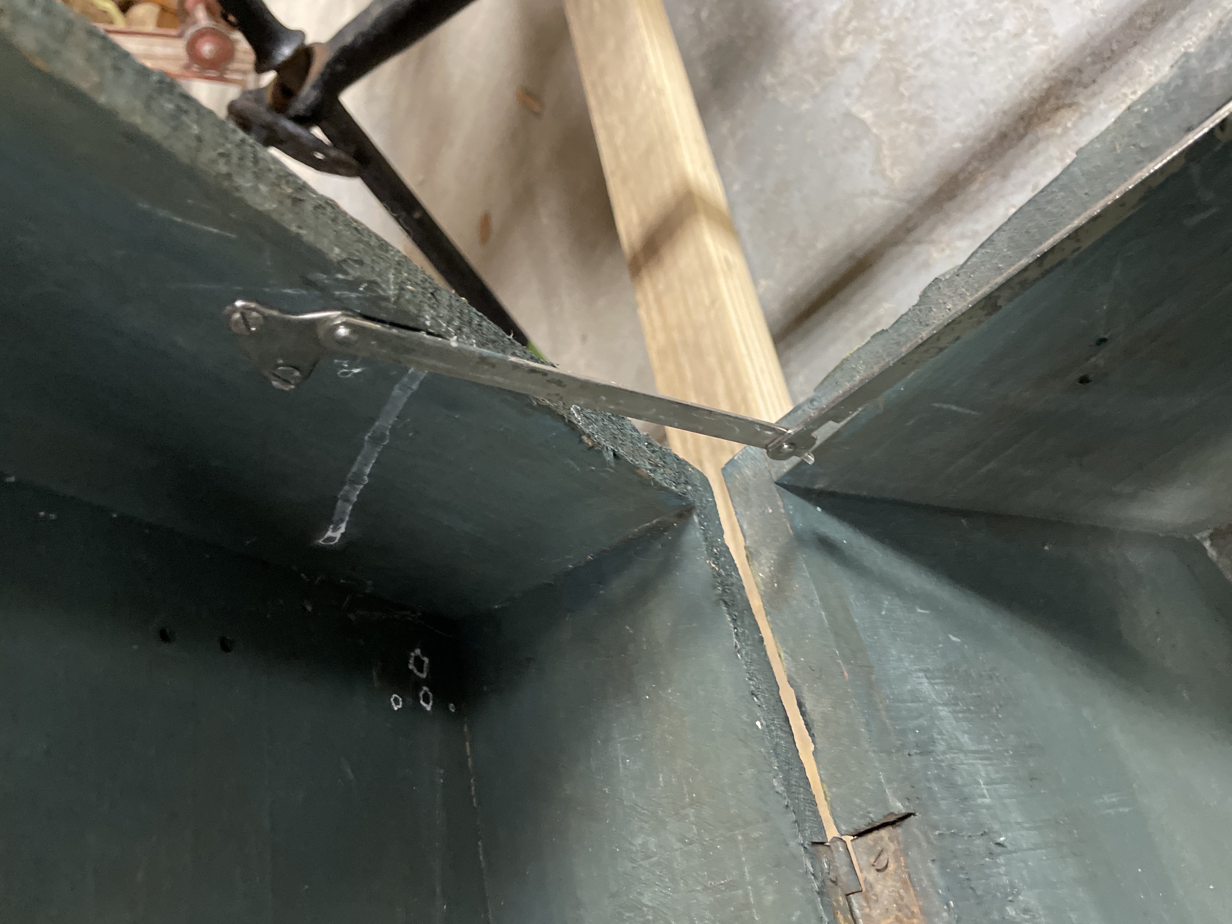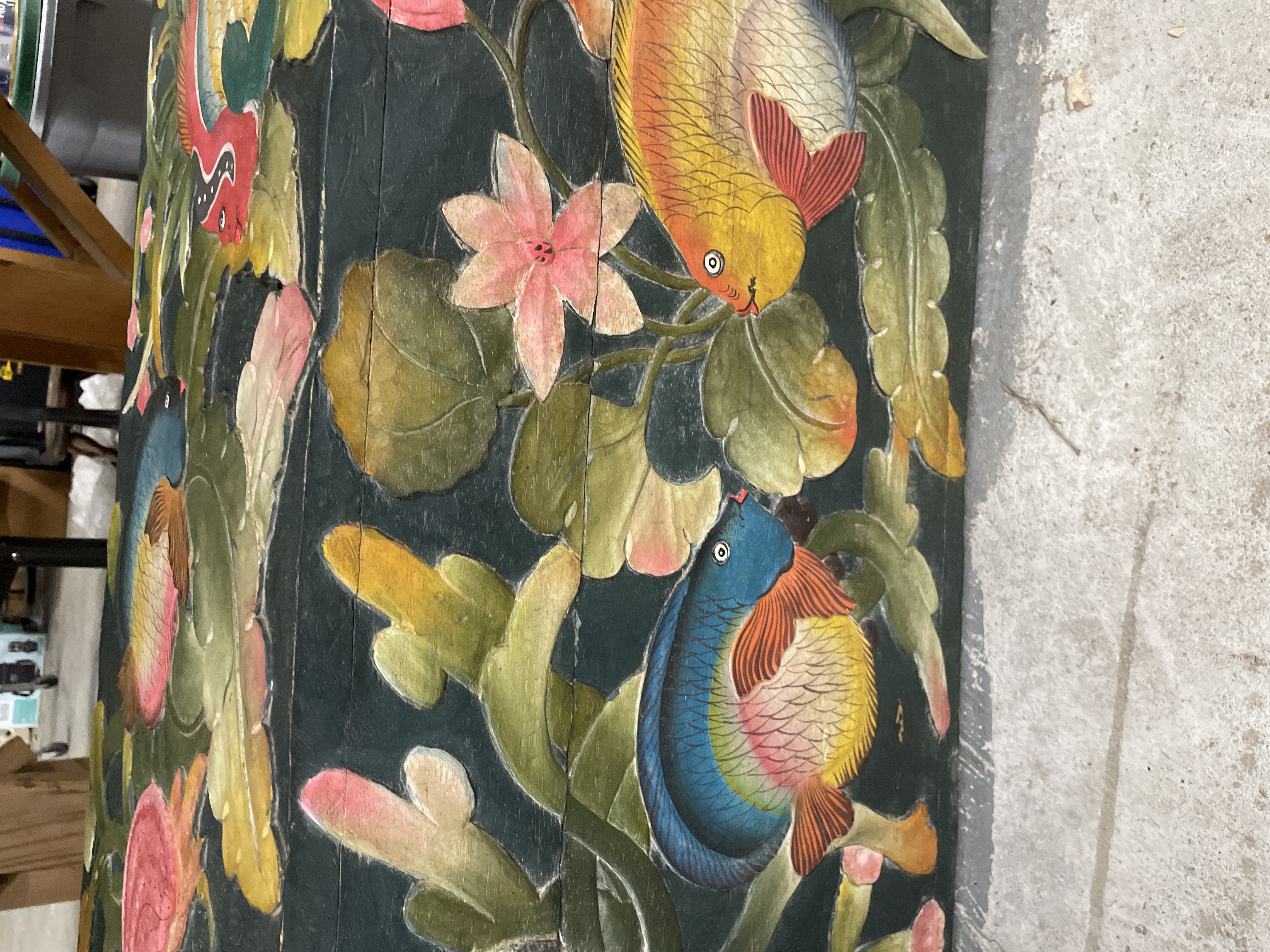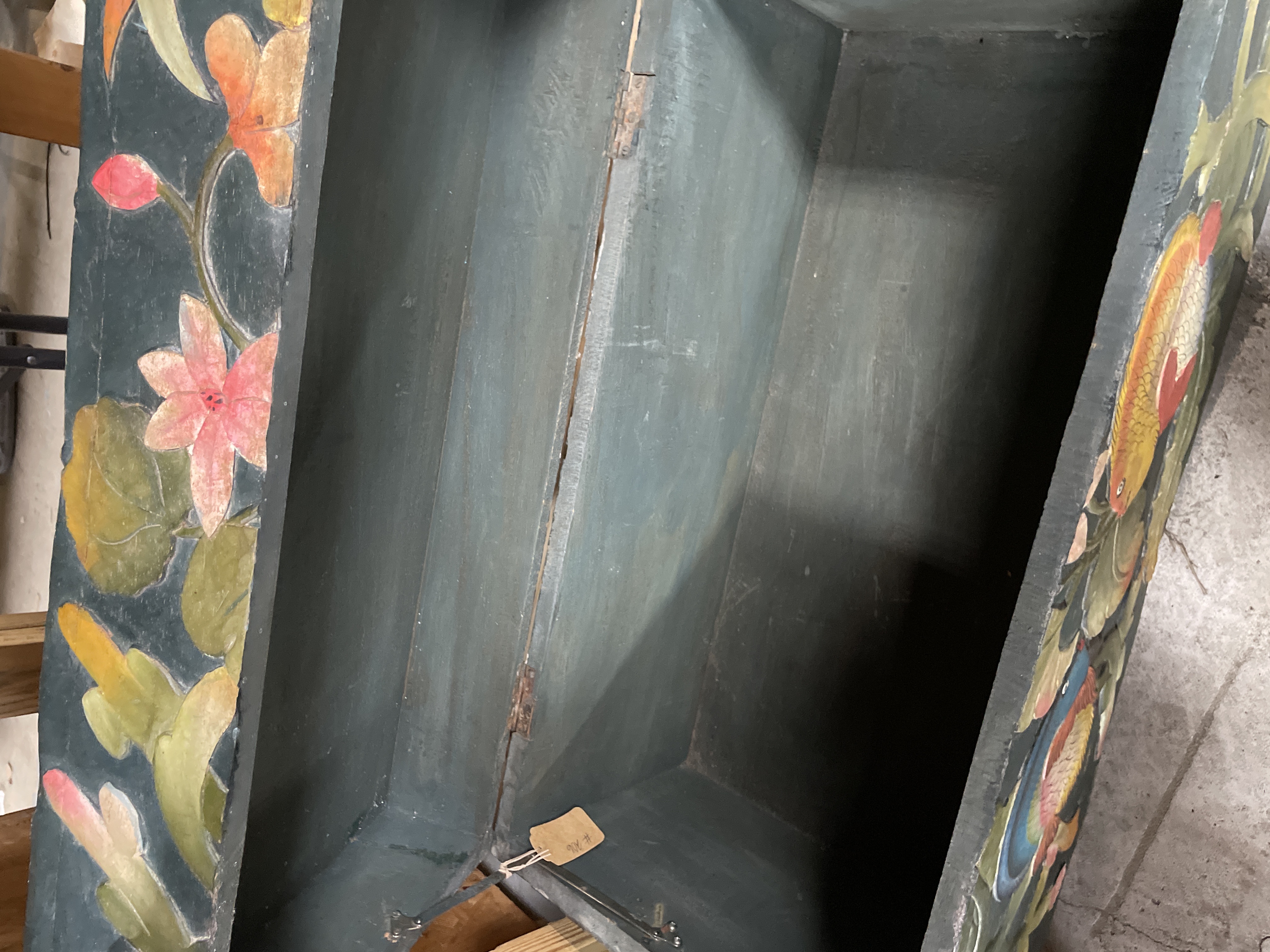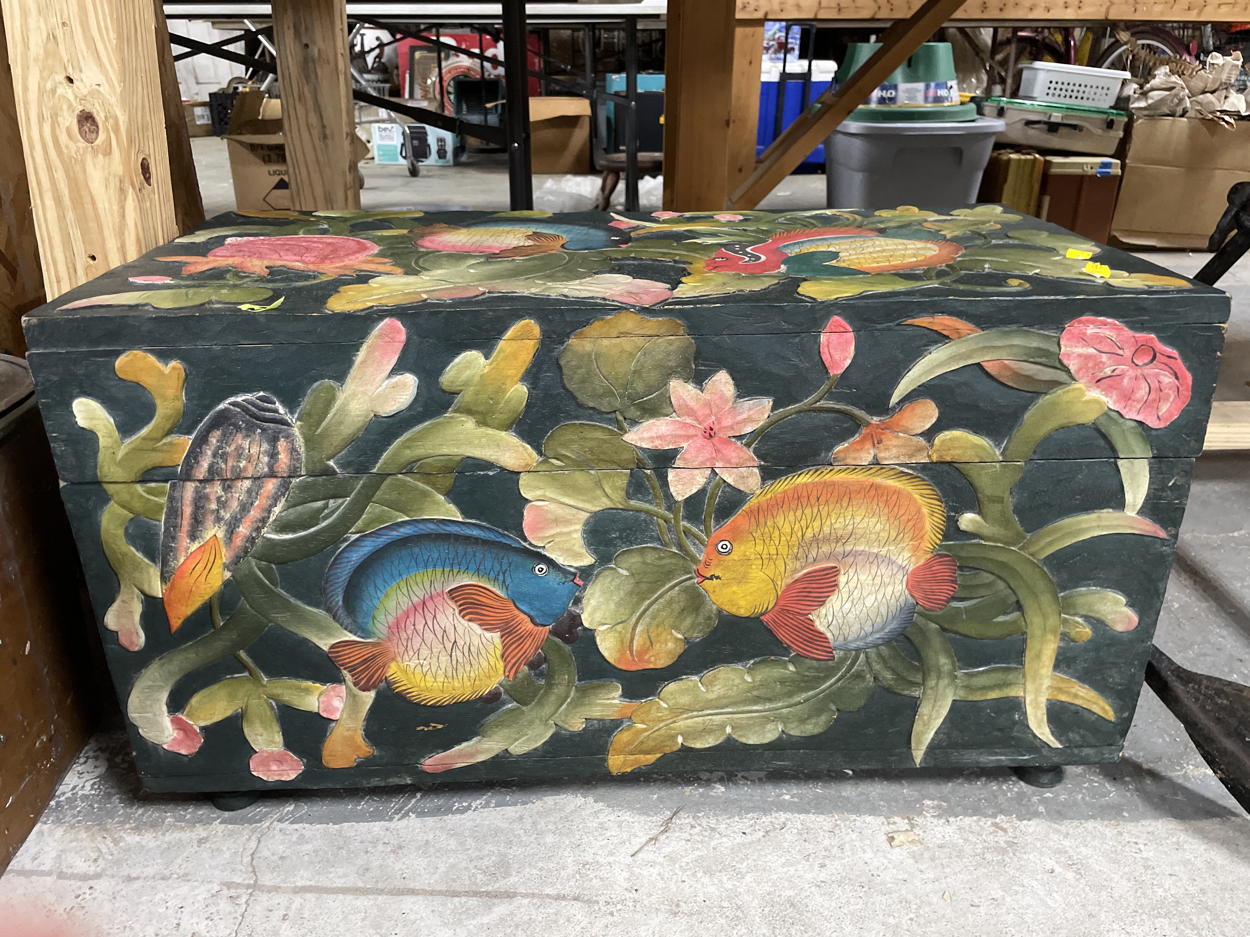 A single large wooden storage chest or trunk constructed from wooden planks, featuring extensive high-relief carving and polychrome painted decoration in a folk art style. The exterior surfaces are painted a dark teal or forest green and display a highly detailed aquatic scene. The carving includes brightly colored fish, stylized birds, lotus flowers, and dense stylized foliage. The chest features a hinged lid. The interior surfaces are painted uniformly dark teal. Visible hardware includes metal hinges and a modern silver-toned metal lid stay. A small, illegible rectangular tag is attached to the interior.