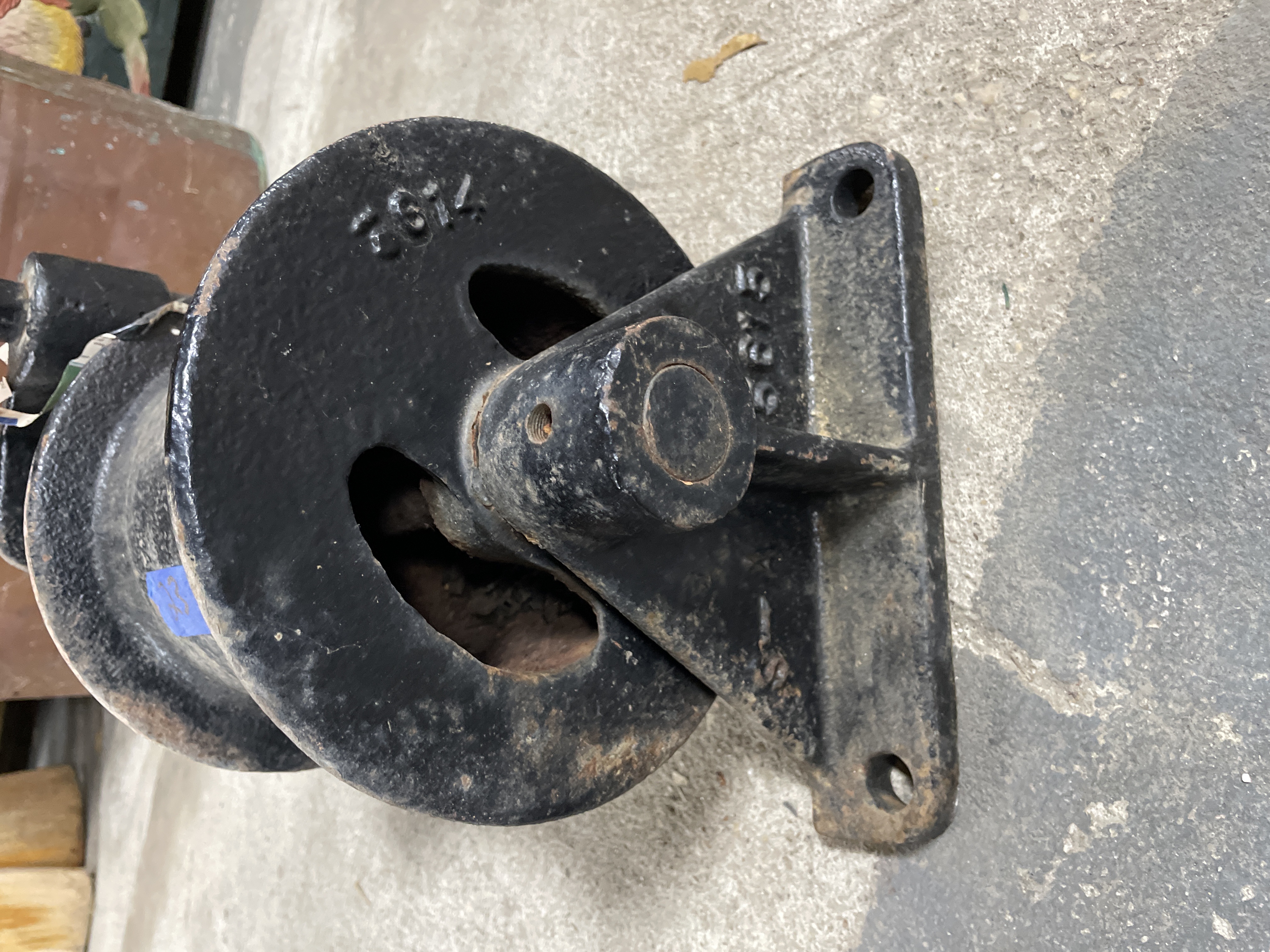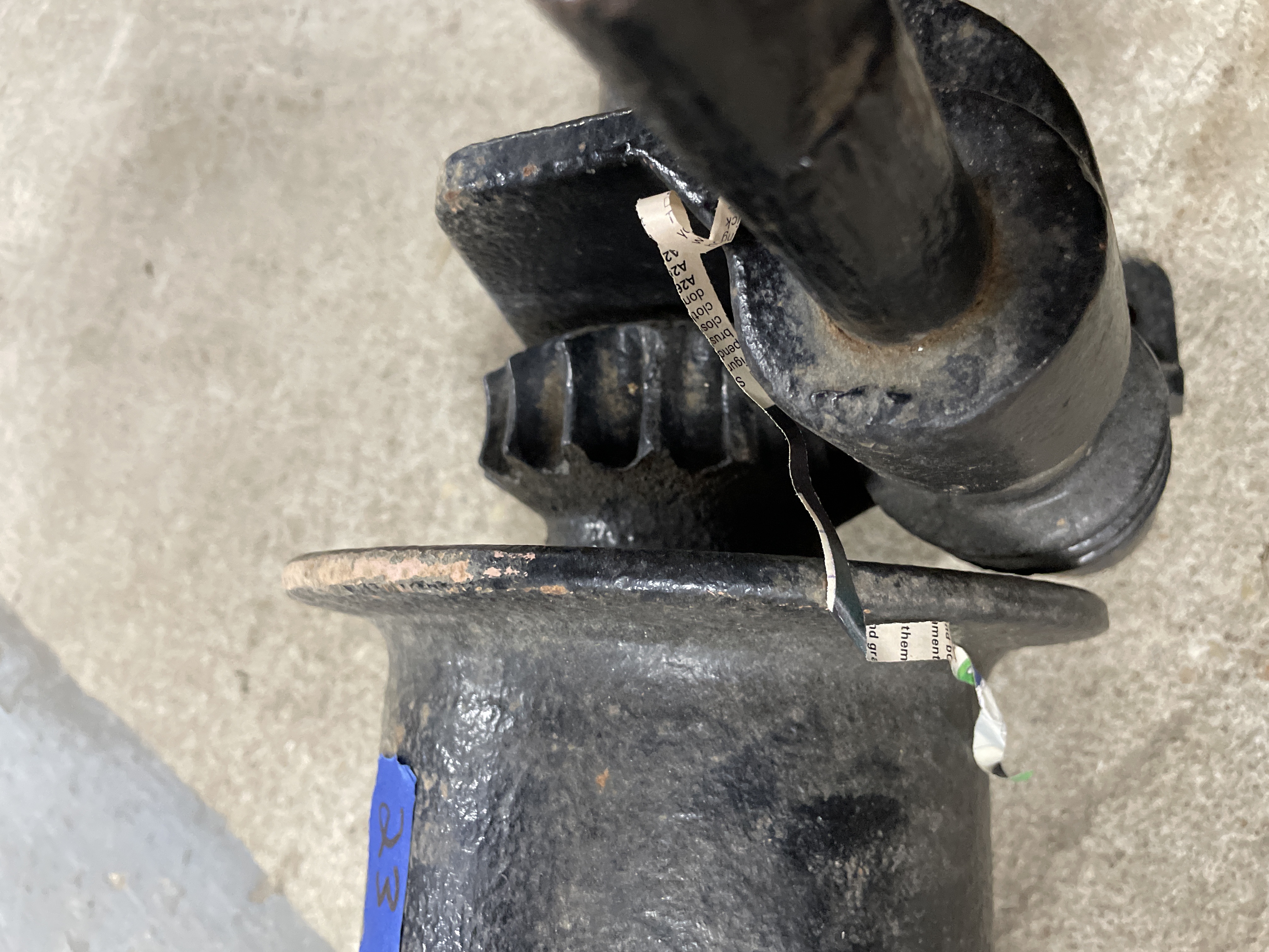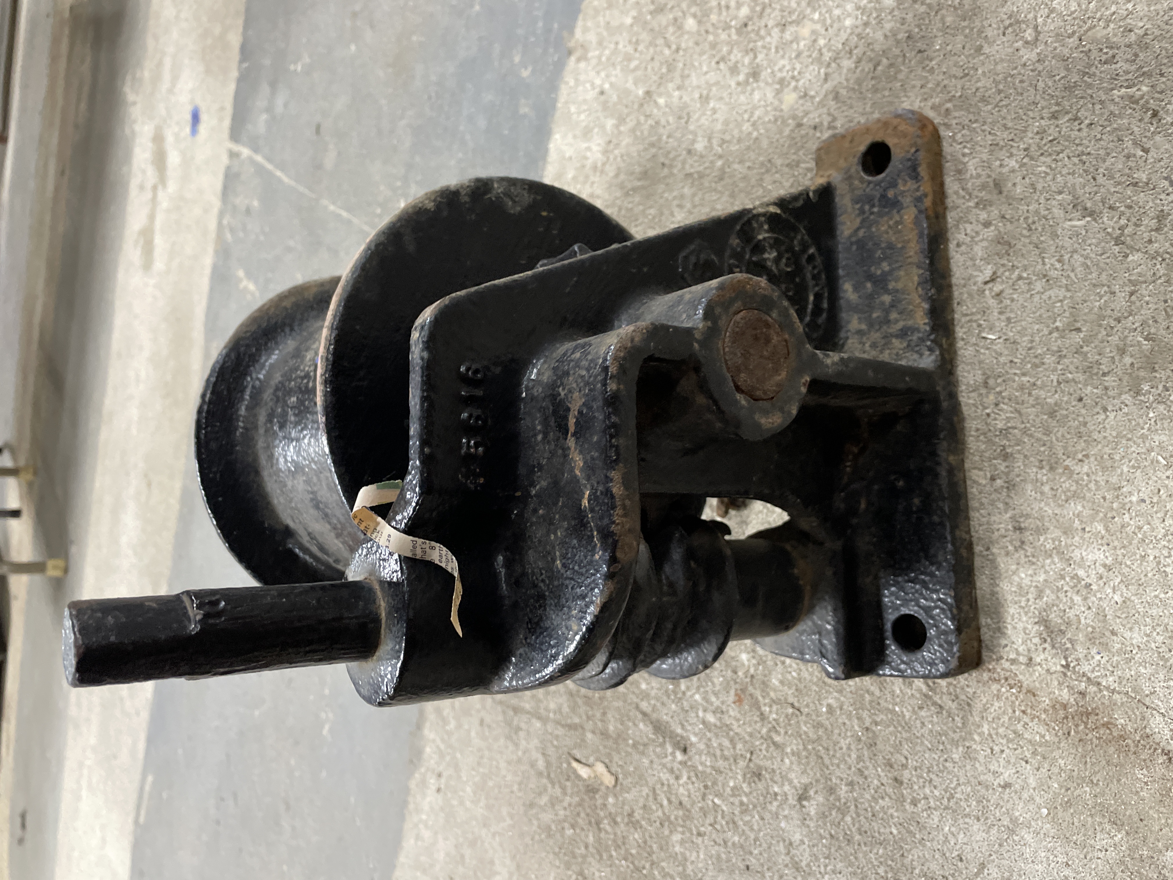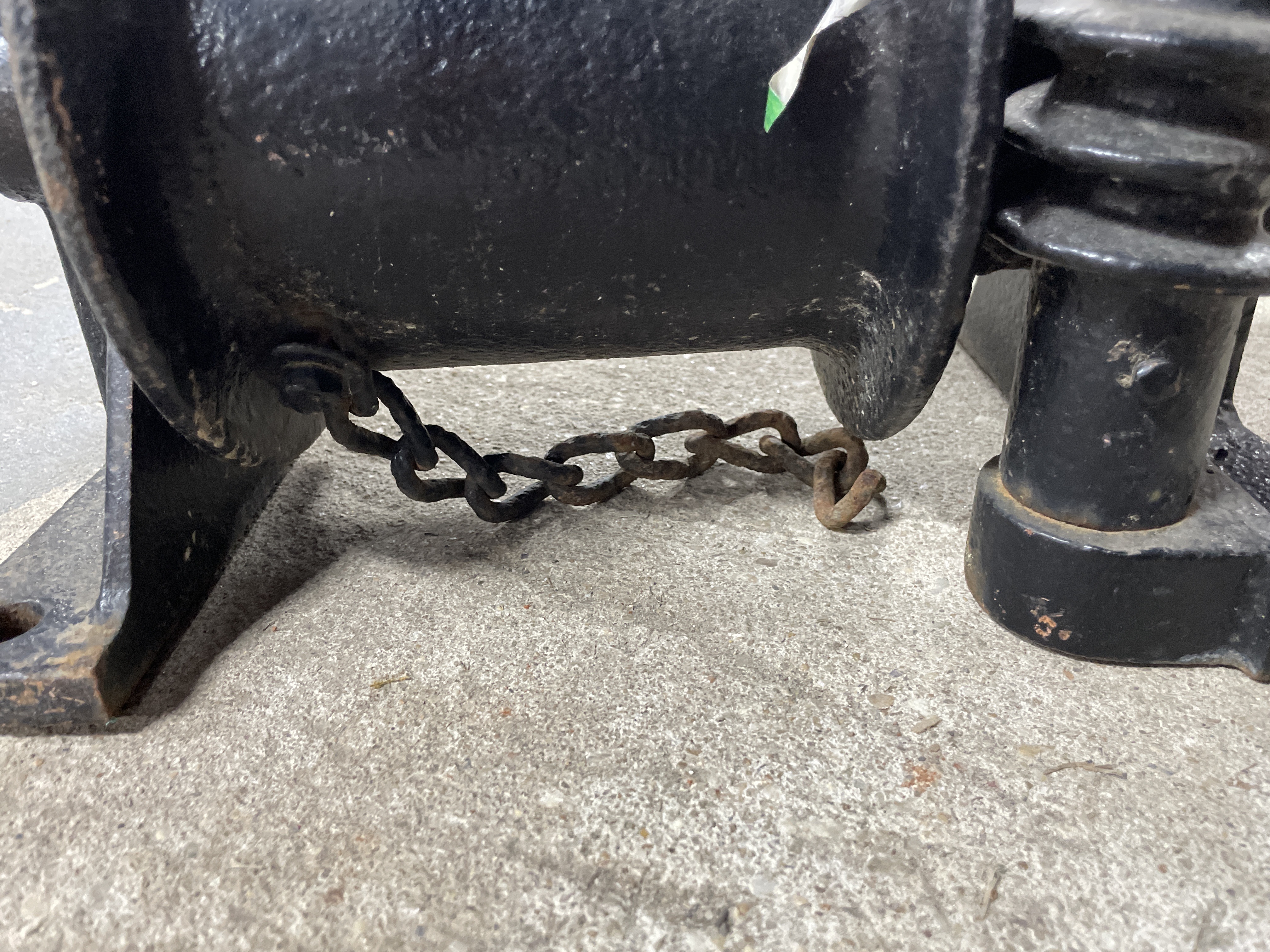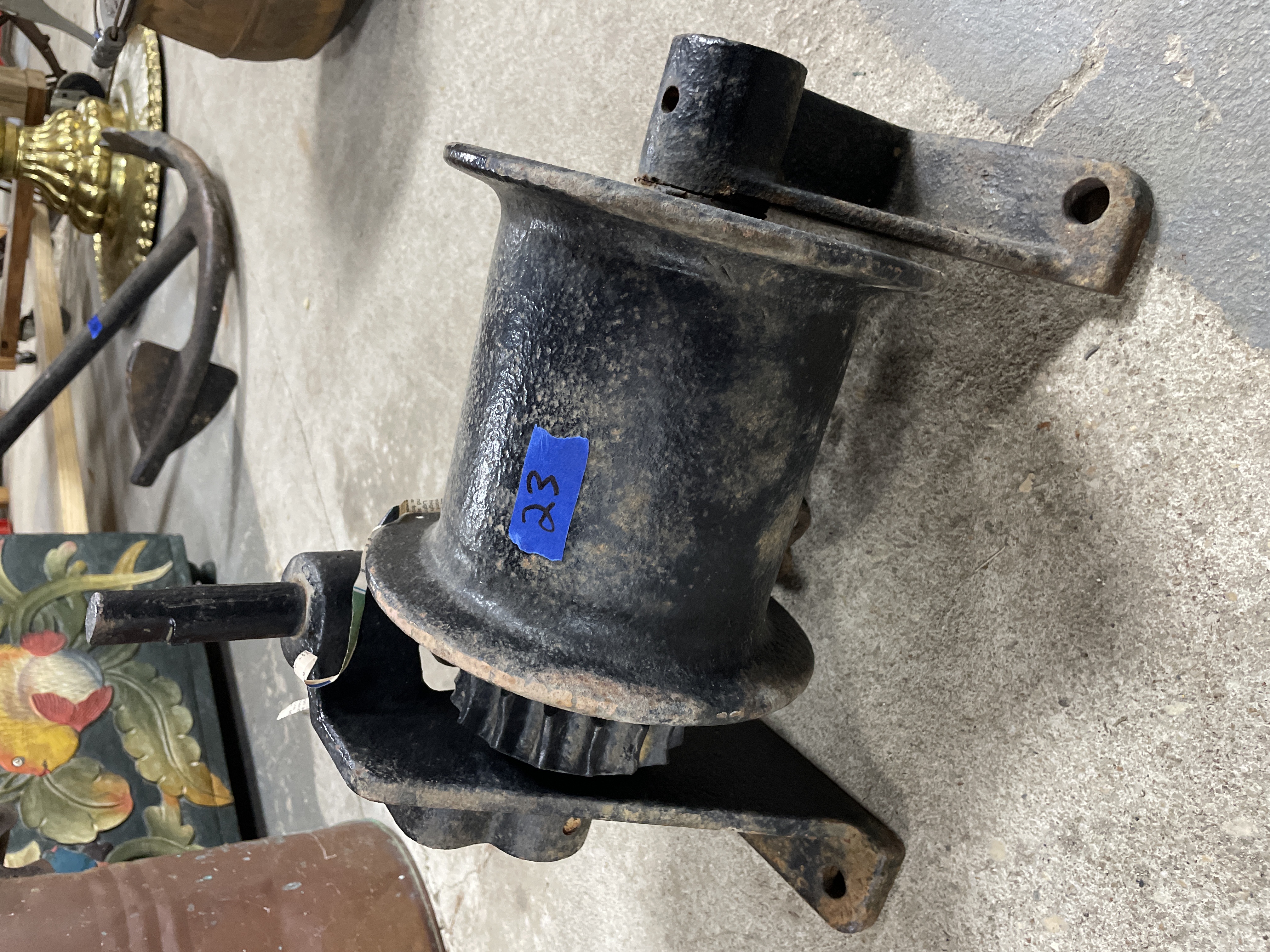 A single heavy-duty industrial or marine winch component. The piece comprises a spool or drum assembly mounted on a bifurcated base plate designed for secure bolting. The assembly features a visible cog/gear mechanism integrated into the structure and a central drive shaft extension. A small length of rusty chain is suspended beneath the drum. The structure is finished in a weathered black coating. Visible molded numbers include 8675 on the base, 371 on the drum face, and 85516 on the side support structure. A blue inventory sticker bearing the number 23 is affixed to the exterior of the spool.
