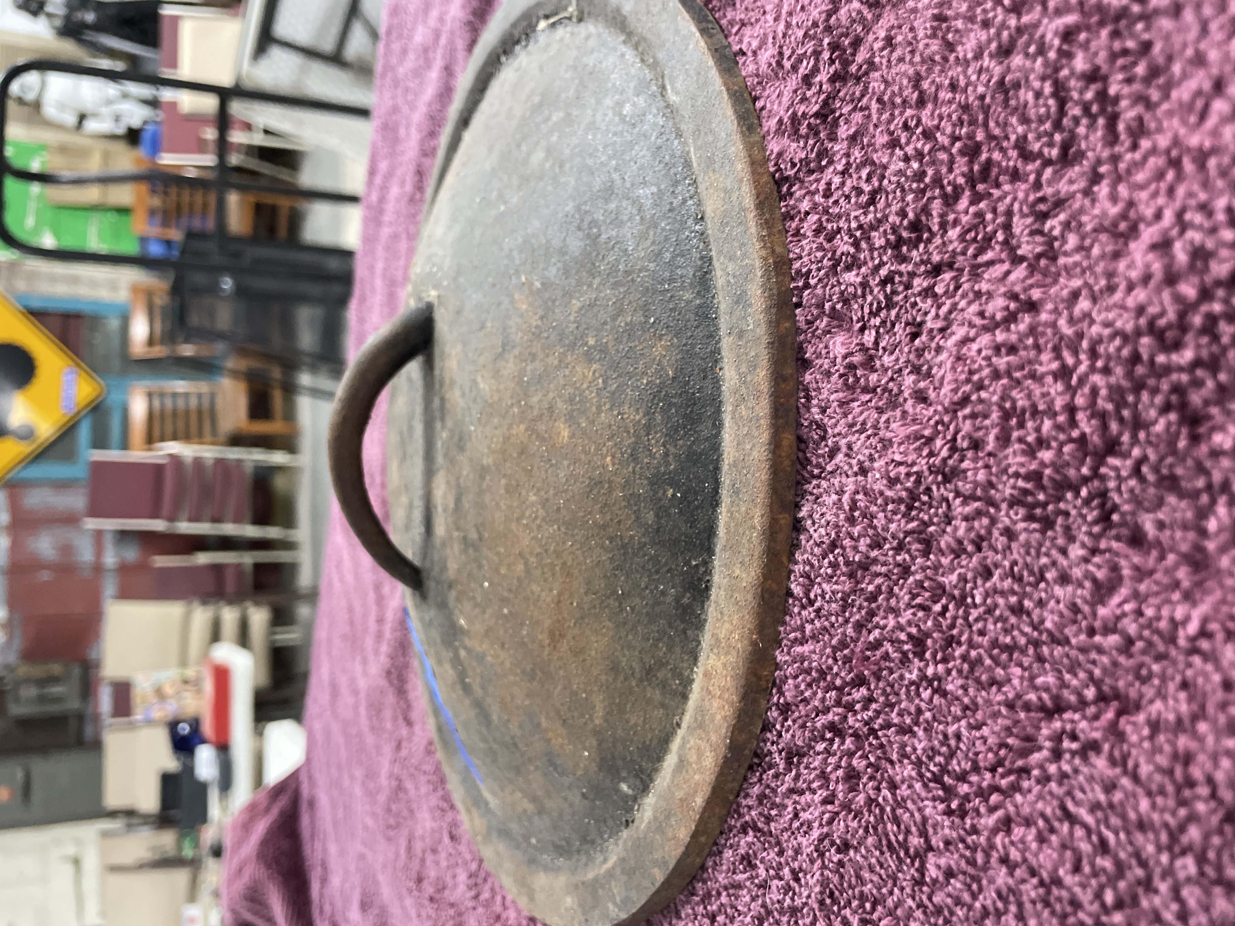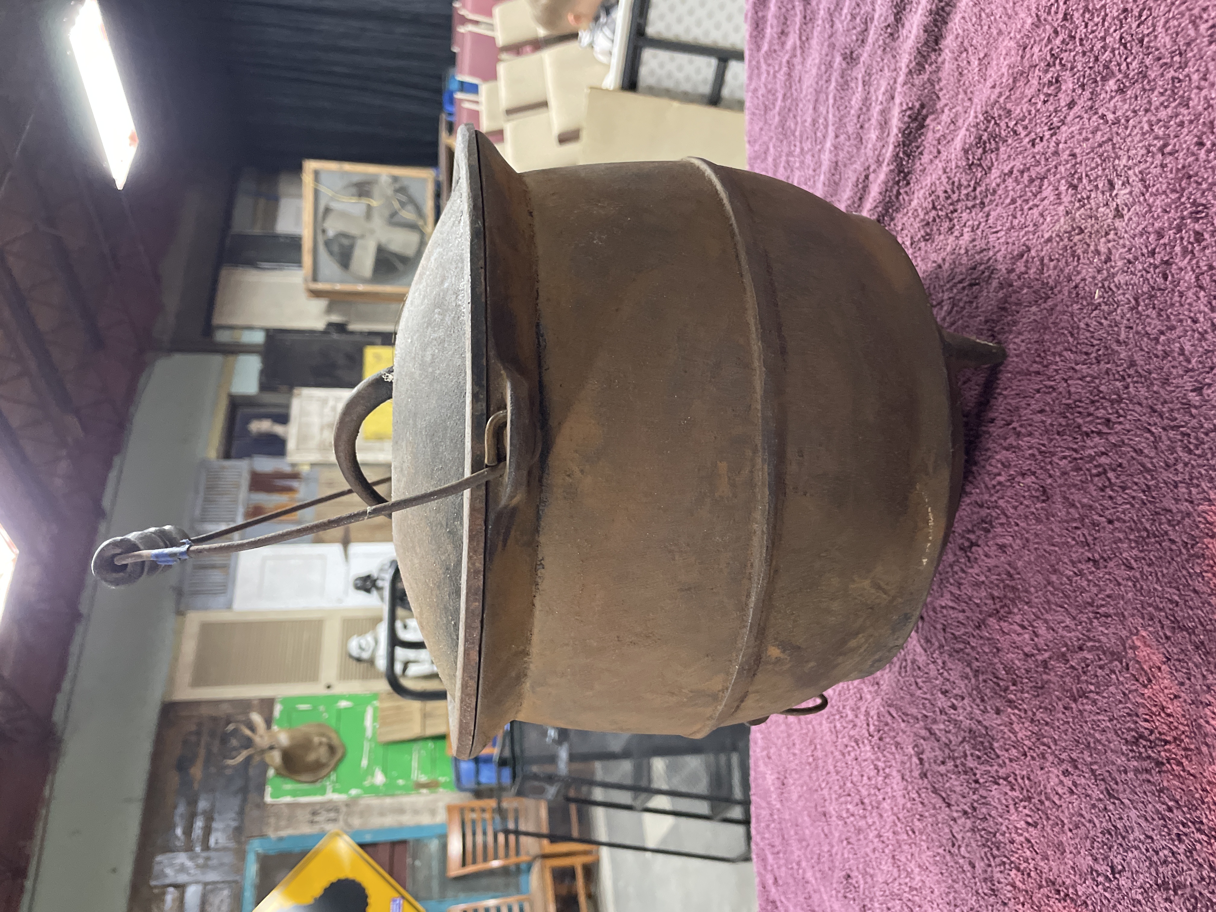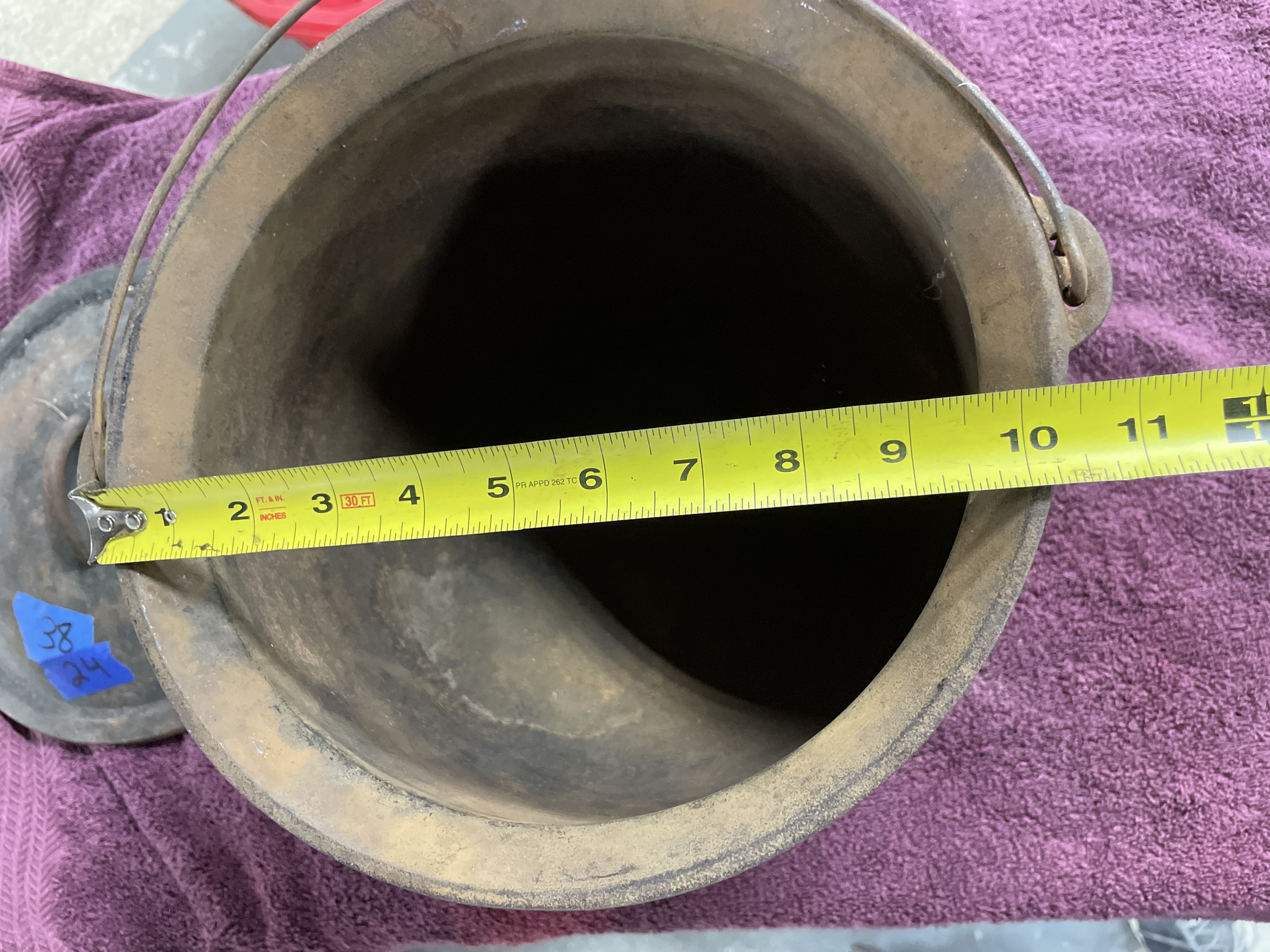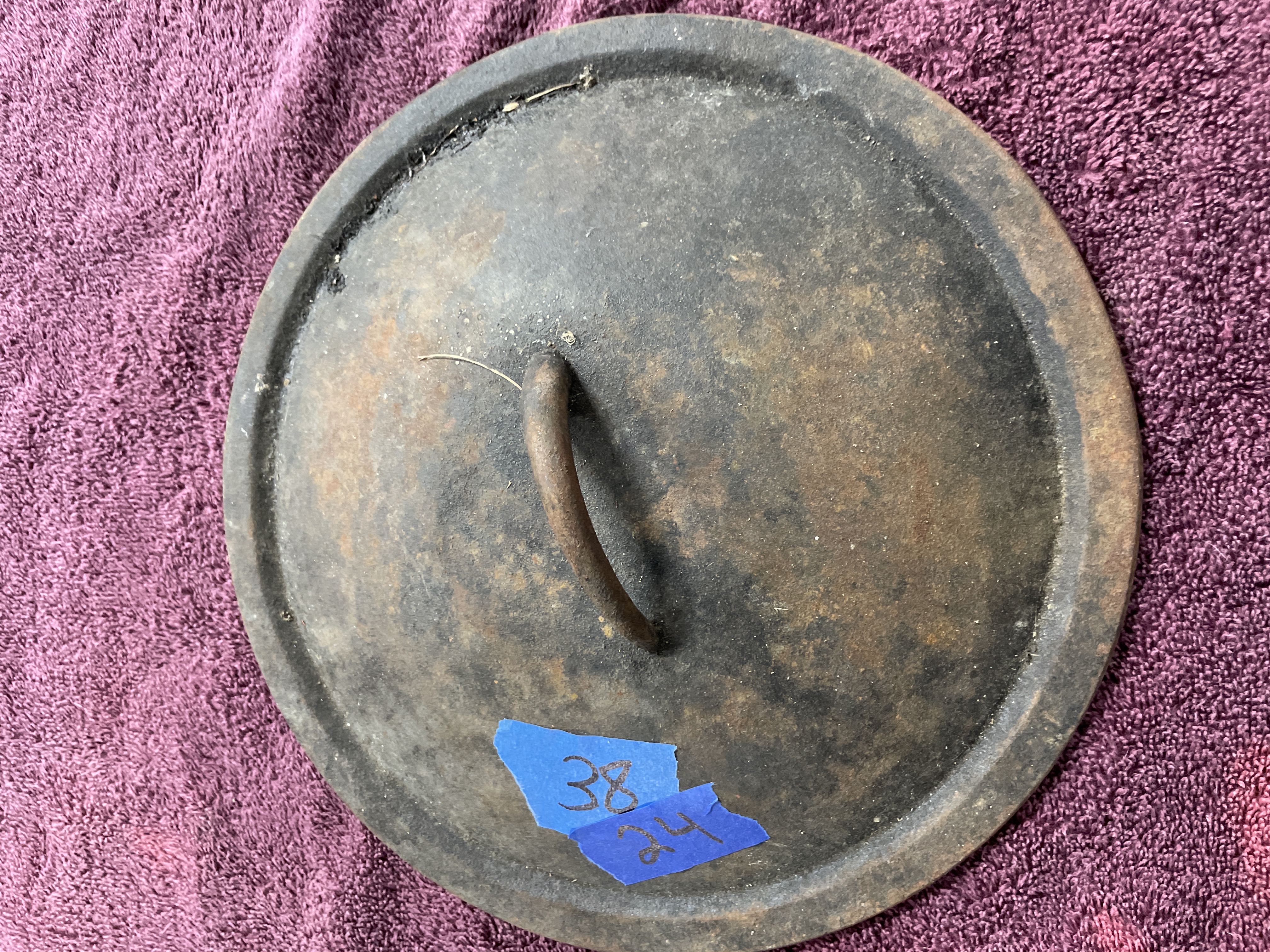 A two-piece lot comprising an antique cast iron cauldron or kettle and its matching flat lid. The kettle is constructed of heavy cast iron, featuring a rounded body supported by three integrated stub legs, characteristic of early tripod cooking vessels often referred to as bean pots or gypsy cauldrons. The vessel is equipped with attachment points for a bail handle, currently fitted with a wire bail handle having a central wooden grip. A fixed metal ring handle is present on the side of the body. The underside of the kettle bears the raised manufacturer marking SIDNEY. The accompanying cast iron lid is flat and fitted with a solid metal loop handle. The lid bears a blue inventory sticker marked 38.
