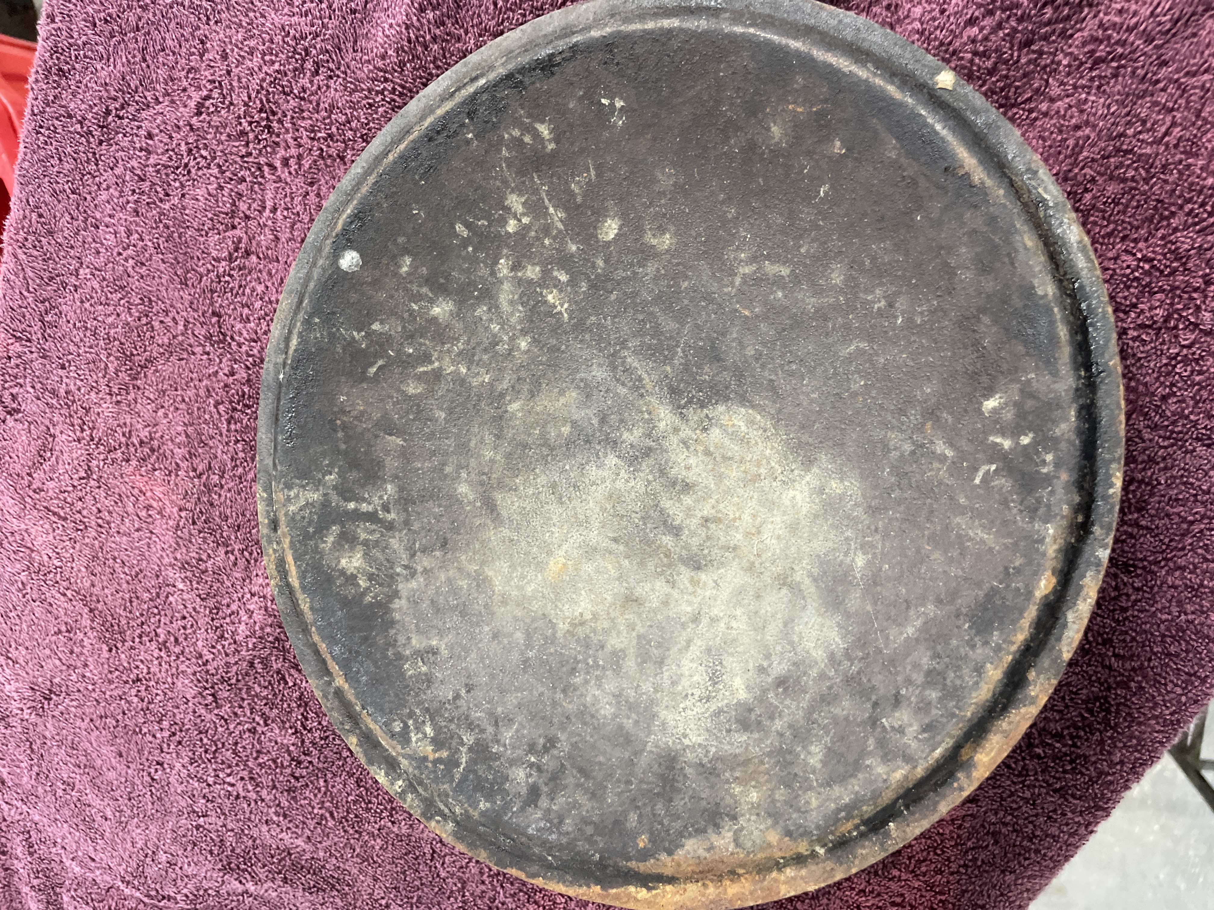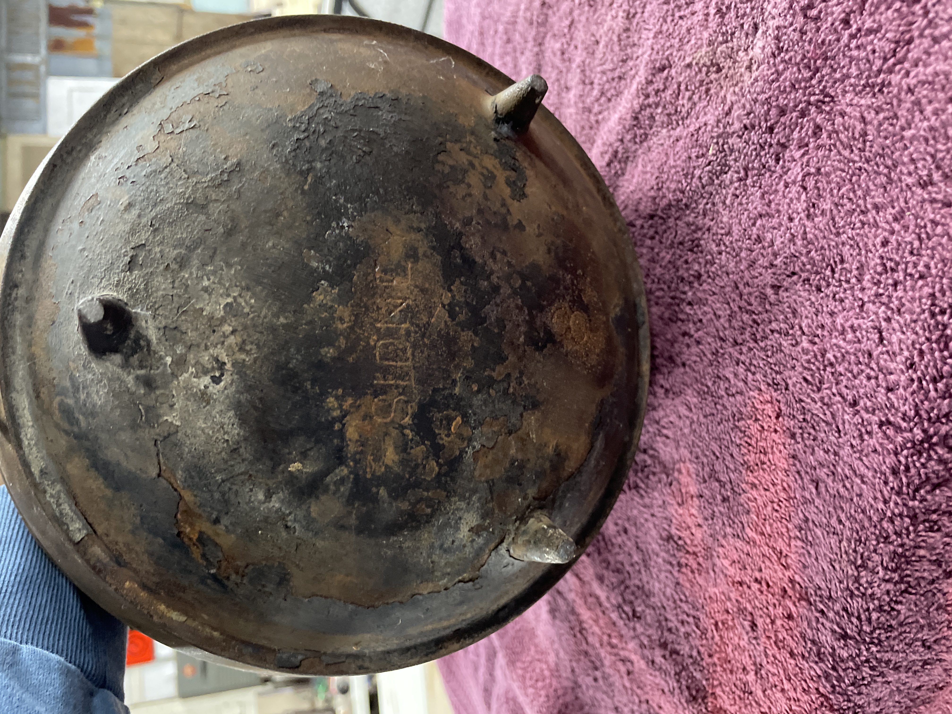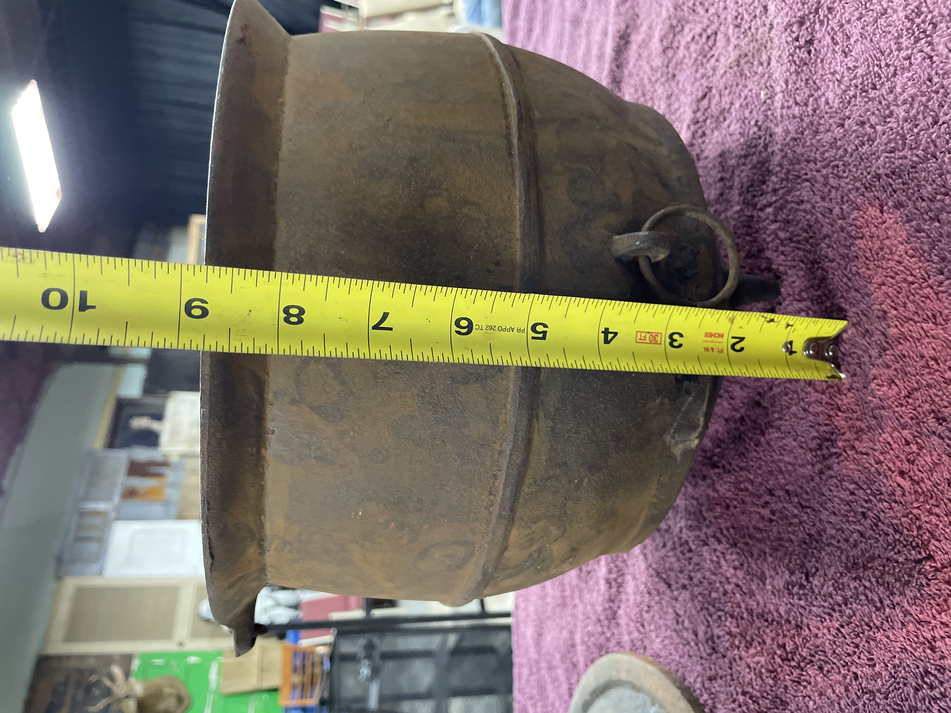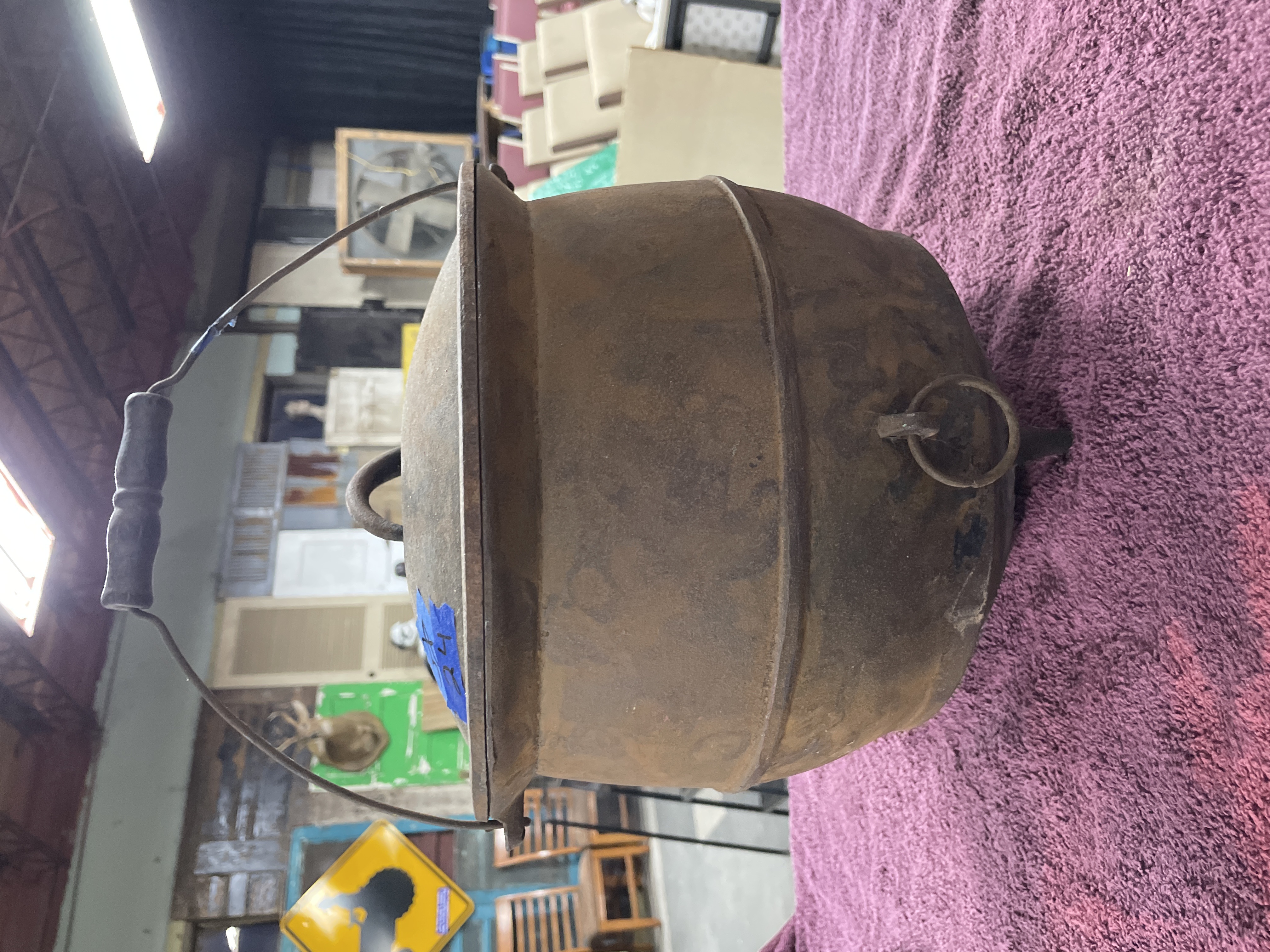 A two-piece lot comprising an antique cast iron cauldron or kettle and its matching flat lid. The kettle is constructed of heavy cast iron, featuring a rounded body supported by three integrated stub legs, characteristic of early tripod cooking vessels often referred to as bean pots or gypsy cauldrons. The vessel is equipped with attachment points for a bail handle, currently fitted with a wire bail handle having a central wooden grip. A fixed metal ring handle is present on the side of the body. The underside of the kettle bears the raised manufacturer marking SIDNEY. The accompanying cast iron lid is flat and fitted with a solid metal loop handle. The lid bears a blue inventory sticker marked 38.