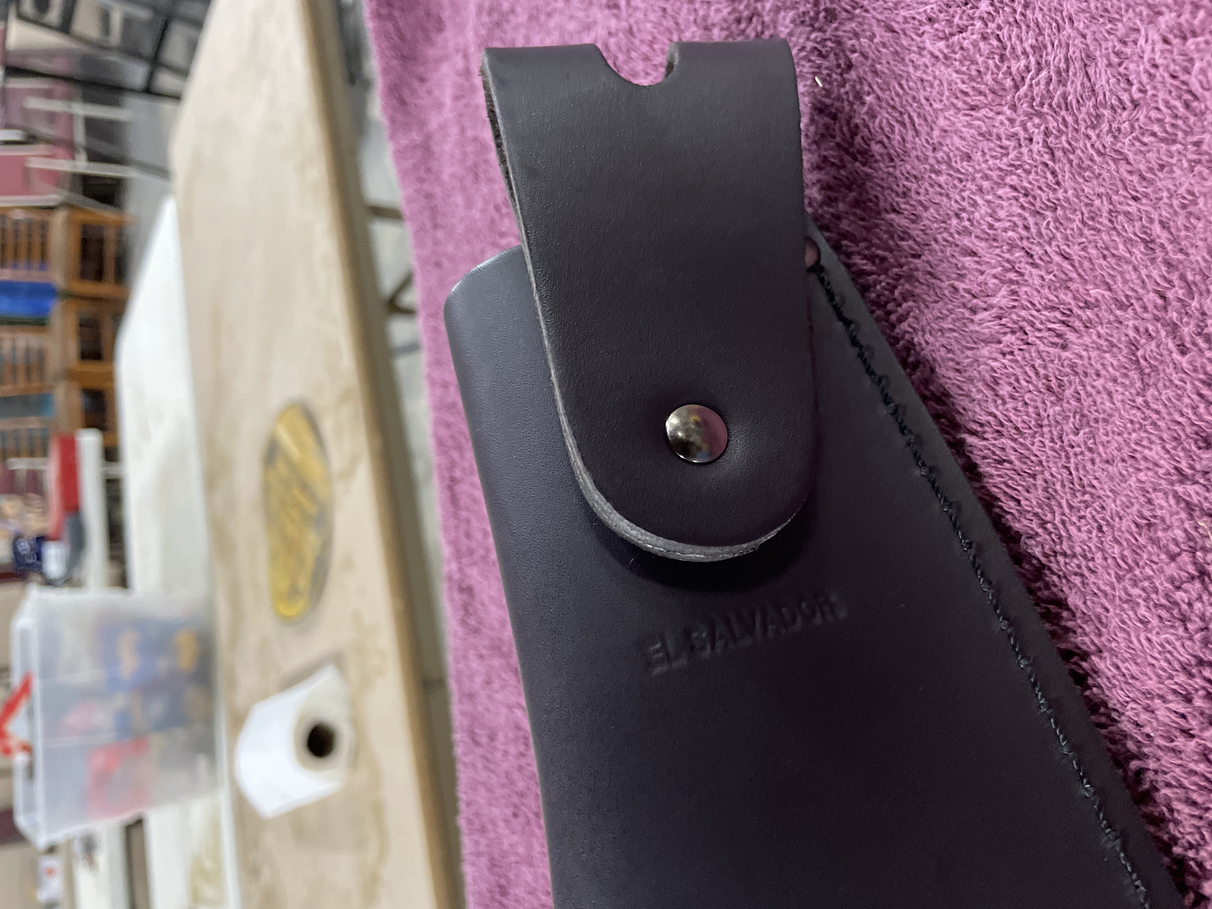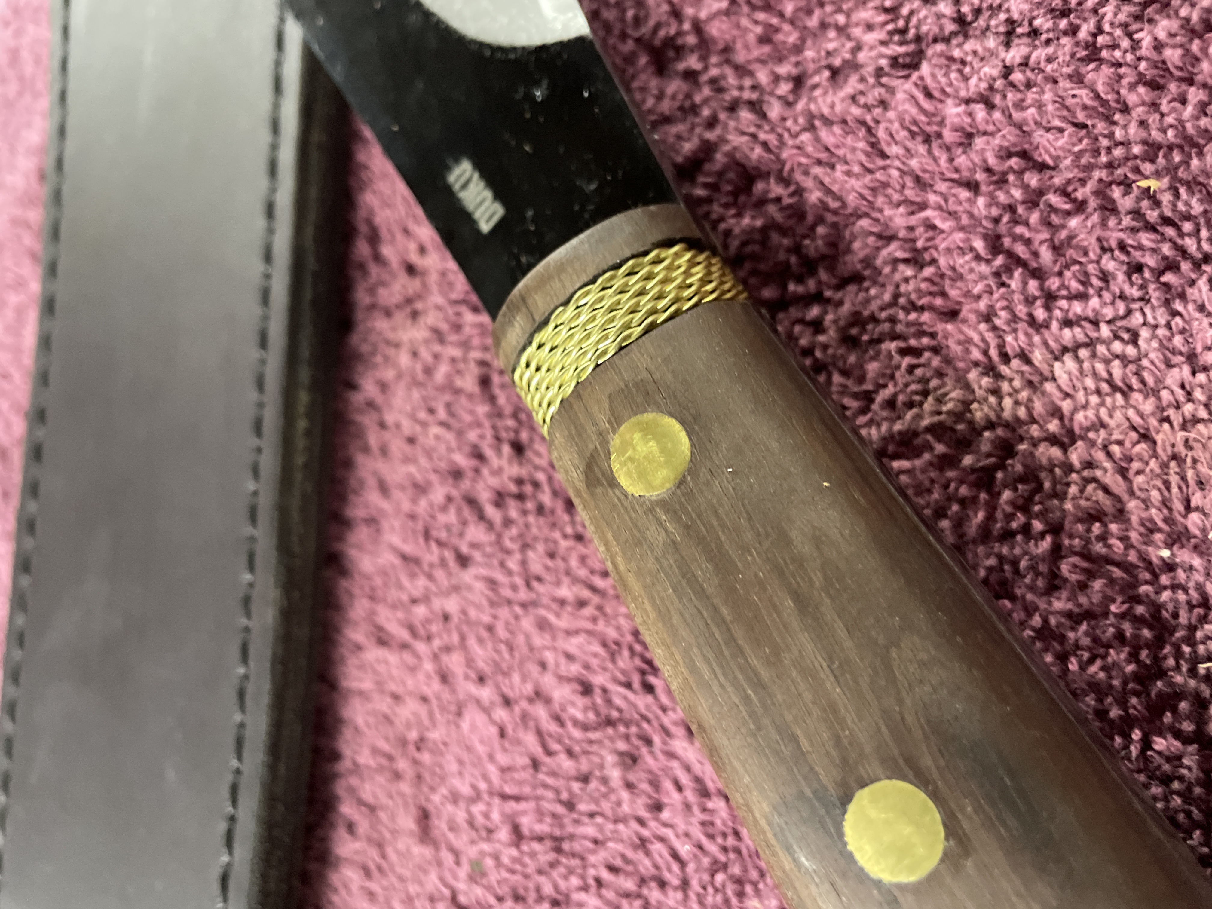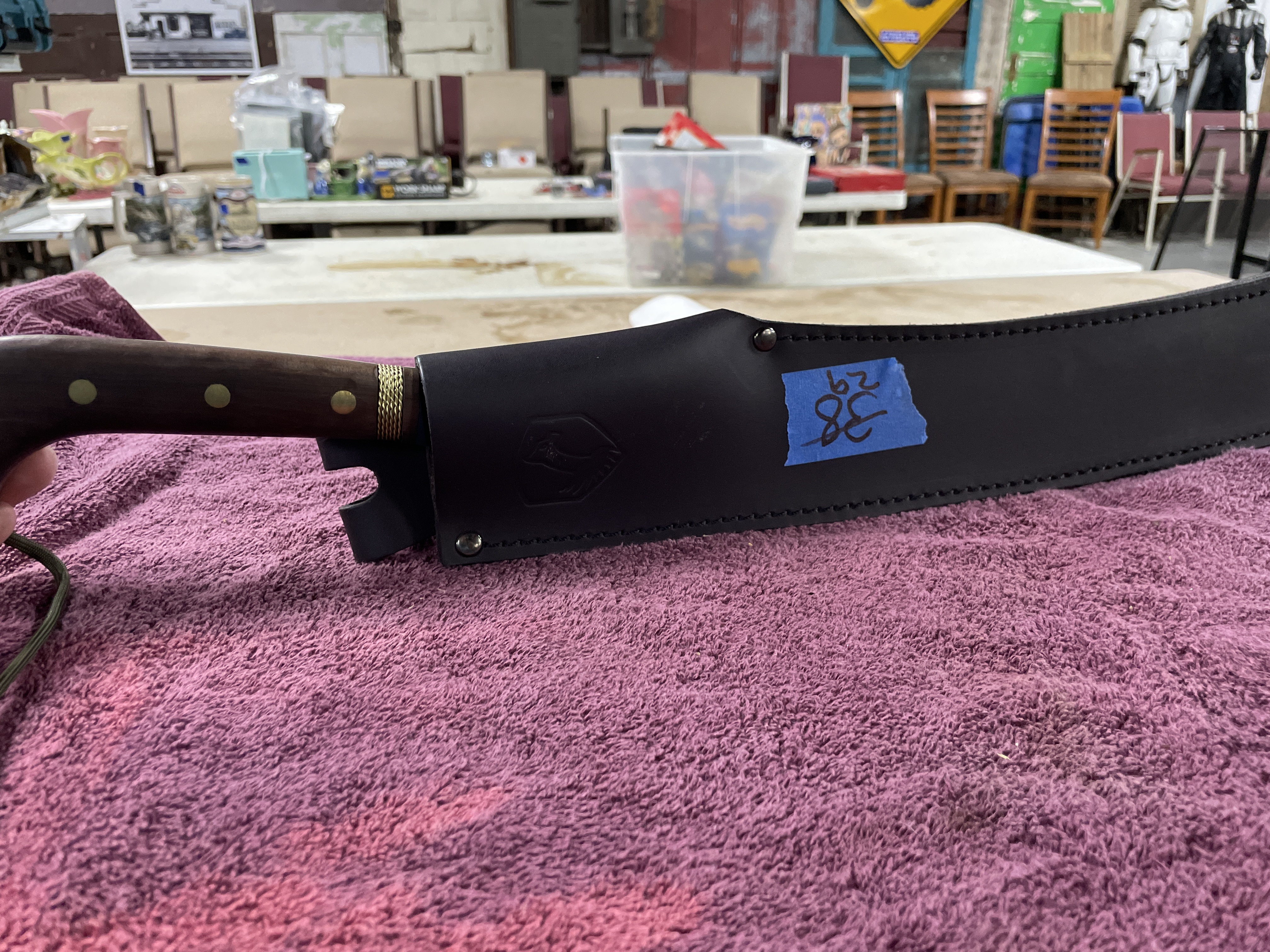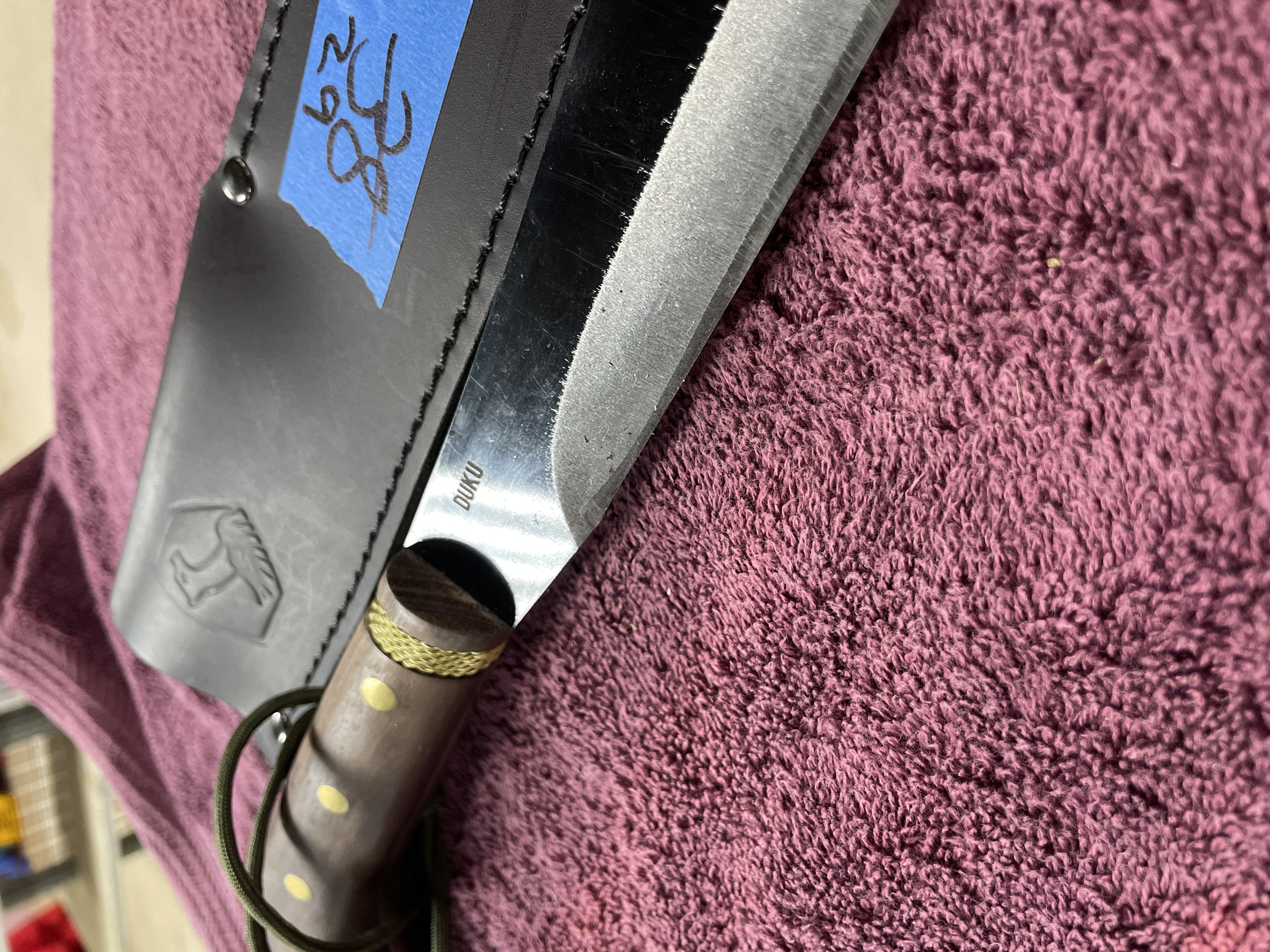 A two-piece set consisting of a large utility knife or short machete and its fitted sheath, attributed to Condor Tool & Knife based on visual evidence and market consensus. The knife features a long, straight-backed steel blade with a blackened finish on the upper portion and a polished cutting edge. The blade is marked DUKU near the ricasso. The handle is constructed of dark wooden scales secured by circular brass pins. A decorative twisted brass wire band is present near the bolster. The handle is finished with a green paracord lanyard loop. The accompanying fitted sheath is made of black leather or heavy synthetic material, secured by stitching and metal rivets. The sheath is embossed with a stylized animal head logo, consistent with the Condor brand mark. Visible embossed text on the sheath strap reads EL SALVADOR, supporting the identification with Condor’s product lines.