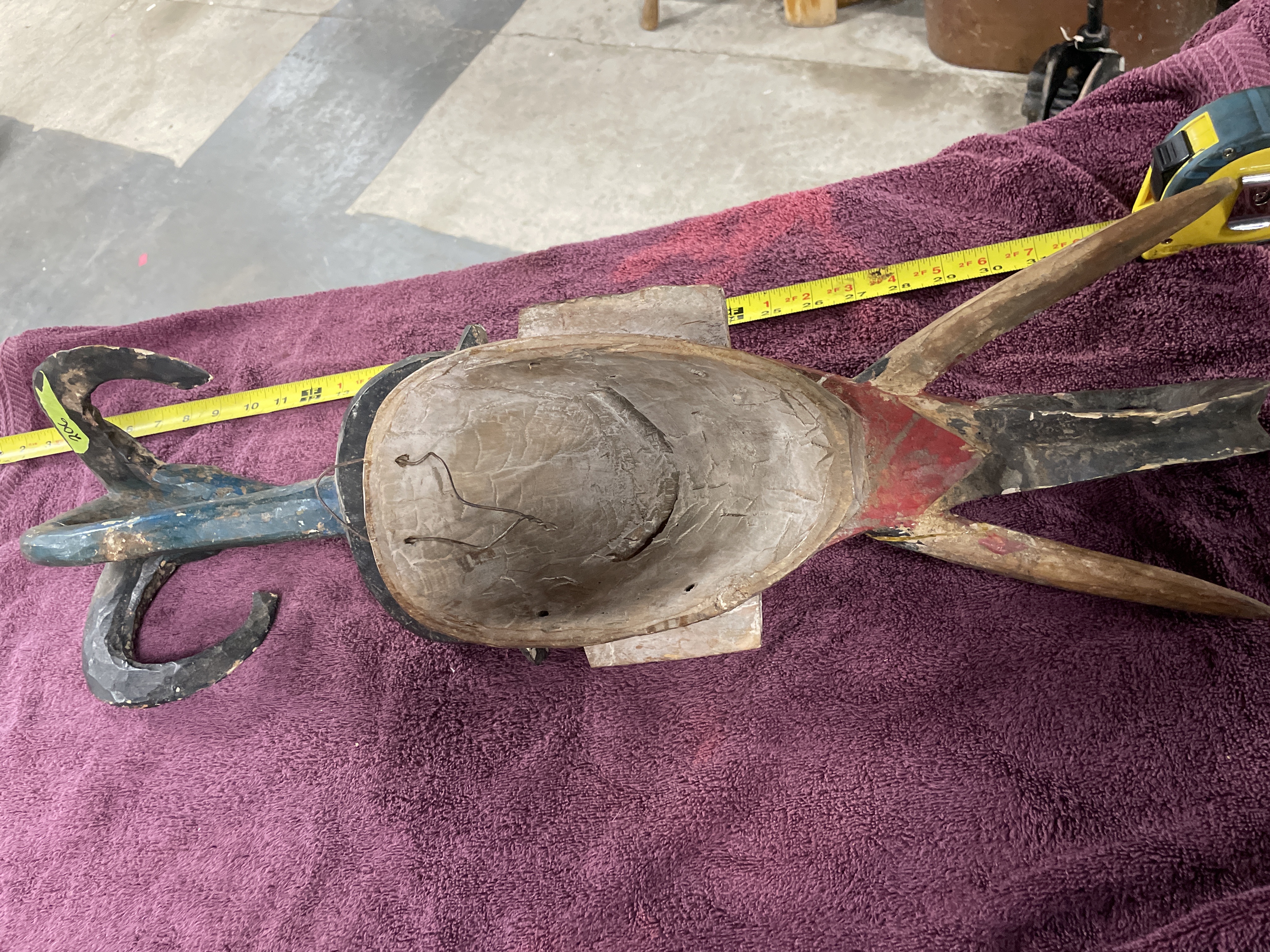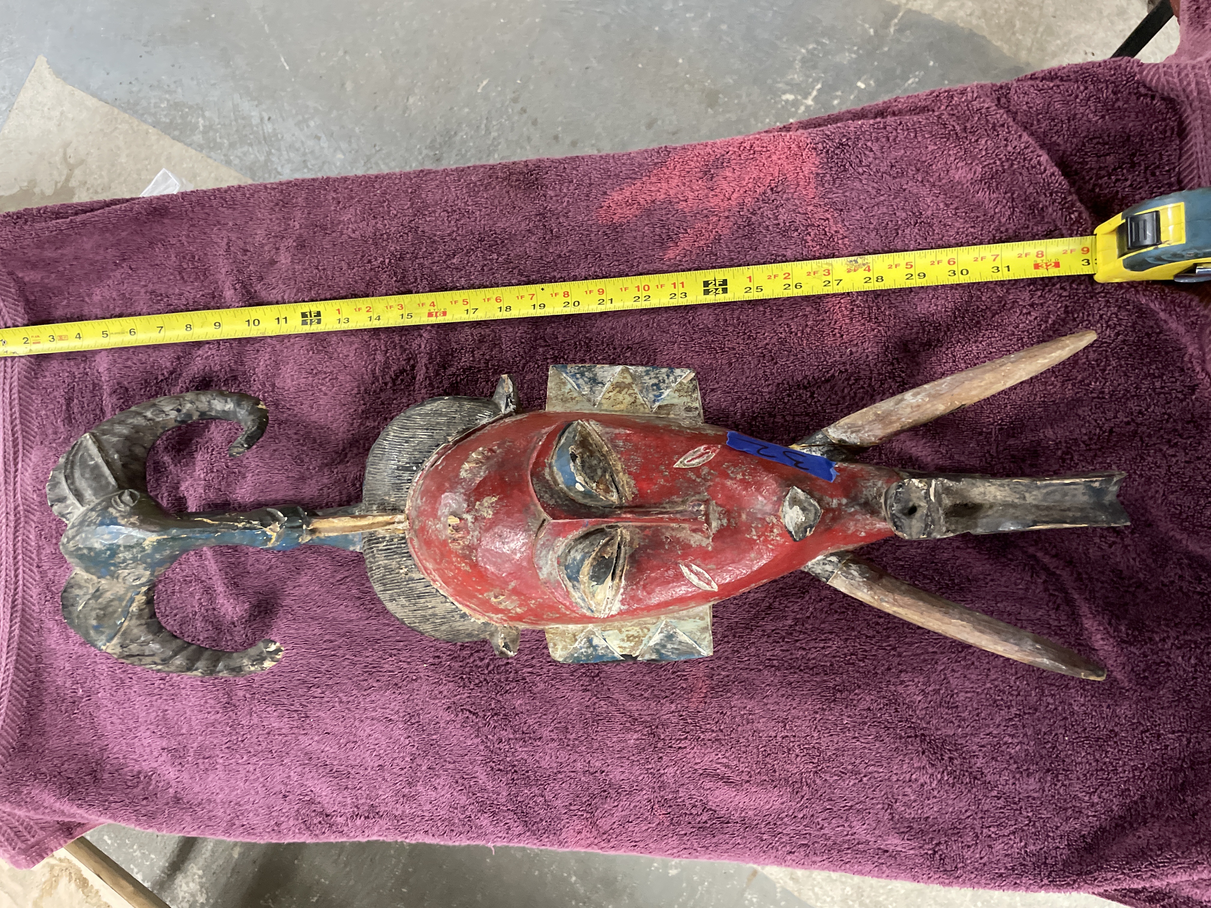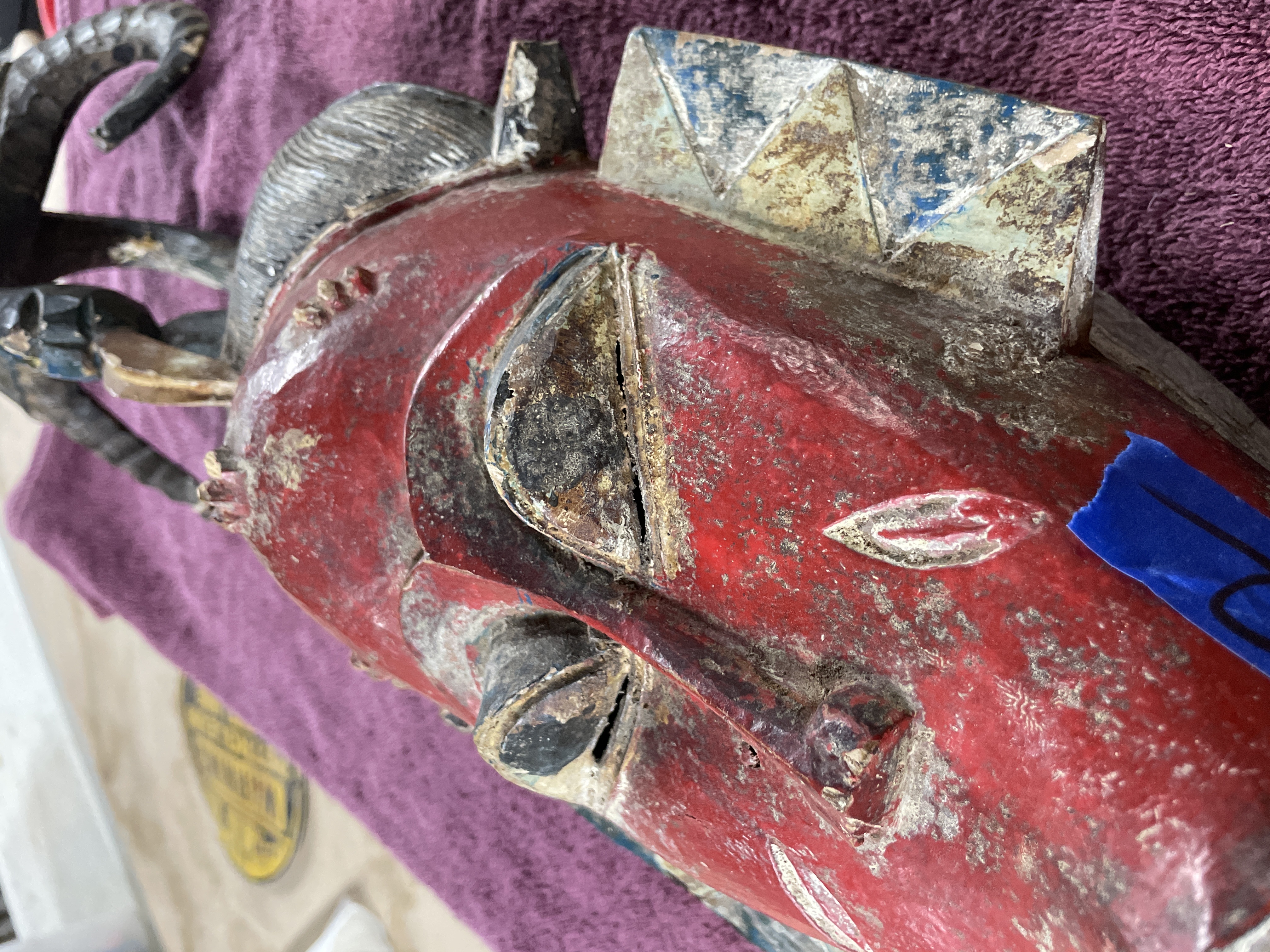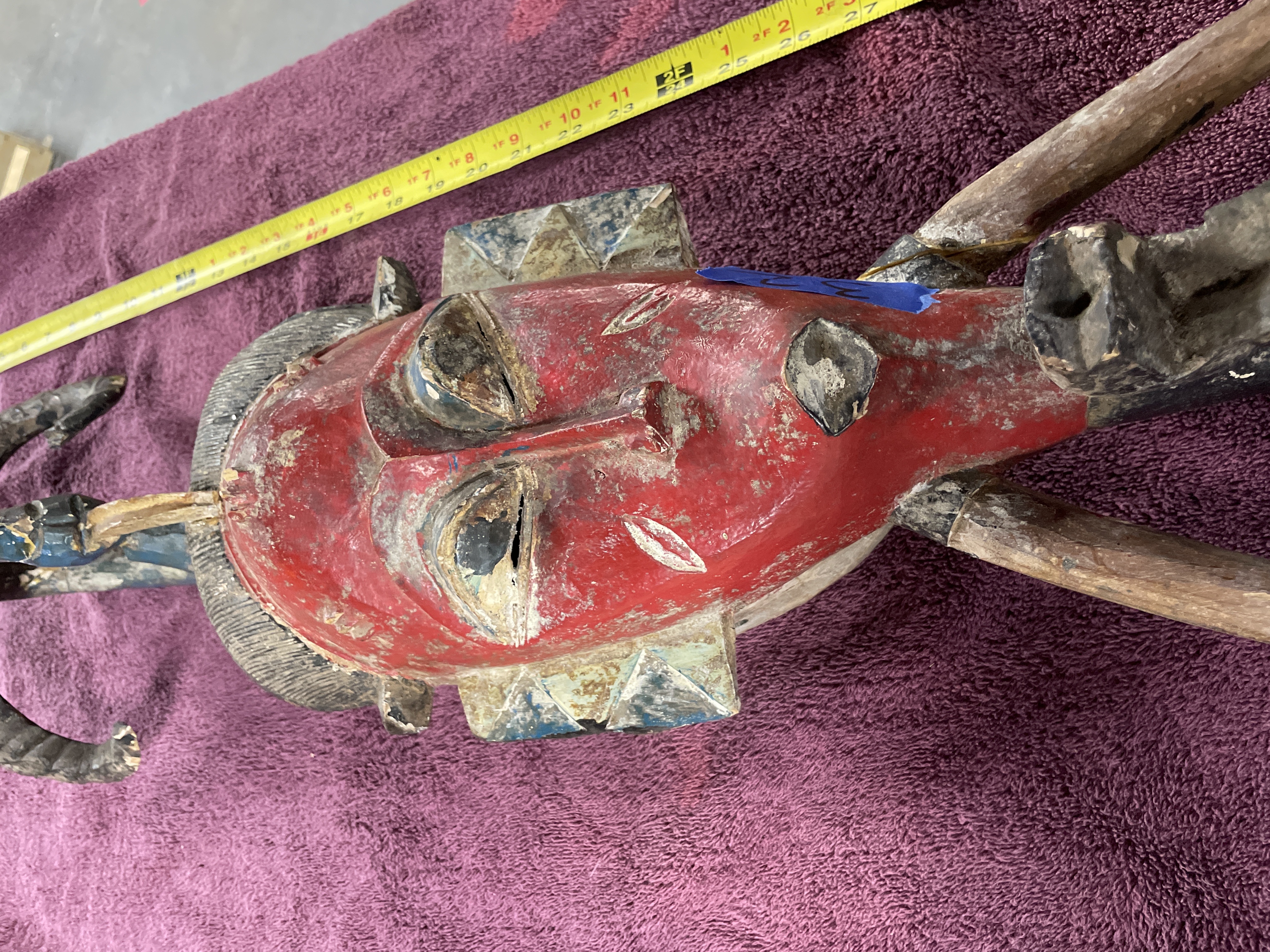 Hand-carved wooden tribal mask or headdress, likely West African (Guro or Baule style), featuring an elongated face set above a long neck and two projecting limbs. The mask is decorated with polychrome pigments in red, dark blue, black, and white. The face is predominantly red with stylized features, including narrow eyes and a pronounced nose. The mask is surmounted by a tall finial with curved projections or horns painted dark blue and black. The reverse of the mask shows deep carving marks and includes a thin wire secured through drilled holes, likely for display or attachment.