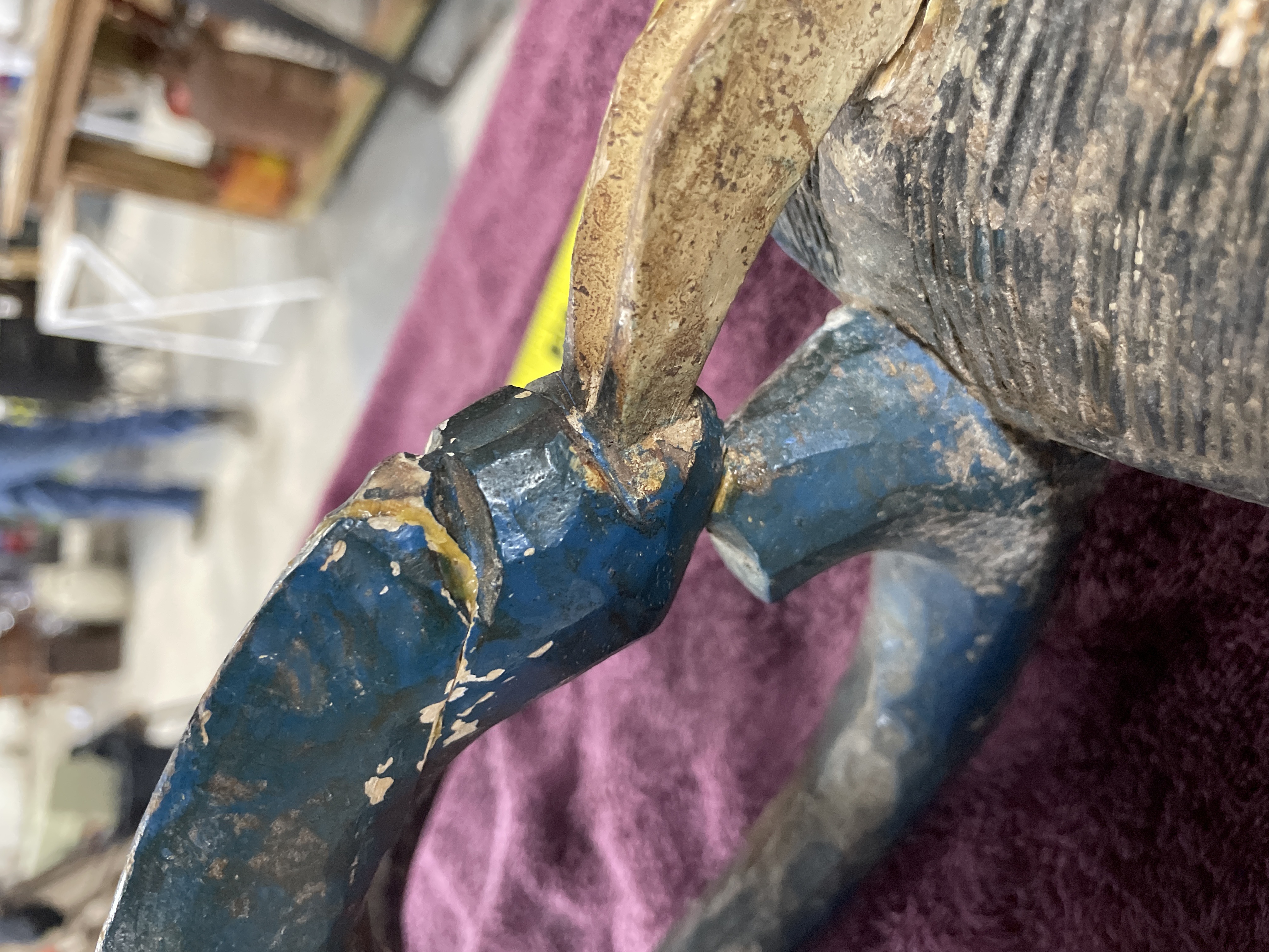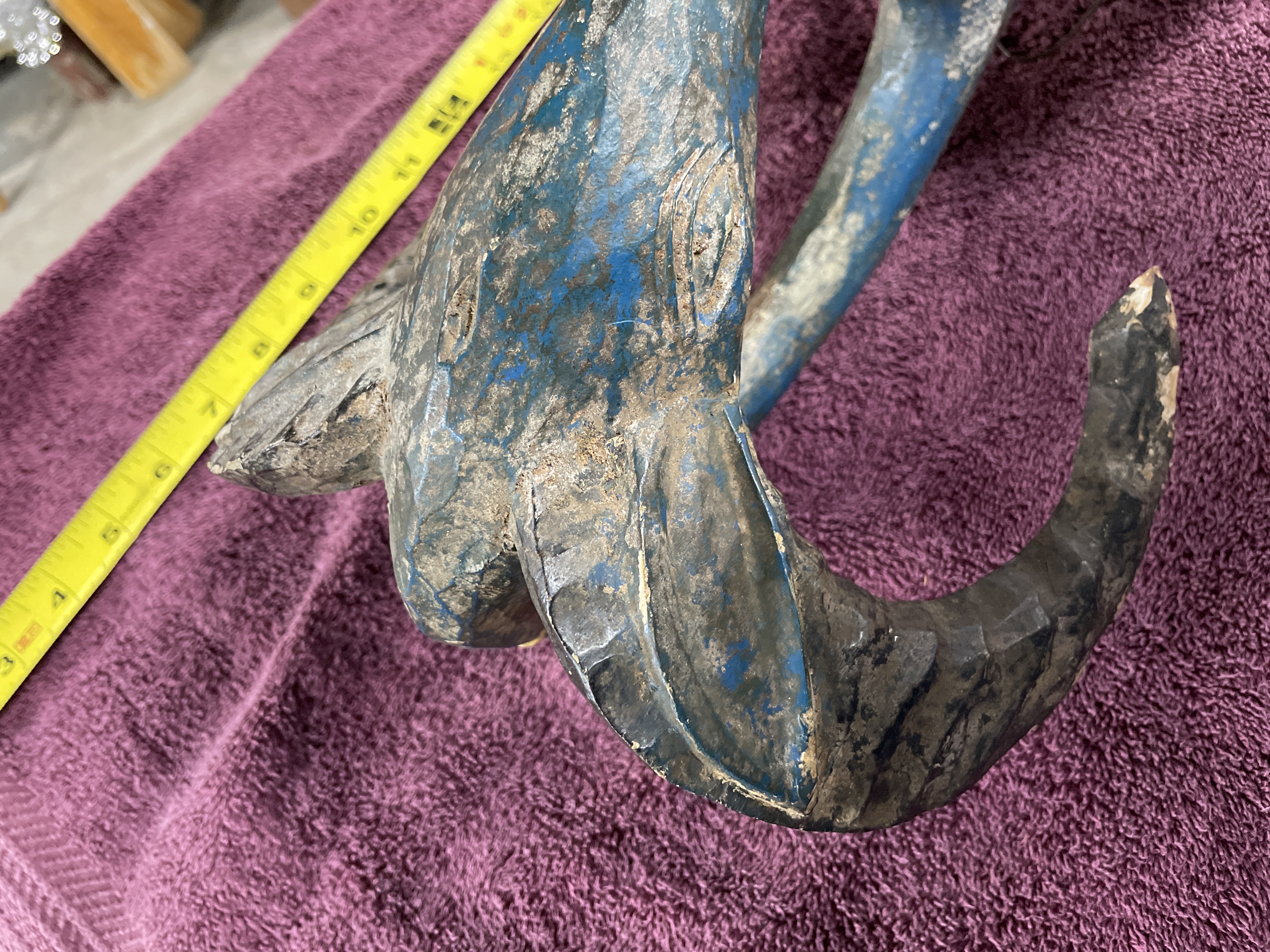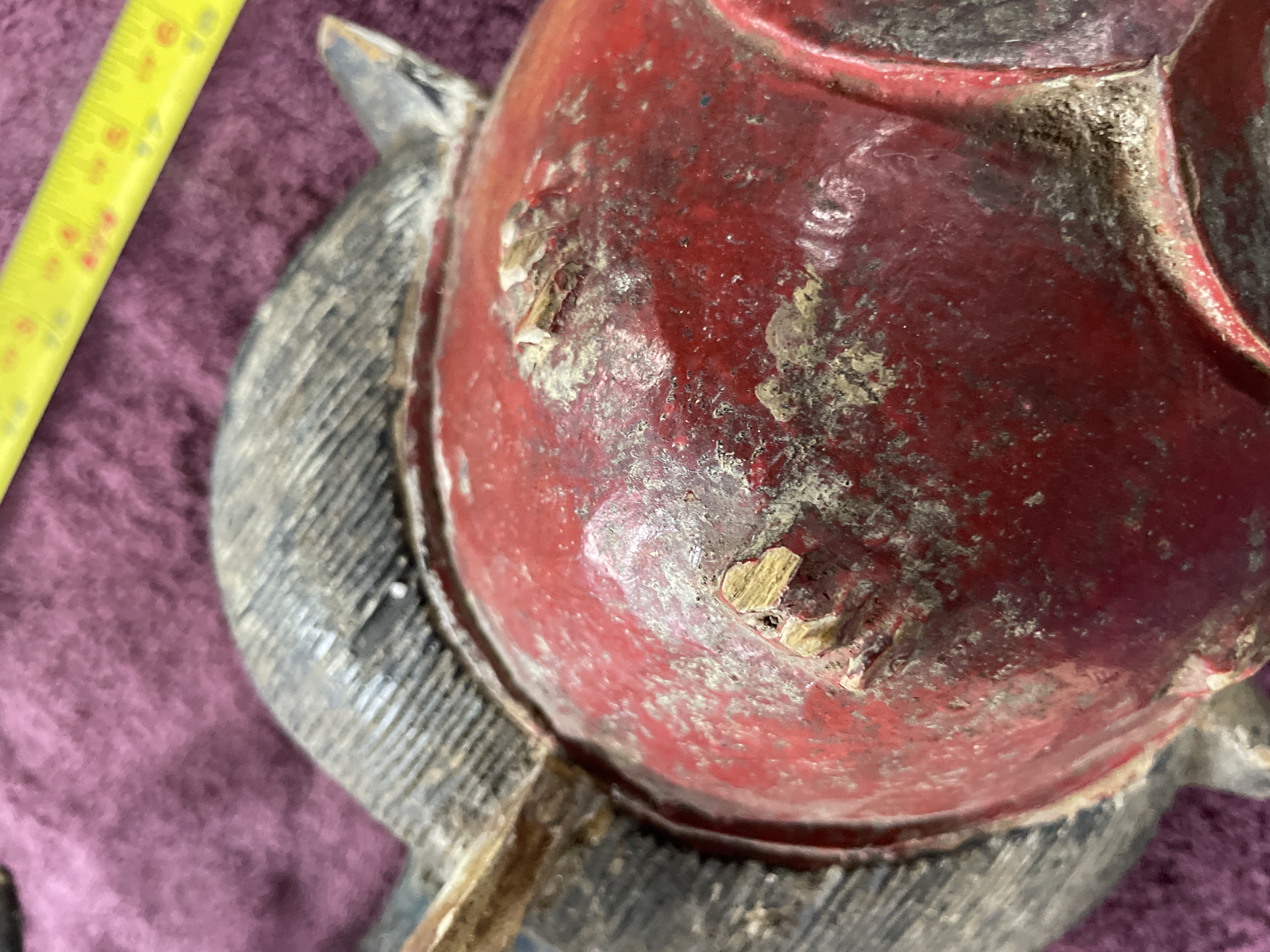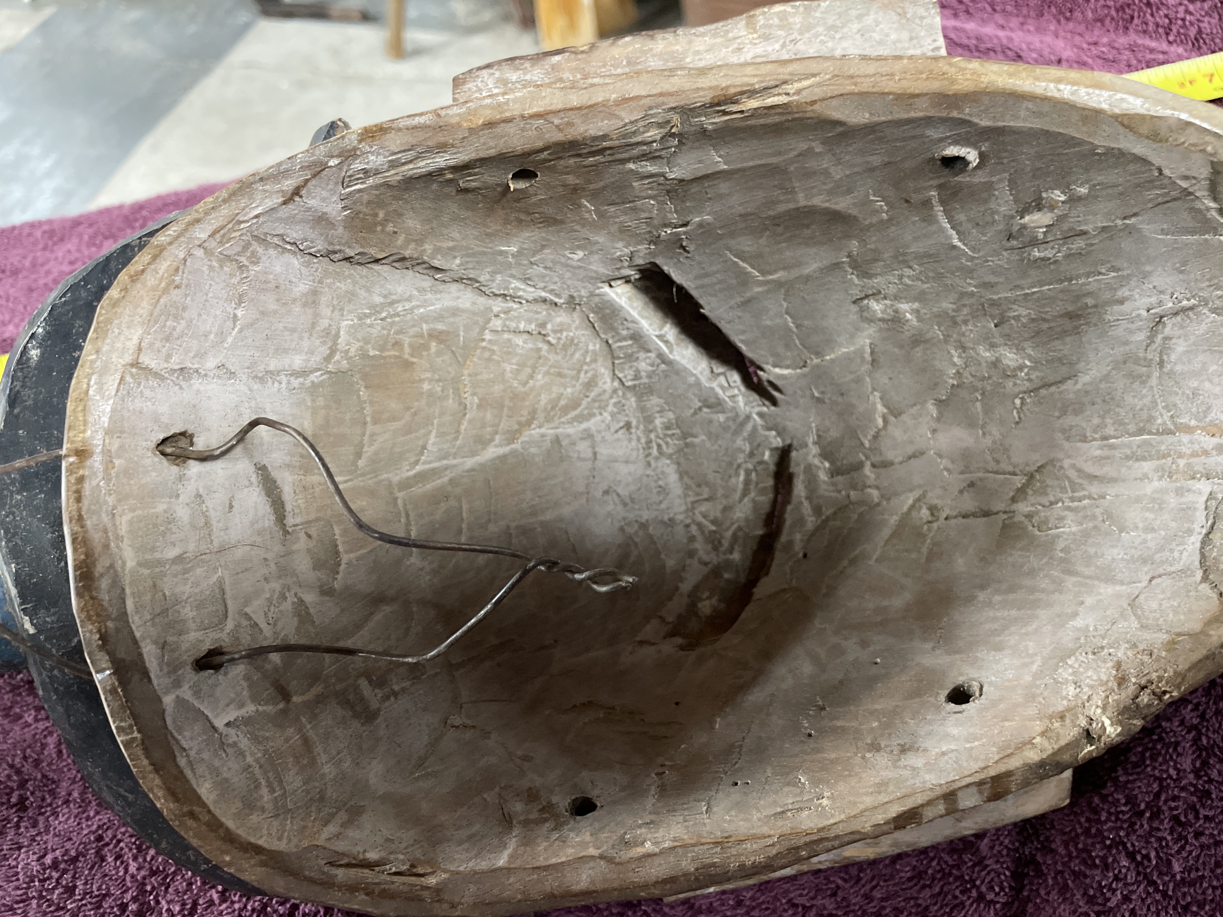 Hand-carved wooden tribal mask or headdress, likely West African (Guro or Baule style), featuring an elongated face set above a long neck and two projecting limbs. The mask is decorated with polychrome pigments in red, dark blue, black, and white. The face is predominantly red with stylized features, including narrow eyes and a pronounced nose. The mask is surmounted by a tall finial with curved projections or horns painted dark blue and black. The reverse of the mask shows deep carving marks and includes a thin wire secured through drilled holes, likely for display or attachment.