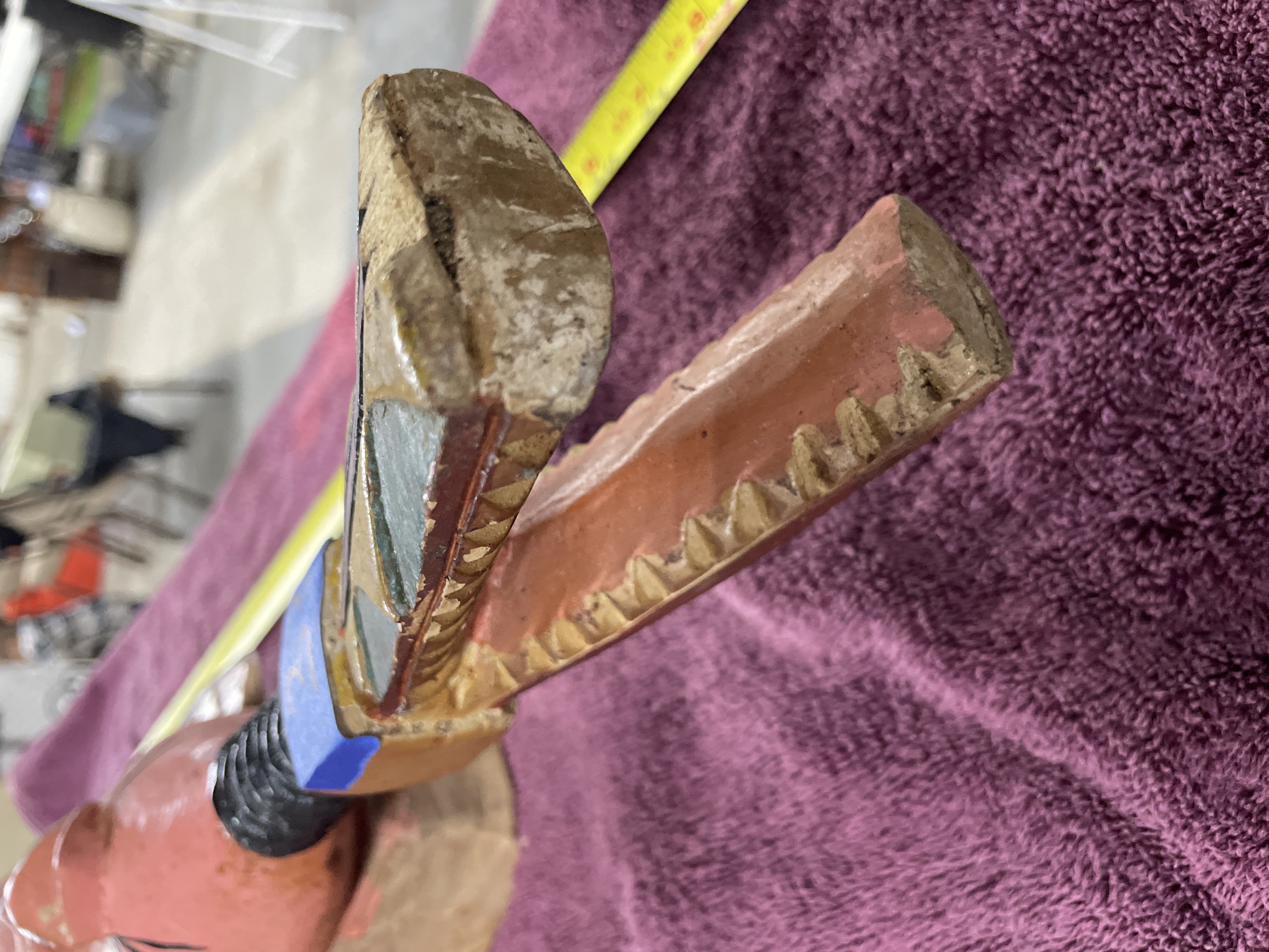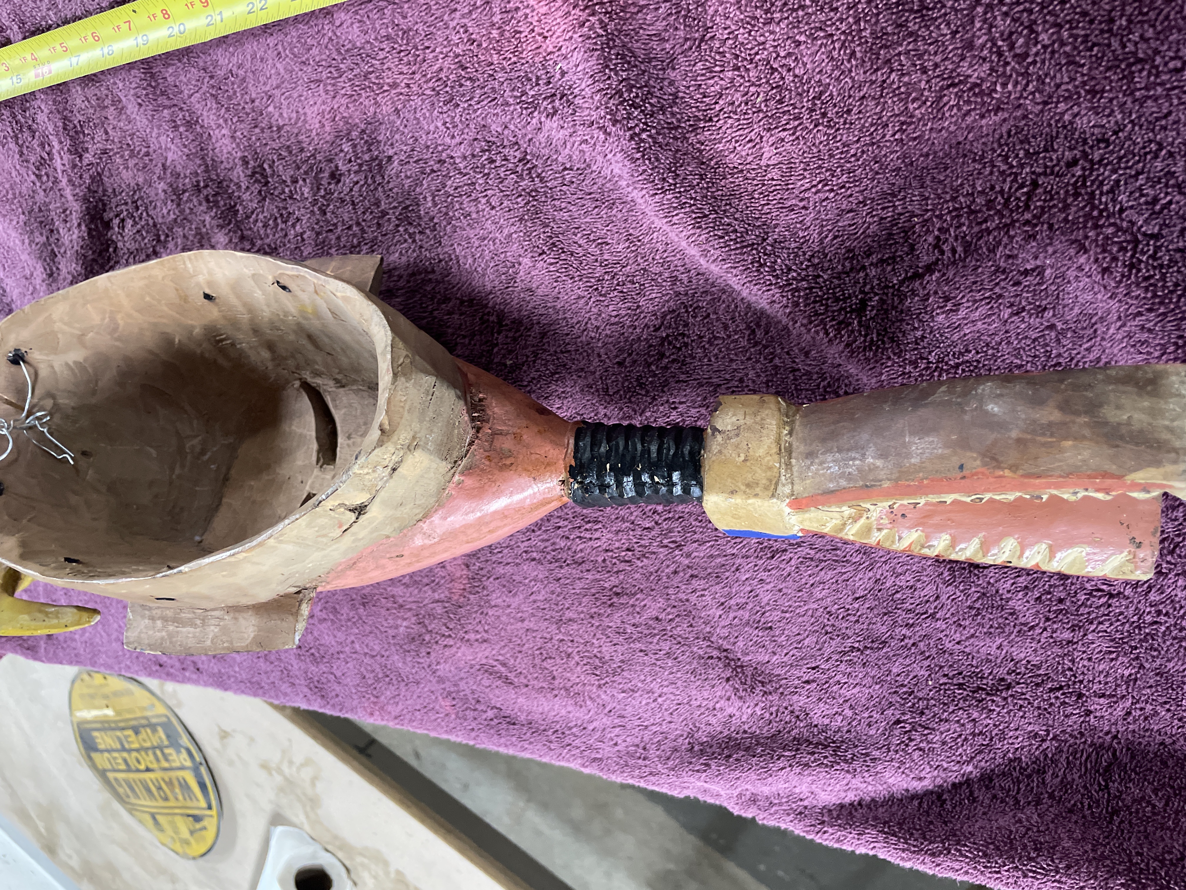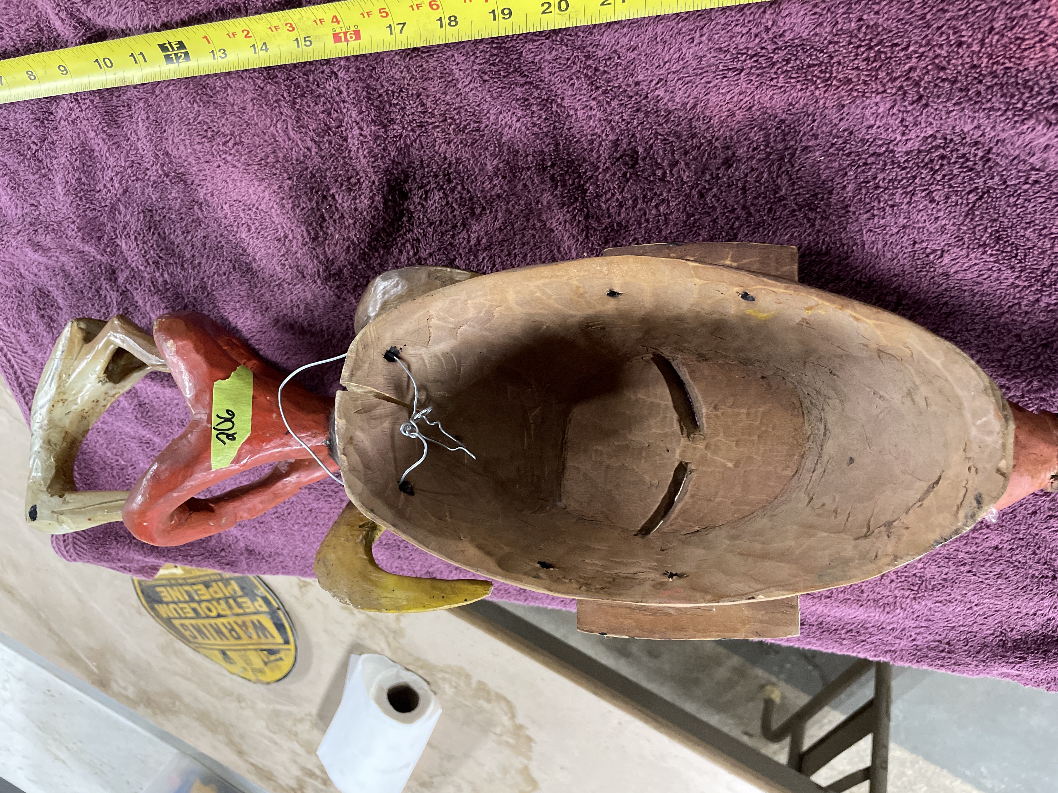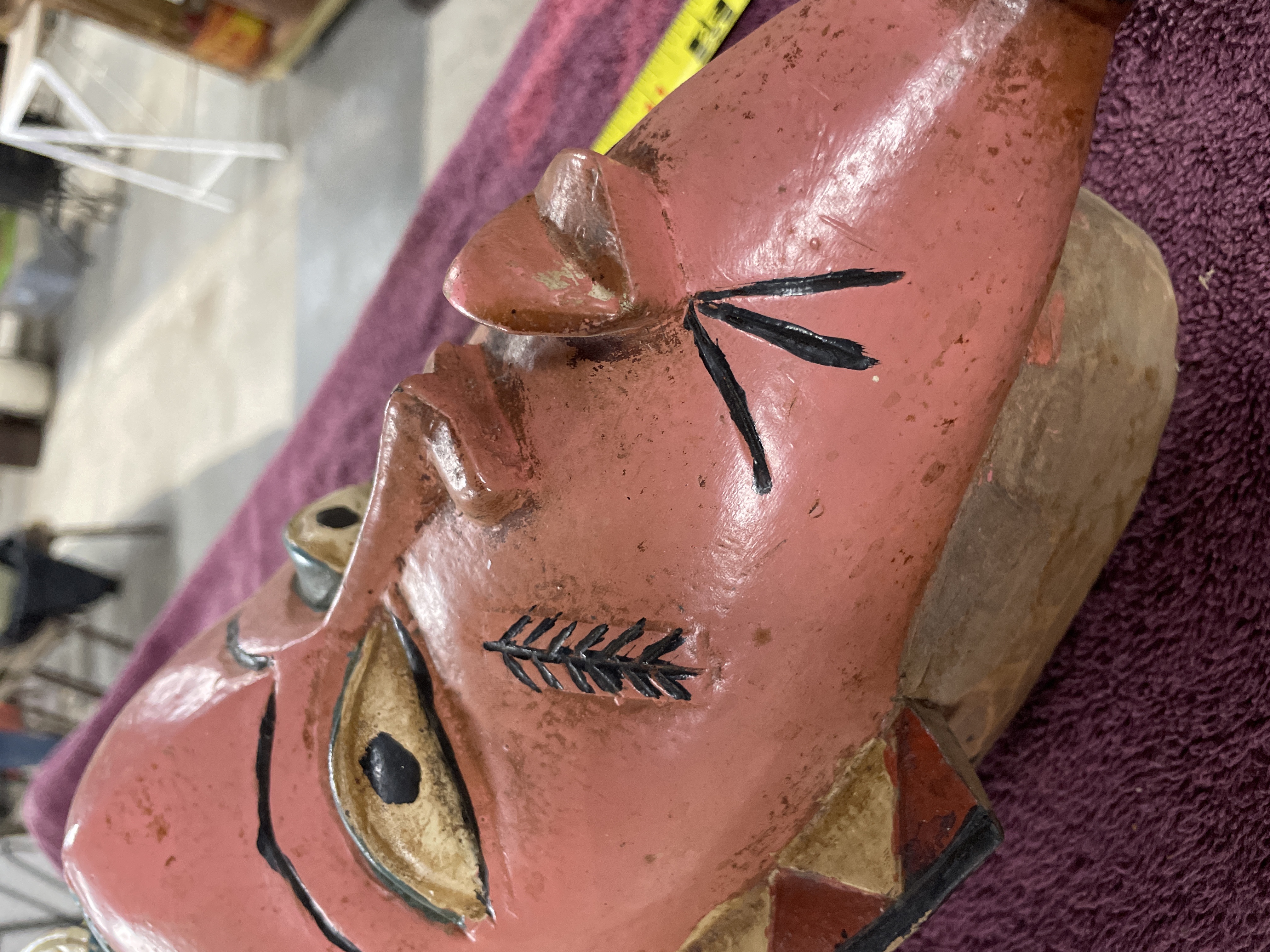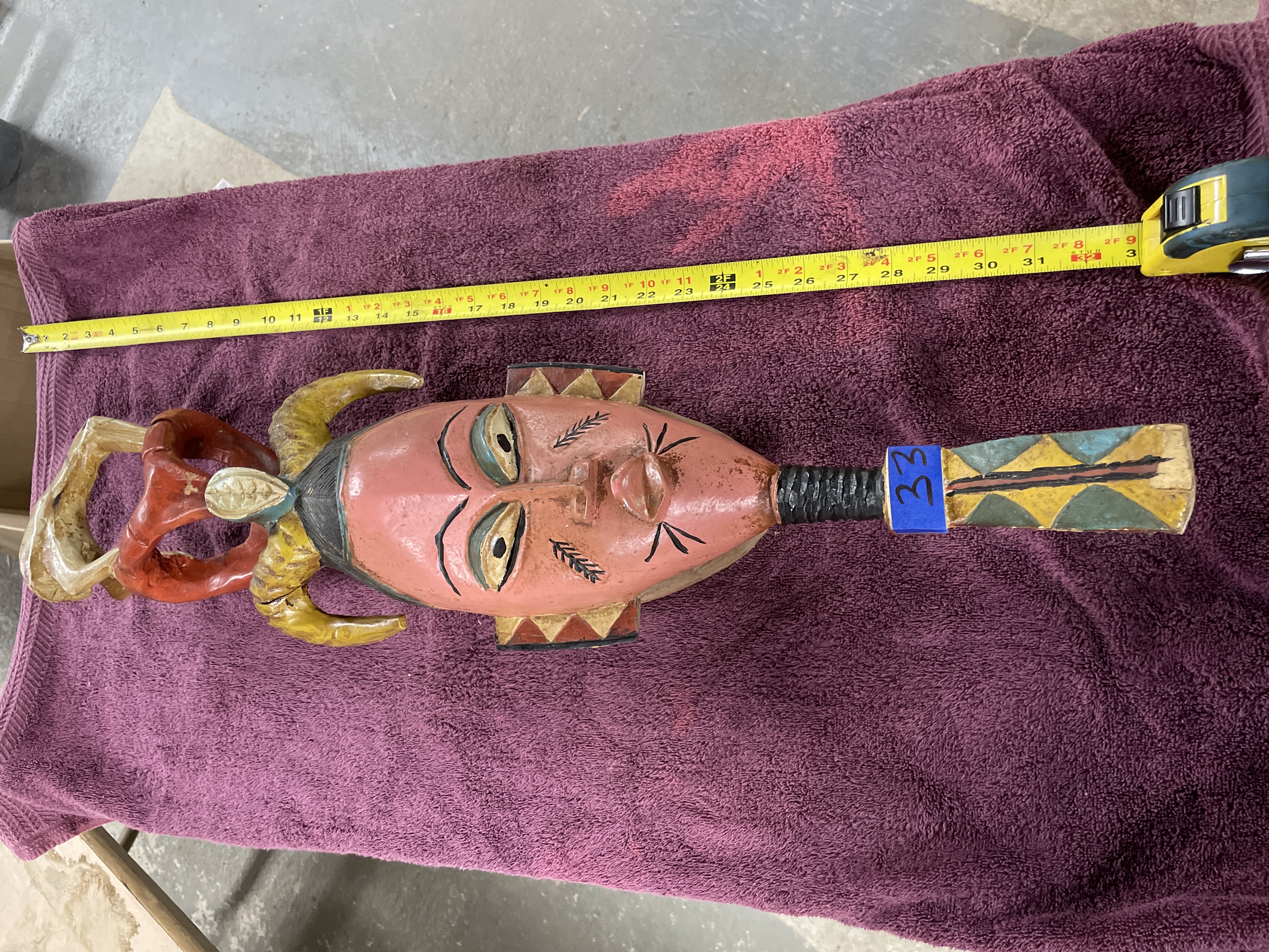 A single, hand-carved wooden mask or decorative figure, styled in the manner of African tribal art, exhibiting an elongated form and polychrome decoration. The piece is evocative of the Ciwara Antelope Headdress style. The face is painted in a reddish-pink hue with black painted eyes and scarification marks. It is topped by an elaborate headdress incorporating yellow horns and an abstract looped figure painted red and tan. A ribbed black neck connects the face to a long, tapered base decorated with geometric patterns in blue, yellow, green, and black, terminating in a stylized open jaw structure with carved zigzag teeth. The object features several inventory markings, including the hand-painted number "33" on a blue block on the base and a red sticker reading "206" on the reverse of the headdress.