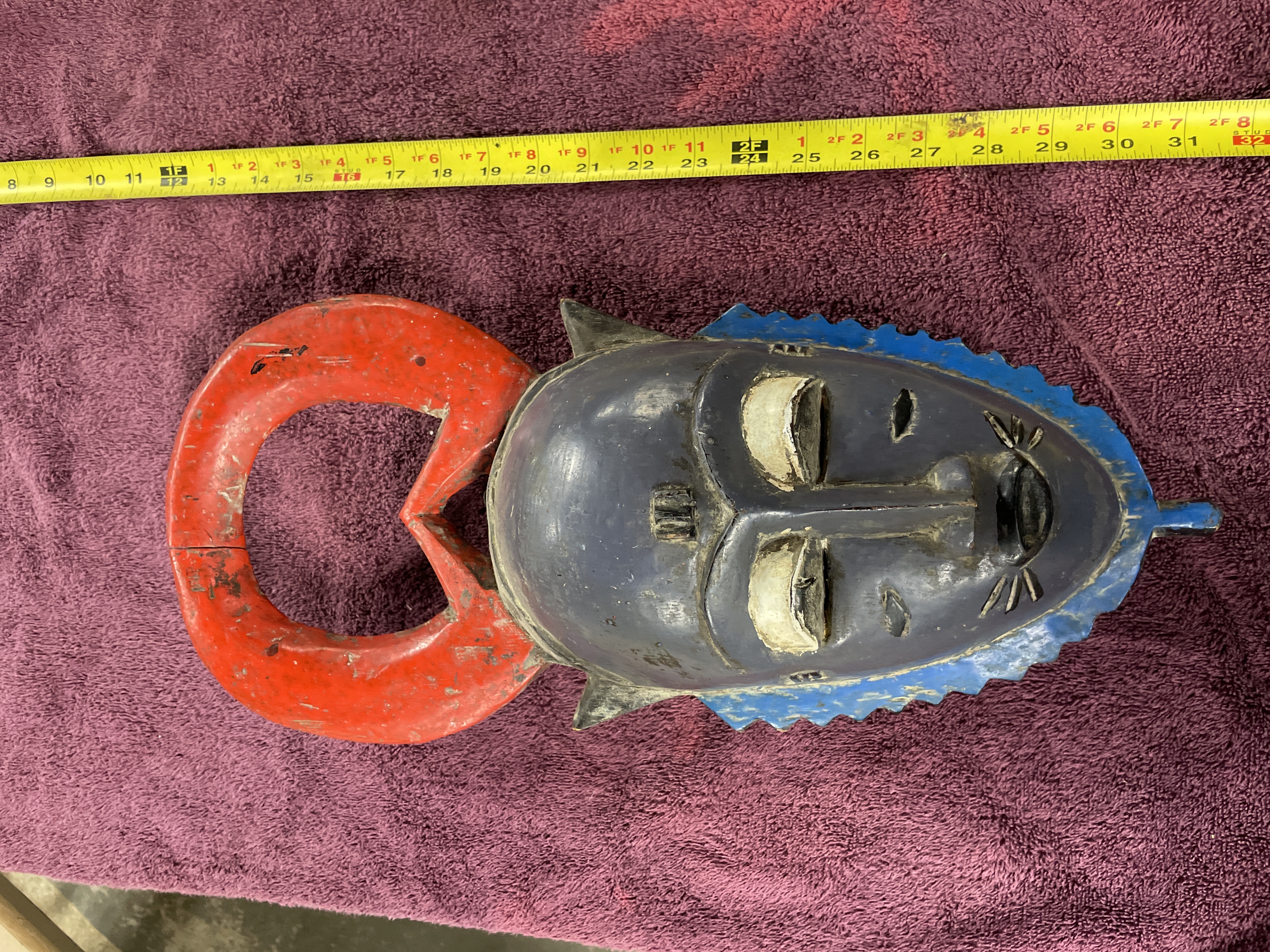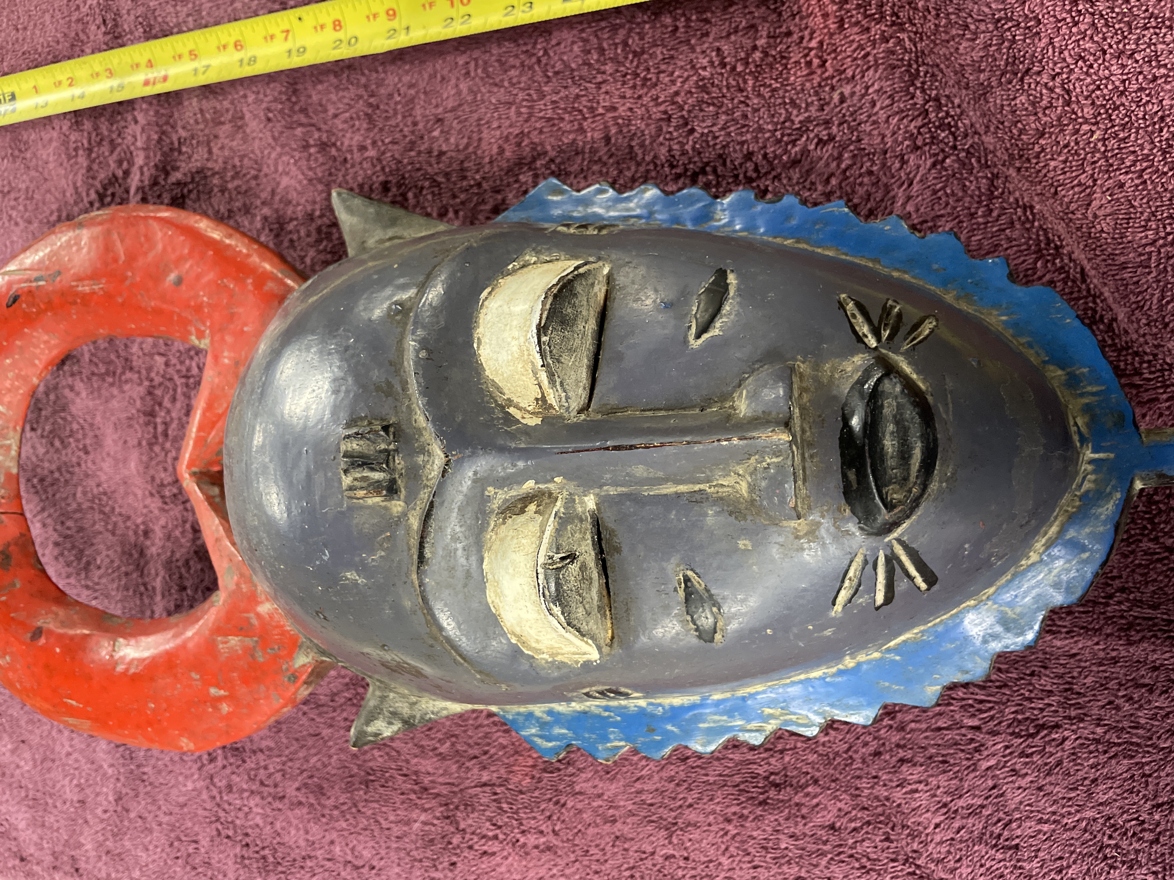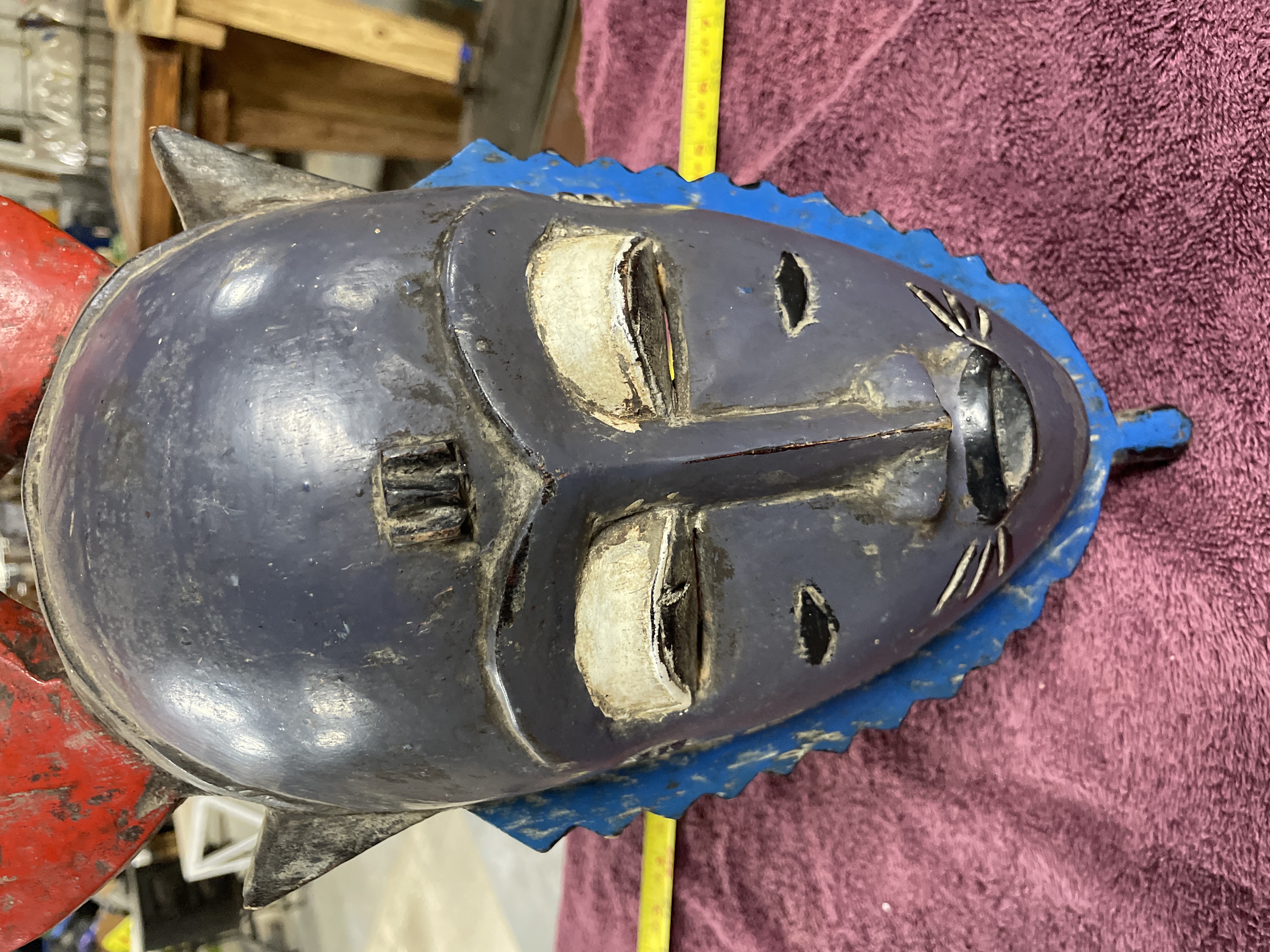 A single, hand-carved wooden ceremonial mask in the African tribal style, featuring an elongated face painted dark slate gray/blue. The mask exhibits pronounced, heavy-lidded eyes painted white, detailed facial markings suggesting whiskers or scars, and a bright blue scalloped border surrounding the face. Extending vertically above the head is a substantial, semi-circular crest or headdress element painted bright red. The interior of the mask cavity shows heavy tooling marks and contains a small remnant of blue fabric or paper adhered to the wood. Markings include a handwritten number 206 on a yellow sticker adhered to the top crest.