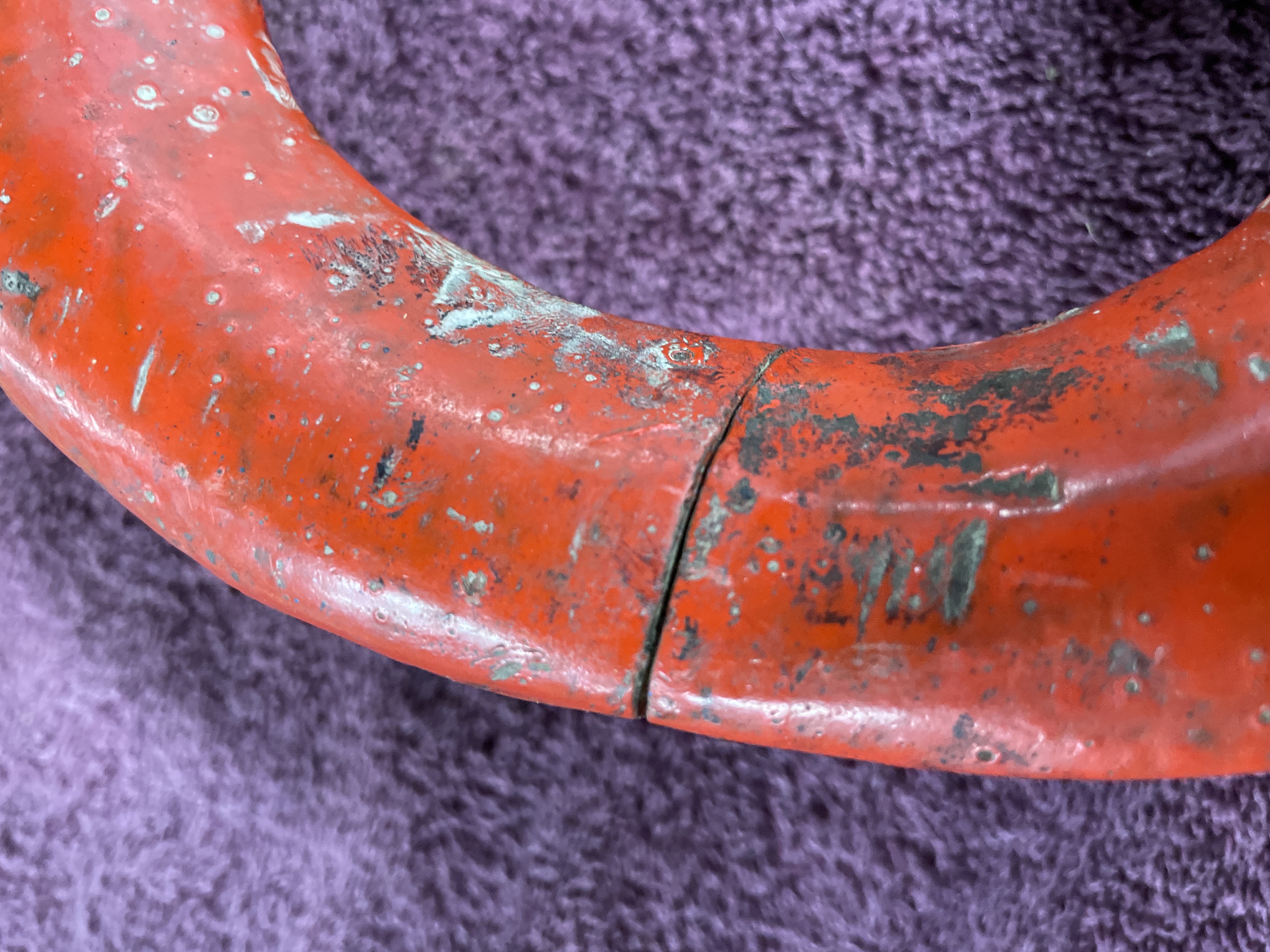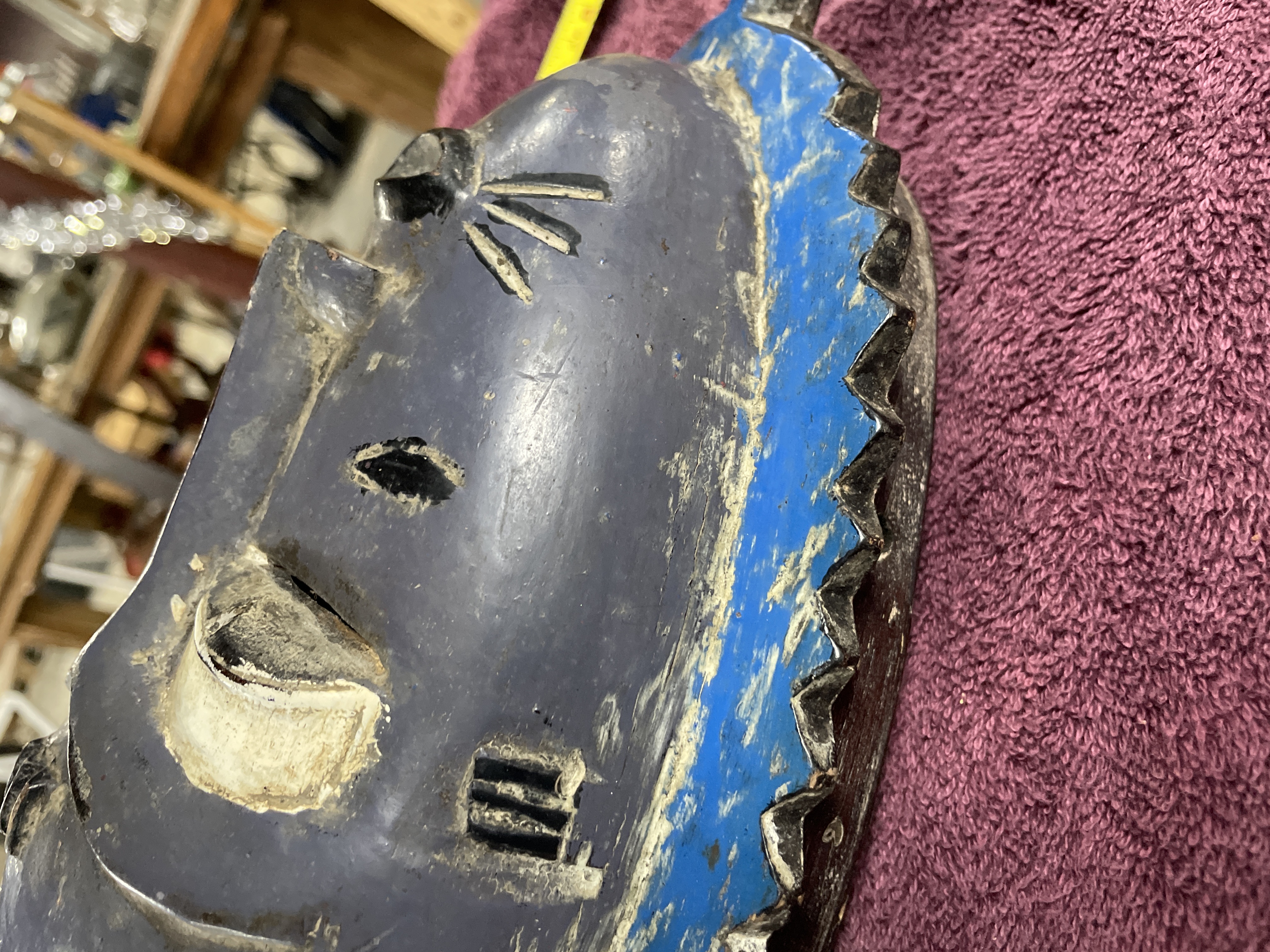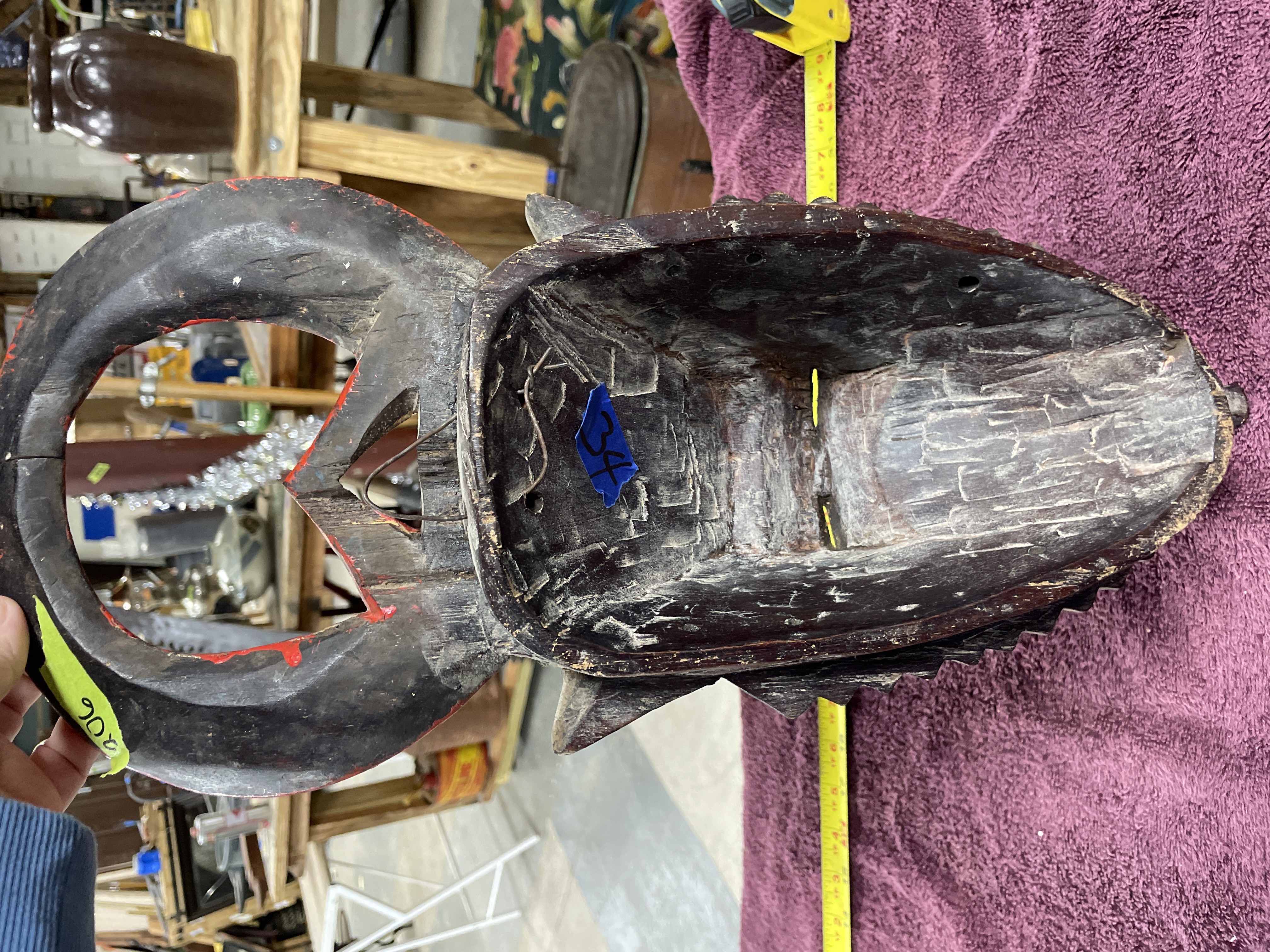 A single, hand-carved wooden ceremonial mask in the African tribal style, featuring an elongated face painted dark slate gray/blue. The mask exhibits pronounced, heavy-lidded eyes painted white, detailed facial markings suggesting whiskers or scars, and a bright blue scalloped border surrounding the face. Extending vertically above the head is a substantial, semi-circular crest or headdress element painted bright red. The interior of the mask cavity shows heavy tooling marks and contains a small remnant of blue fabric or paper adhered to the wood. Markings include a handwritten number 206 on a yellow sticker adhered to the top crest.