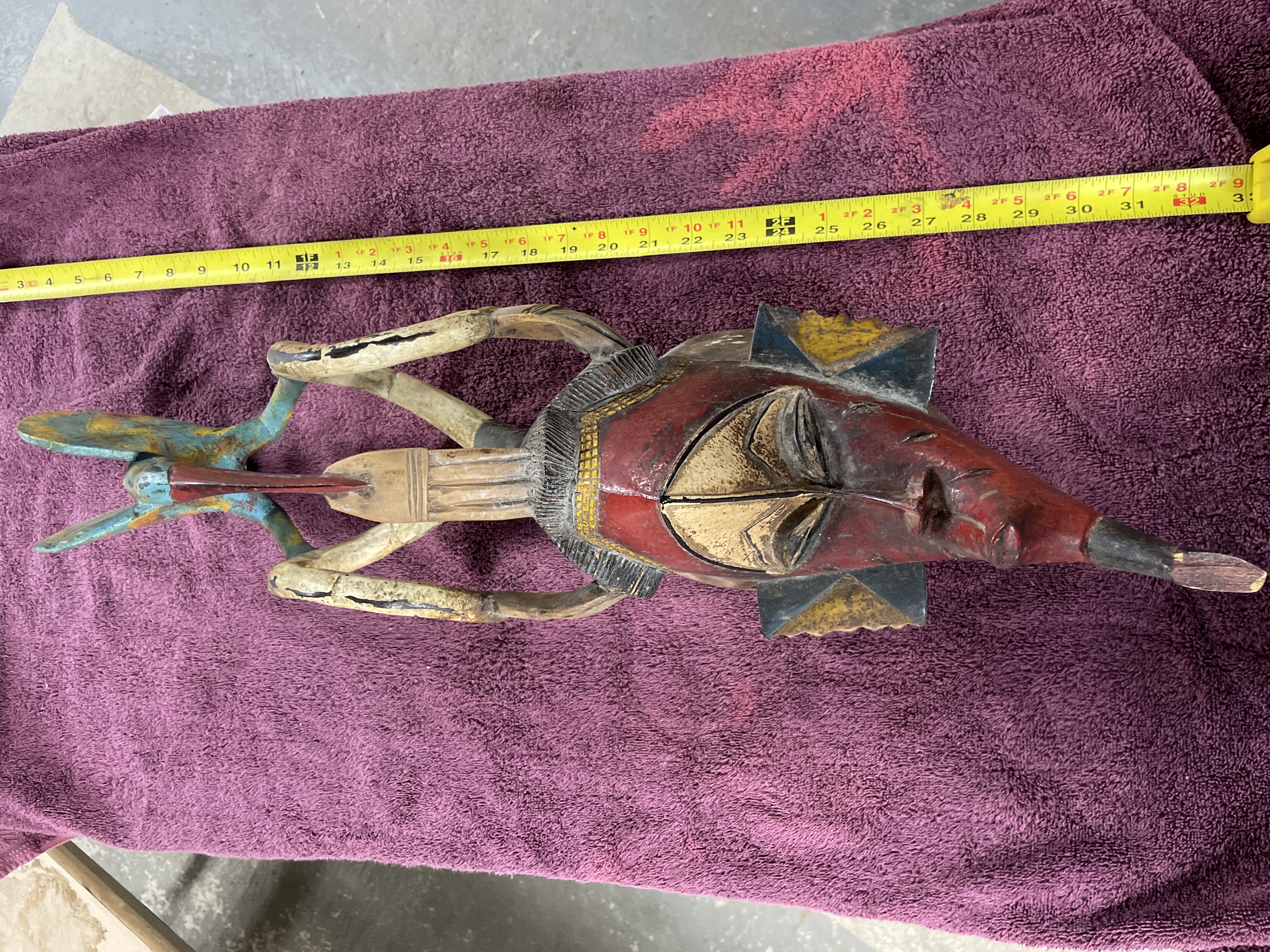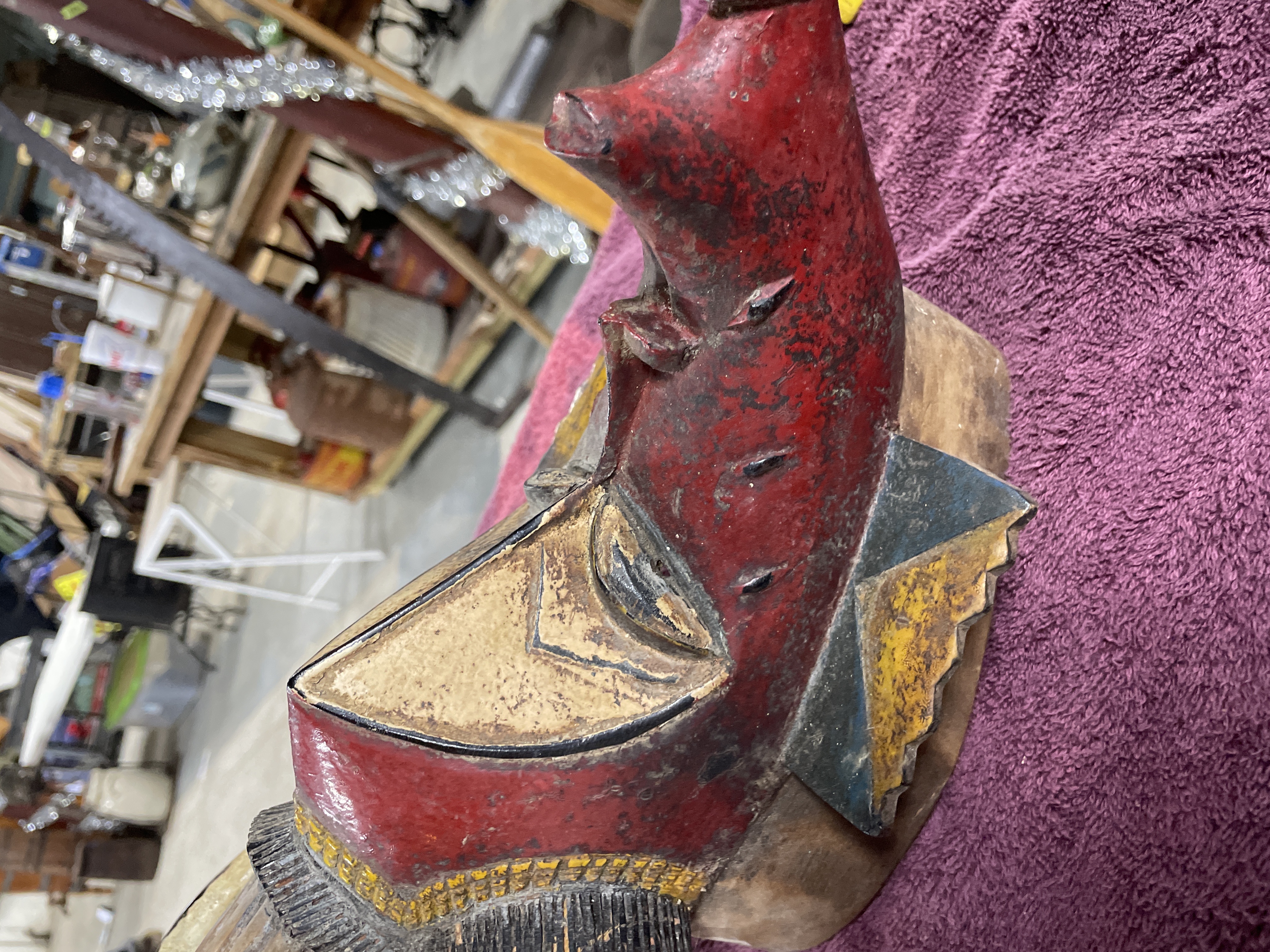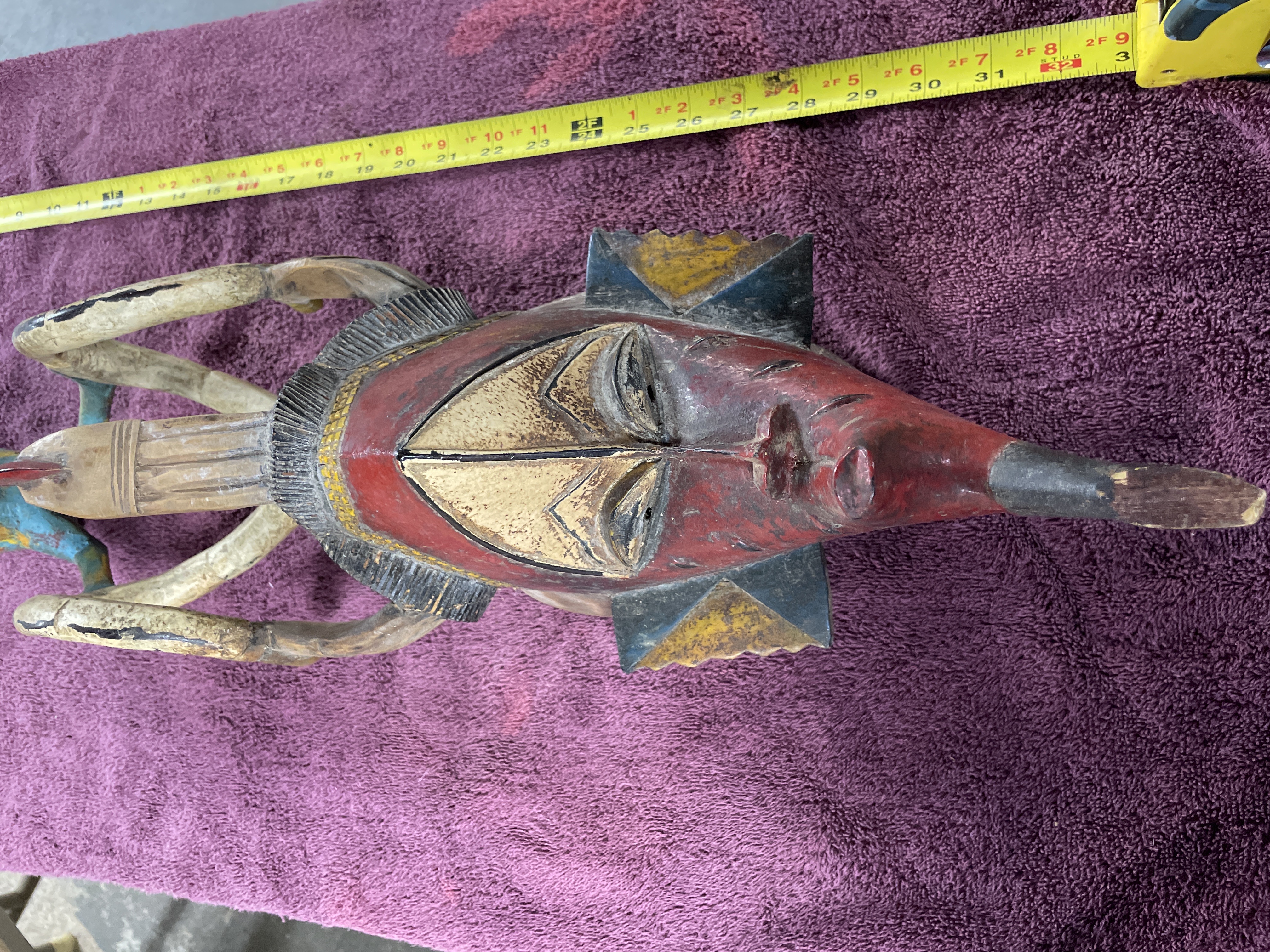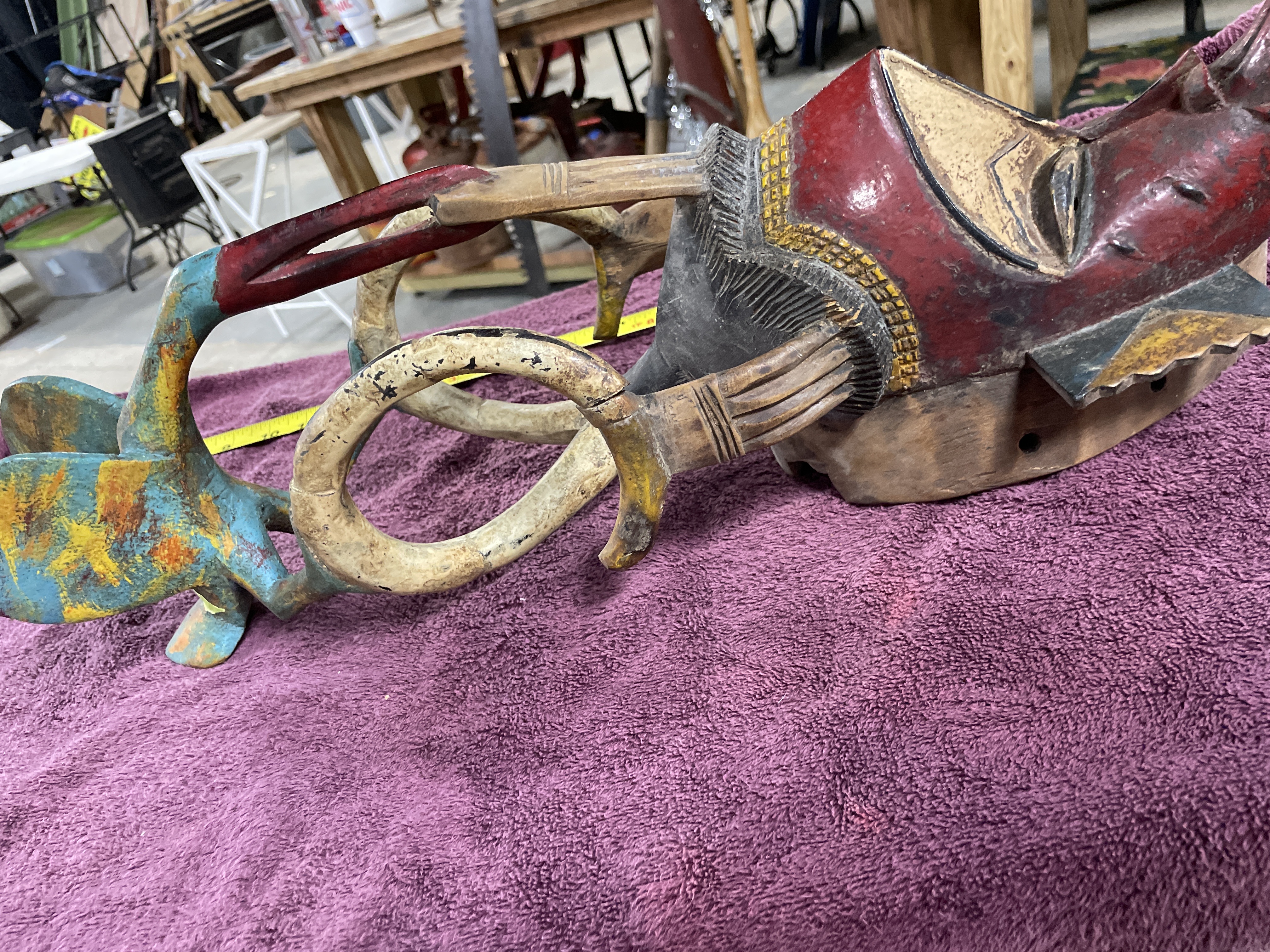 A single composite carved wood mask or headdress executed in a tribal or ethnic style. The artifact features an elongated facial element painted predominantly in red and accented with geometric shapes in black, yellow/gold, and blue. The face includes a projecting snout. A superstructure extends above the mask, composed of curved, stylized limbs supporting a separate, smaller bird-like figure. The bird figure is finished in a distressed polychrome palette of blue, turquoise, yellow, and orange. The interior of the mask is hollowed, and a wire hanger is affixed for display.