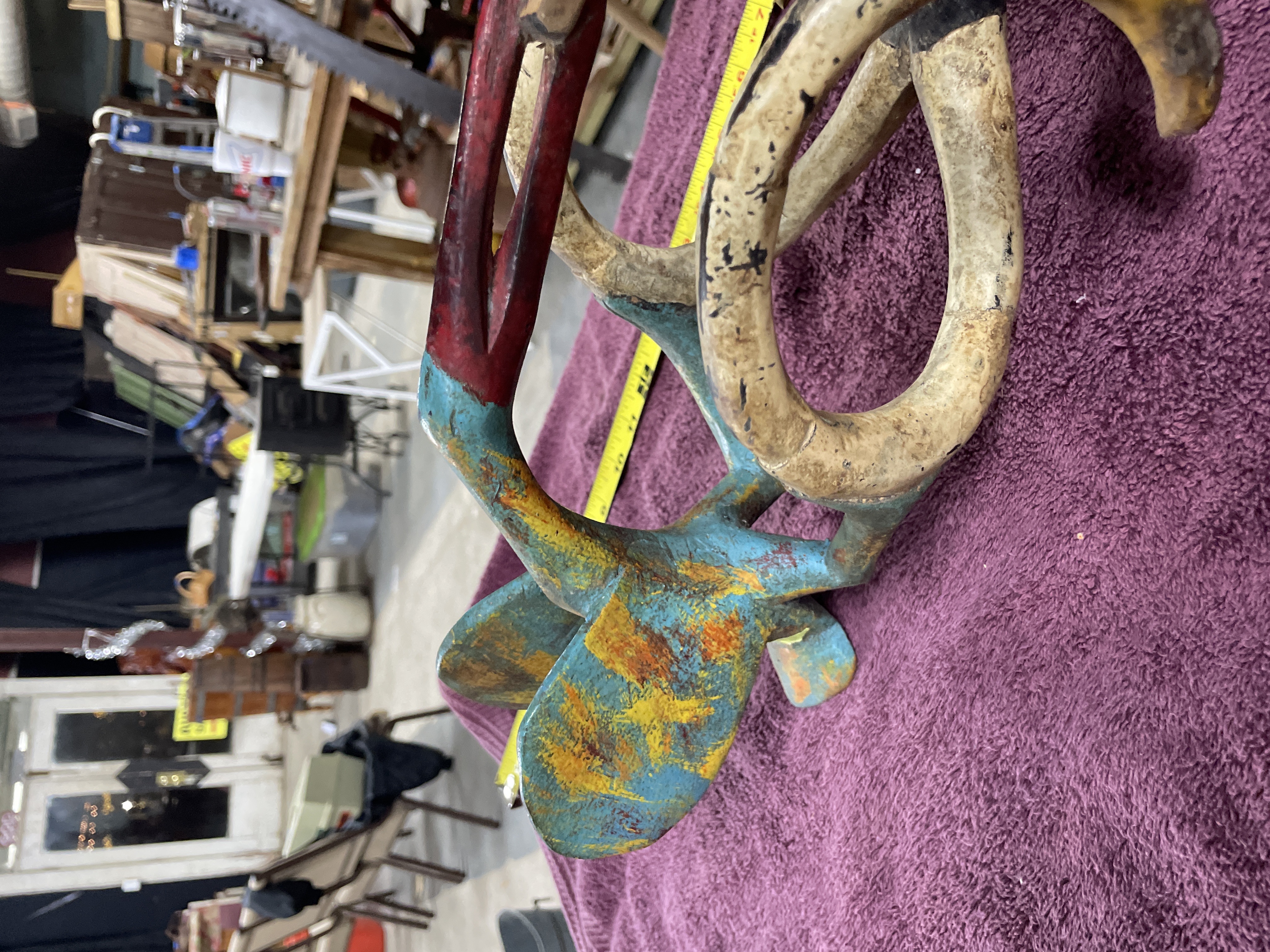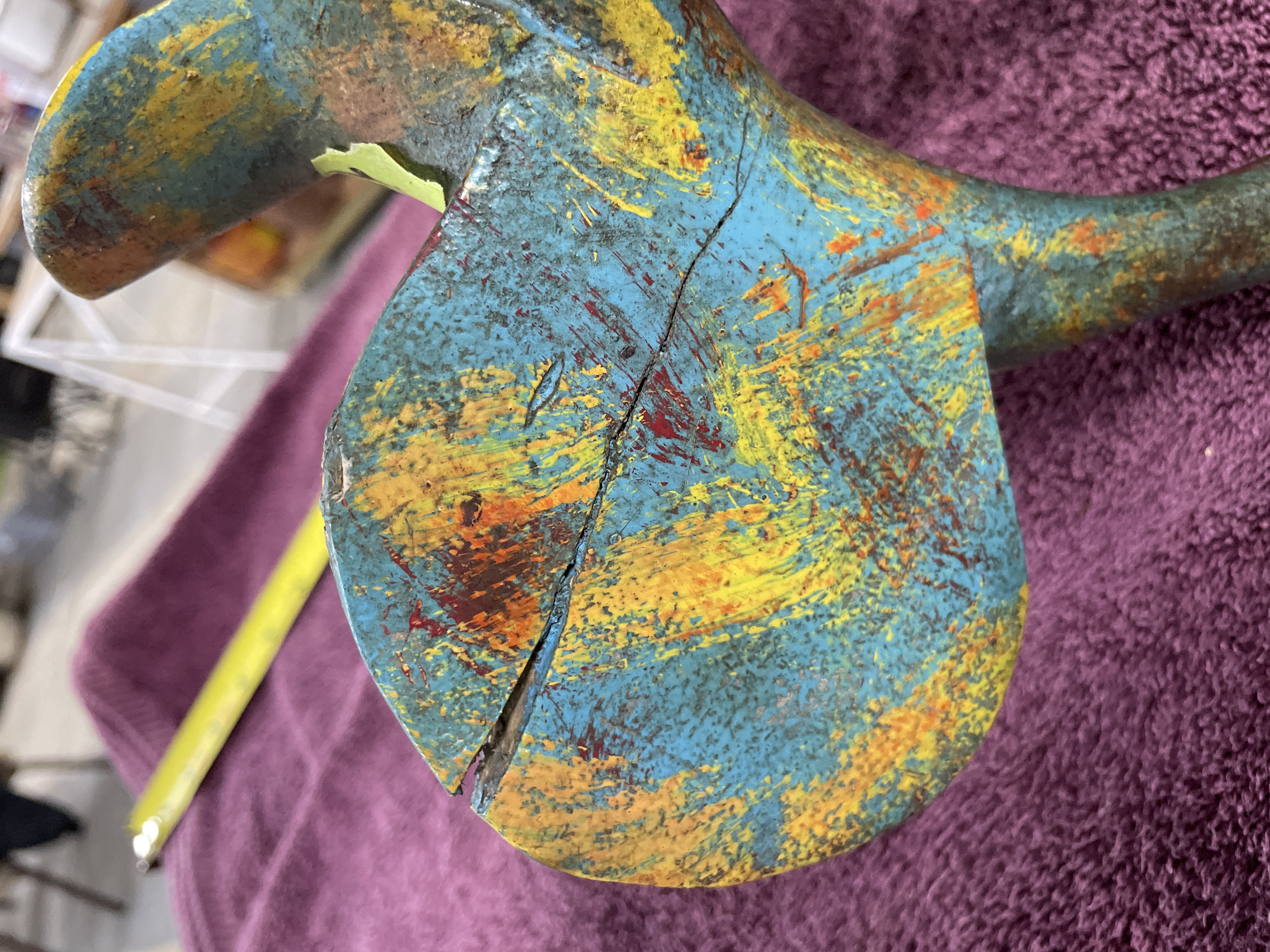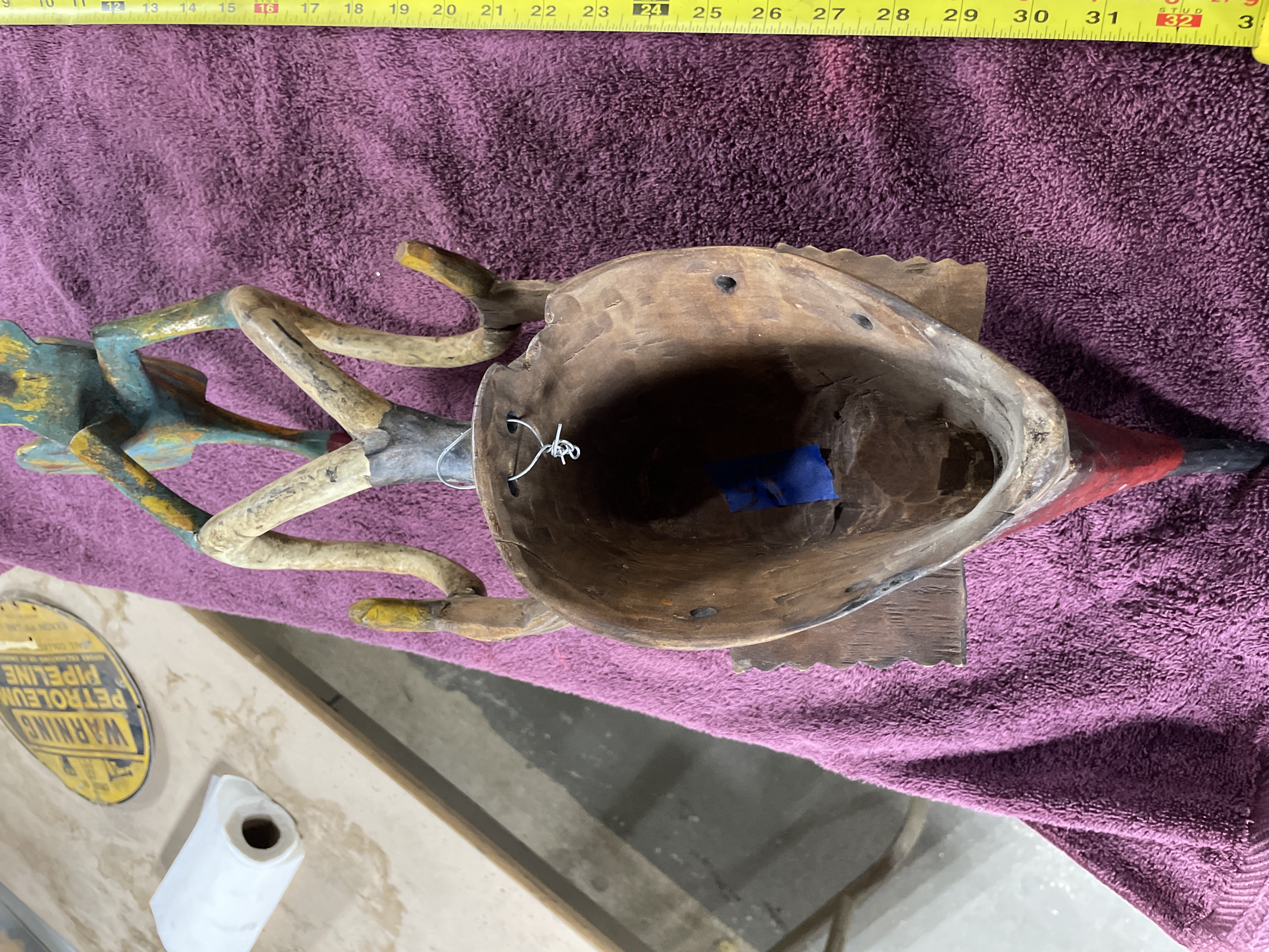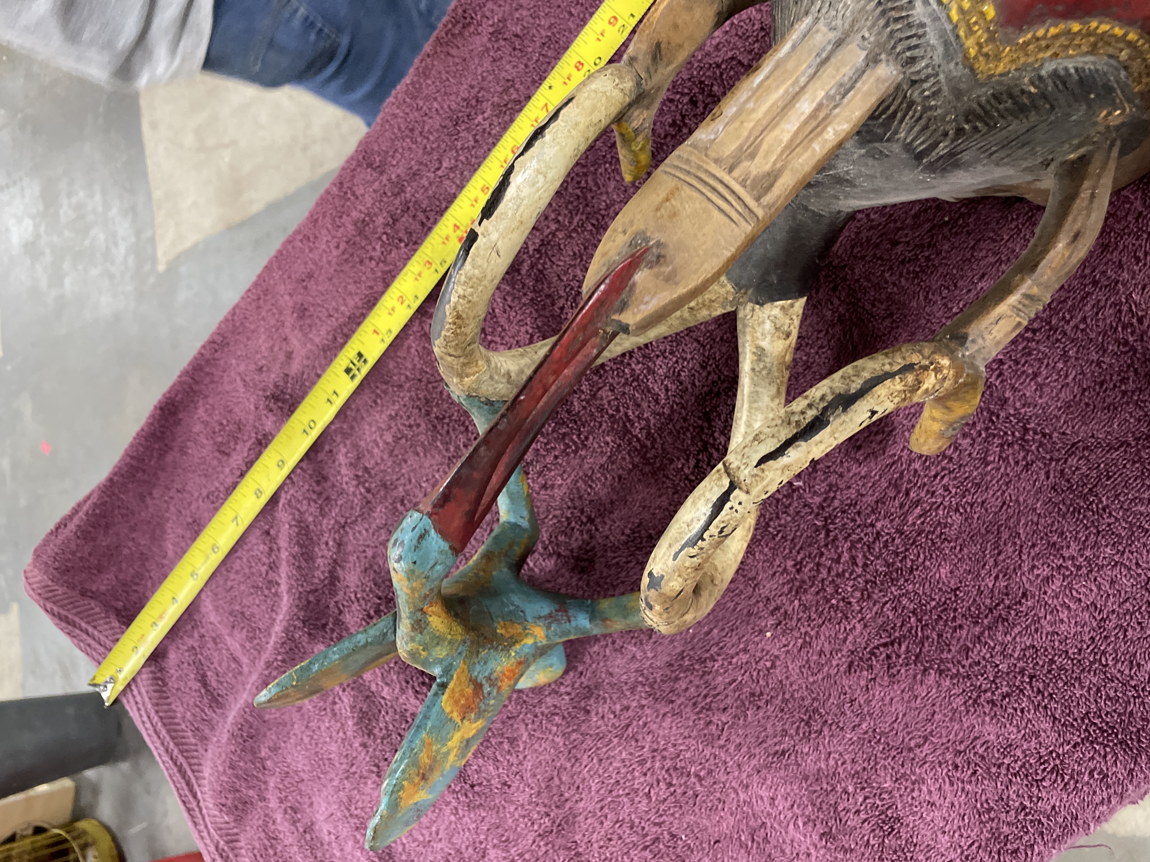 A single composite carved wood mask or headdress executed in a tribal or ethnic style. The artifact features an elongated facial element painted predominantly in red and accented with geometric shapes in black, yellow/gold, and blue. The face includes a projecting snout. A superstructure extends above the mask, composed of curved, stylized limbs supporting a separate, smaller bird-like figure. The bird figure is finished in a distressed polychrome palette of blue, turquoise, yellow, and orange. The interior of the mask is hollowed, and a wire hanger is affixed for display.
