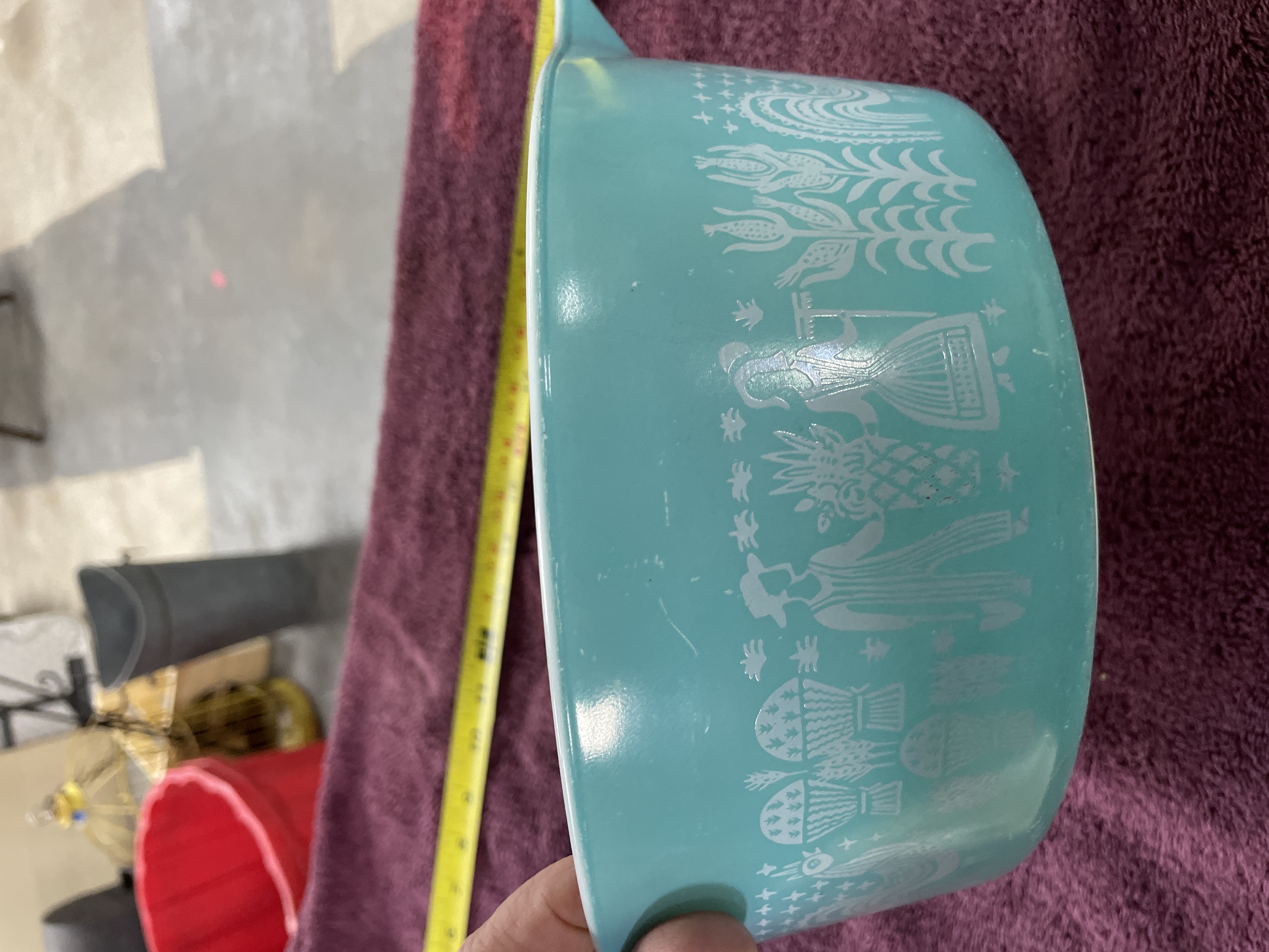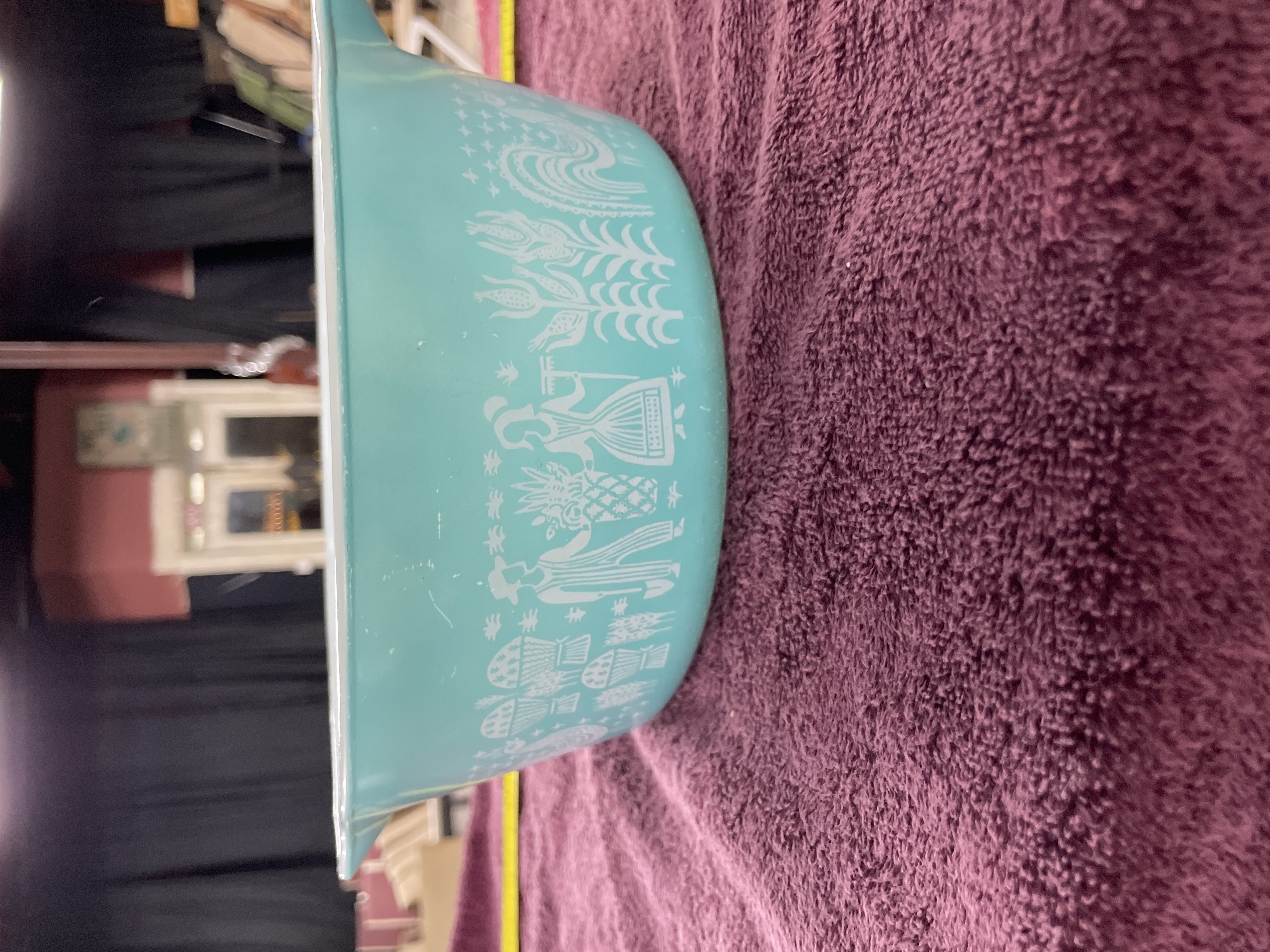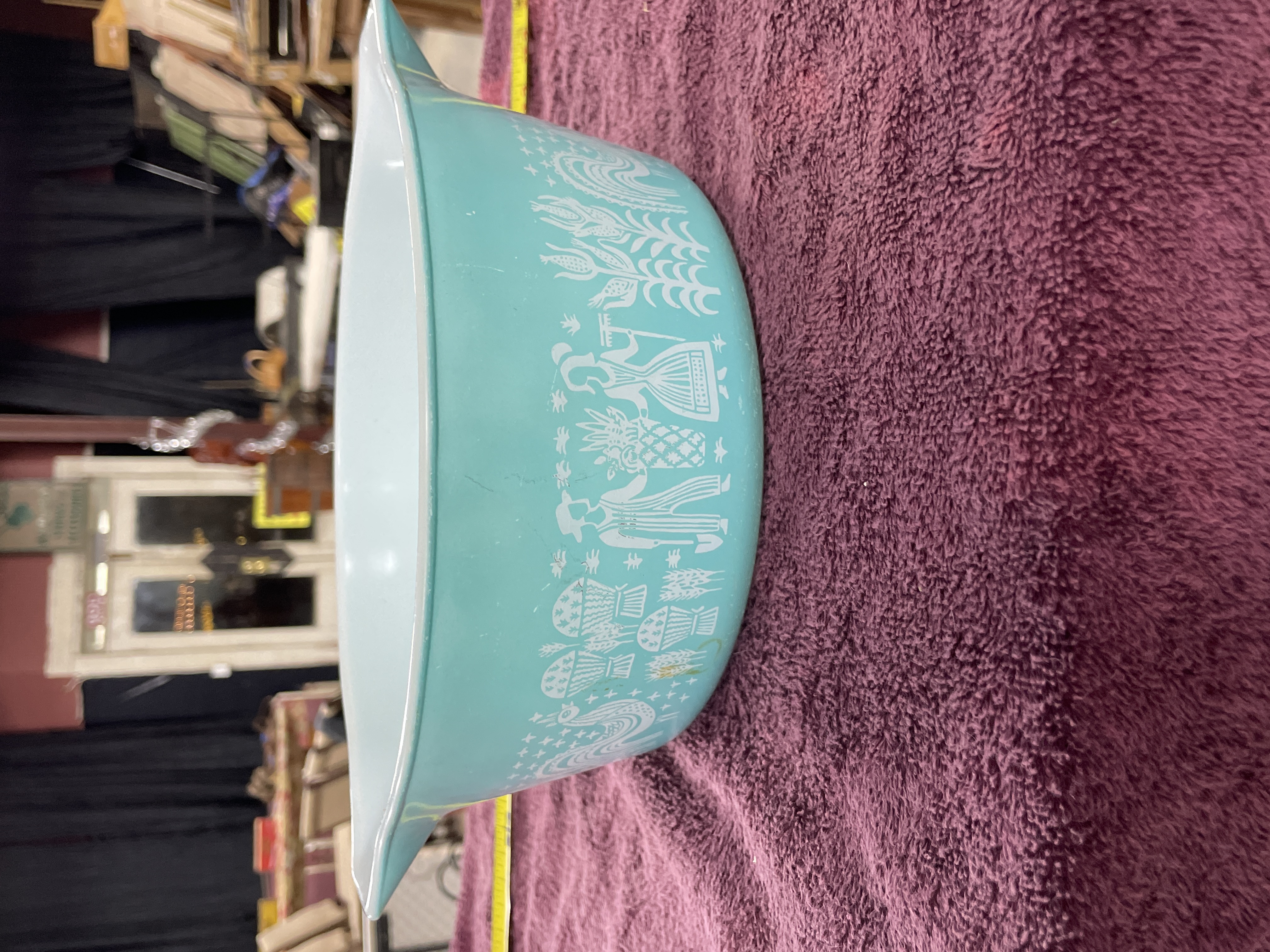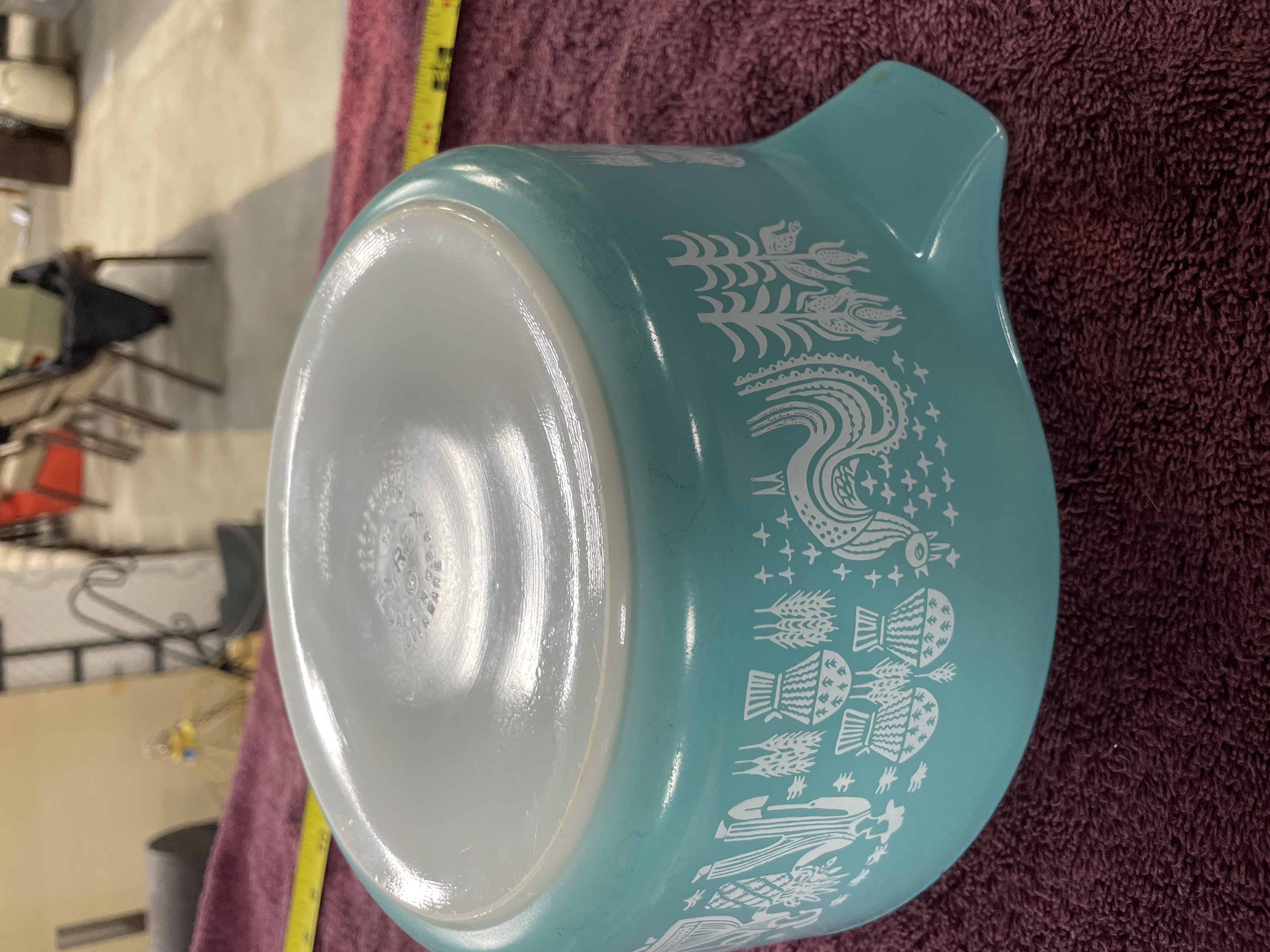 A single vintage Pyrex opal glass casserole or mixing bowl featuring the highly collectible Amish Butterprint pattern. The piece has a rounded form with integrated handles and is constructed of heat-resistant opal glass with a turquoise/teal exterior enamel finish and a white interior. The exterior is decorated with a continuous, white silk-screened design depicting folk imagery including farm figures, roosters, corn stalks, and various crops. Molded markings on the base identify the manufacturer and specifications.