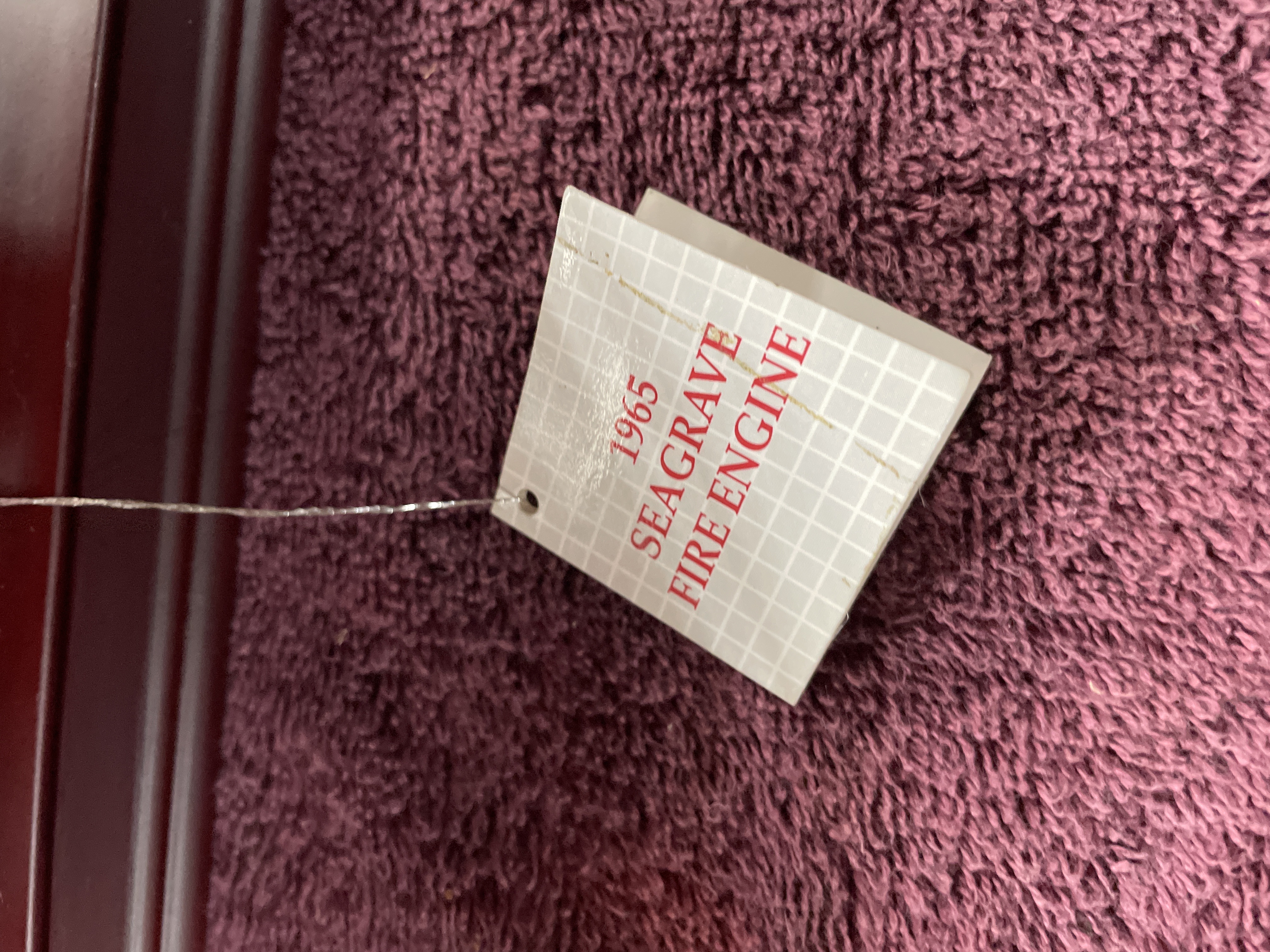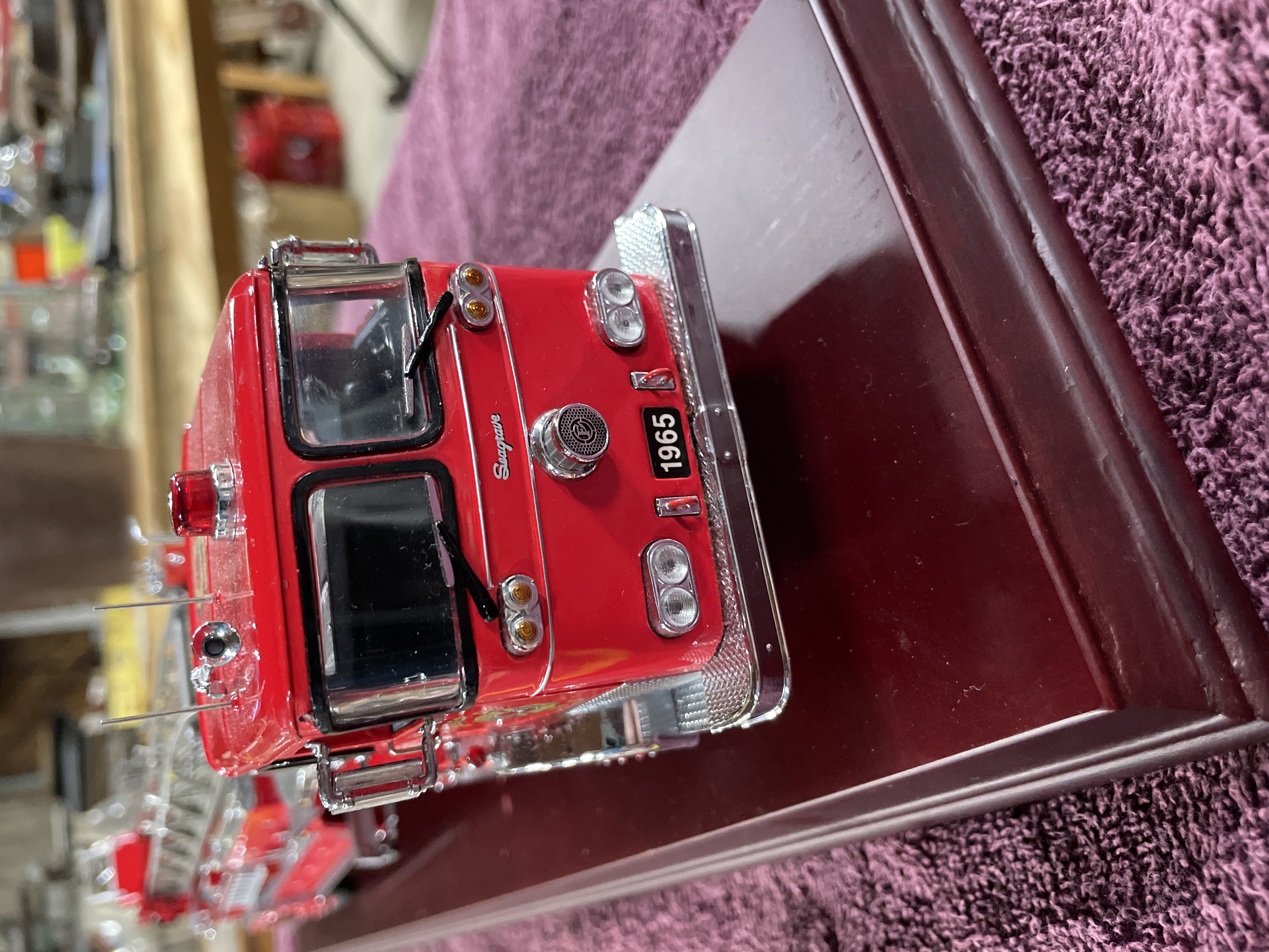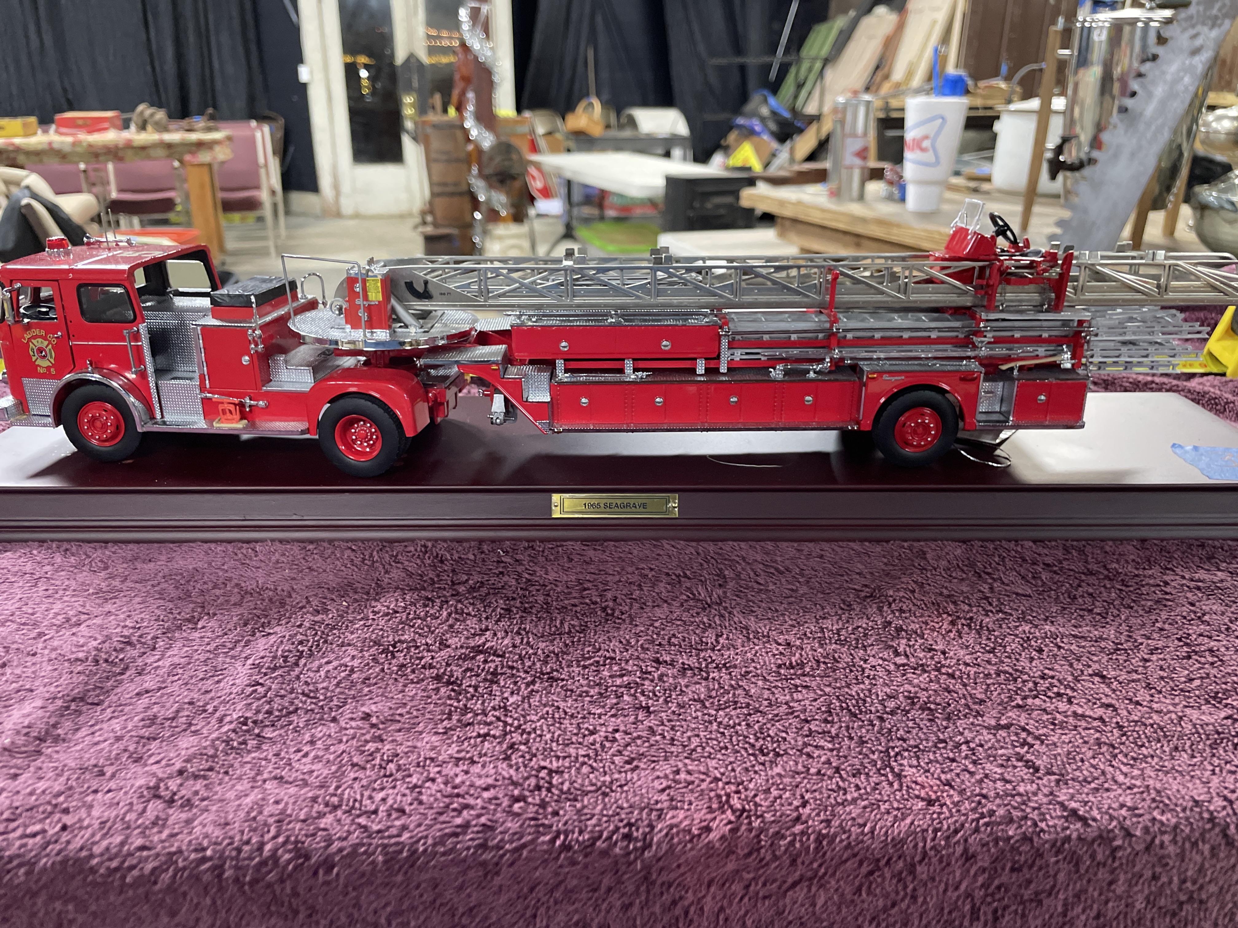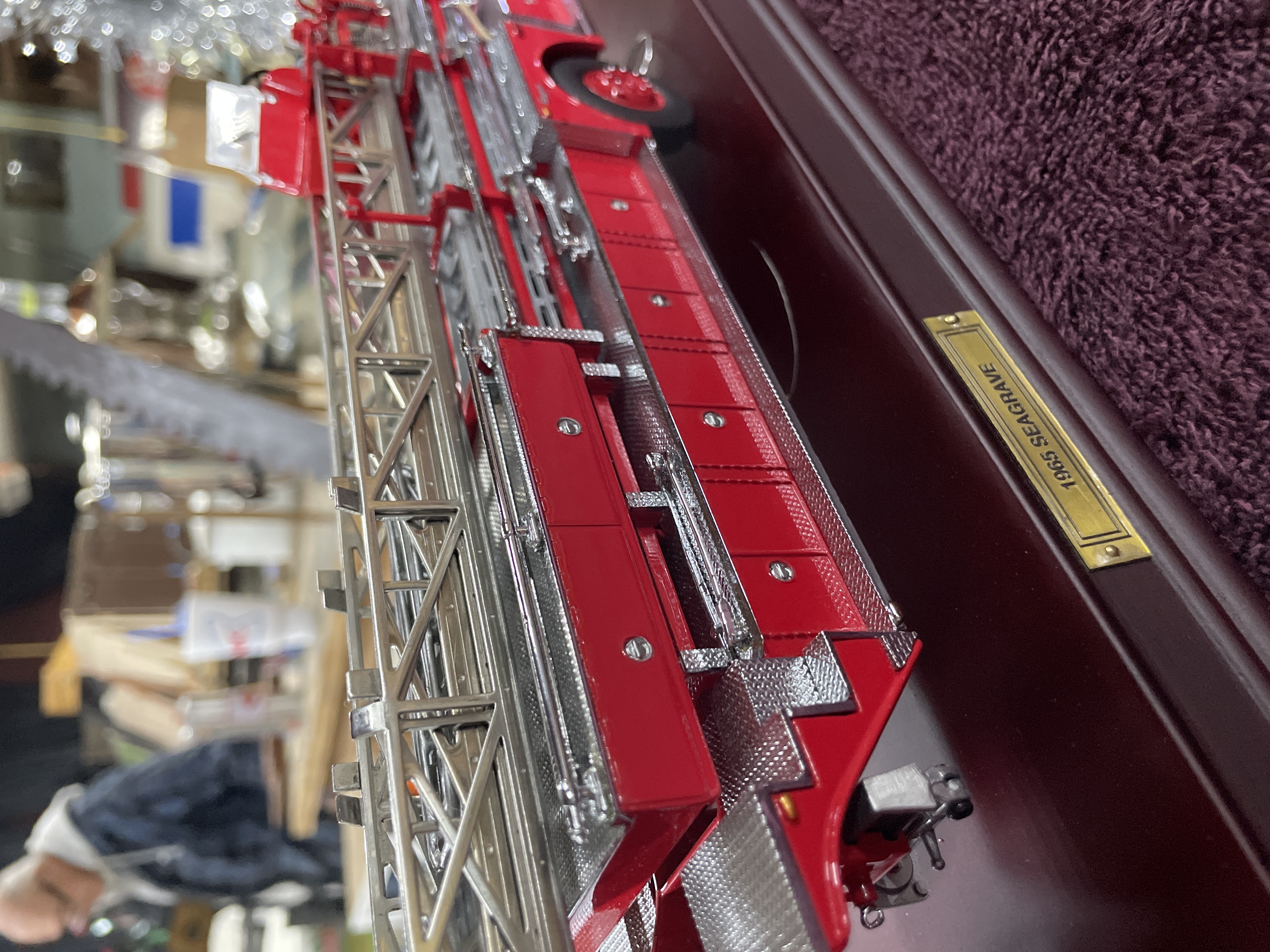 A single collector’s scale model of a 1965 Seagrave aerial ladder fire engine. The model is constructed using die-cast metal and plastic components, finished primarily in bright red with extensive chrome and diamond-plate silver accents on the bodywork and running boards. The engine is mounted on a polished, maroon-finished wooden display base. Detailed components include the extension ladder assembly, rubber tires, and cab interior. Visible identification includes a brass plaque affixed to the base reading "1965 SEAGRAVE." The front grille is molded with the word "Seagrave, " and the cab doors feature decals reading "F.D. LADDER CO. No. 5." The original informational hang tag, marked "1965 SEAGRAVE FIRE ENGINE, " is present.