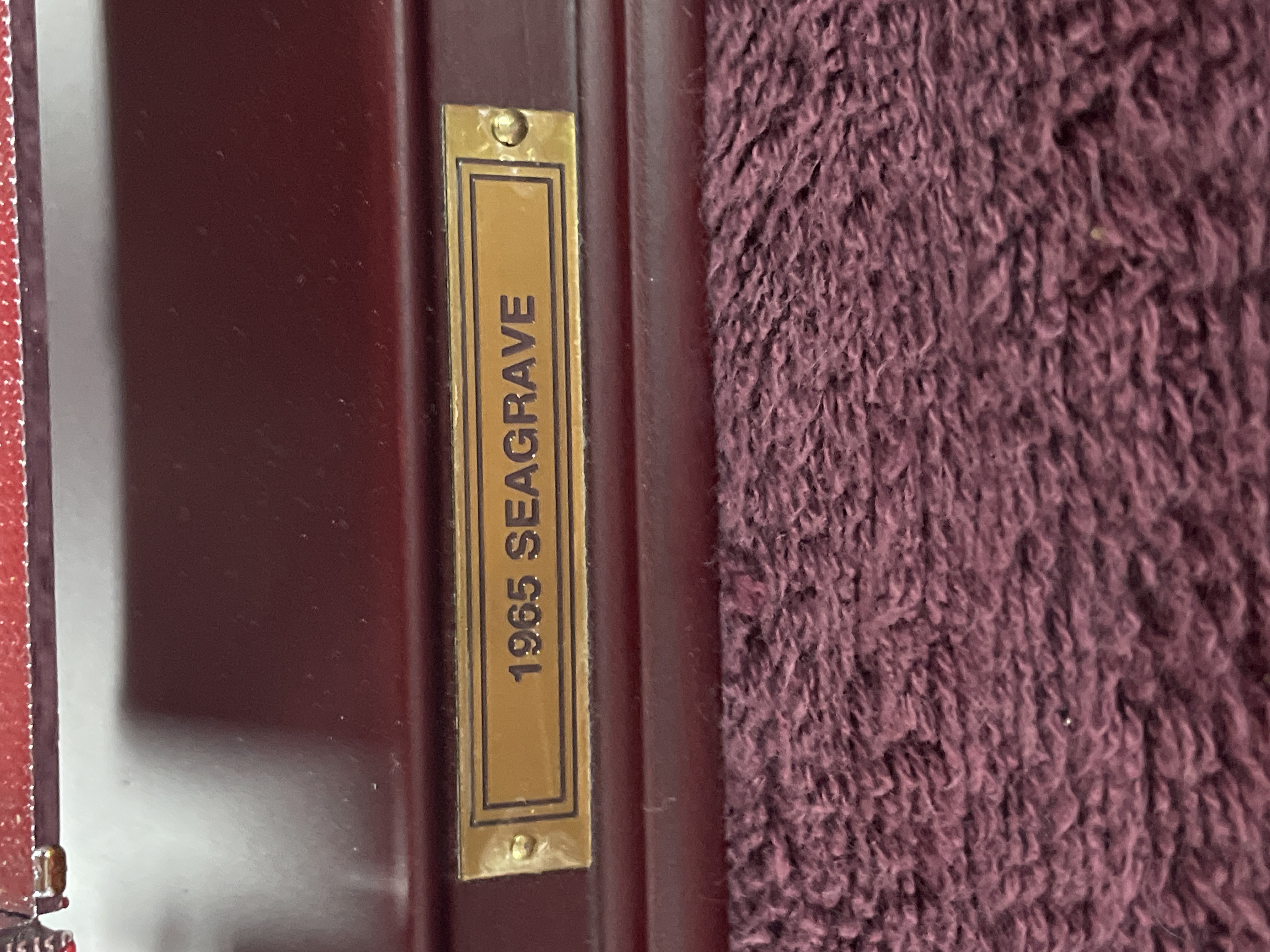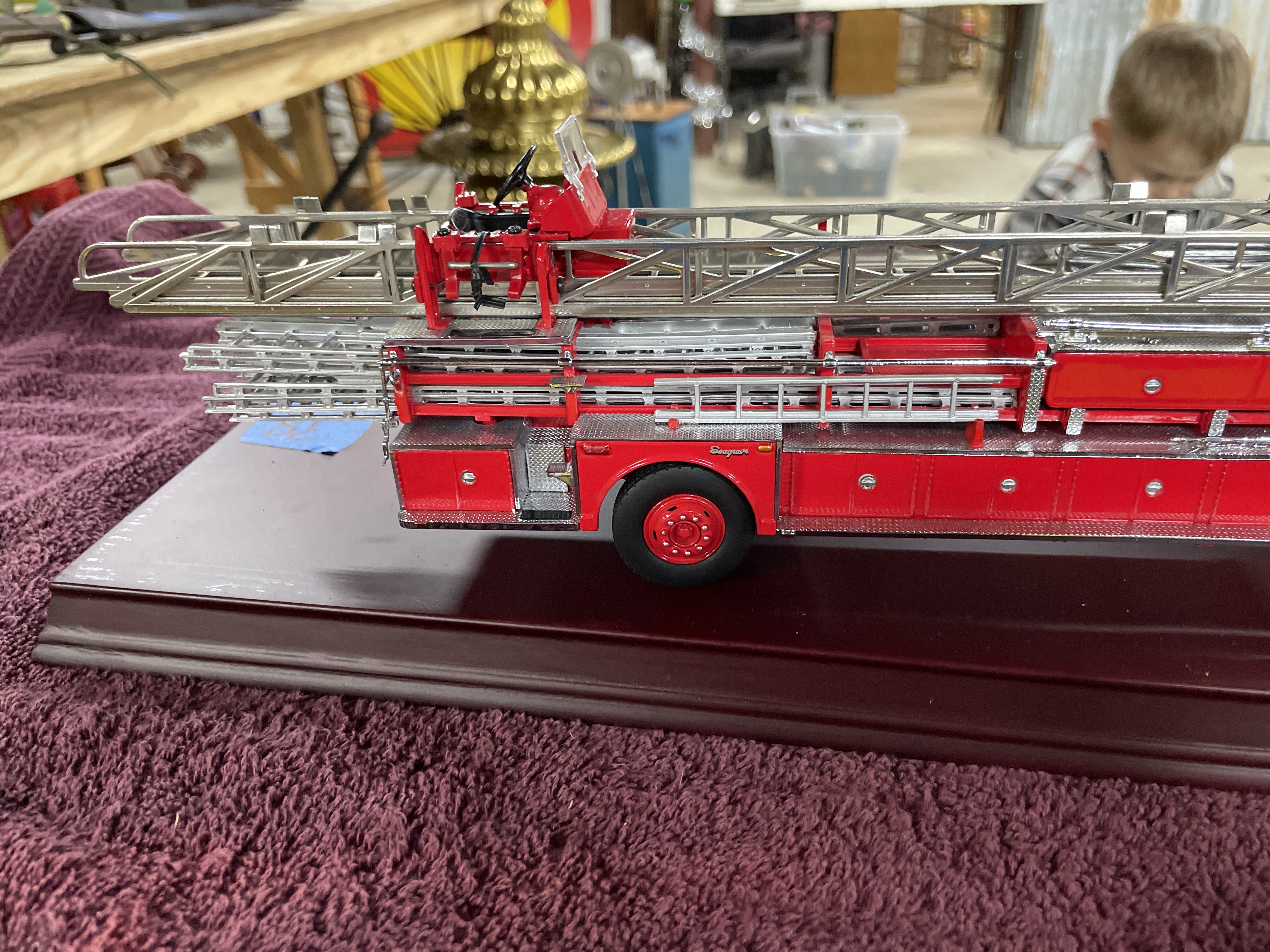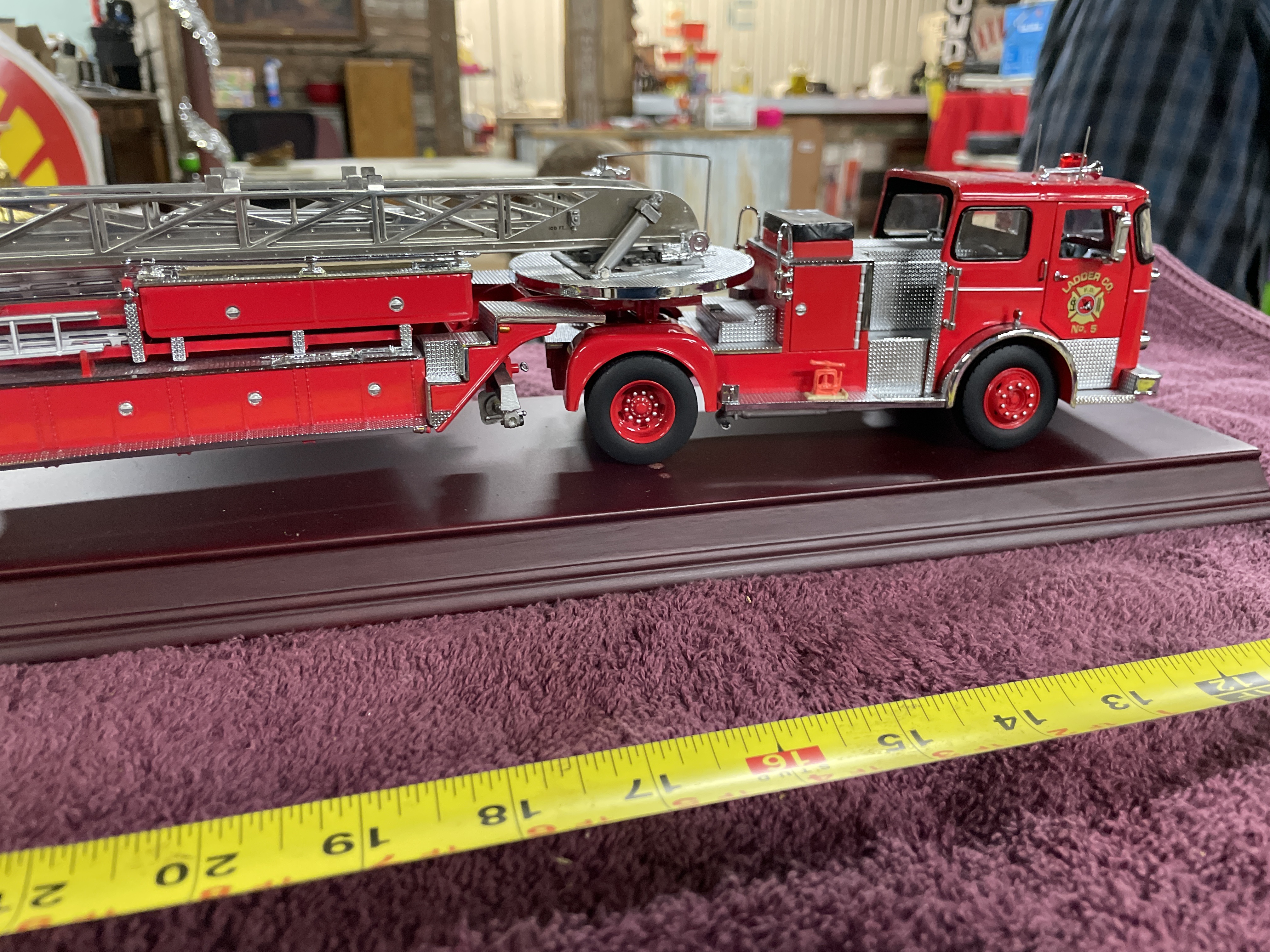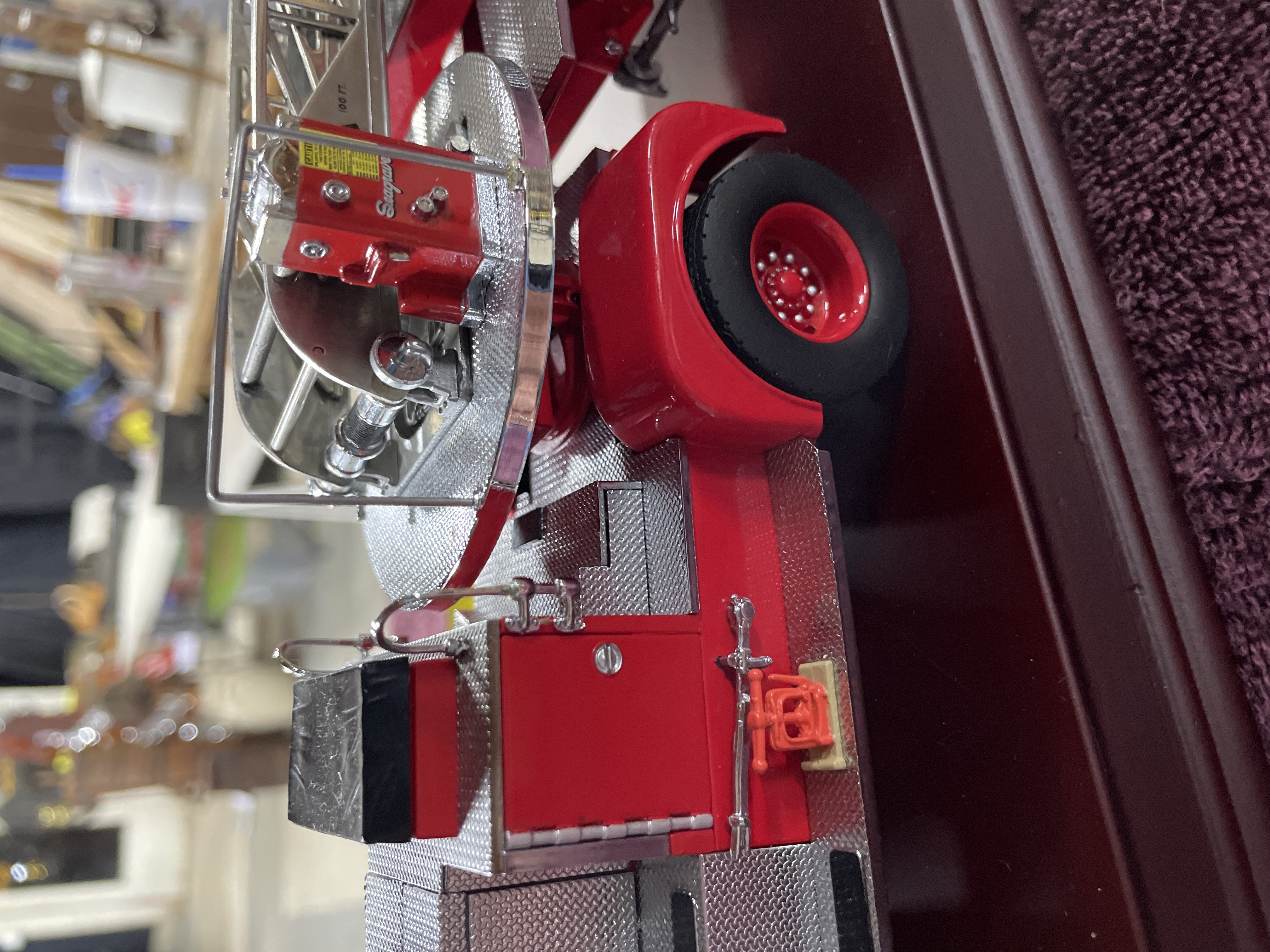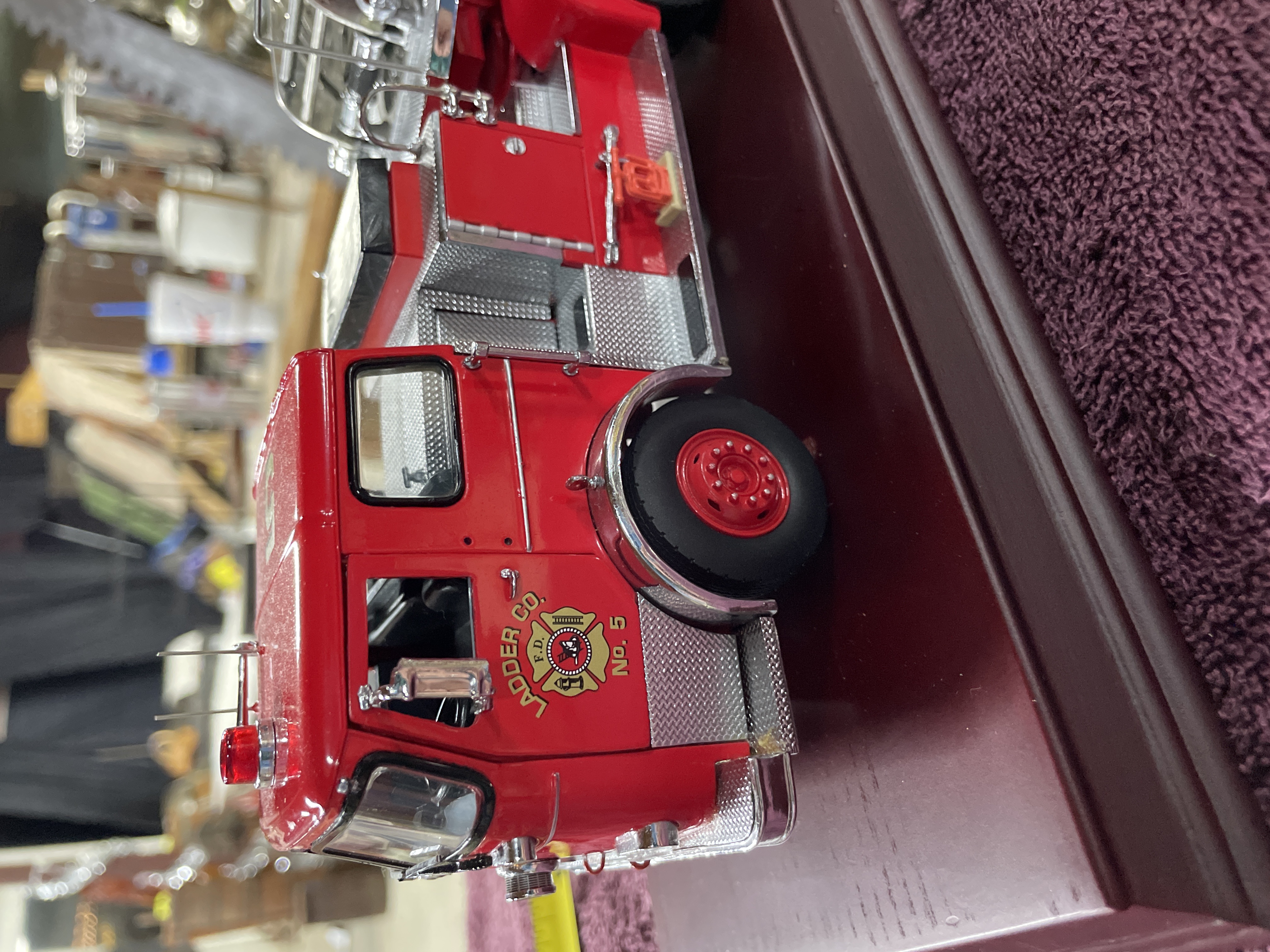 A single collector’s scale model of a 1965 Seagrave aerial ladder fire engine. The model is constructed using die-cast metal and plastic components, finished primarily in bright red with extensive chrome and diamond-plate silver accents on the bodywork and running boards. The engine is mounted on a polished, maroon-finished wooden display base. Detailed components include the extension ladder assembly, rubber tires, and cab interior. Visible identification includes a brass plaque affixed to the base reading "1965 SEAGRAVE." The front grille is molded with the word "Seagrave, " and the cab doors feature decals reading "F.D. LADDER CO. No. 5." The original informational hang tag, marked "1965 SEAGRAVE FIRE ENGINE, " is present.
