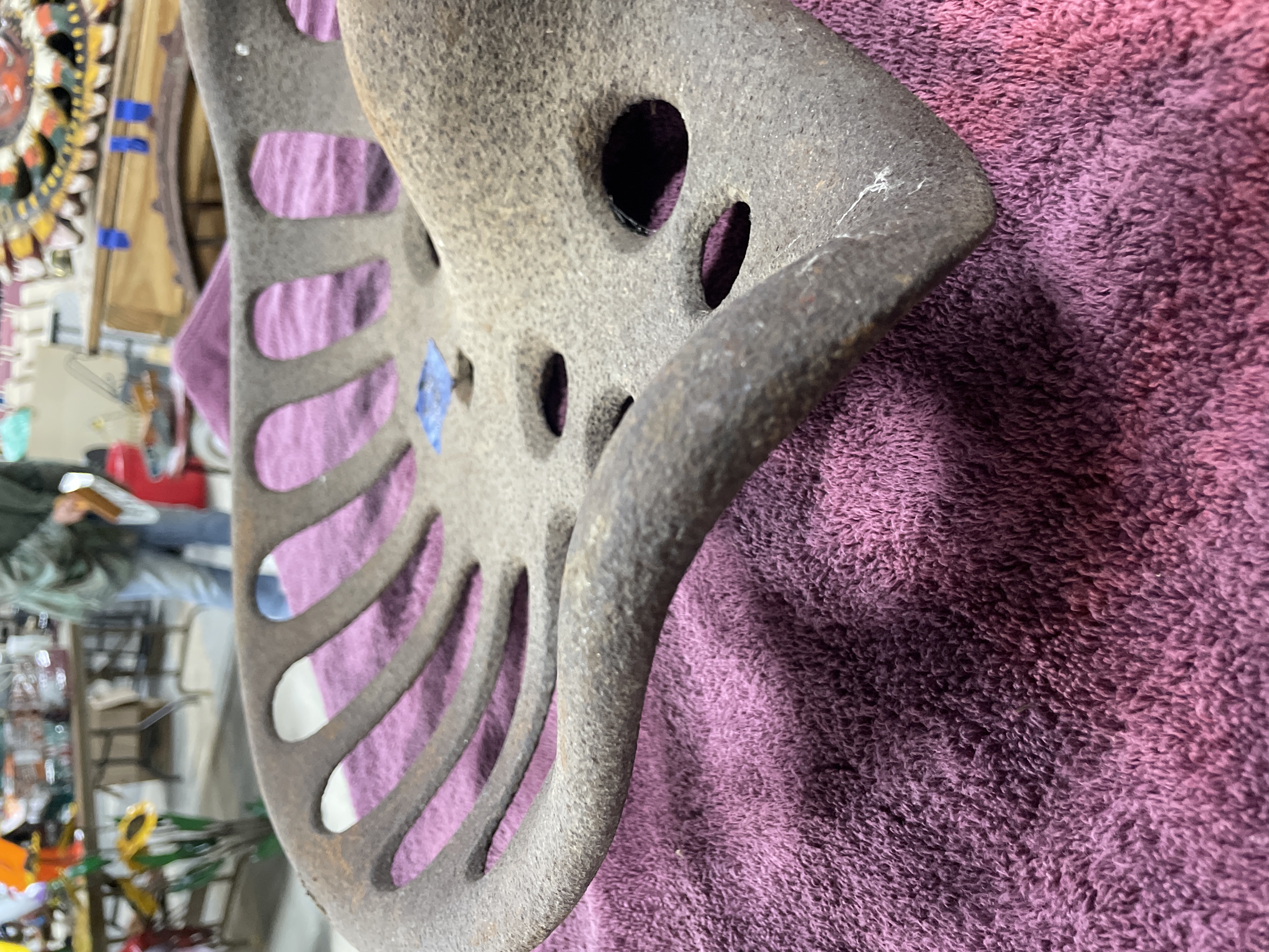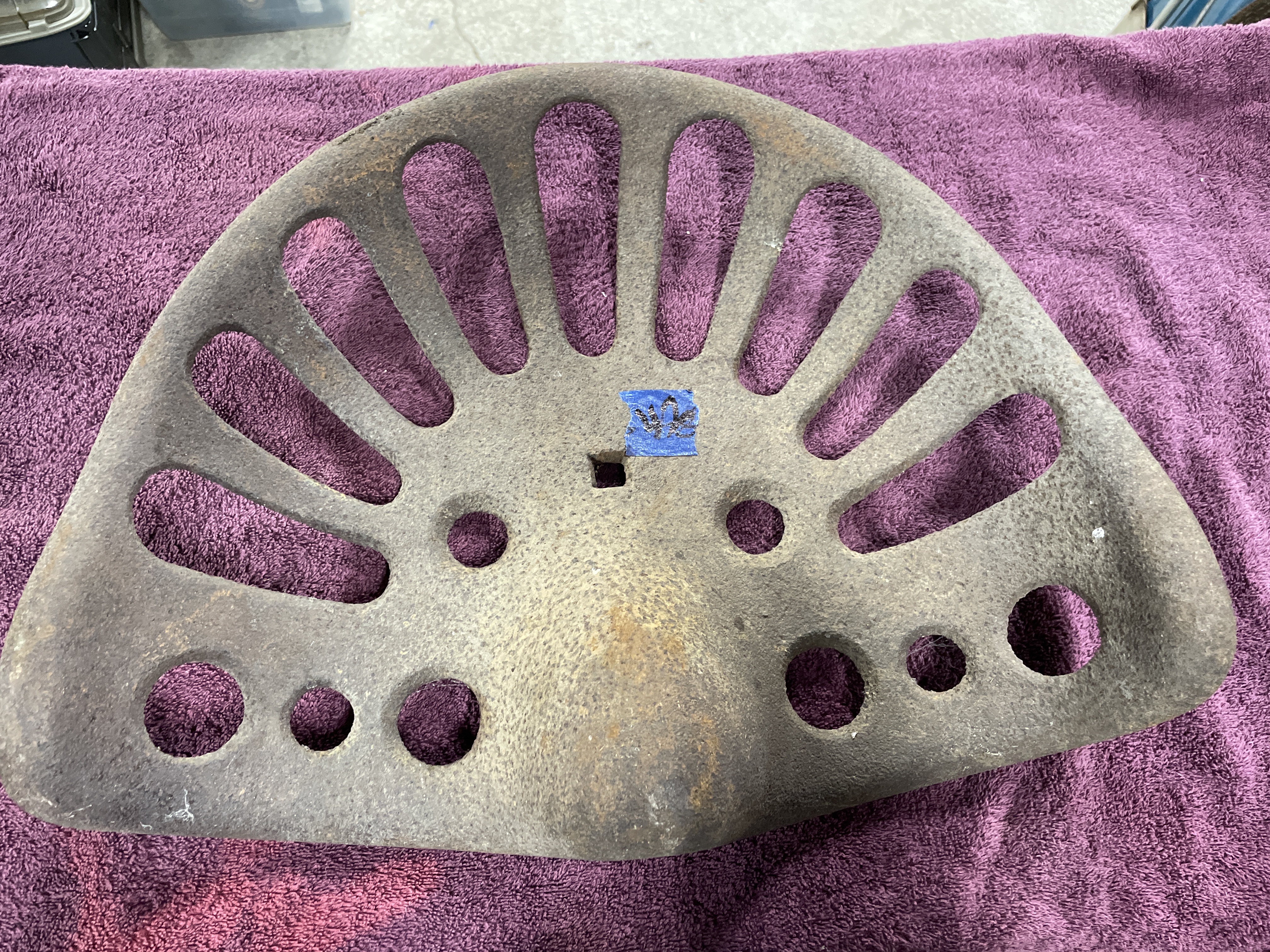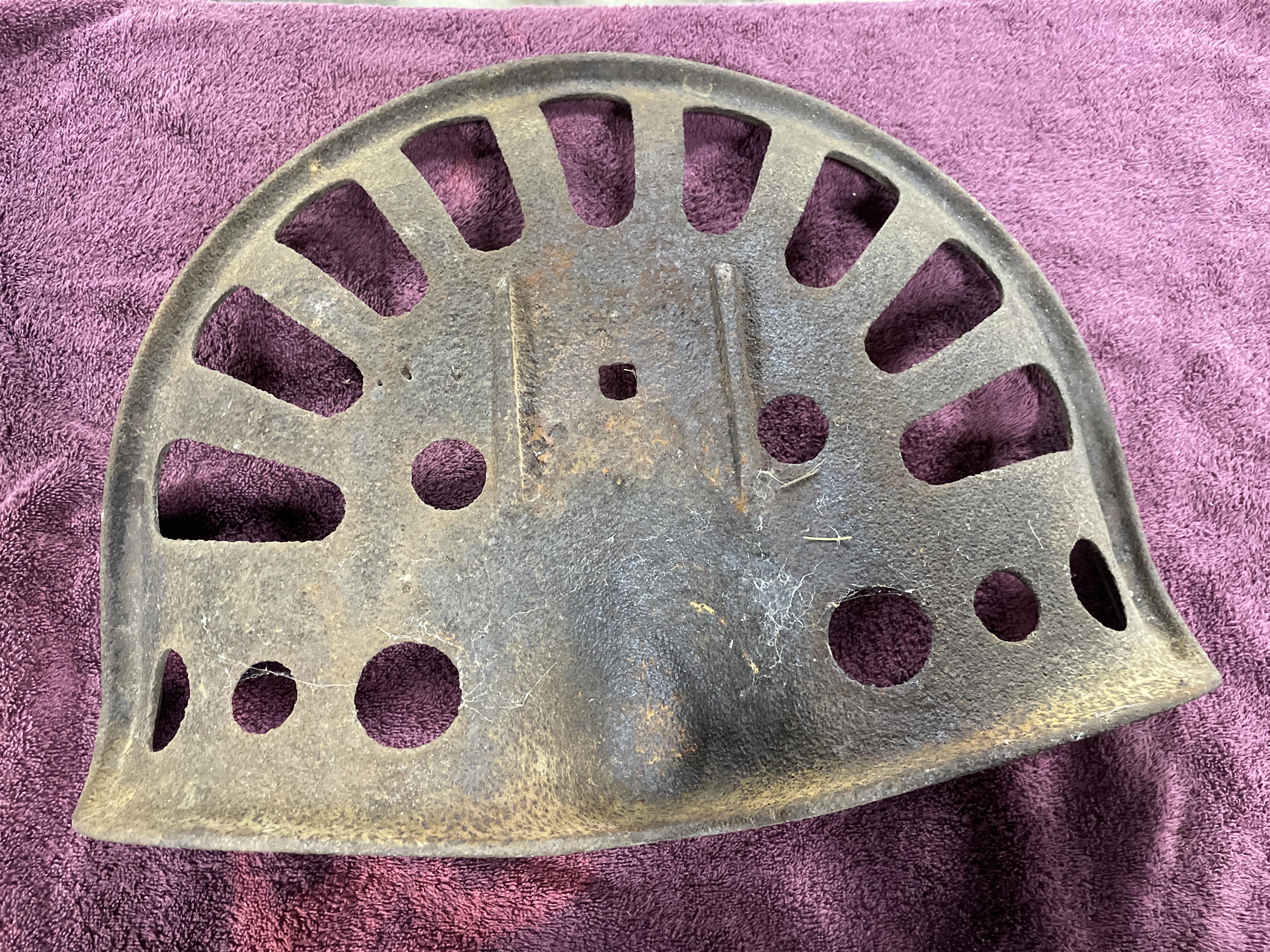 A single antique agricultural implement seat constructed of heavy cast iron. The seat features a deeply curved saddle form designed for utility. The surface is extensively perforated, including six circular holes distributed across the front and center, and approximately eleven elongated radial slots extending toward the rear edge. The seat includes a central square mounting hole and two prominent raised horizontal ribs near the center. This type of seat is commonly identified in the market as a vintage tractor or farm implement seat. No manufacturer’s markings are discernible.
