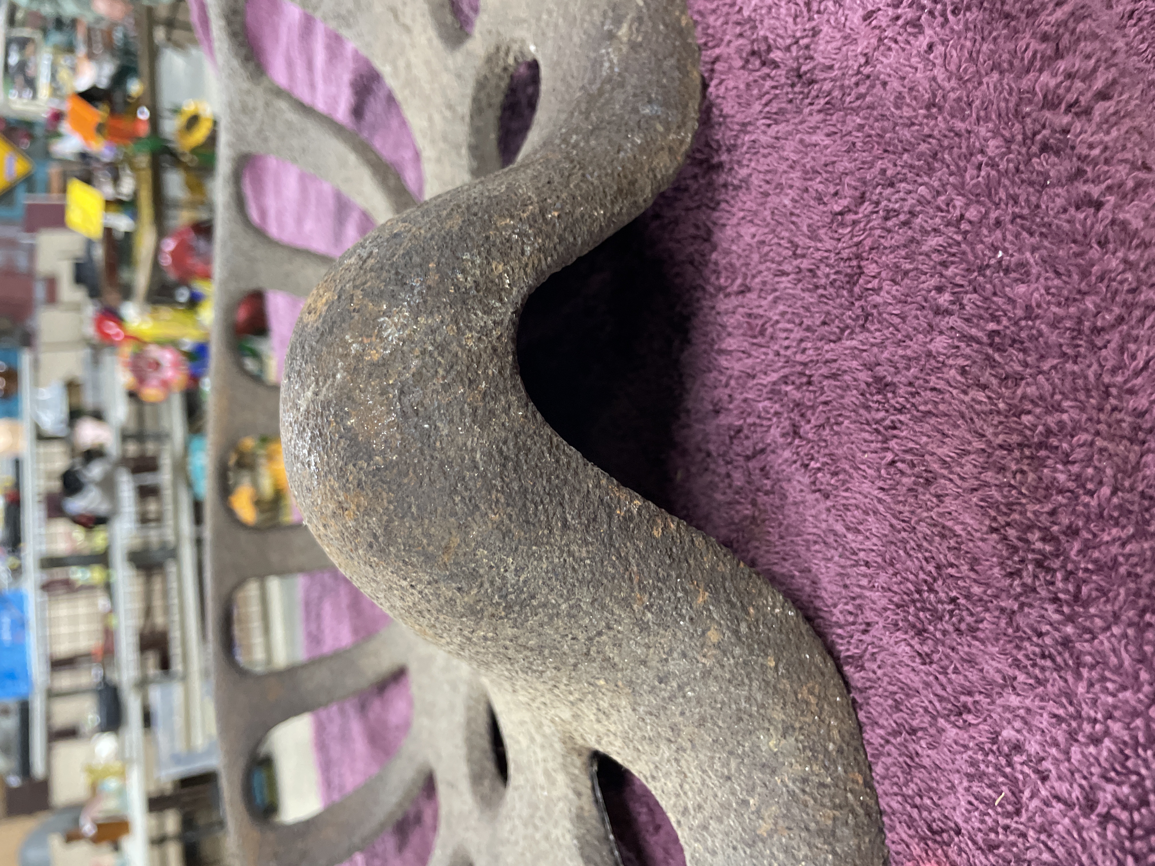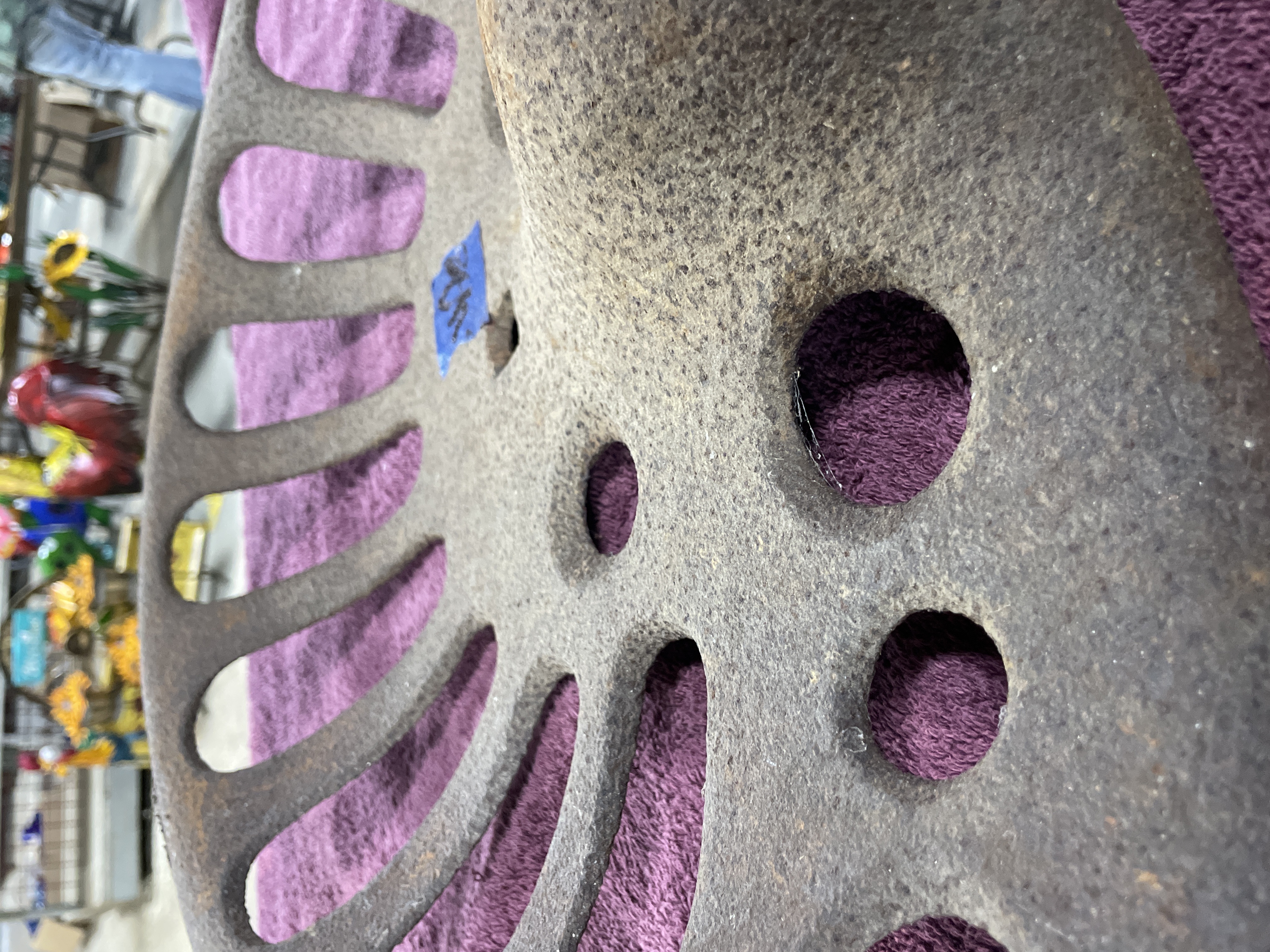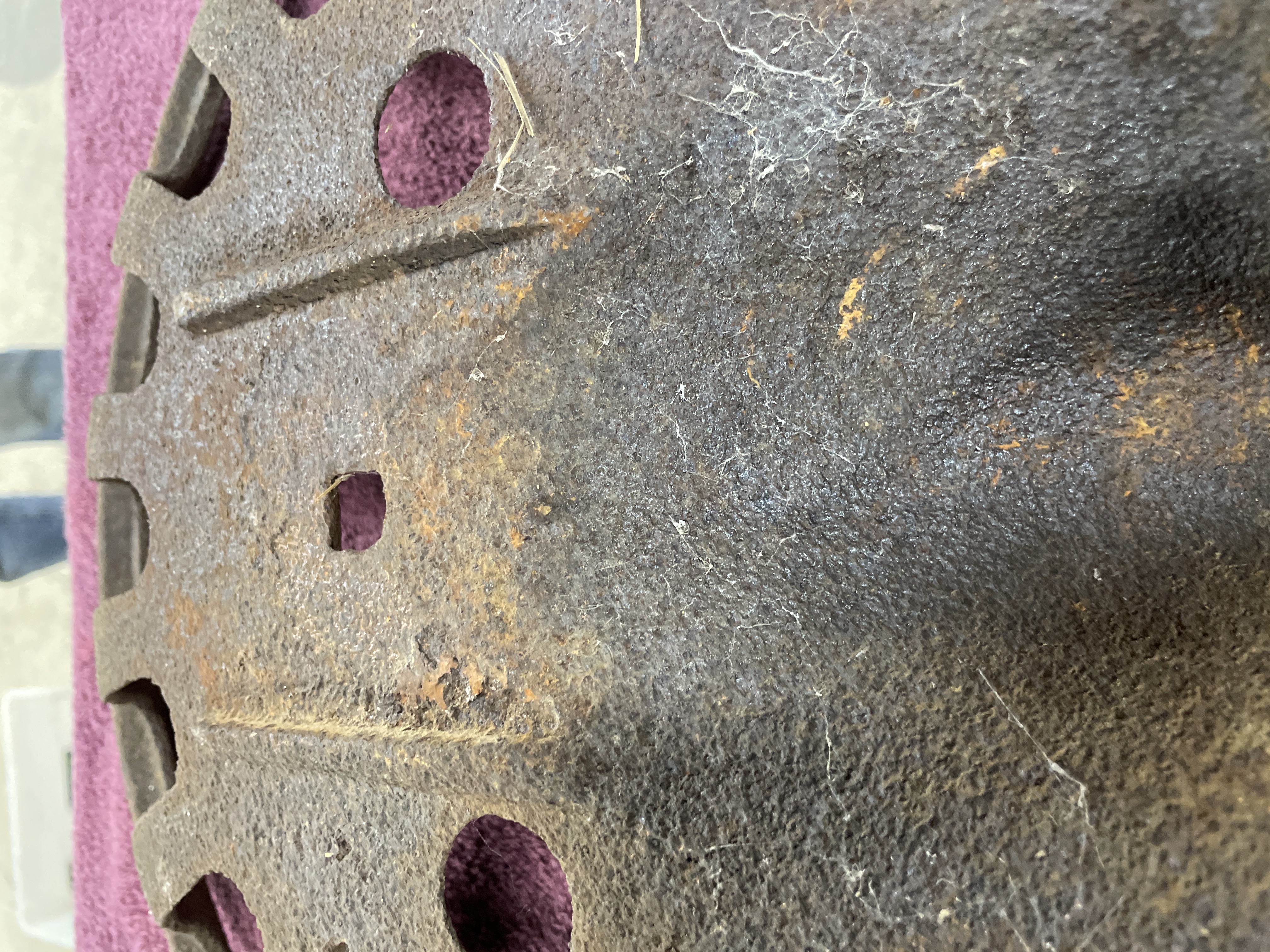 A single antique agricultural implement seat constructed of heavy cast iron. The seat features a deeply curved saddle form designed for utility. The surface is extensively perforated, including six circular holes distributed across the front and center, and approximately eleven elongated radial slots extending toward the rear edge. The seat includes a central square mounting hole and two prominent raised horizontal ribs near the center. This type of seat is commonly identified in the market as a vintage tractor or farm implement seat. No manufacturer’s markings are discernible.