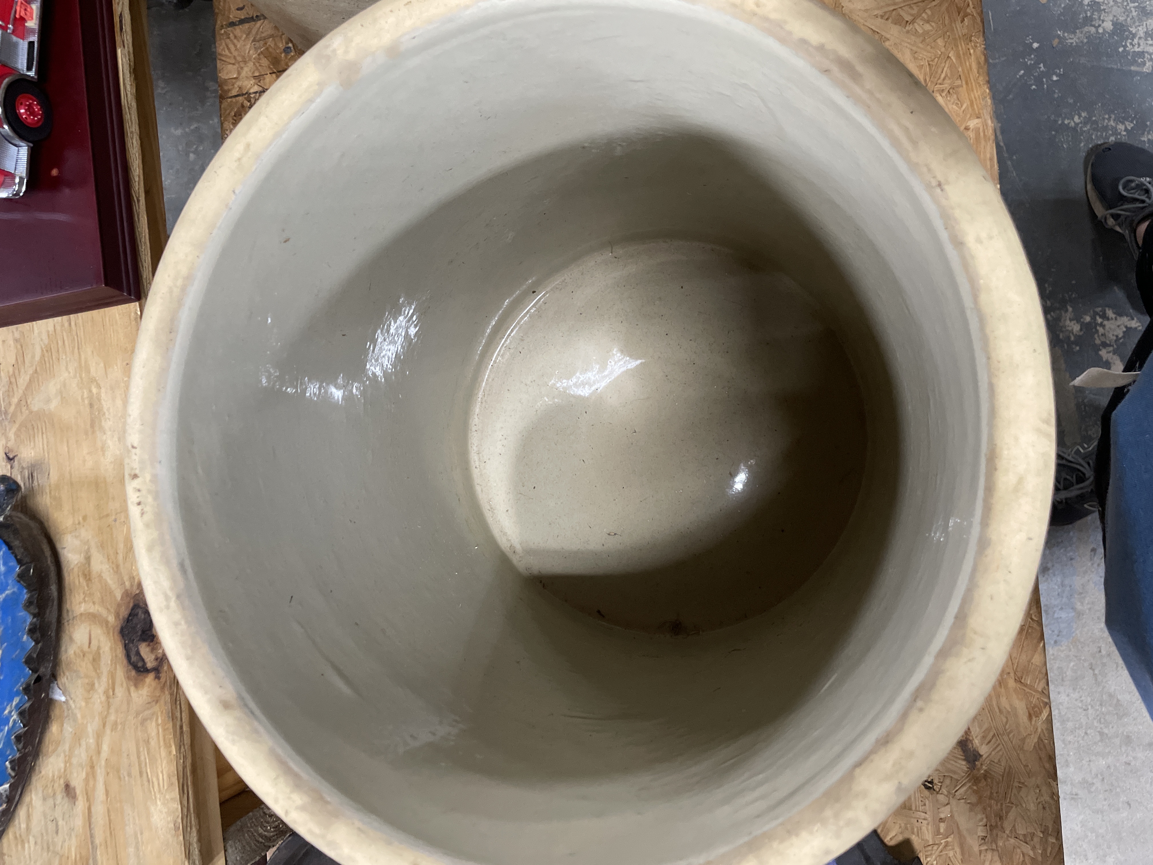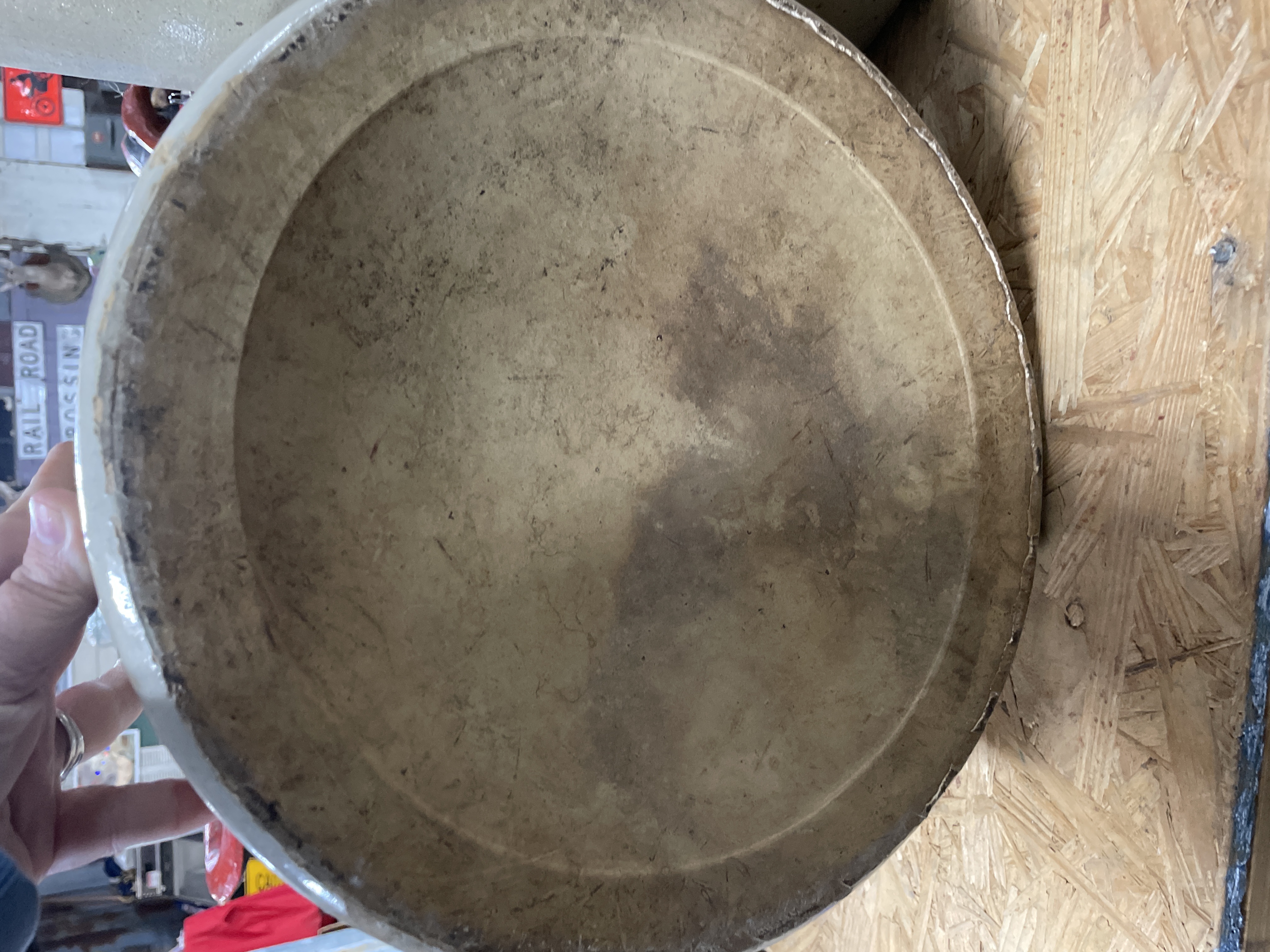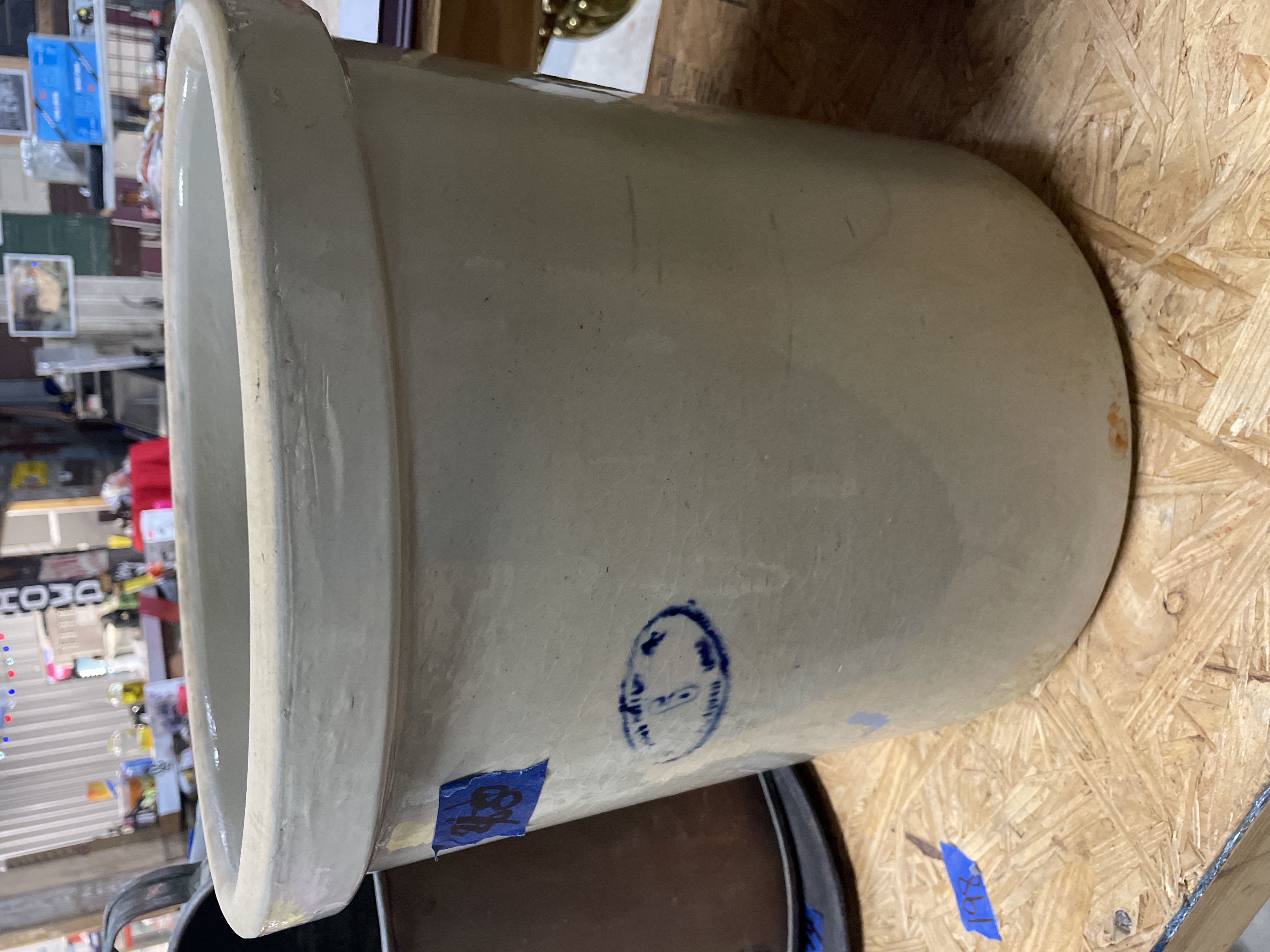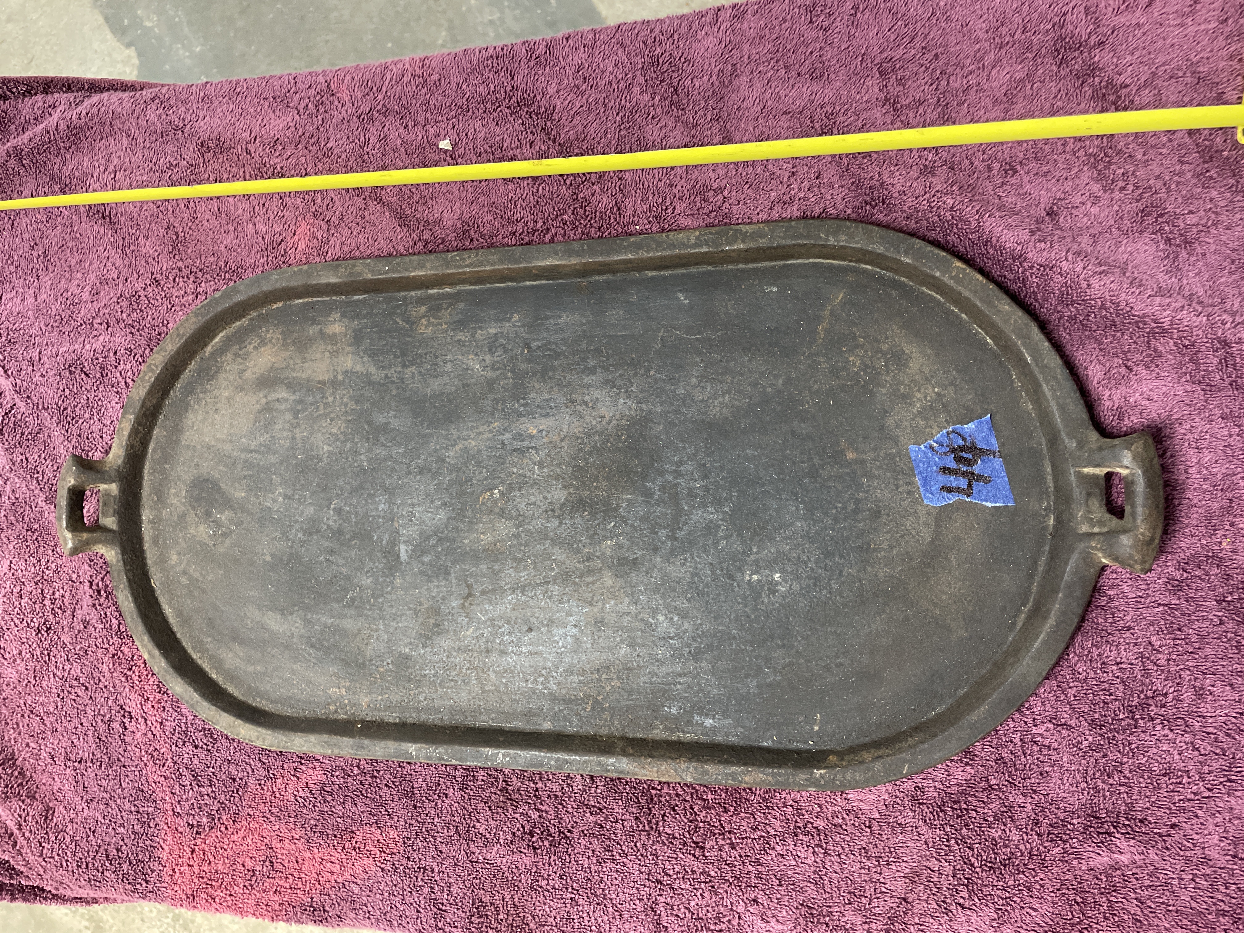 A collection comprising two distinct utilitarian items: a stoneware crock and a cast iron griddle. The primary item is a large cylindrical stoneware crock attributed to Red Wing Union Stoneware, Minnesota, based on the visible markings and market consensus. The crock features a matte beige or tan glaze and is marked on the exterior with an oval blue cobalt stamp centered with the numeral ‘6’, indicating a six-gallon capacity. The second item is an oblong cast iron griddle or broiler plate of rustic construction. It features a flat cooking surface with a shallow raised rim and integral loop handles cast into the short ends. The griddle displays a heavily oxidized dark surface.