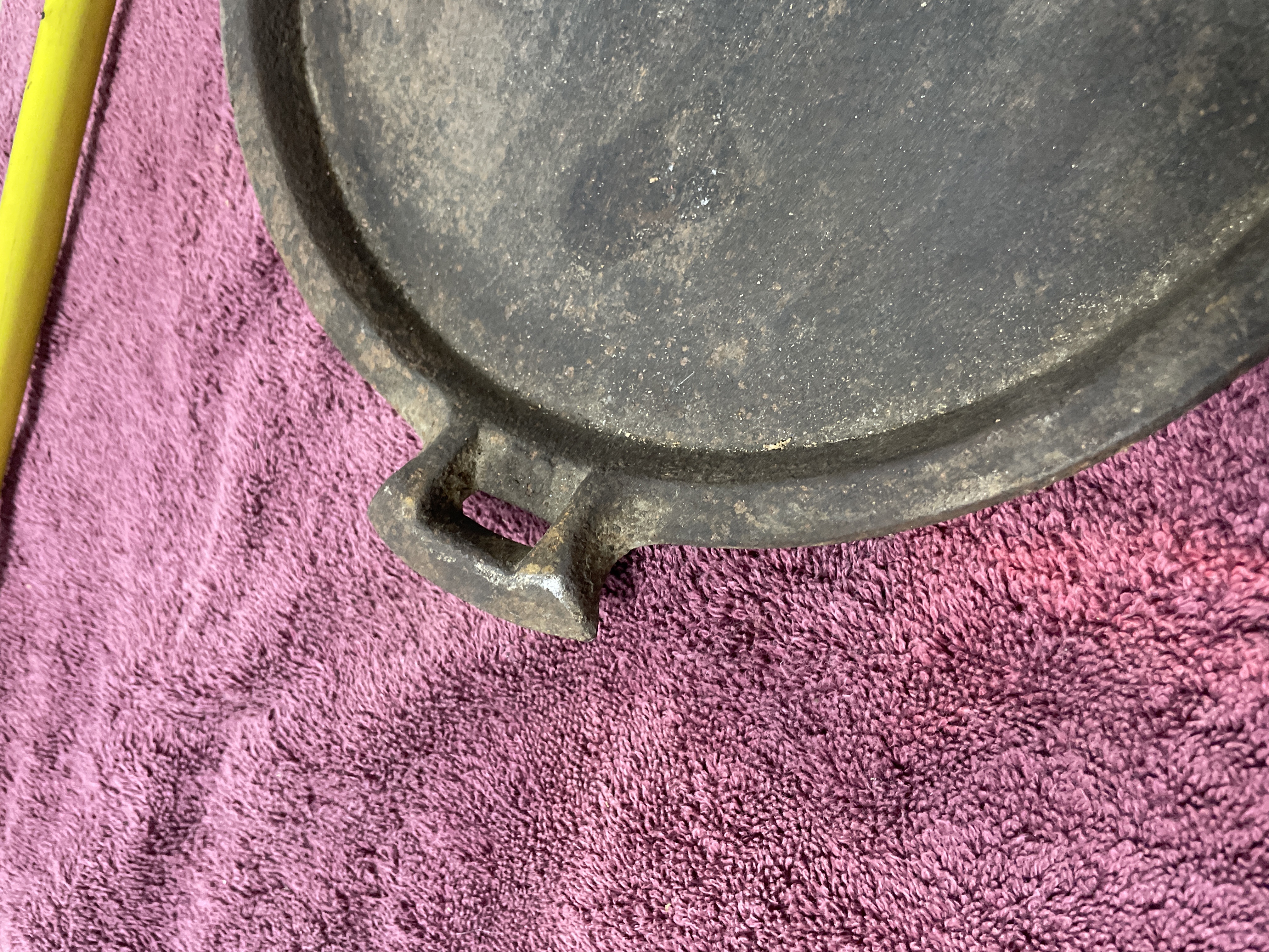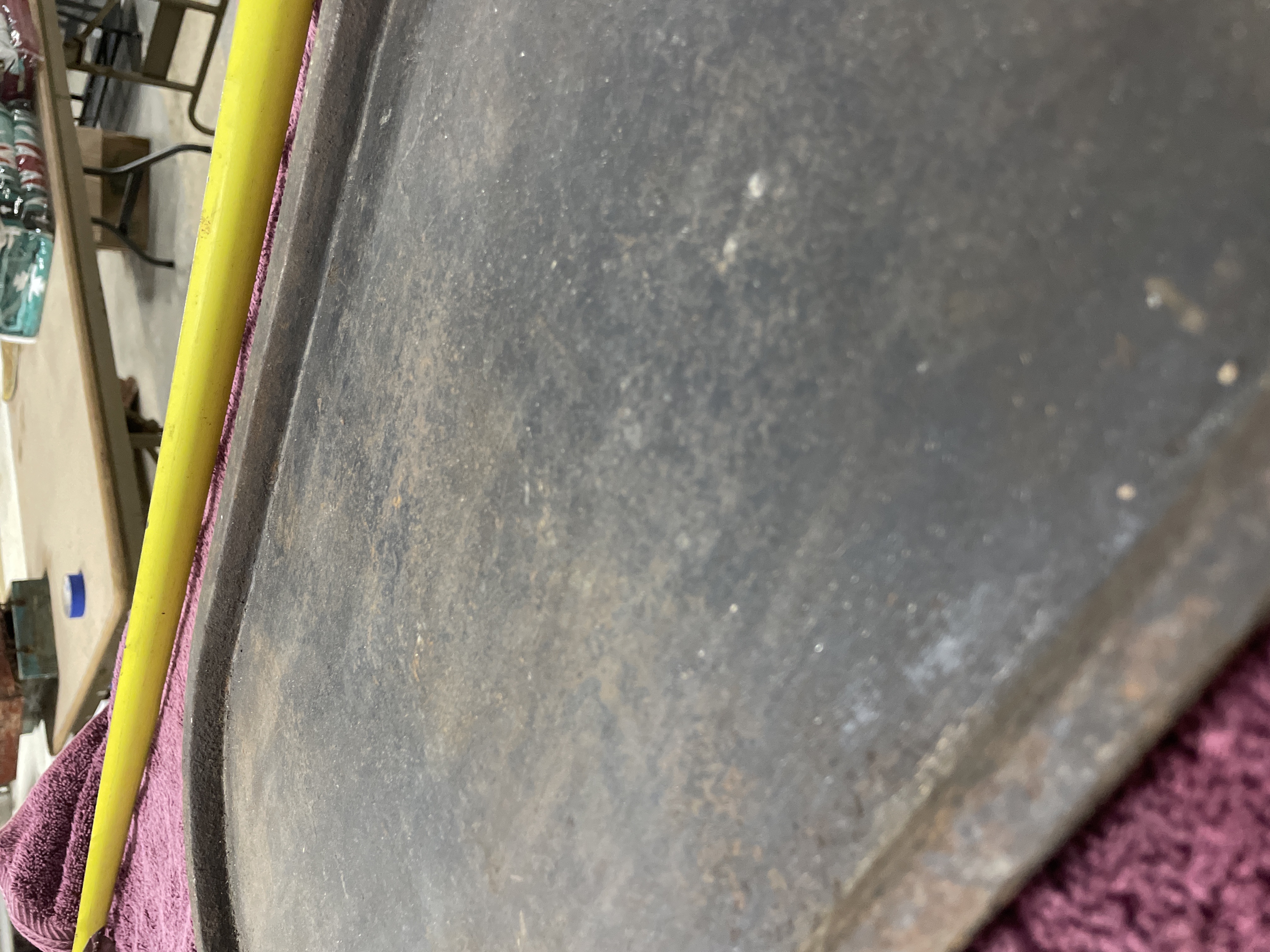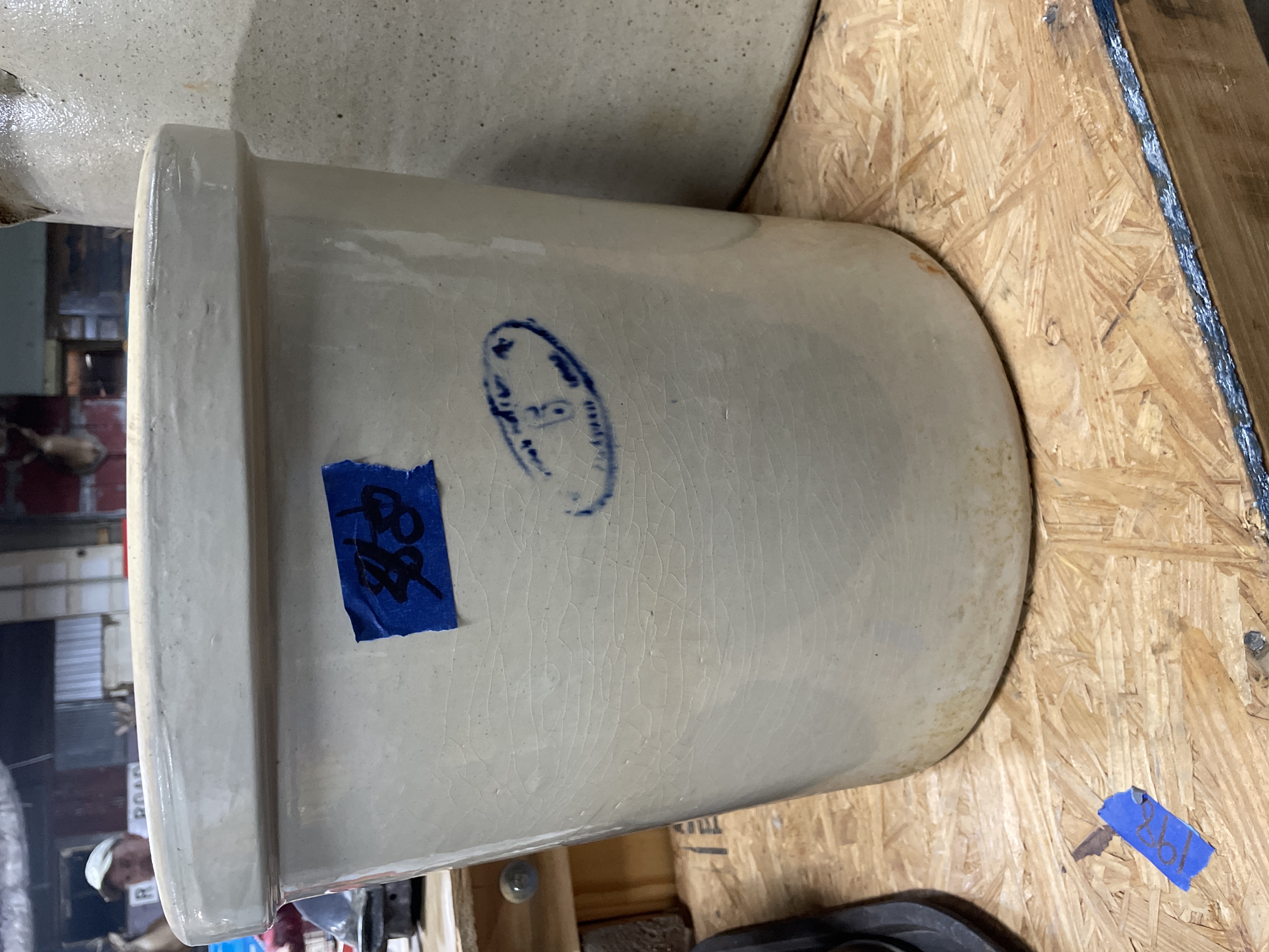 A collection comprising two distinct utilitarian items: a stoneware crock and a cast iron griddle. The primary item is a large cylindrical stoneware crock attributed to Red Wing Union Stoneware, Minnesota, based on the visible markings and market consensus. The crock features a matte beige or tan glaze and is marked on the exterior with an oval blue cobalt stamp centered with the numeral ‘6’, indicating a six-gallon capacity. The second item is an oblong cast iron griddle or broiler plate of rustic construction. It features a flat cooking surface with a shallow raised rim and integral loop handles cast into the short ends. The griddle displays a heavily oxidized dark surface.