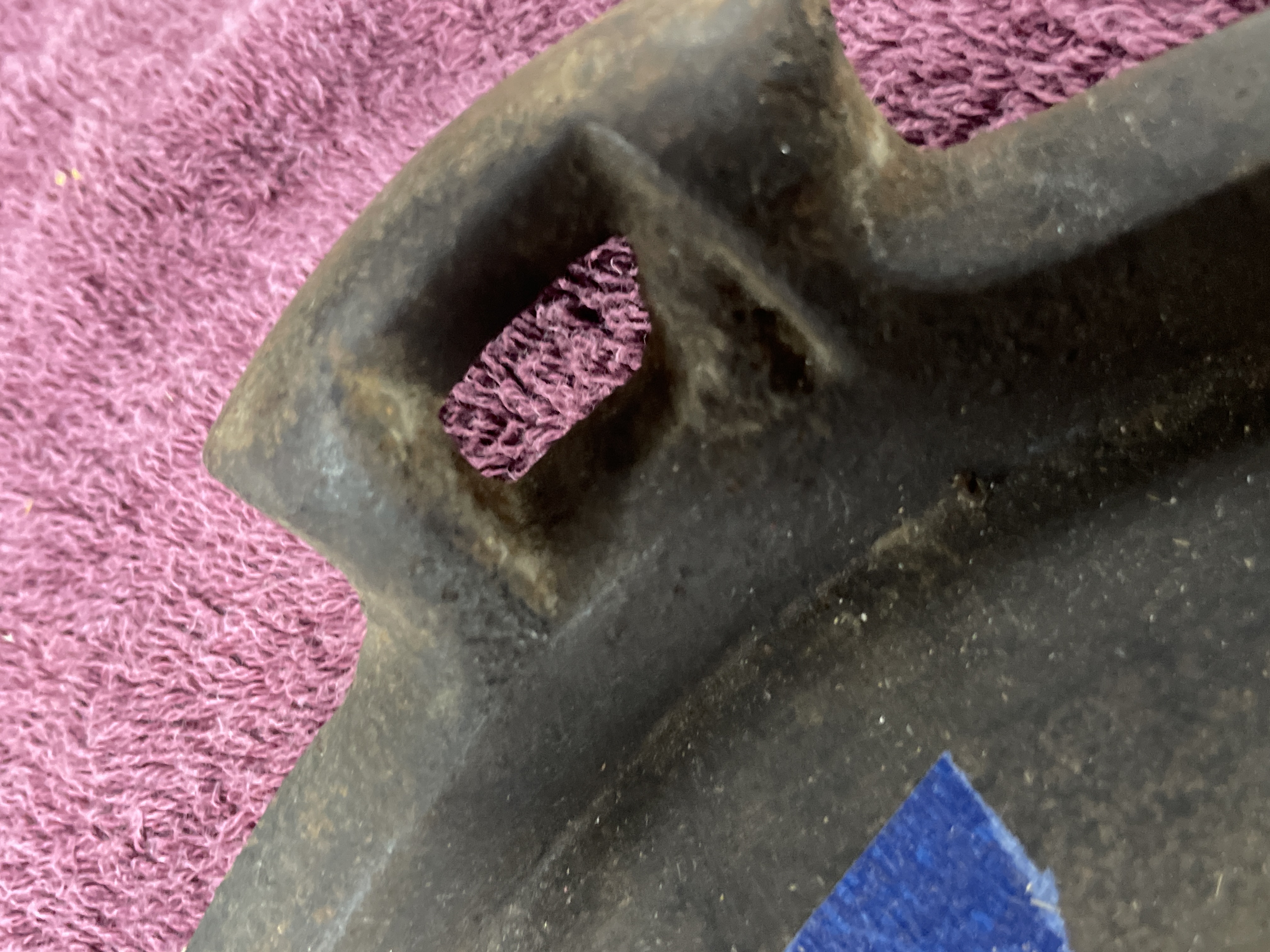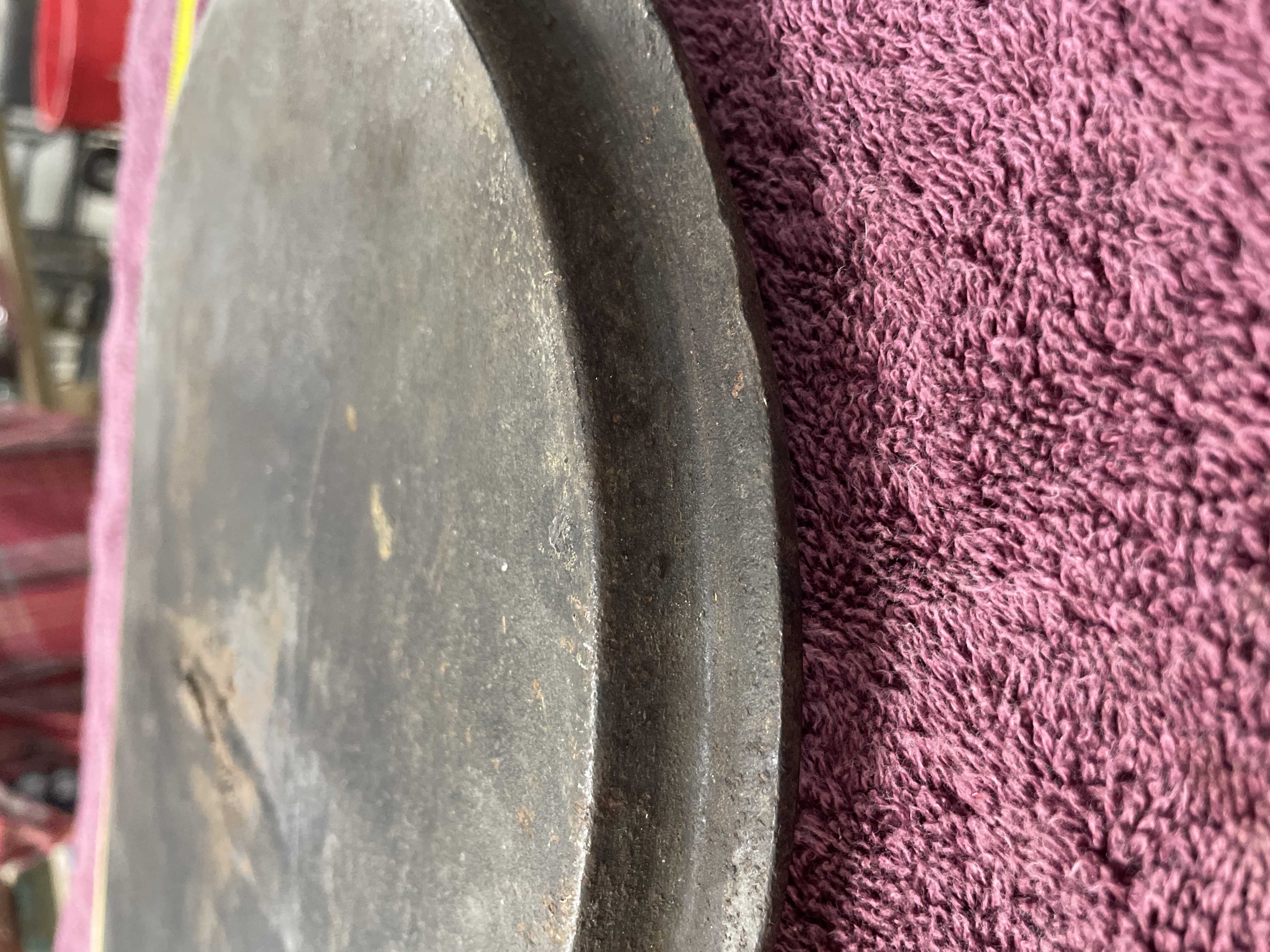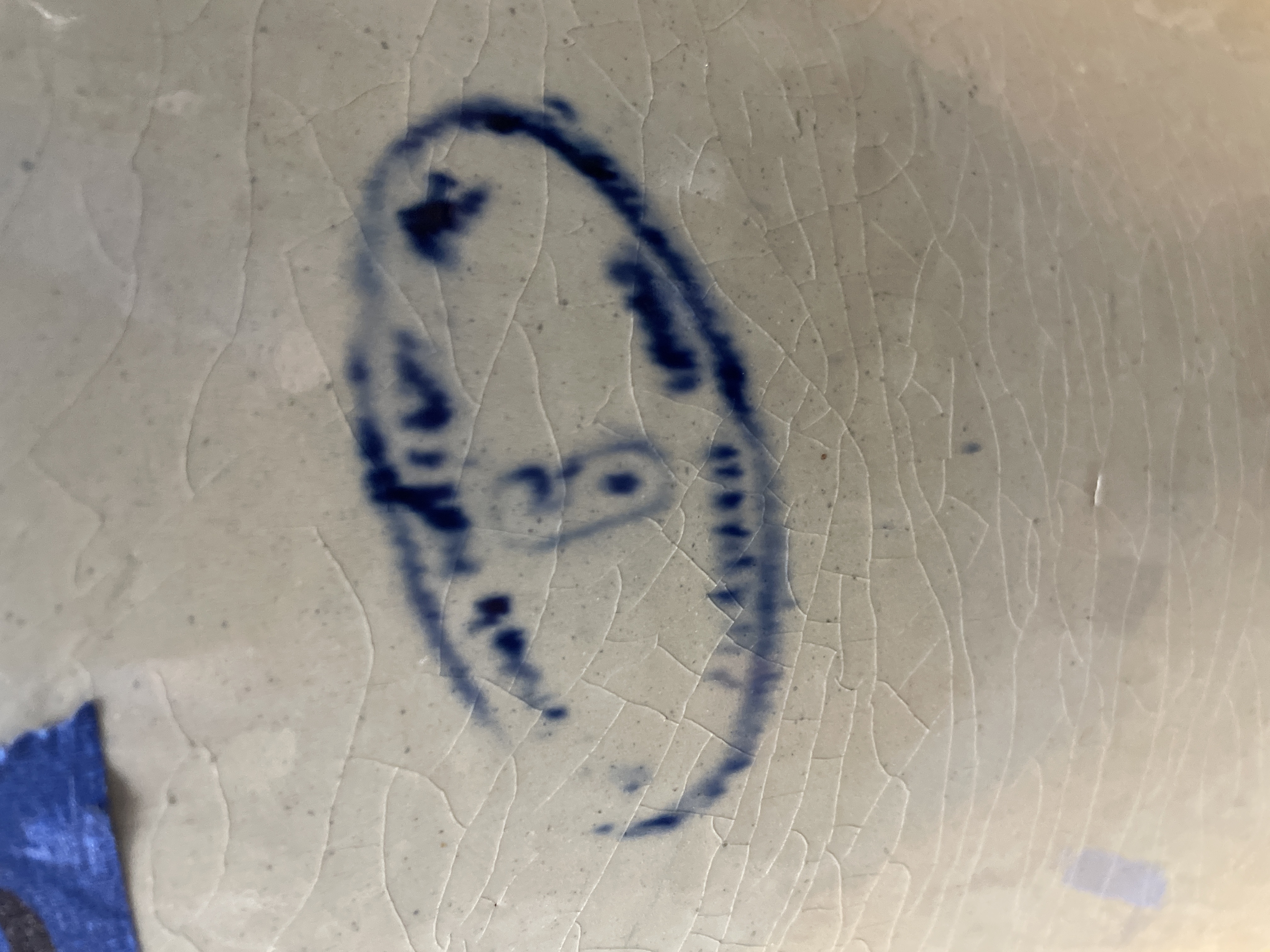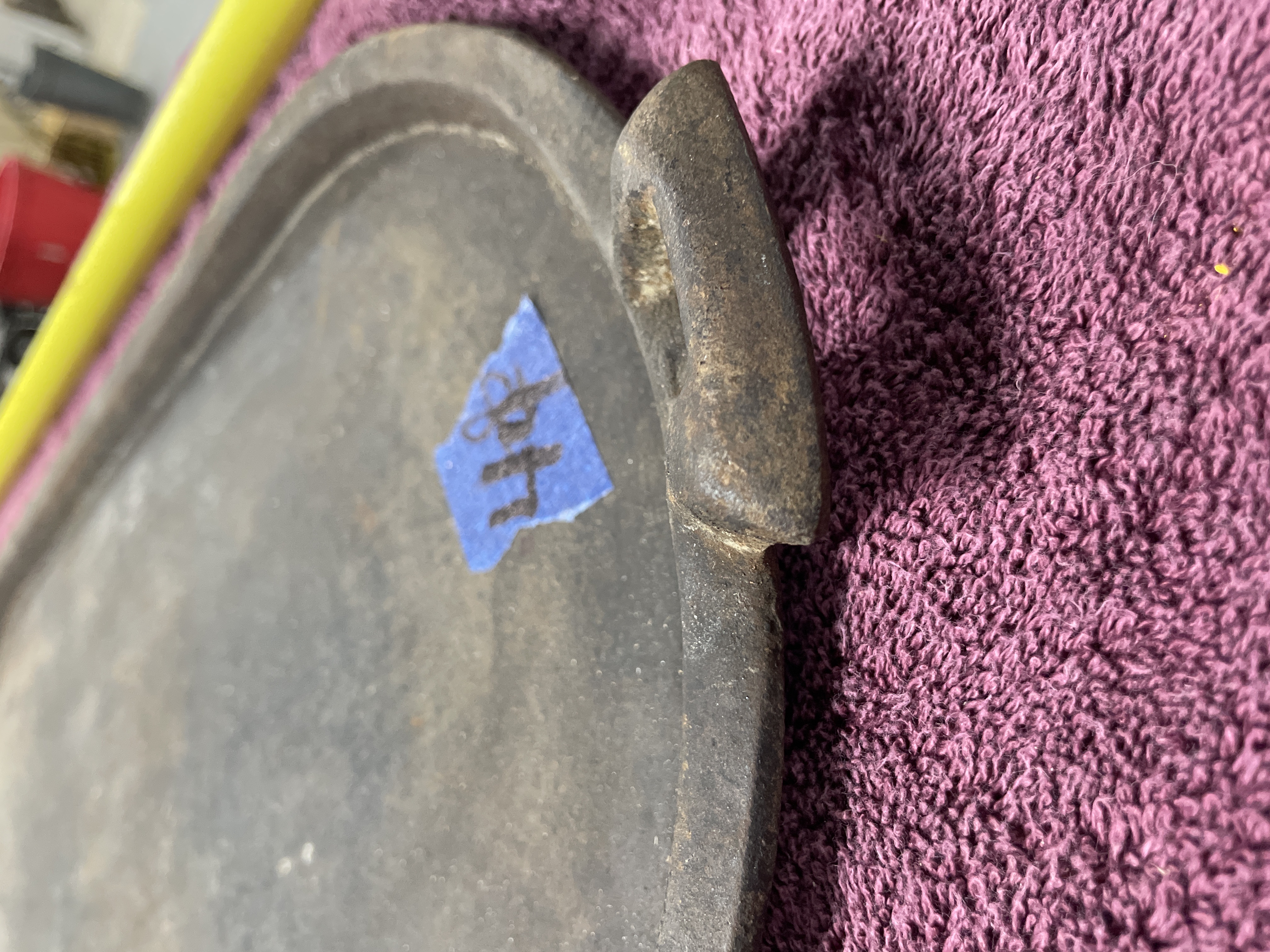 A collection comprising two distinct utilitarian items: a stoneware crock and a cast iron griddle. The primary item is a large cylindrical stoneware crock attributed to Red Wing Union Stoneware, Minnesota, based on the visible markings and market consensus. The crock features a matte beige or tan glaze and is marked on the exterior with an oval blue cobalt stamp centered with the numeral ‘6’, indicating a six-gallon capacity. The second item is an oblong cast iron griddle or broiler plate of rustic construction. It features a flat cooking surface with a shallow raised rim and integral loop handles cast into the short ends. The griddle displays a heavily oxidized dark surface.