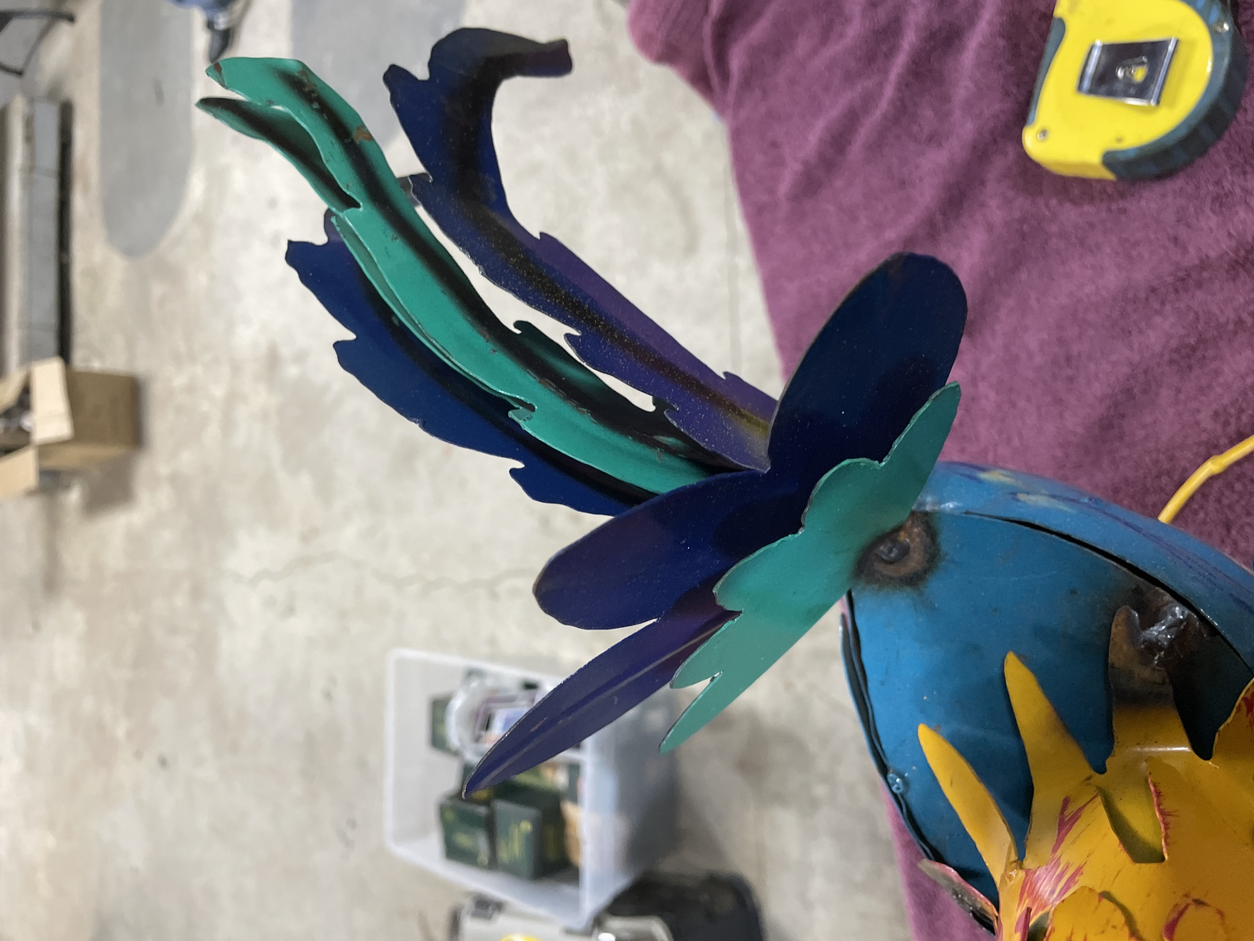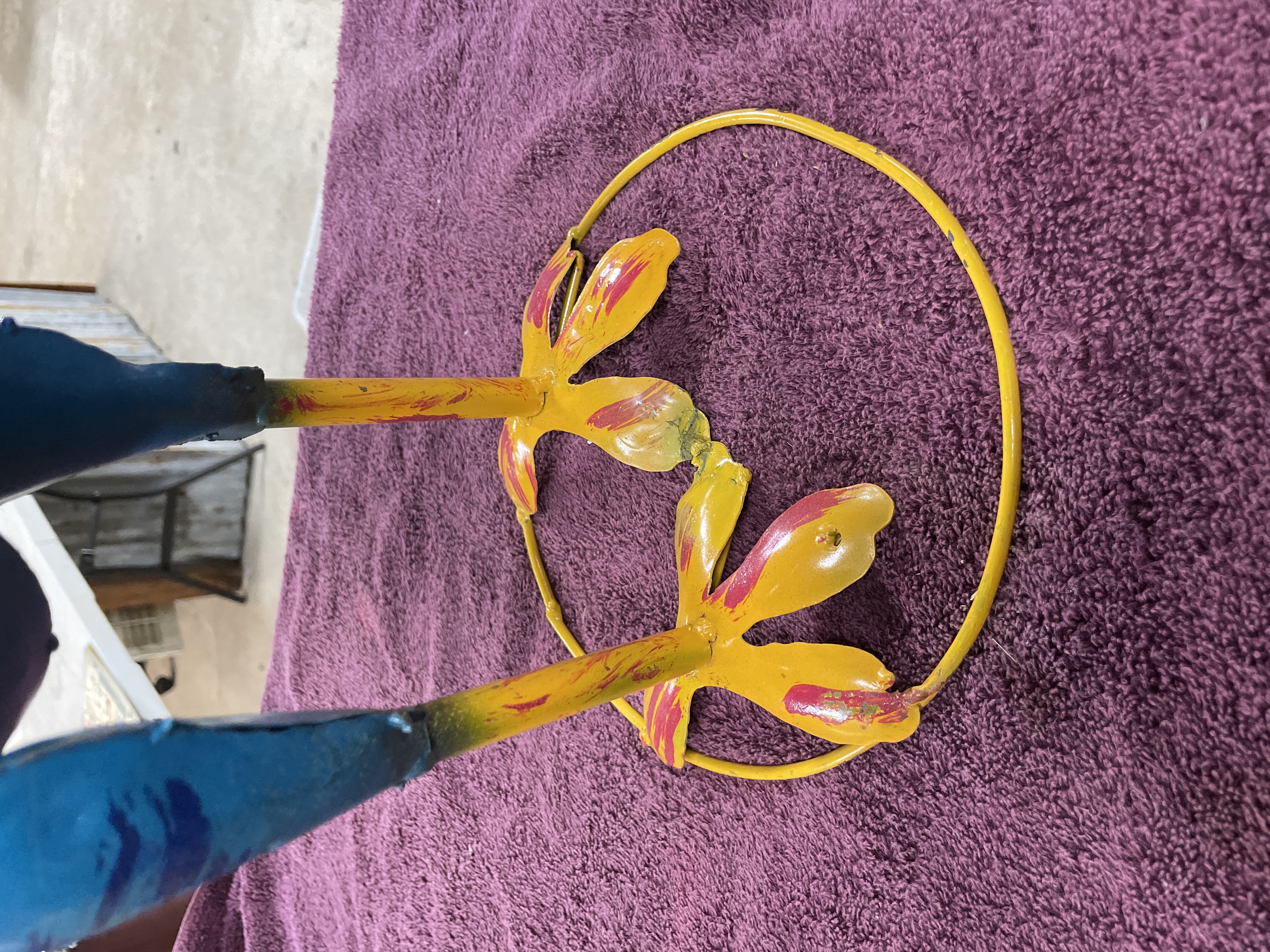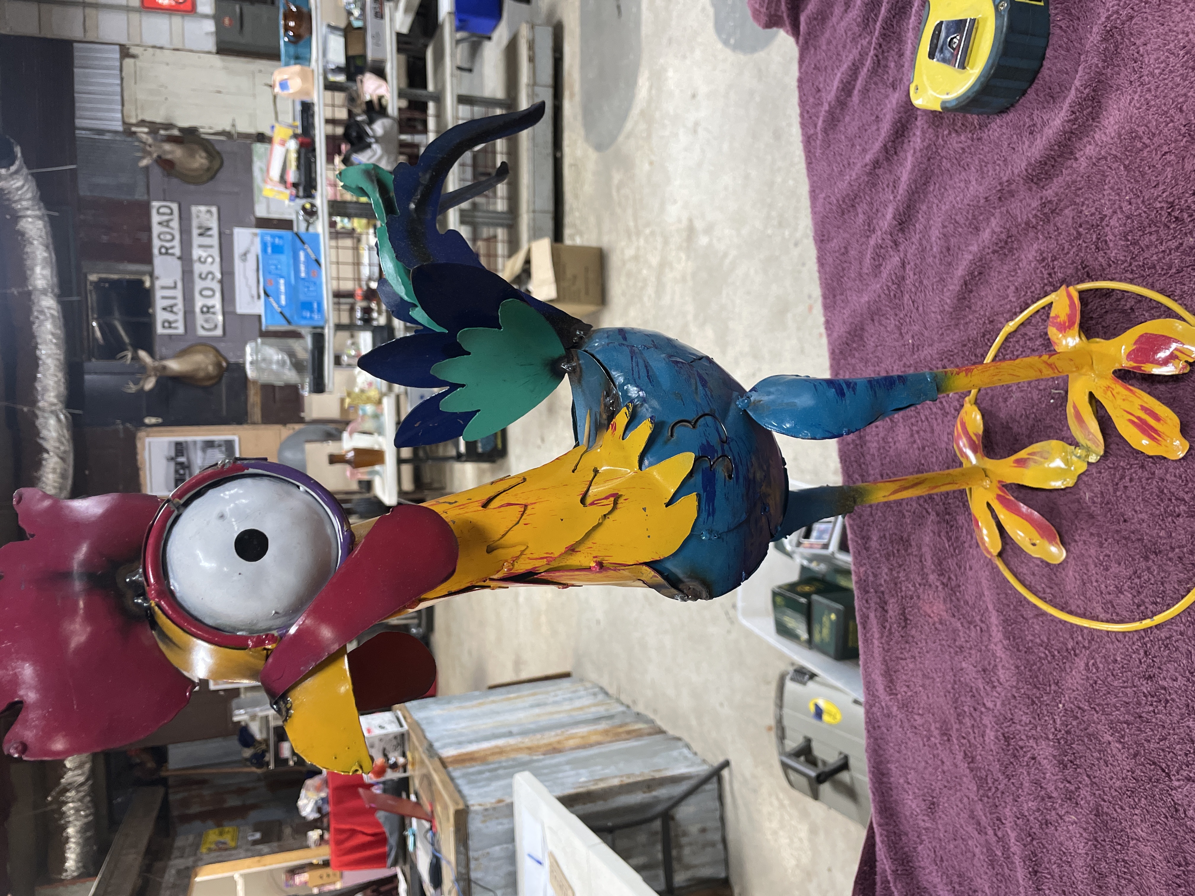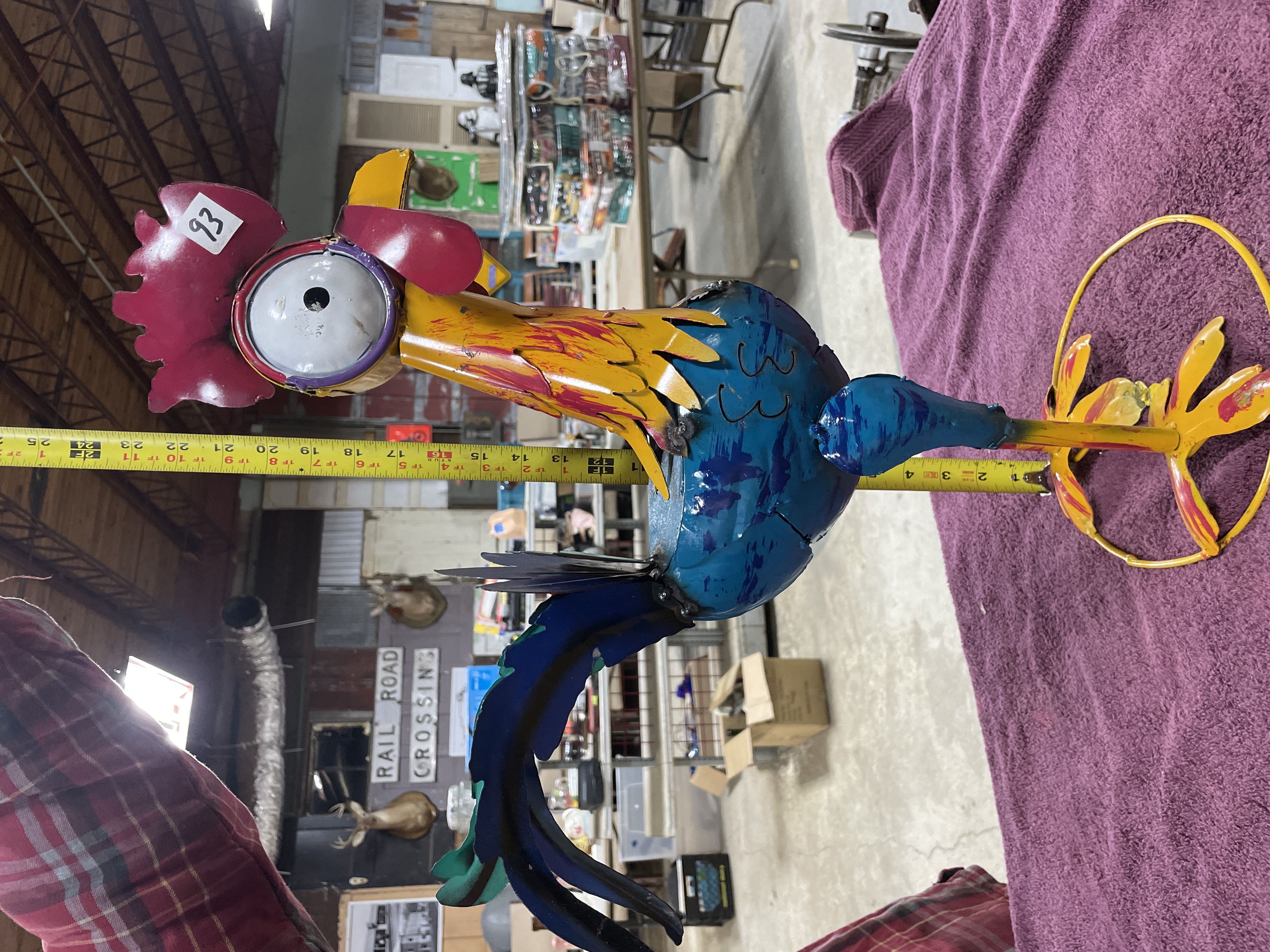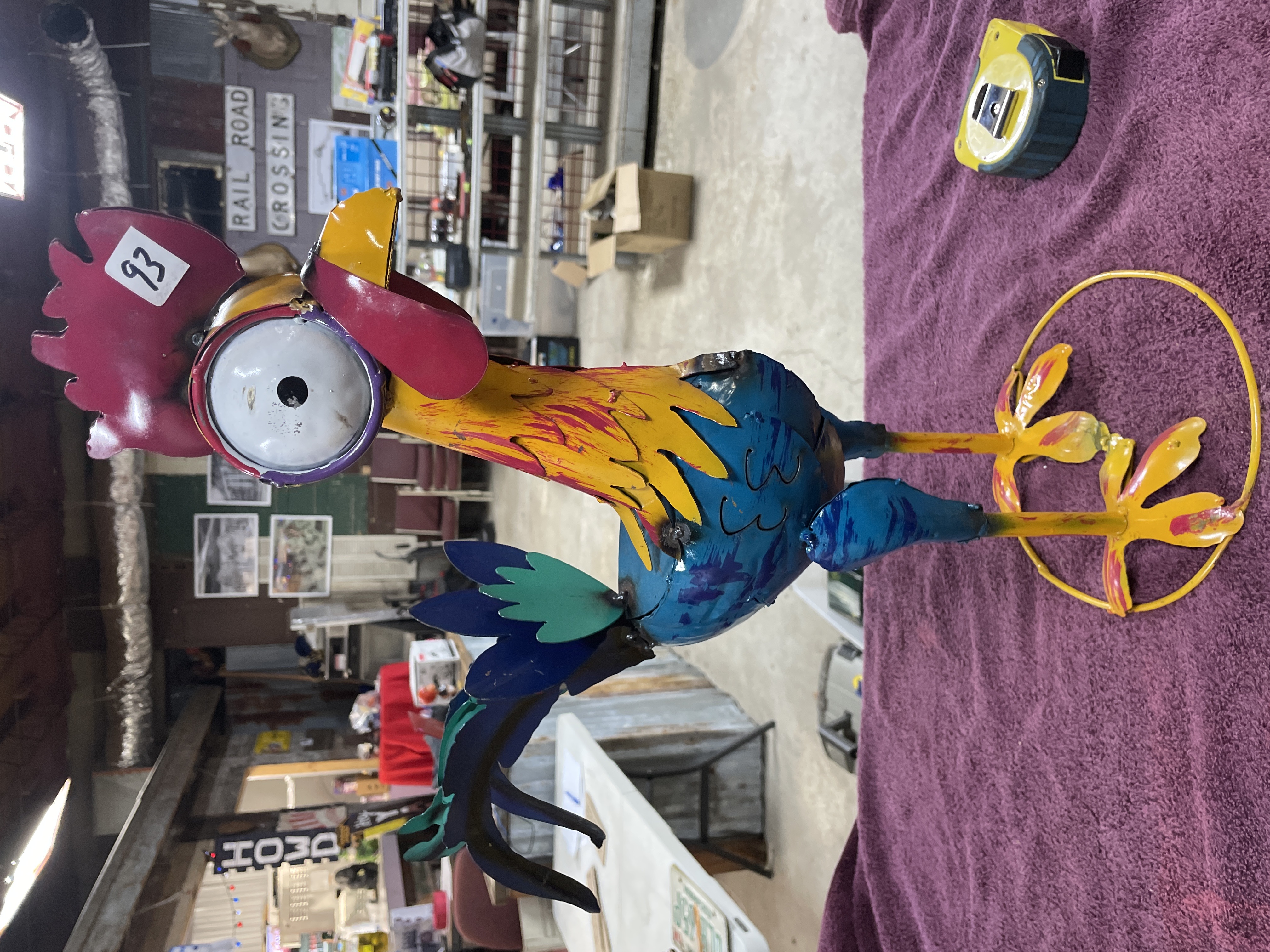 A single folk art sculpture depicting a rooster, constructed from welded sheet metal. The piece features exaggerated, whimsical elements, most notably a large, stylized eye with a central black pupil. The sculpture is finished in bright, deliberate strokes of paint, utilizing yellow, magenta, royal blue, teal, and red to define the plumage and features. The rooster stands on thin legs with splayed feet, stabilized by a circular yellow wire base. A white square inventory or auction tag bearing the number 93 is affixed to the red comb. The construction shows visible welds consistent with its handmade nature.