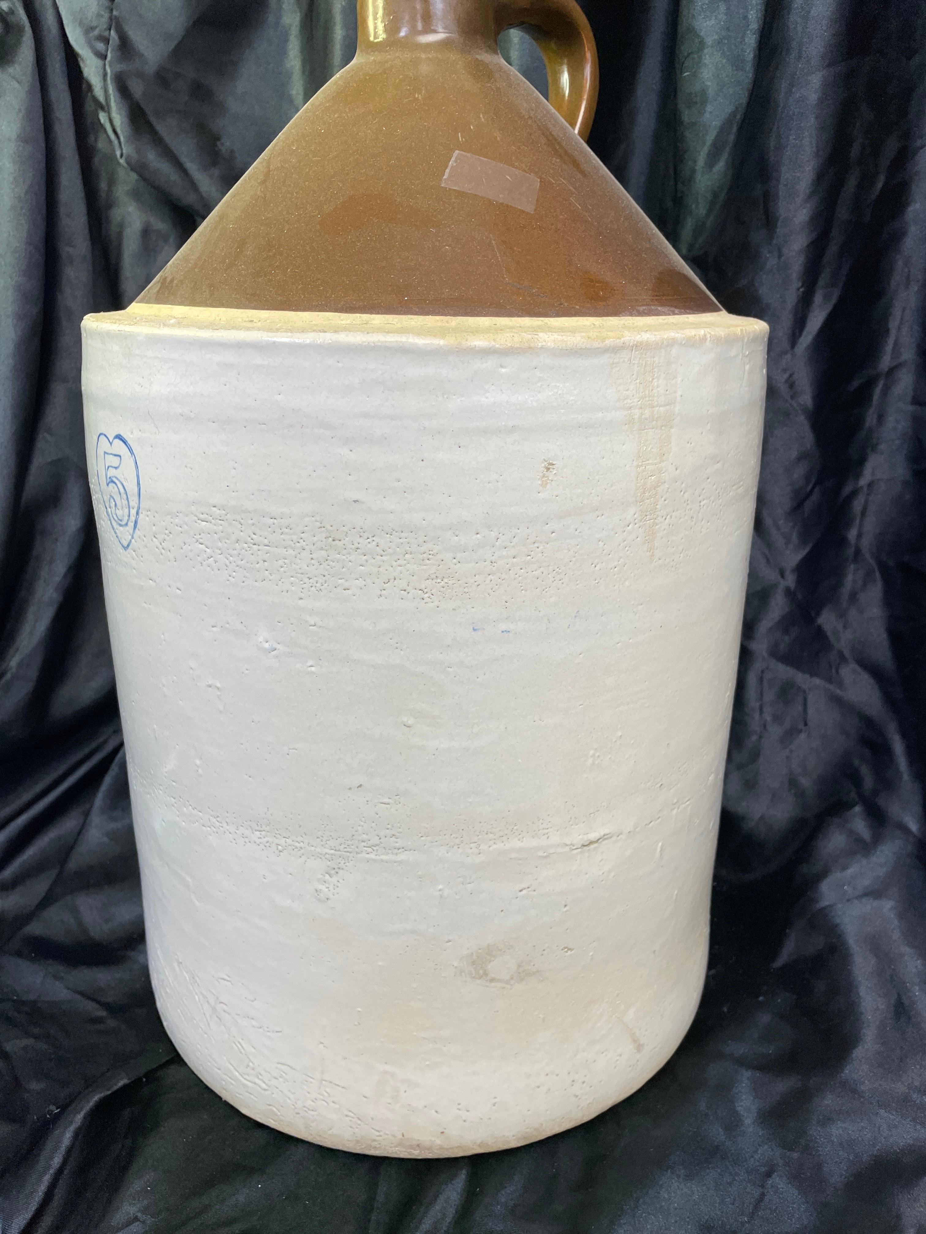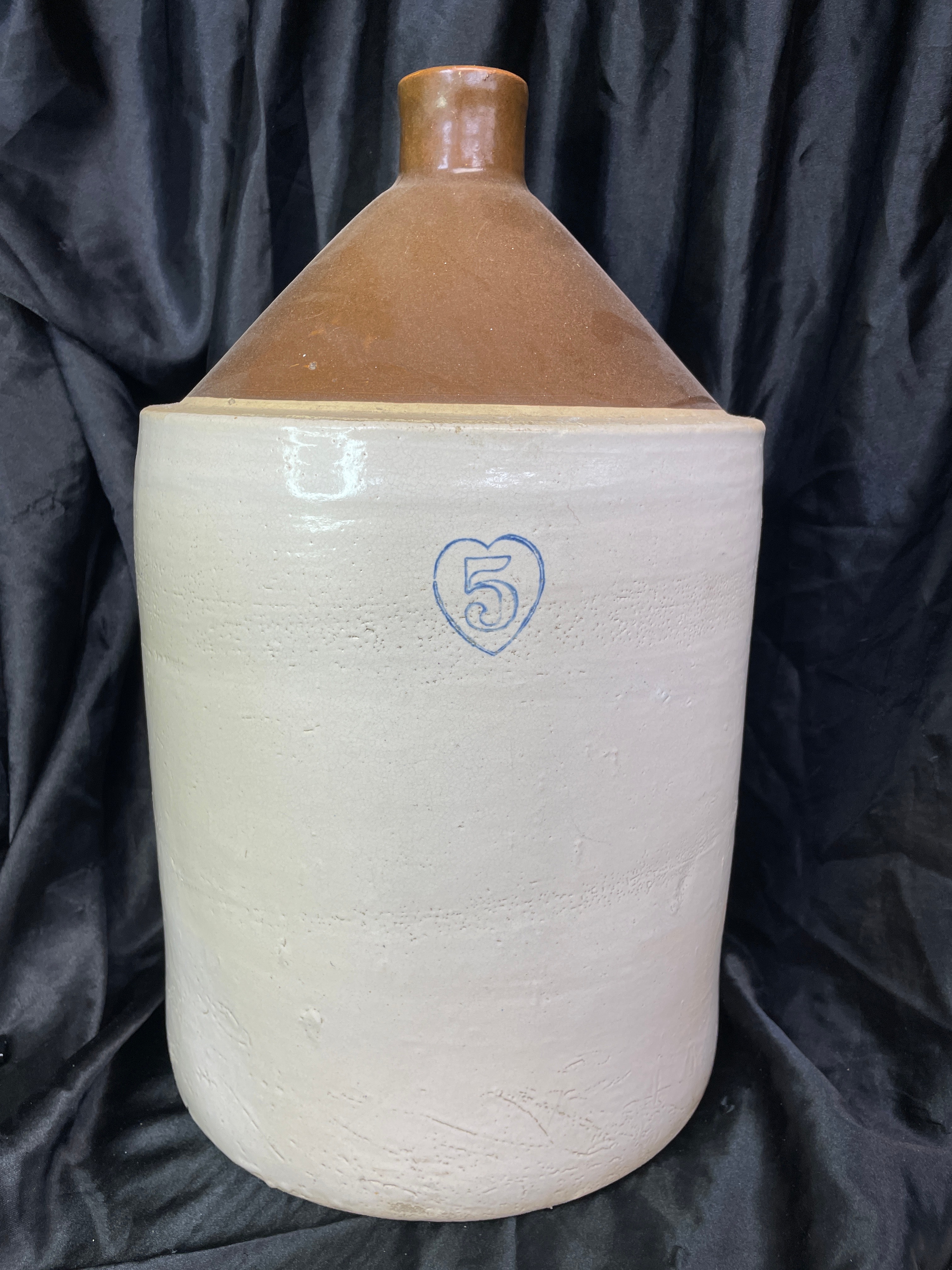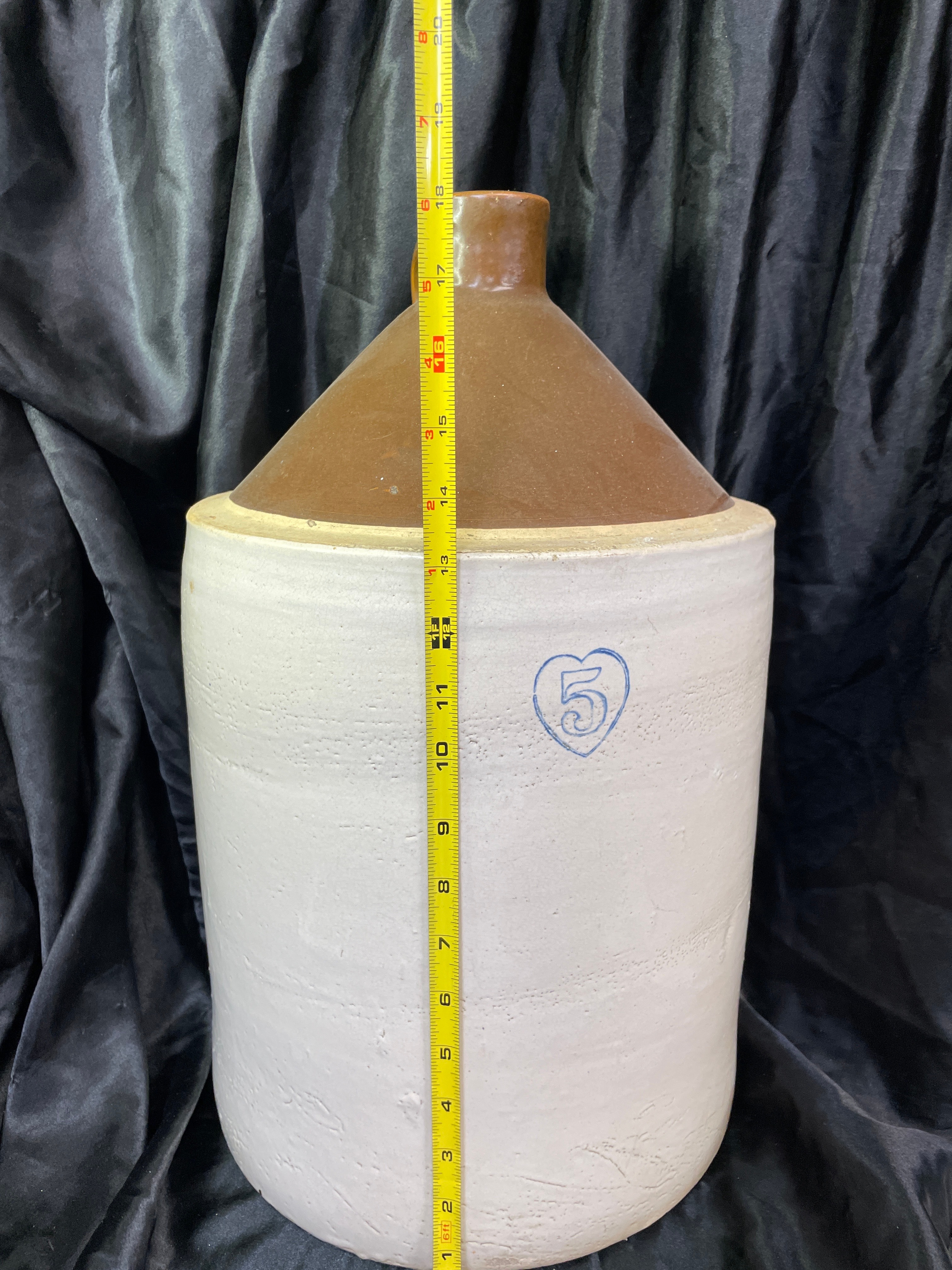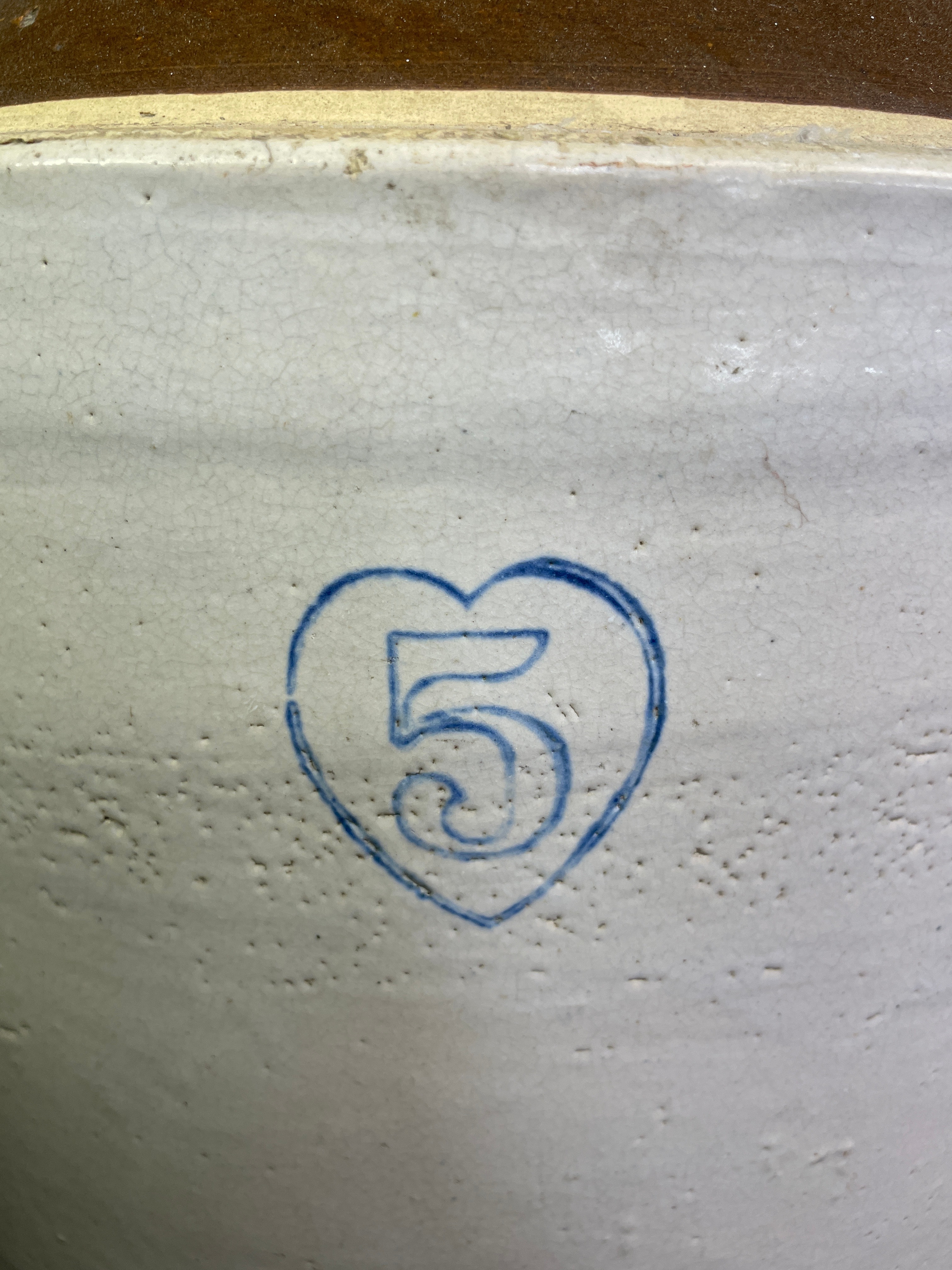 A Buckeye Pottery Co. 5 Gallon stoneware jug. This large, two-tone ceramic jug features a cylindrical lower body and a conical upper section tapering to a short spout with an attached ear handle. The lower body is an unglazed or lightly glazed off-white/cream color exhibiting fine craquelure, while the upper shoulder, spout, and handle are coated in a glossy dark brown glaze. A prominent blue stylized number “5” enclosed within a heart shape is visibly stamped on the front of the lighter-colored body.