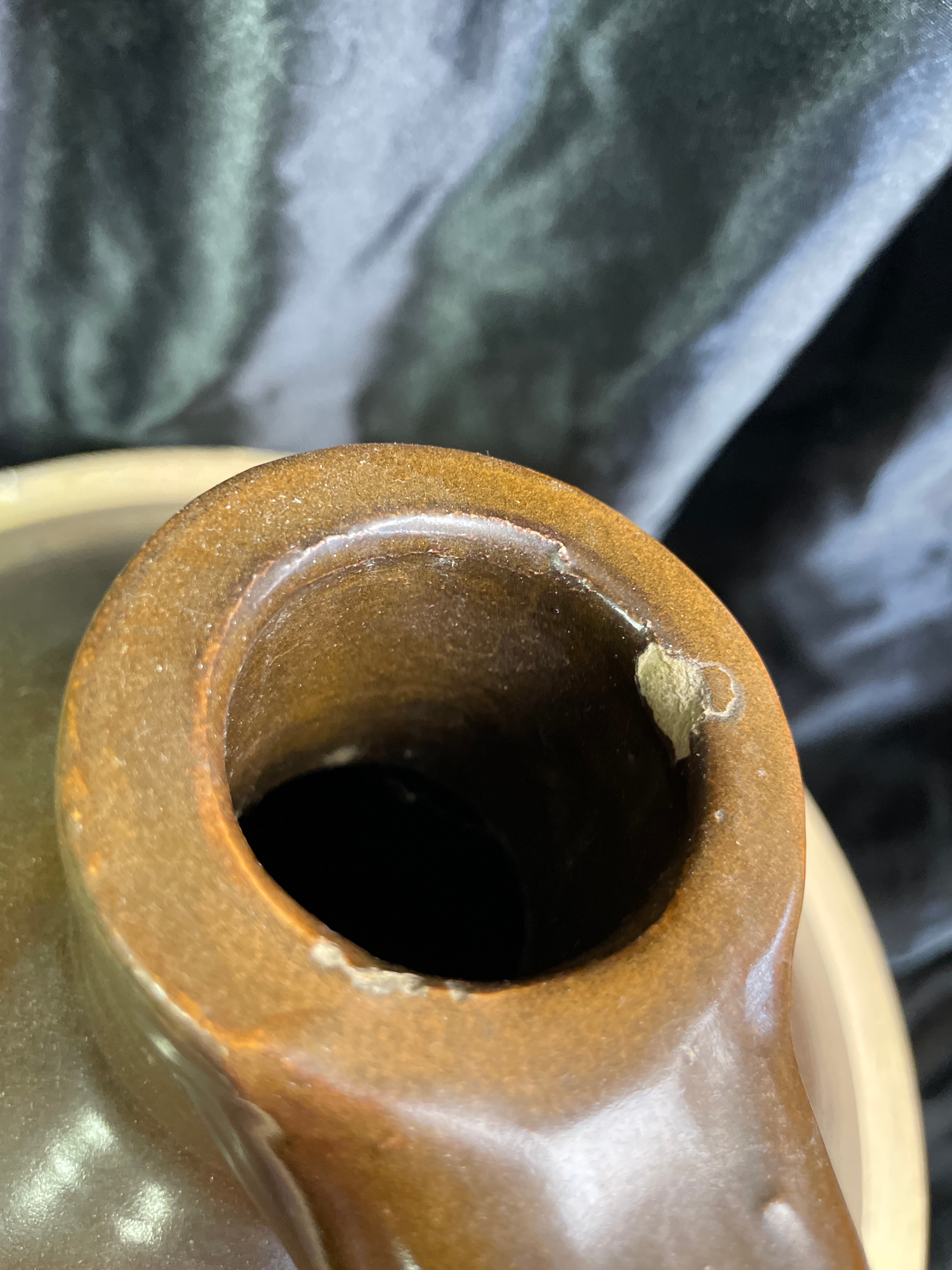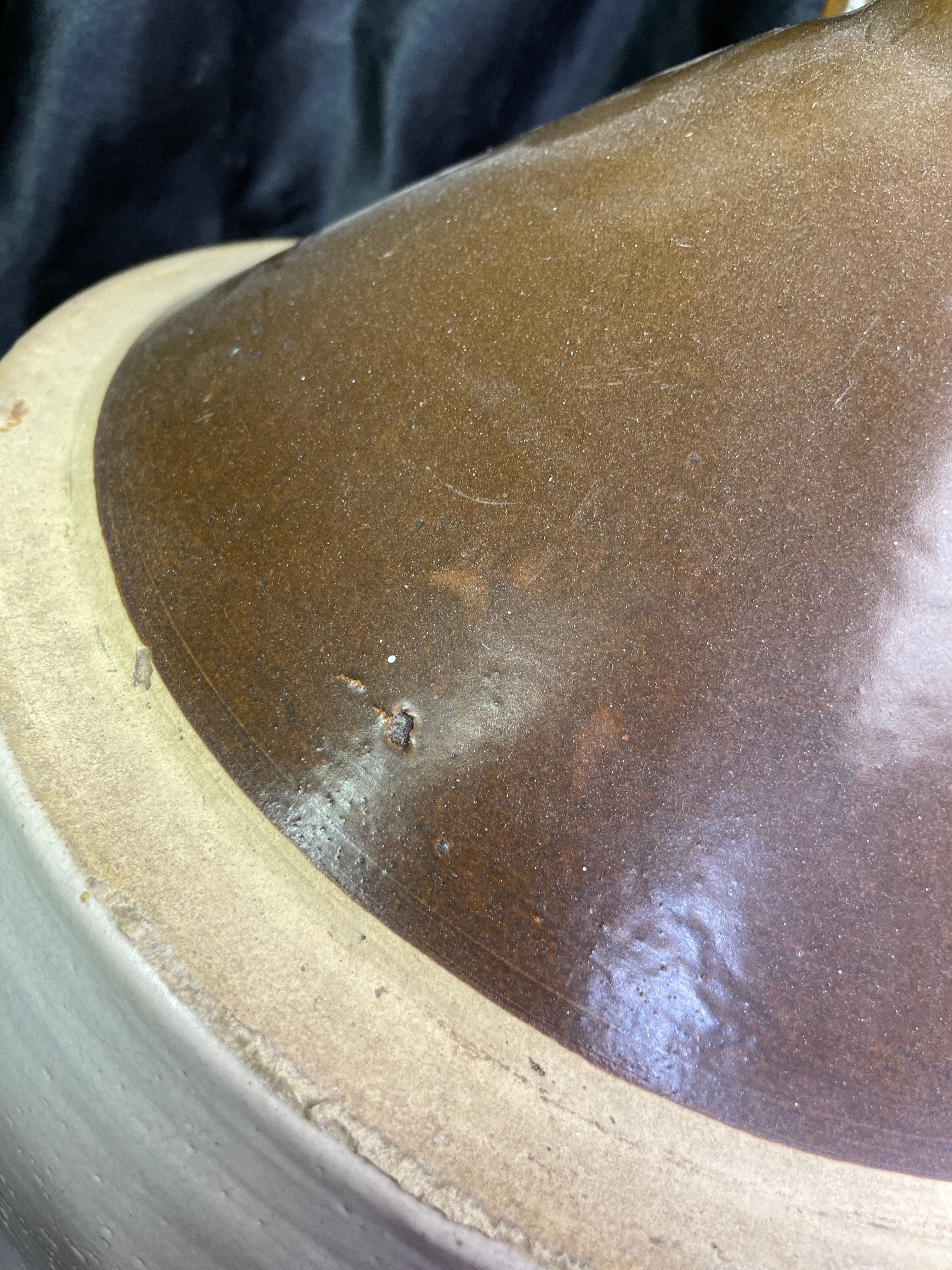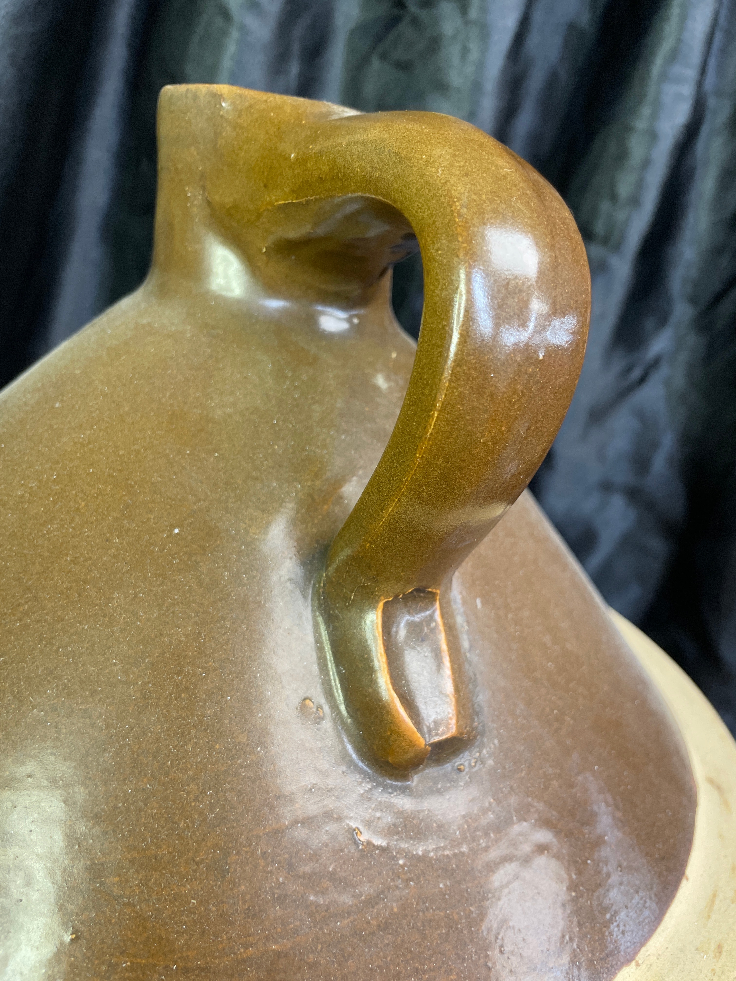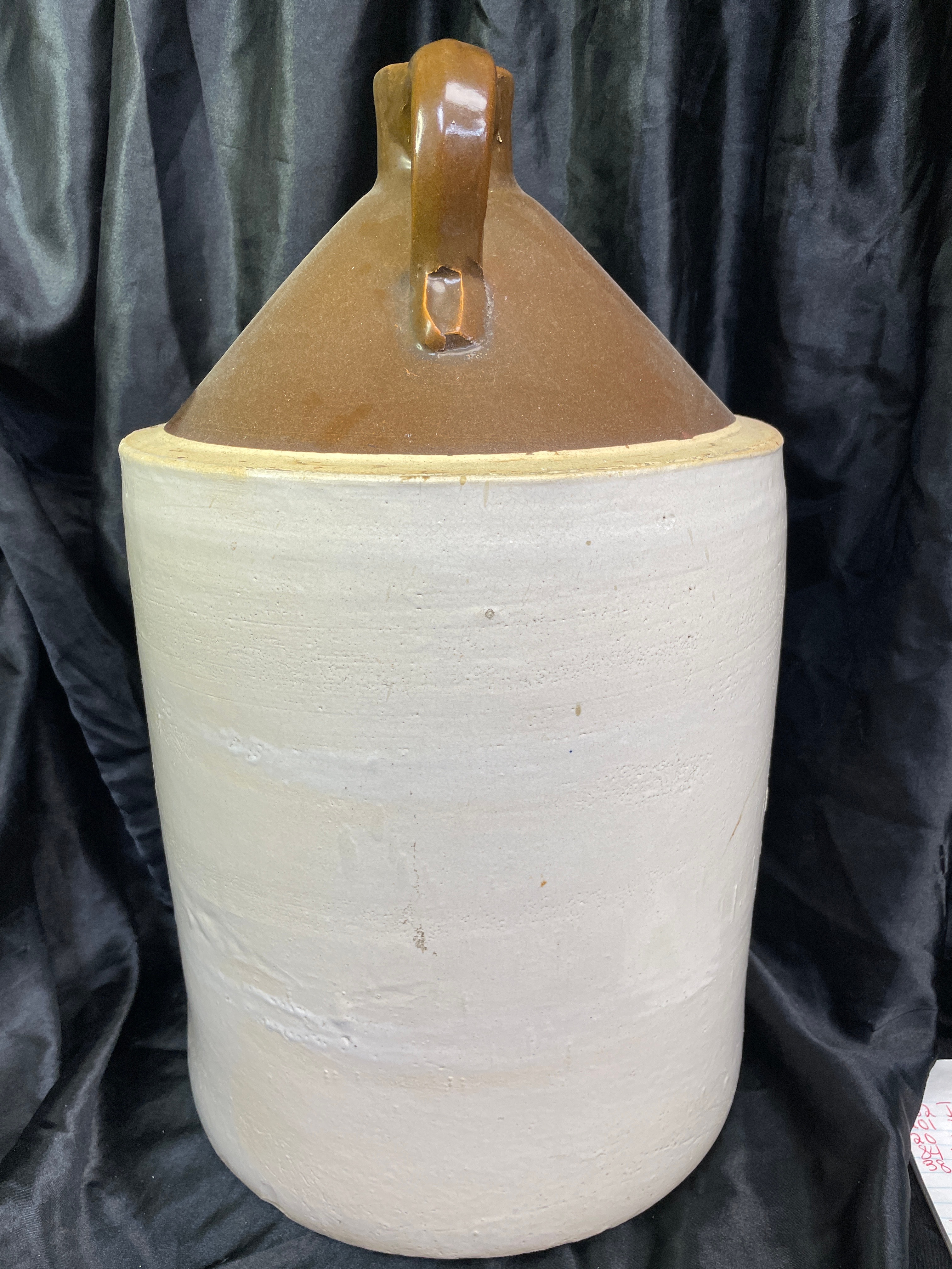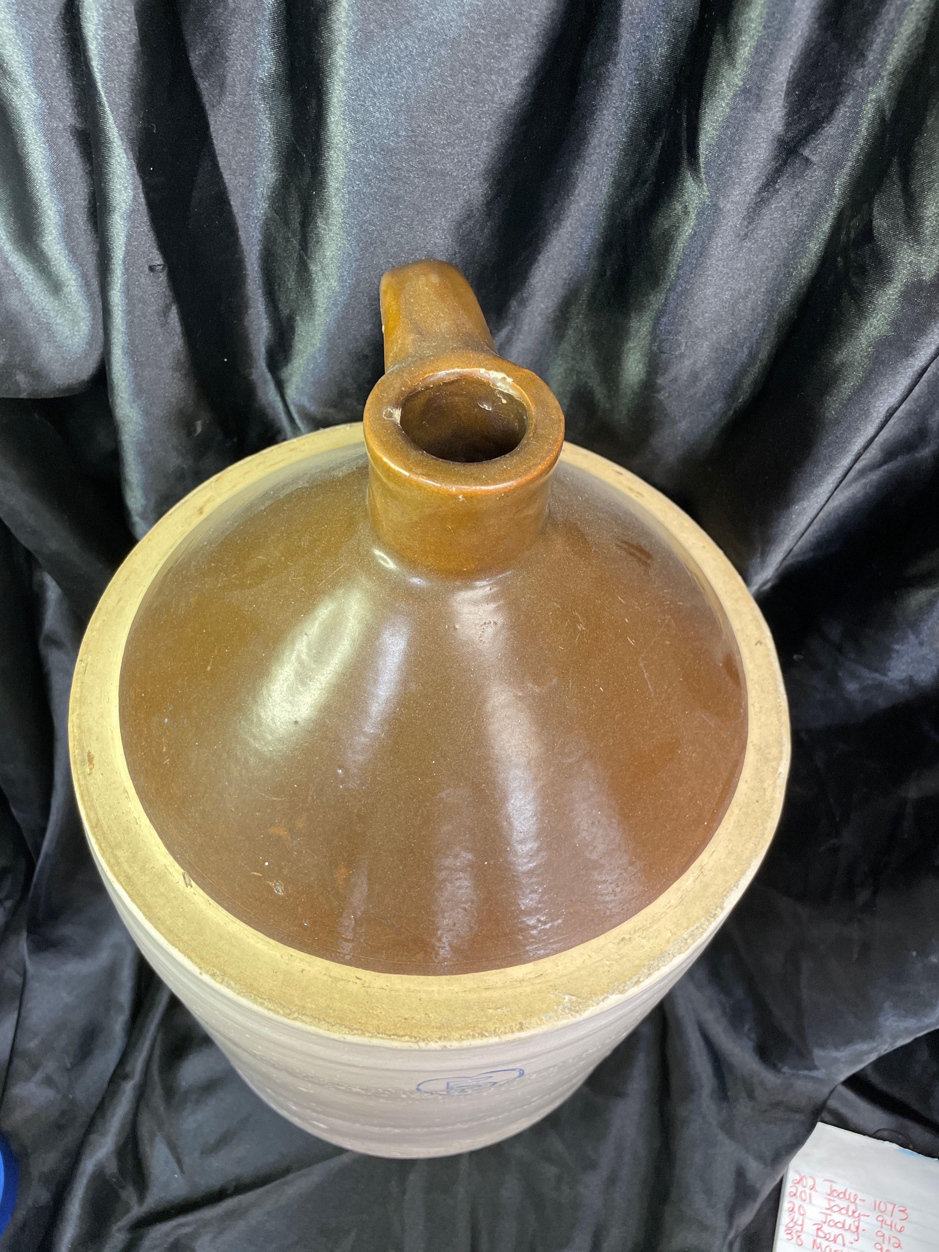 A Buckeye Pottery Co. 5 Gallon stoneware jug. This large, two-tone ceramic jug features a cylindrical lower body and a conical upper section tapering to a short spout with an attached ear handle. The lower body is an unglazed or lightly glazed off-white/cream color exhibiting fine craquelure, while the upper shoulder, spout, and handle are coated in a glossy dark brown glaze. A prominent blue stylized number “5” enclosed within a heart shape is visibly stamped on the front of the lighter-colored body.