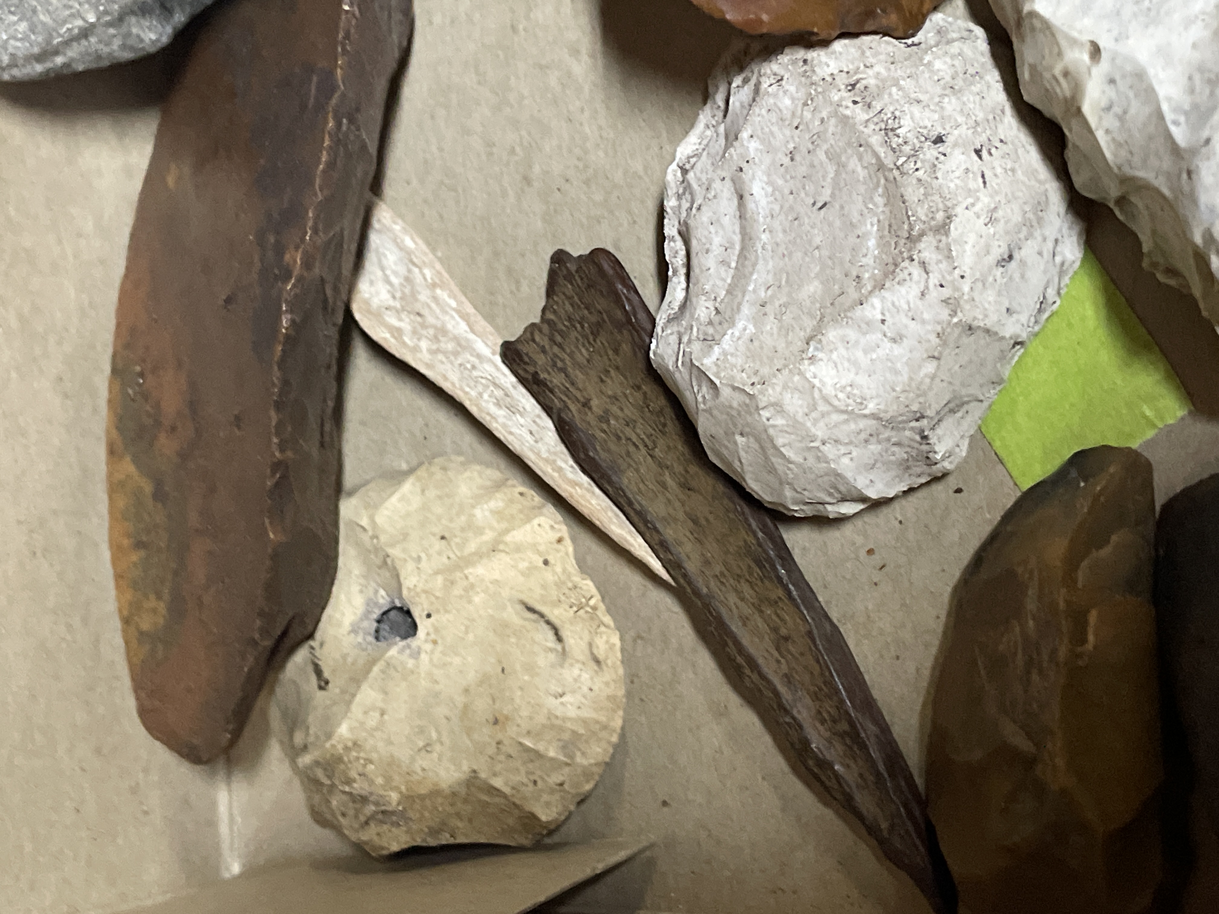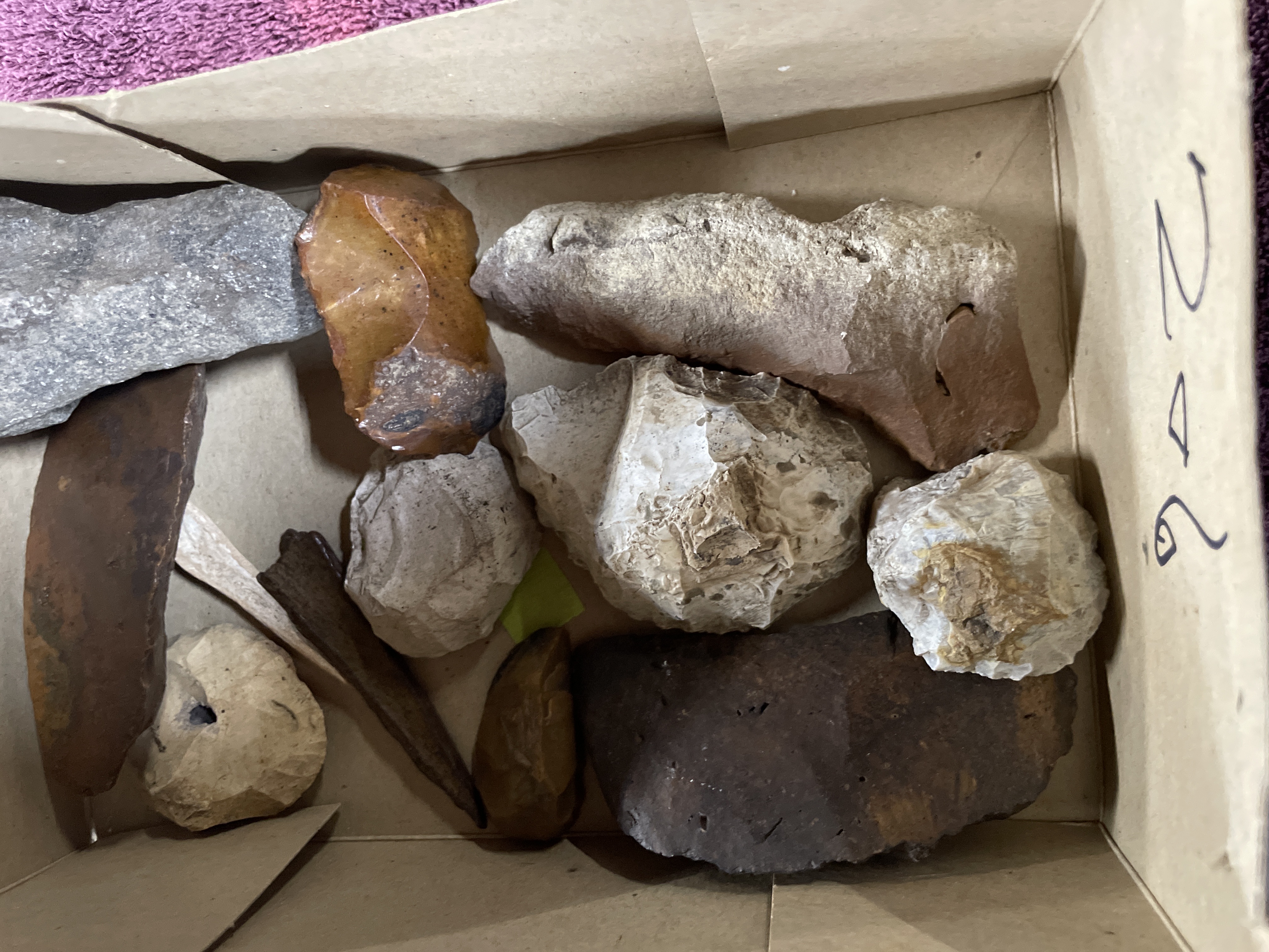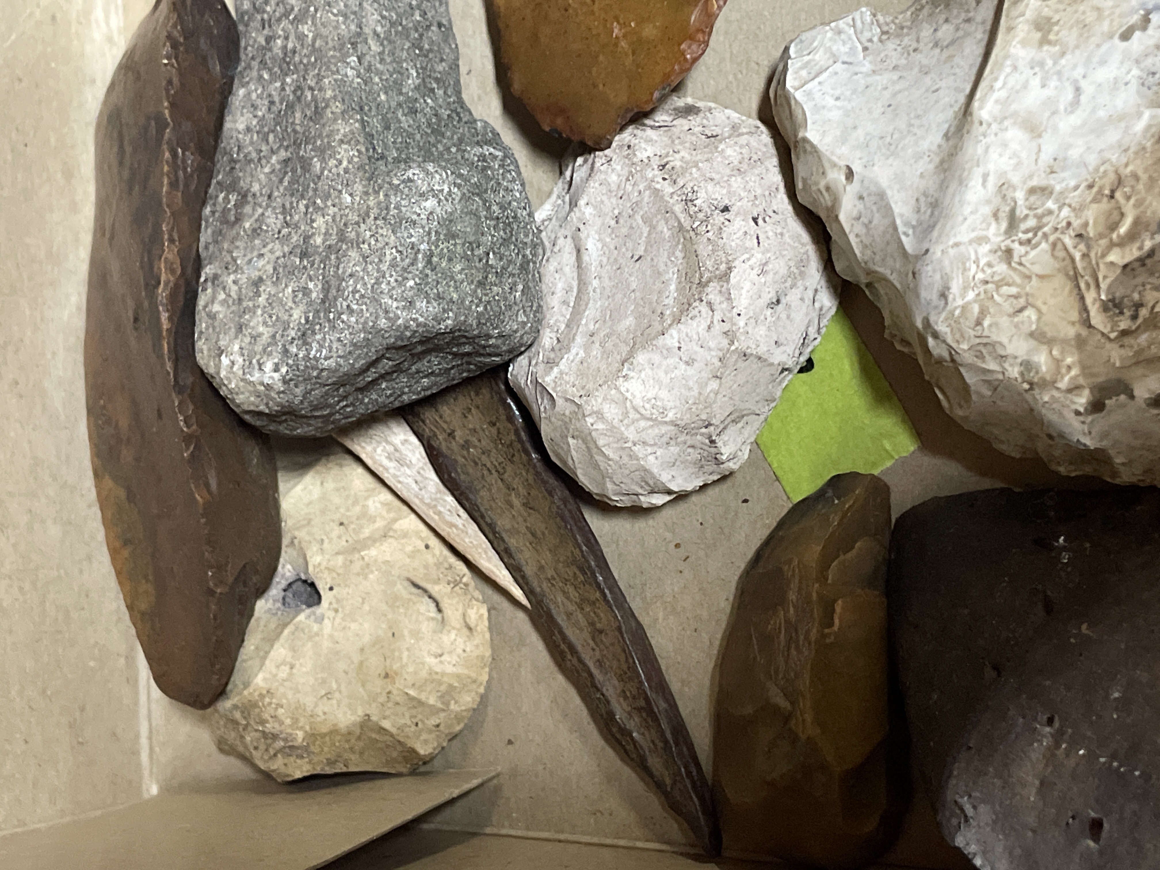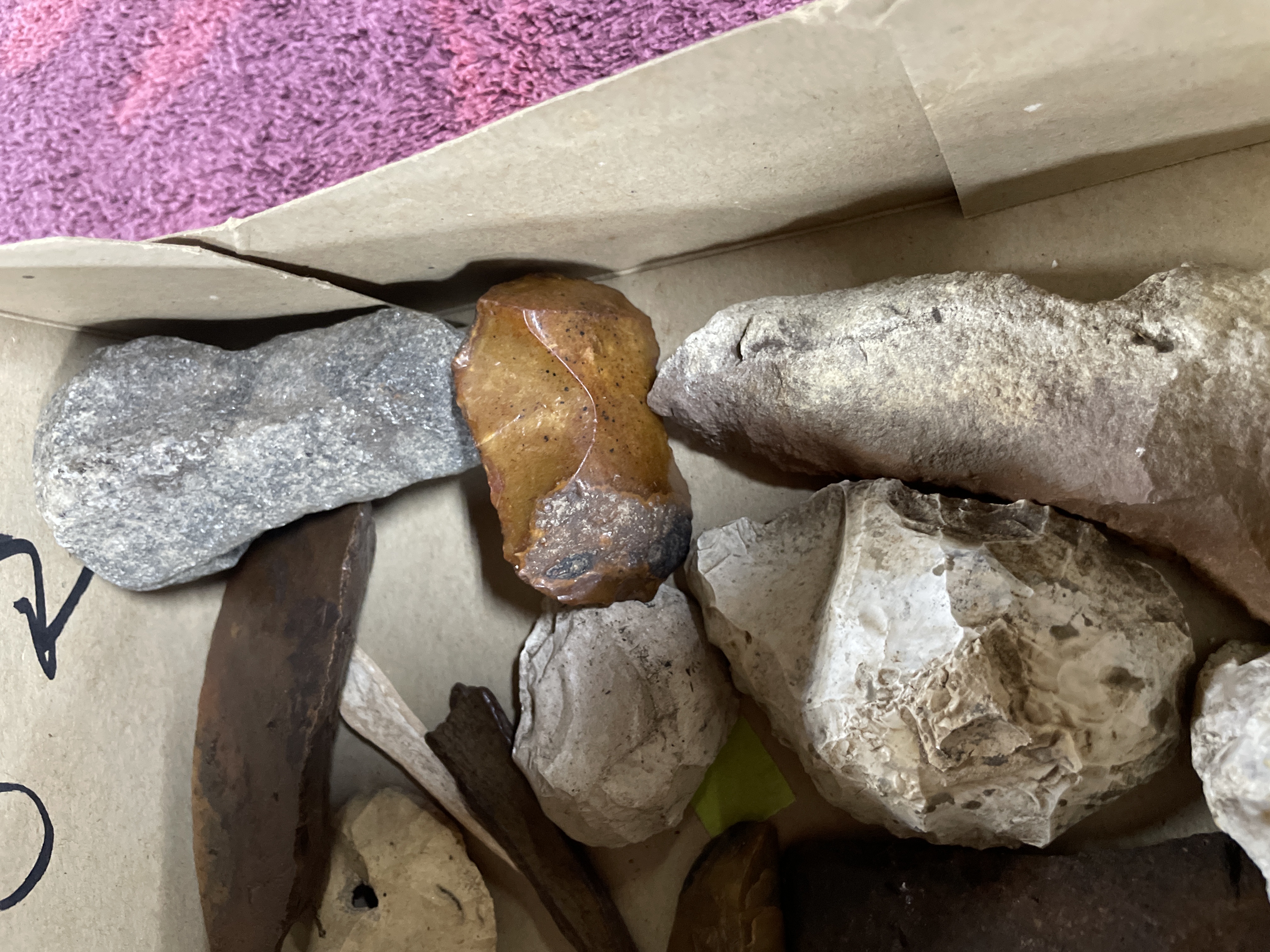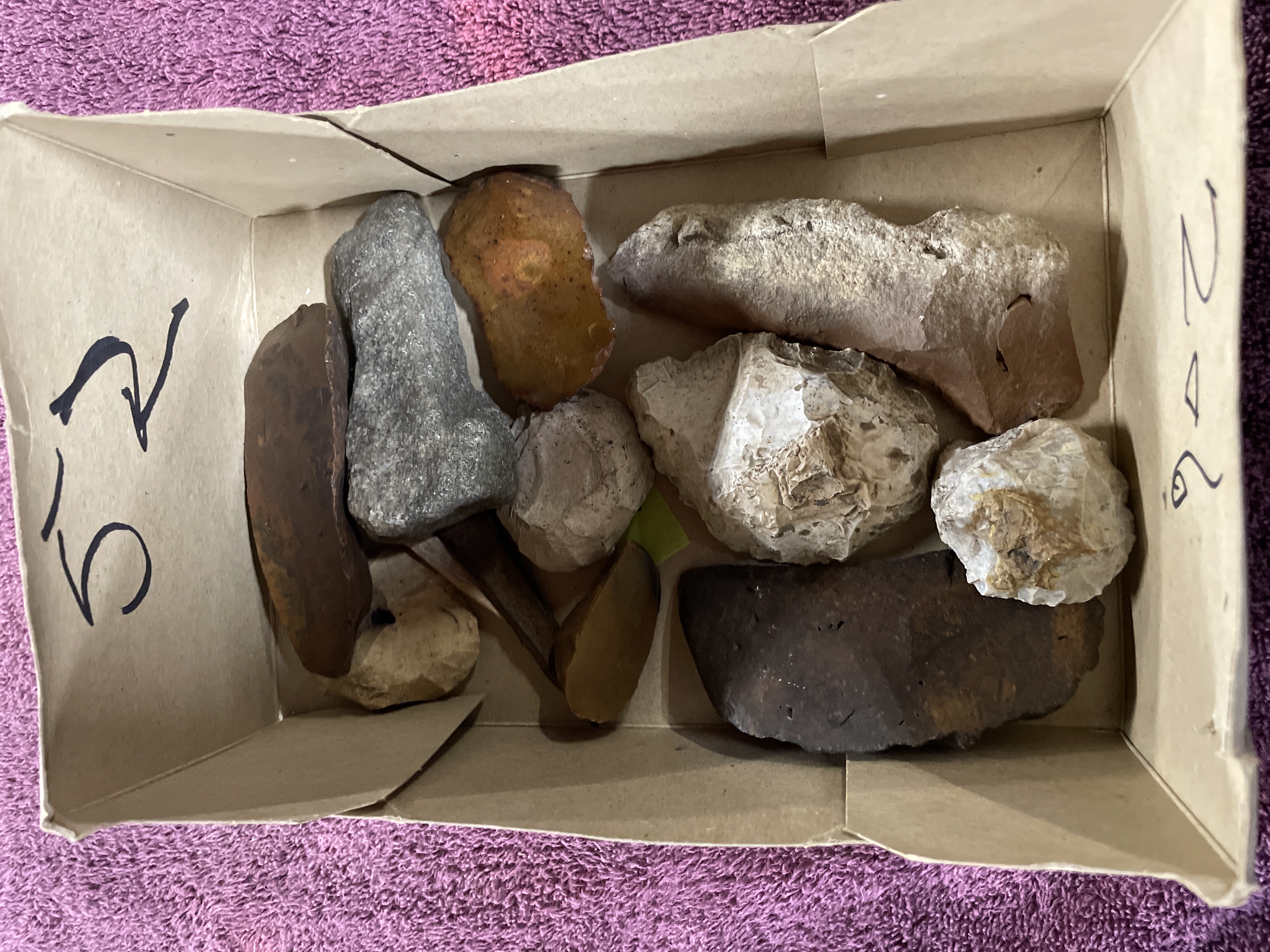 A collection of 13 geological specimens and potential lithic artifacts presented in a brown cardboard box. The assemblage includes various stone types, such as chert, flint, and quartzite. The colors range from white and light tan to dark gray, reddish-brown, and translucent amber/honey tones. Several stone specimens exhibit rough shaping, knapping, or flaking consistent with potential lithic cores or rudimentary implements. Intermixed with the stones are two elongated, pointed fragments appearing to be organic materials, possibly bone or mineralized wood. A small, bright green rectangular tag is visible among the items. Handwritten numerical markings in black marker are present on the interior box flaps: “52” is written on the upper flap, and an inverted “96” is written on the lower flap.