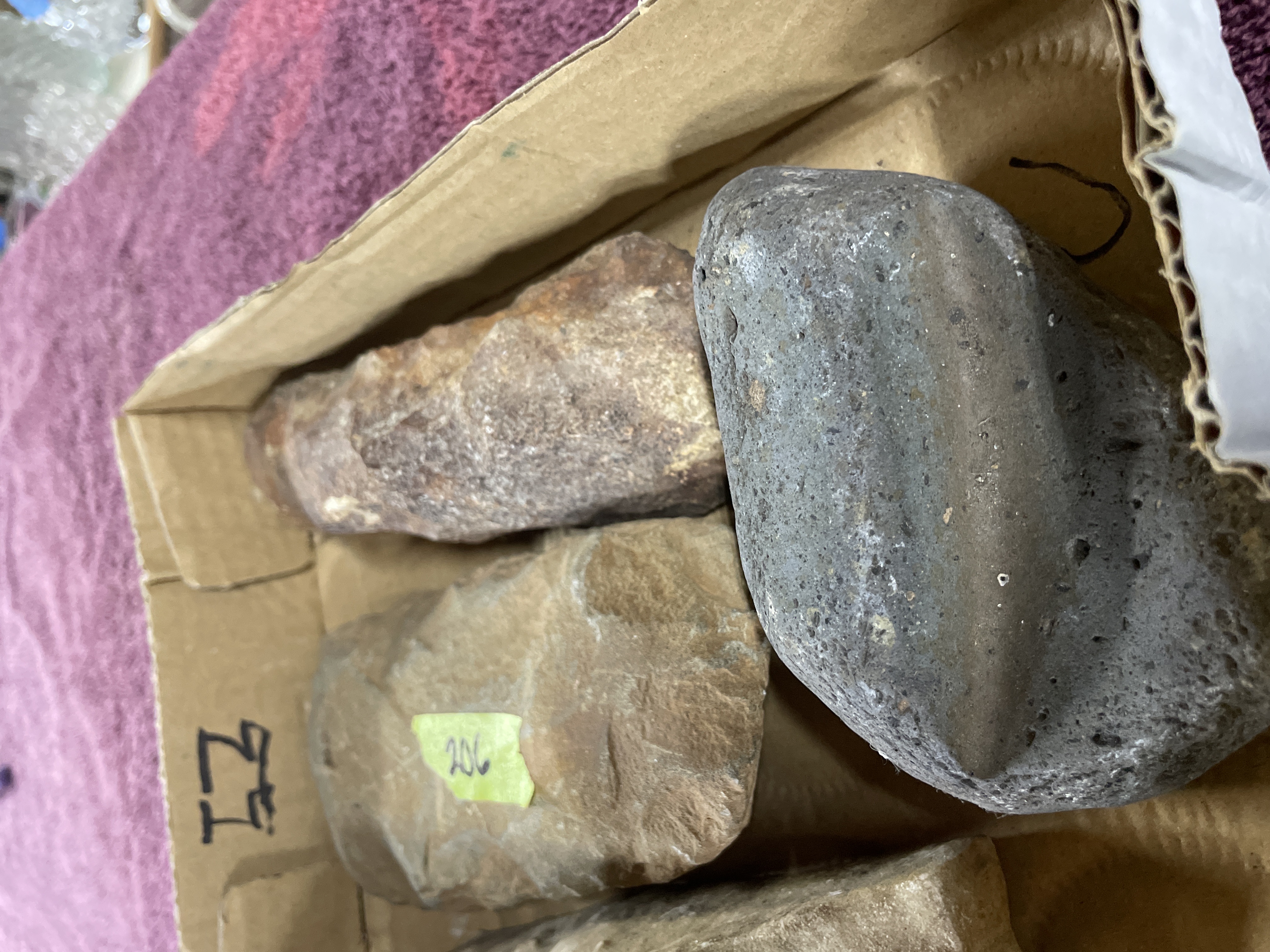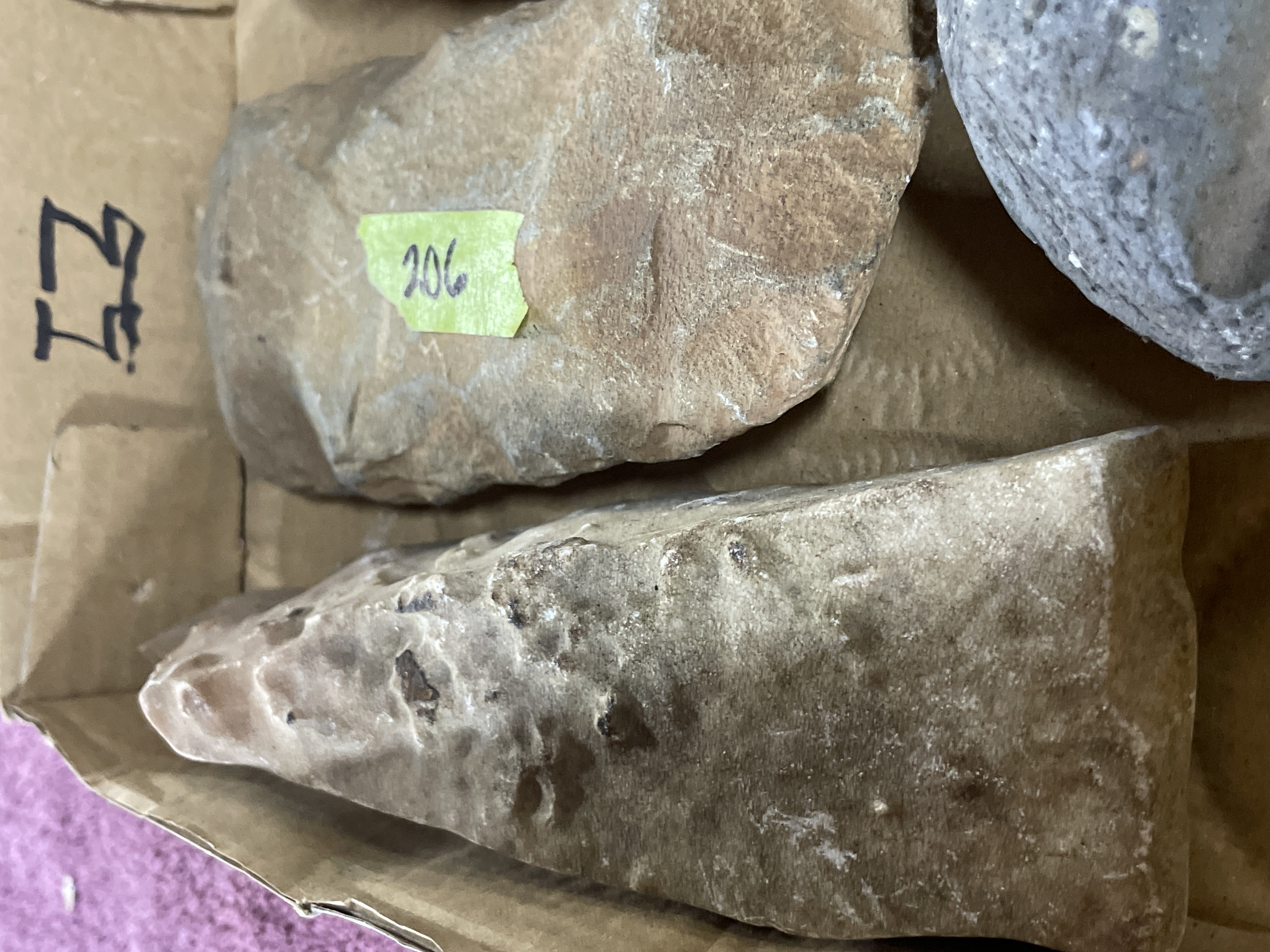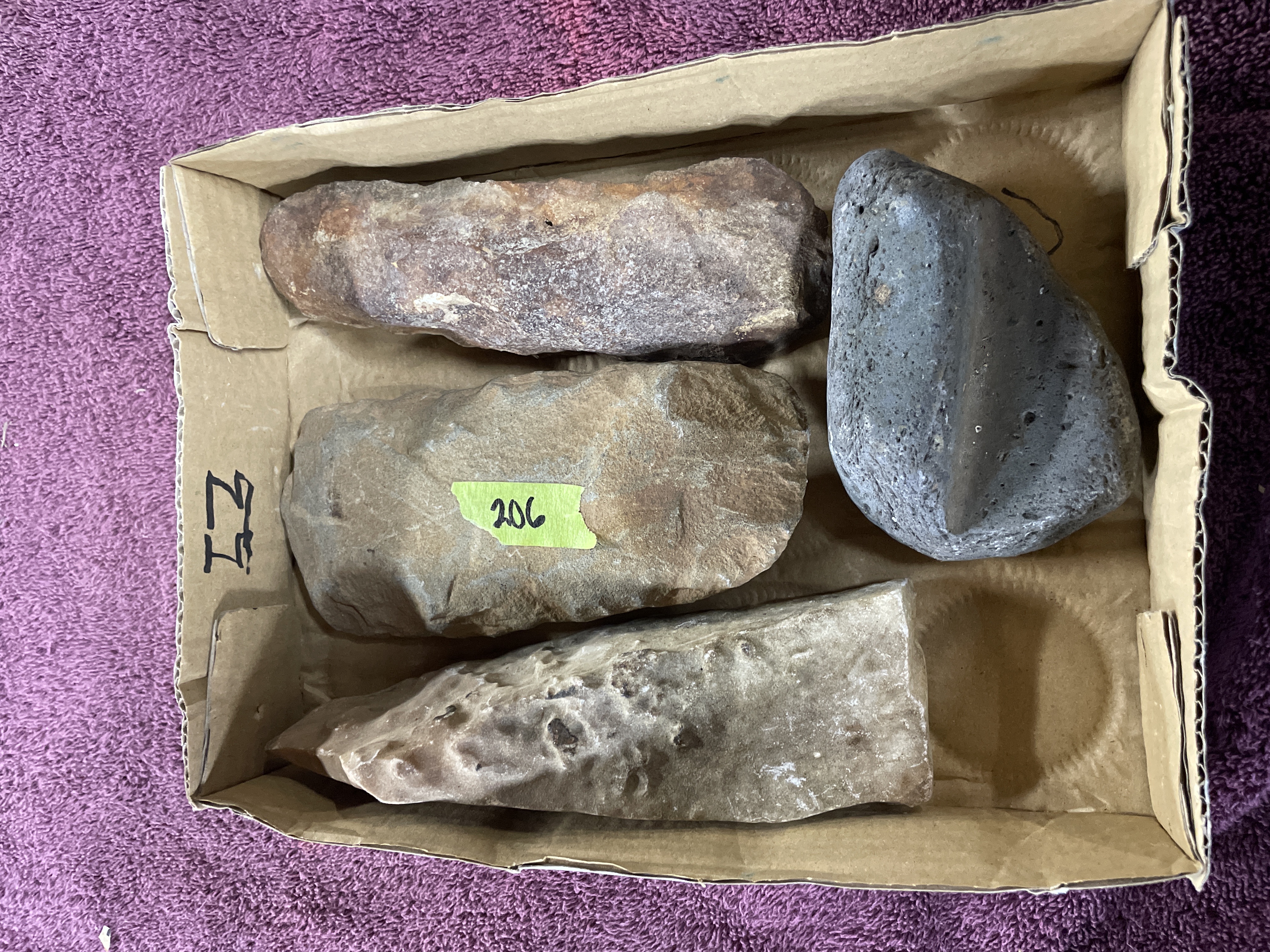 A collection of four large lithic specimens presented within a corrugated cardboard box. The group consists of four individual stones exhibiting characteristics consistent with geological artifacts or primitive stone implements. Three specimens are irregularly shaped, displaying rough textures, sharp edges, and coloration ranging from tan and brown to reddish-brown. The fourth specimen, positioned in the foreground, is dark grey/black, ovoid in shape, and exhibits a smoothed or worked surface, potentially indicating use as a hand tool or grinding stone. Visible markings include the handwritten number 23 on the interior wall of the cardboard box and a neon green adhesive label bearing the number 206 affixed to the upper-center brown specimen.